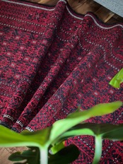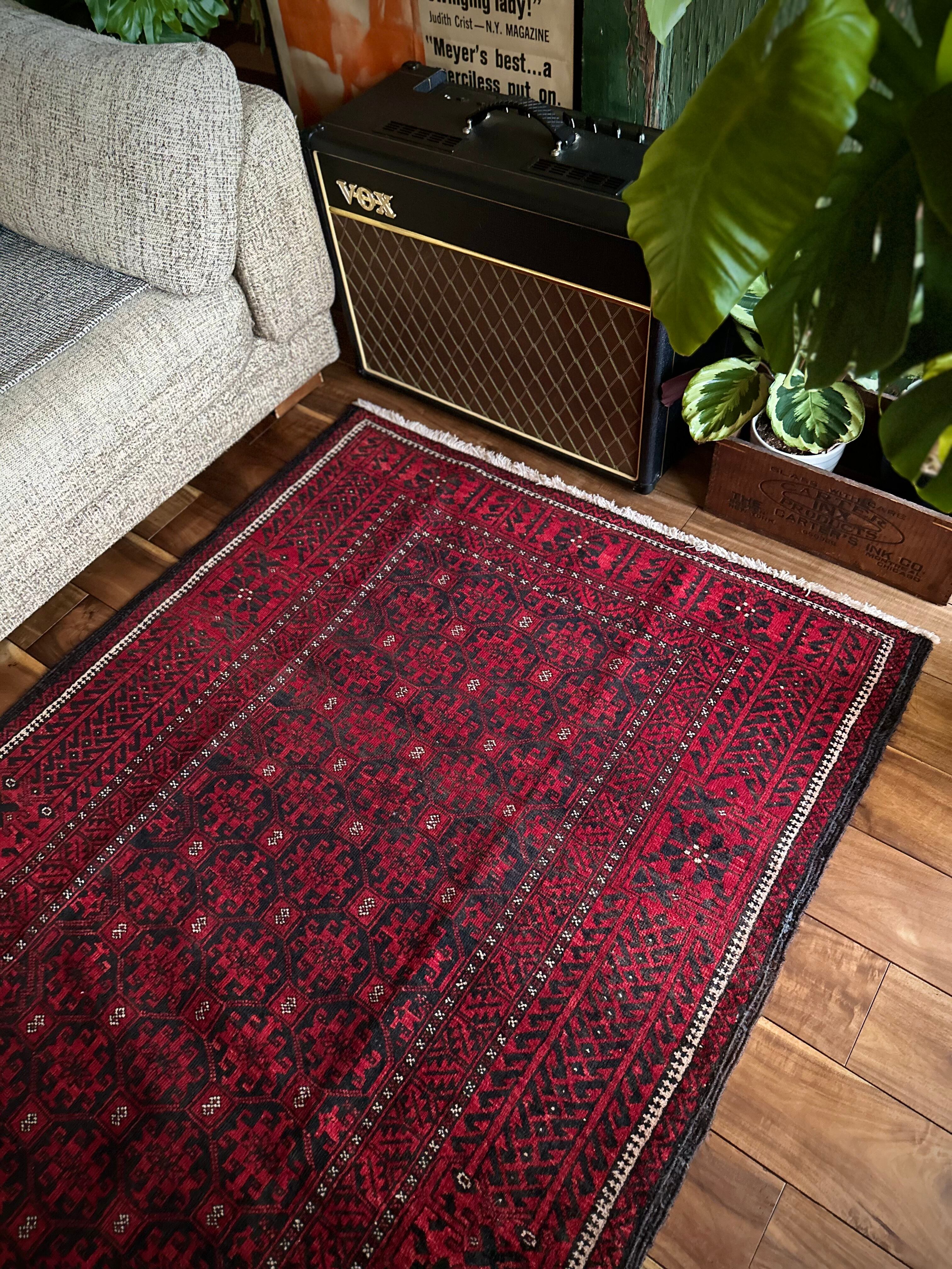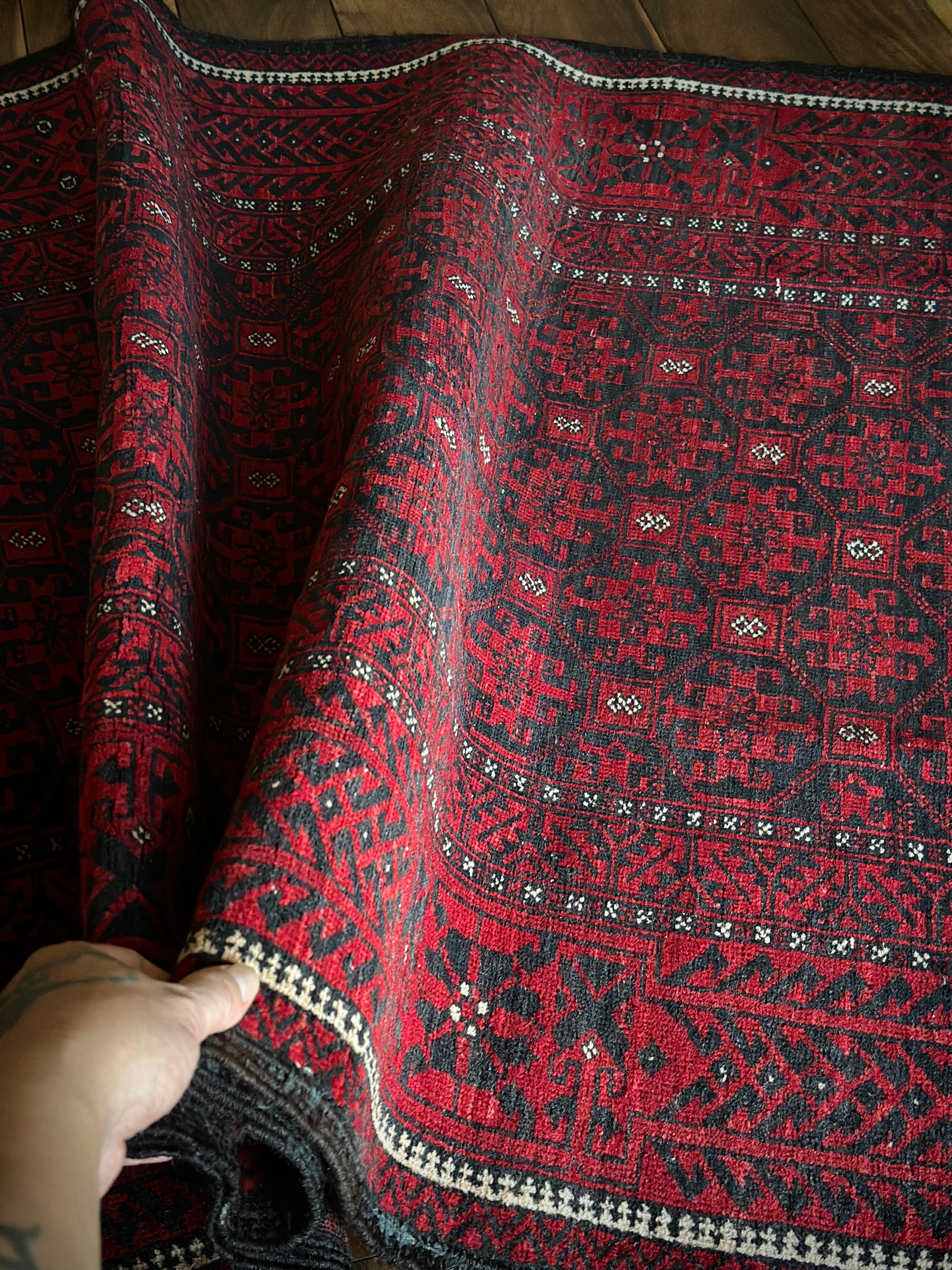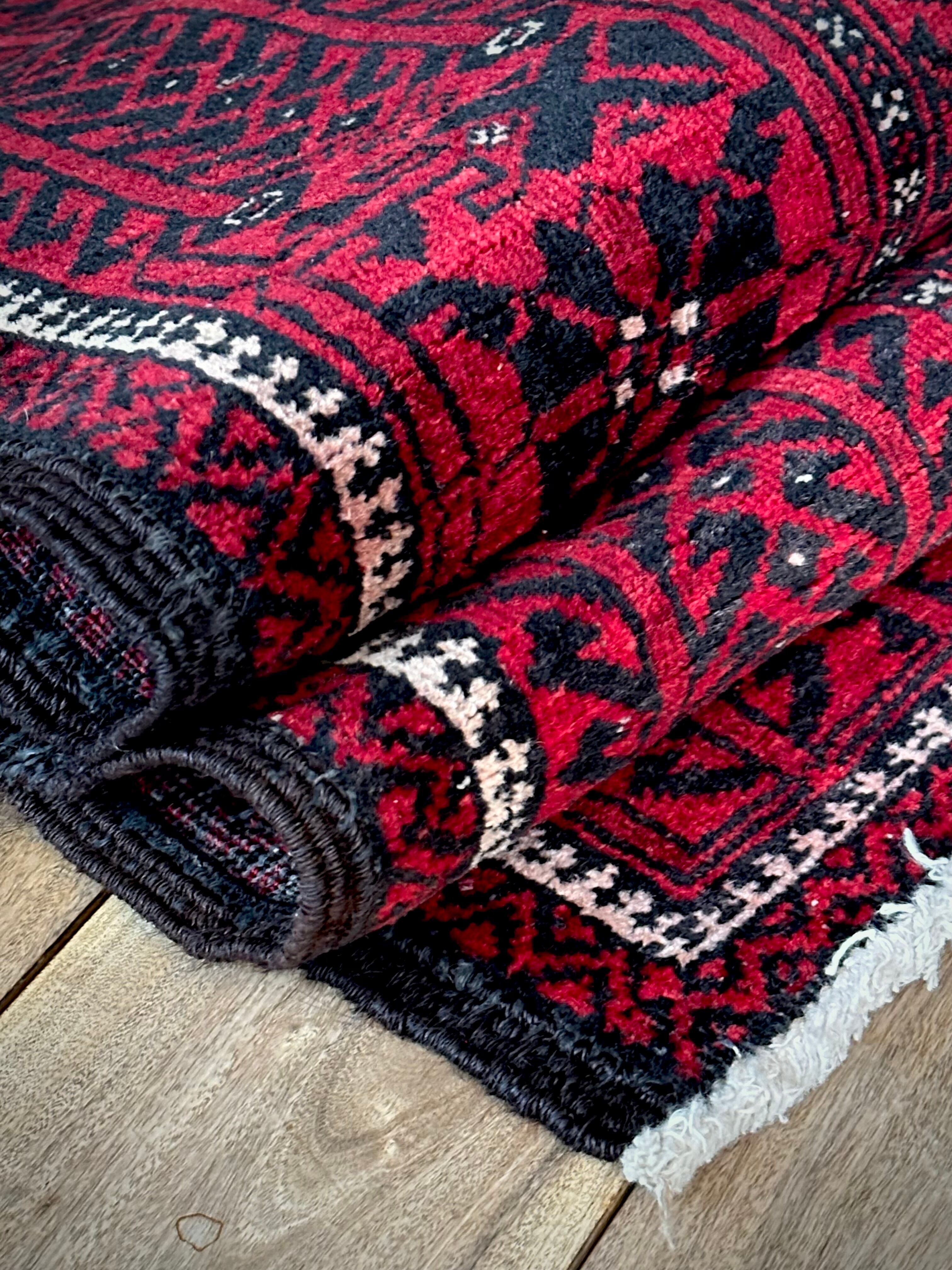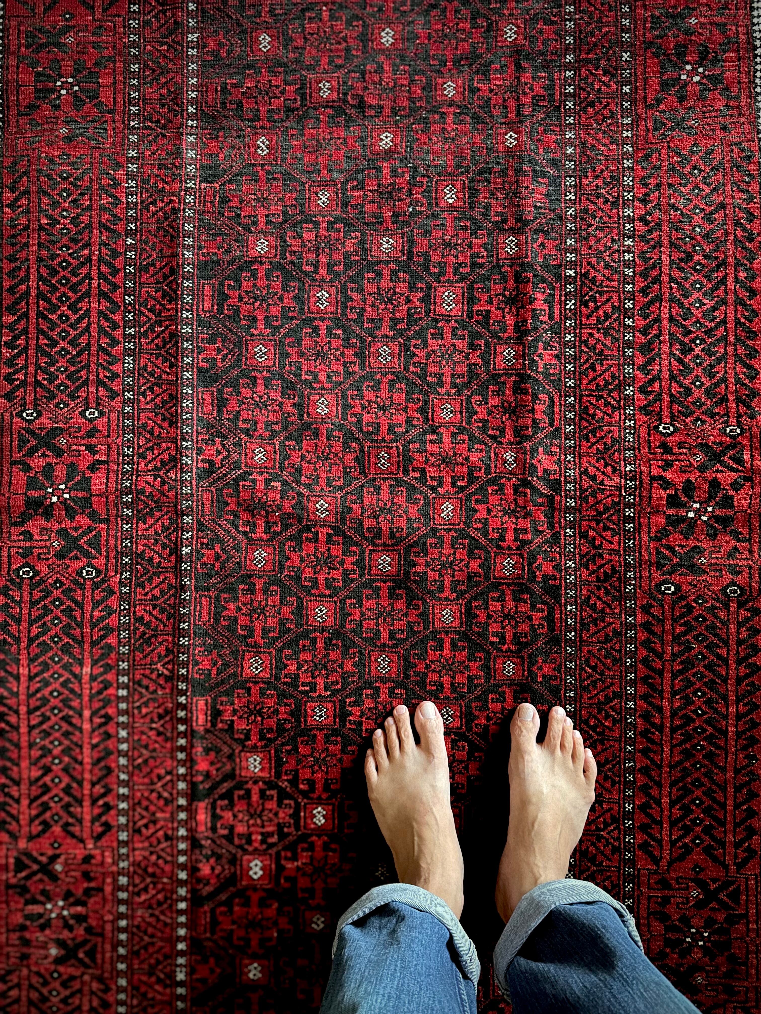 緻密に計算された細かな連続紋様に小さな白い花をモチーフとしたミナハニ模様が散りばめられた、イラン東部に居住するバルーチ族のトライバルラグで、ブラック&レッドのバルーチらしいシンプルな色合いがかっこいい1枚になります。