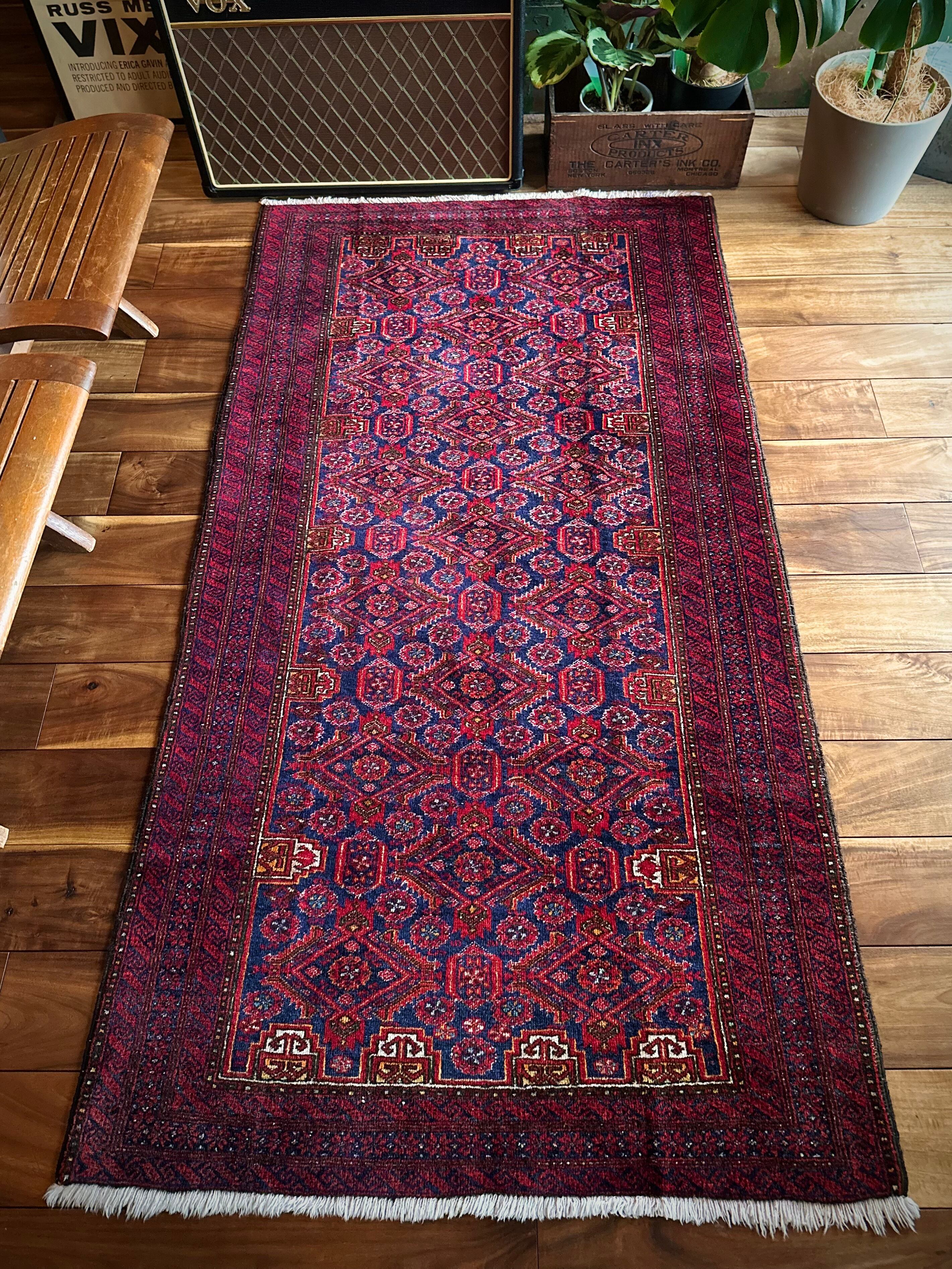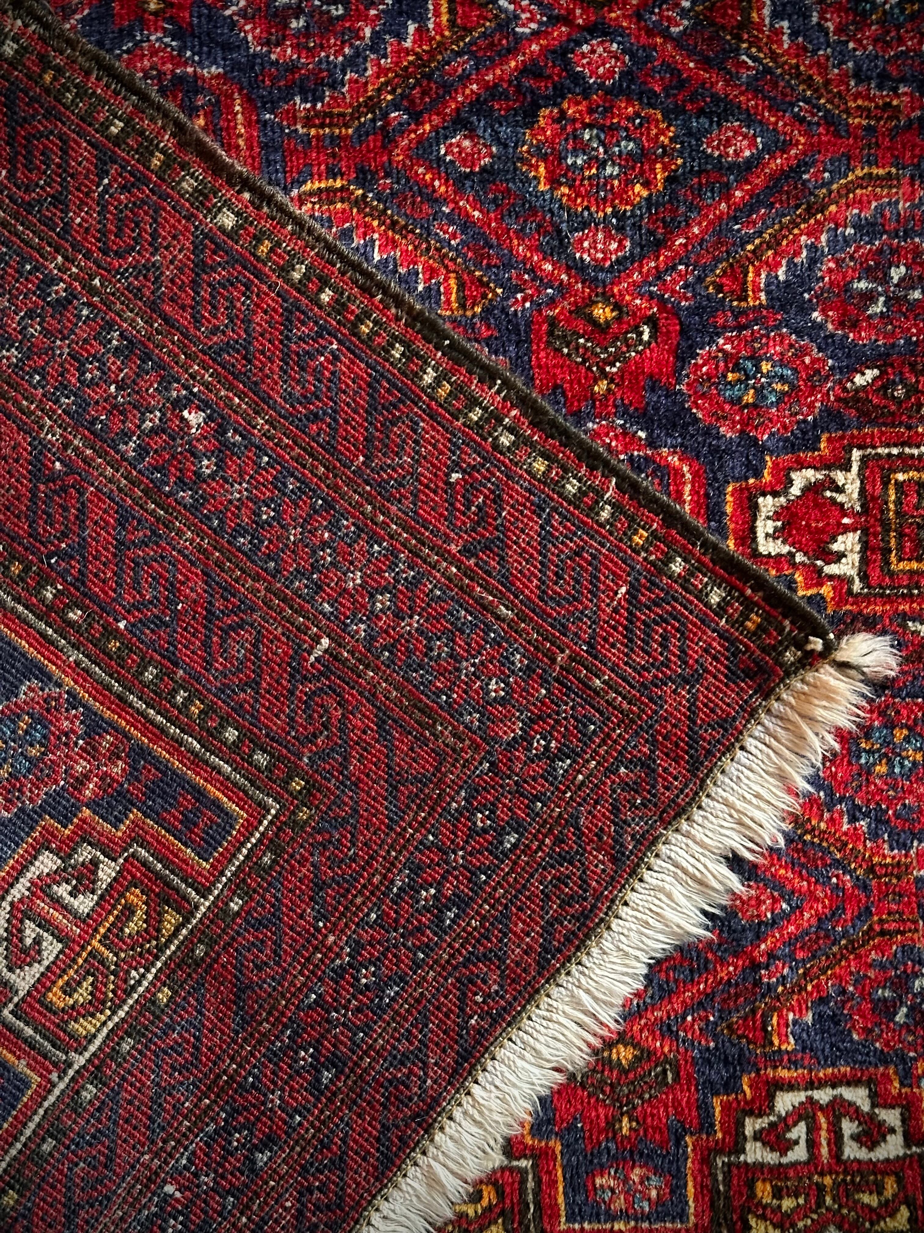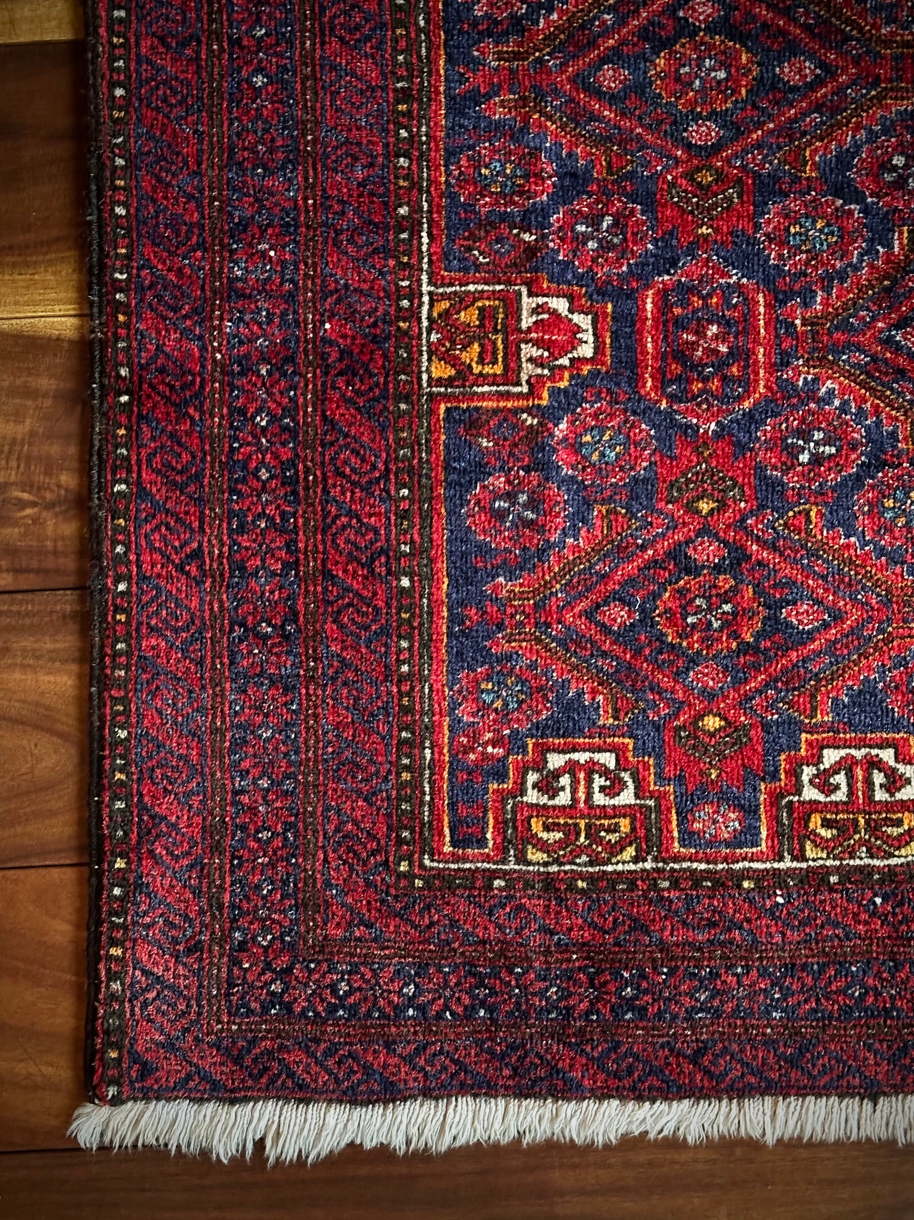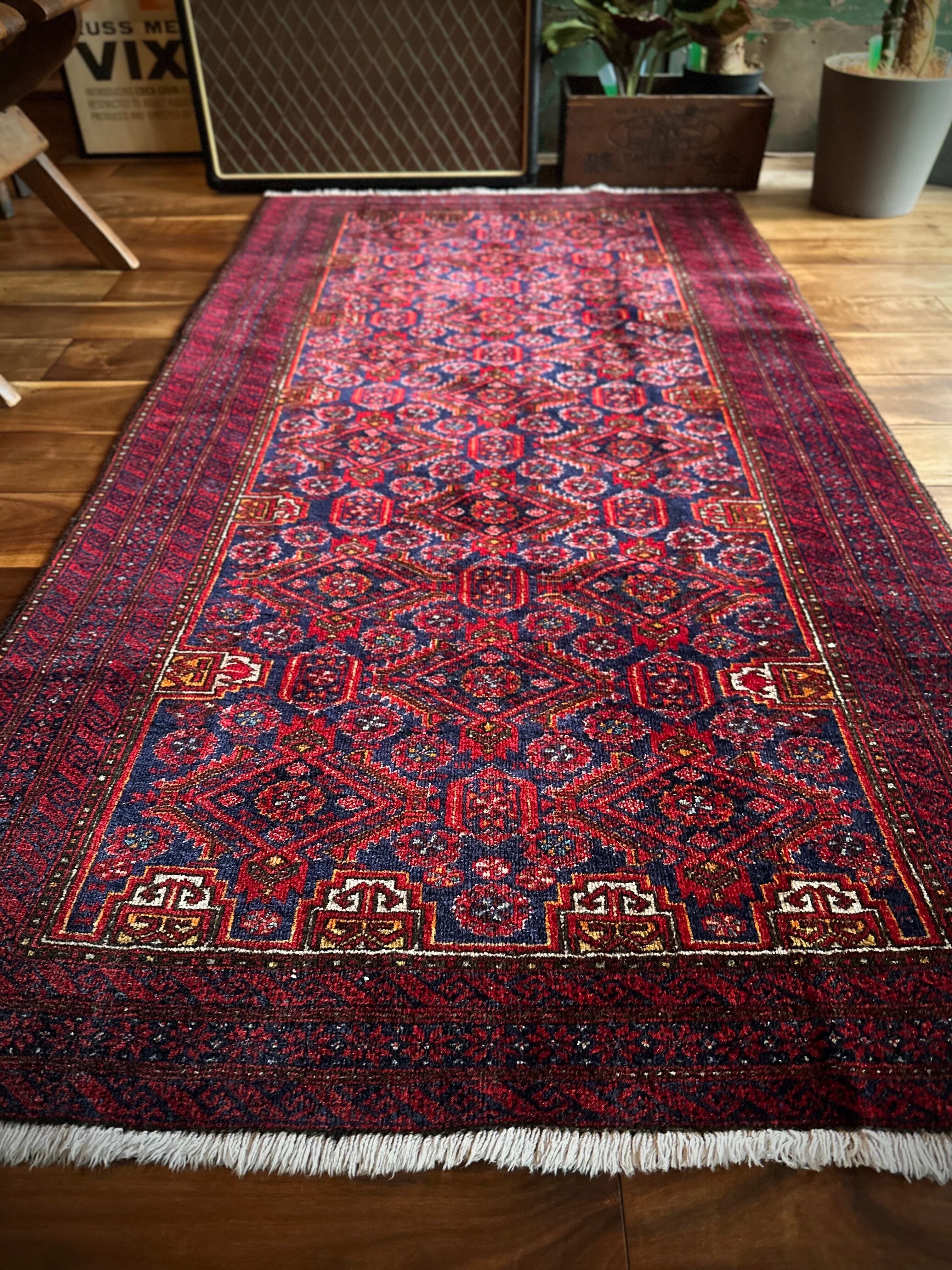 ネイビーブルーのベースにびっしりと埋め尽くされた花の紋様がカラフルな、イラン東部に居住するバルーチ族のトライバルラグで、ボーダーに描かれたチェーンの連続紋様が全体を引き締めてバルーチらしさを醸し出しています。
