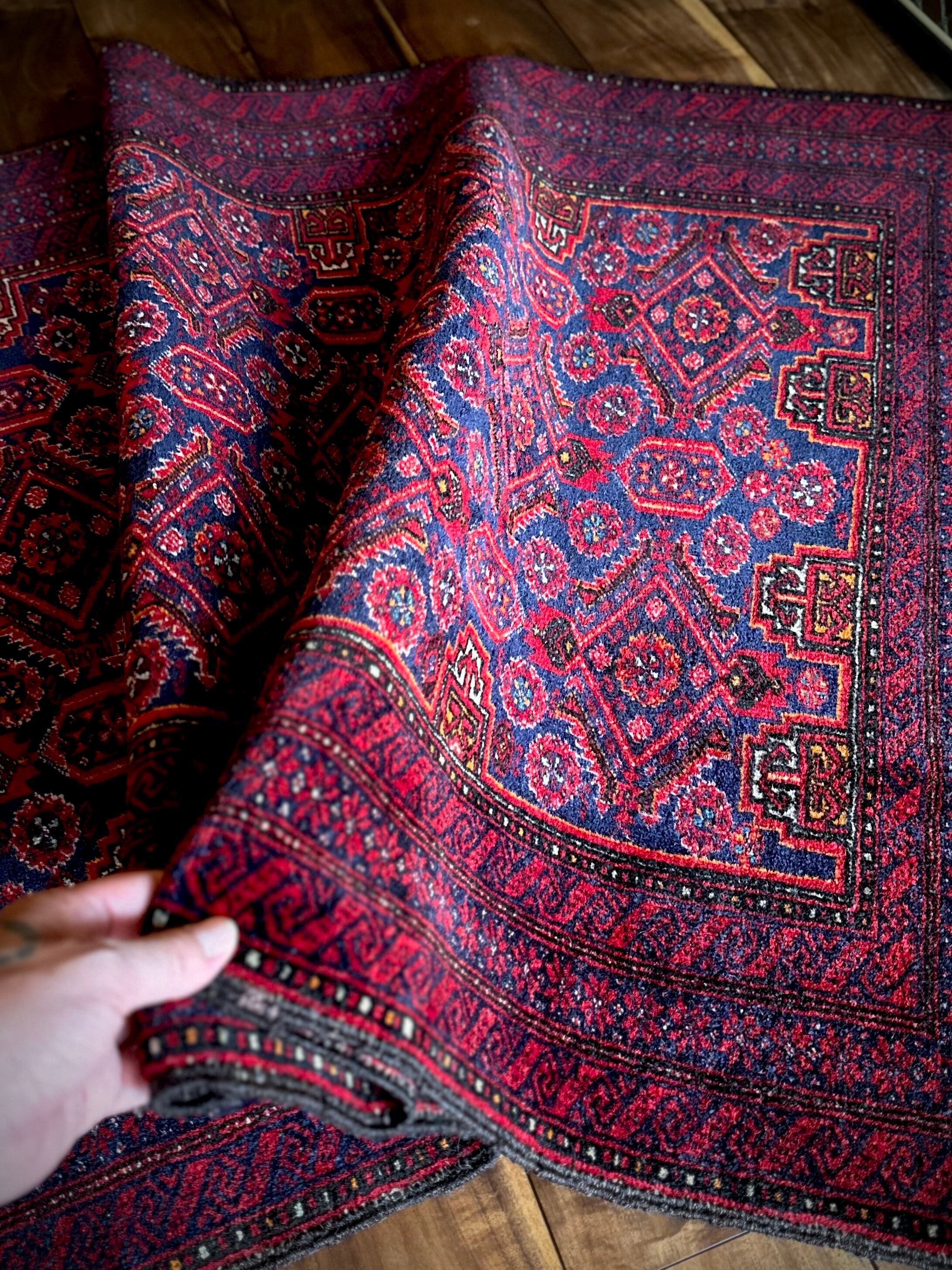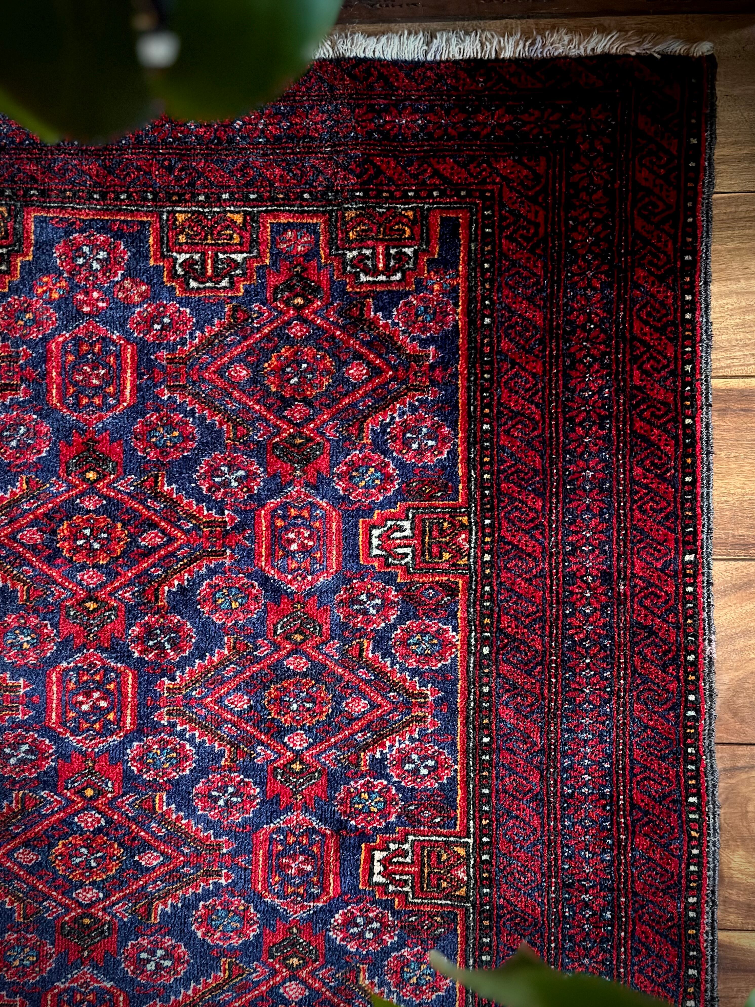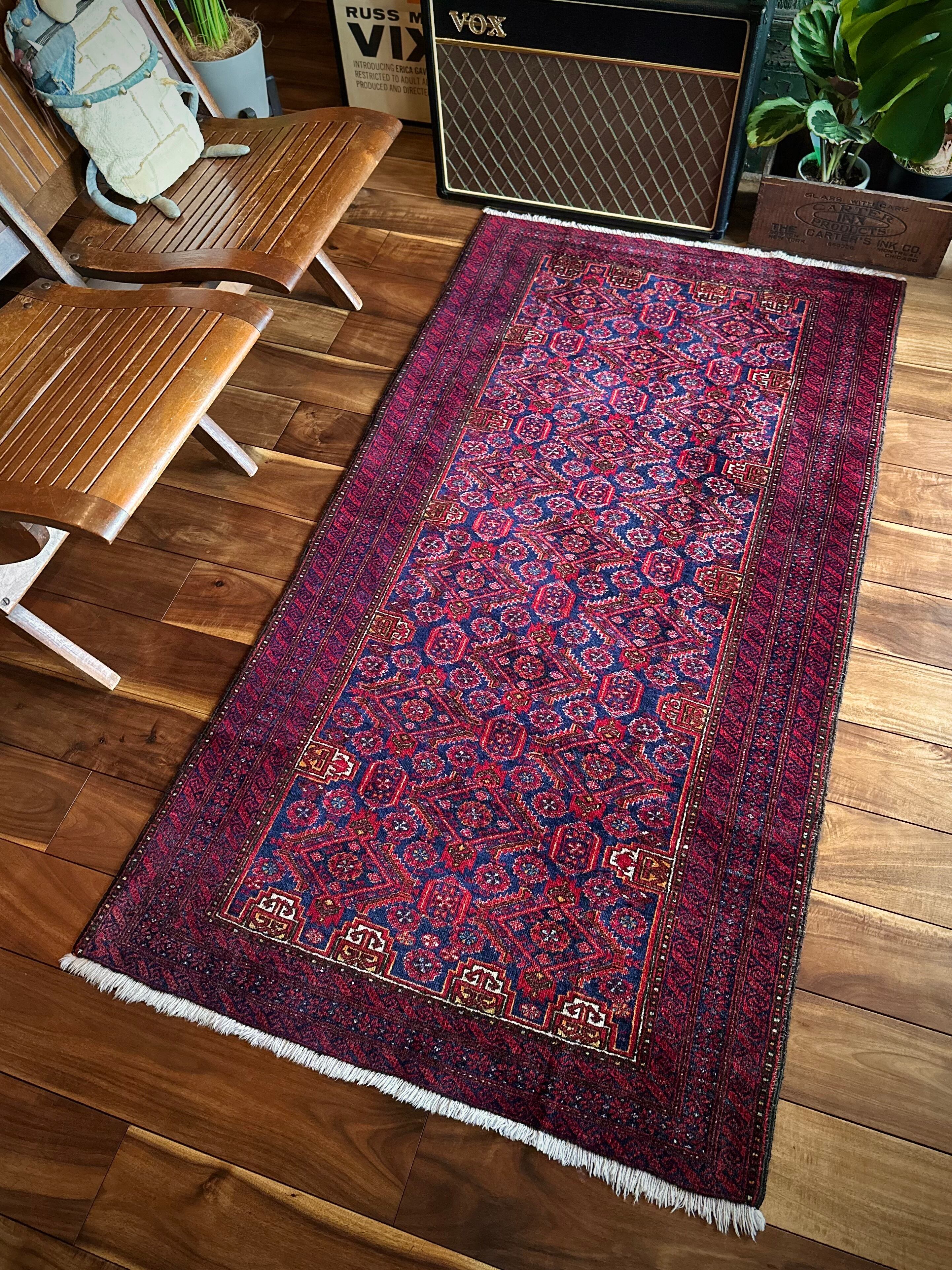 ネイビーブルーのベースにびっしりと埋め尽くされた花の紋様がカラフルな、イラン東部に居住するバルーチ族のトライバルラグで、ボーダーに描かれたチェーンの連続紋様が全体を引き締めてバルーチらしさを醸し出しています。