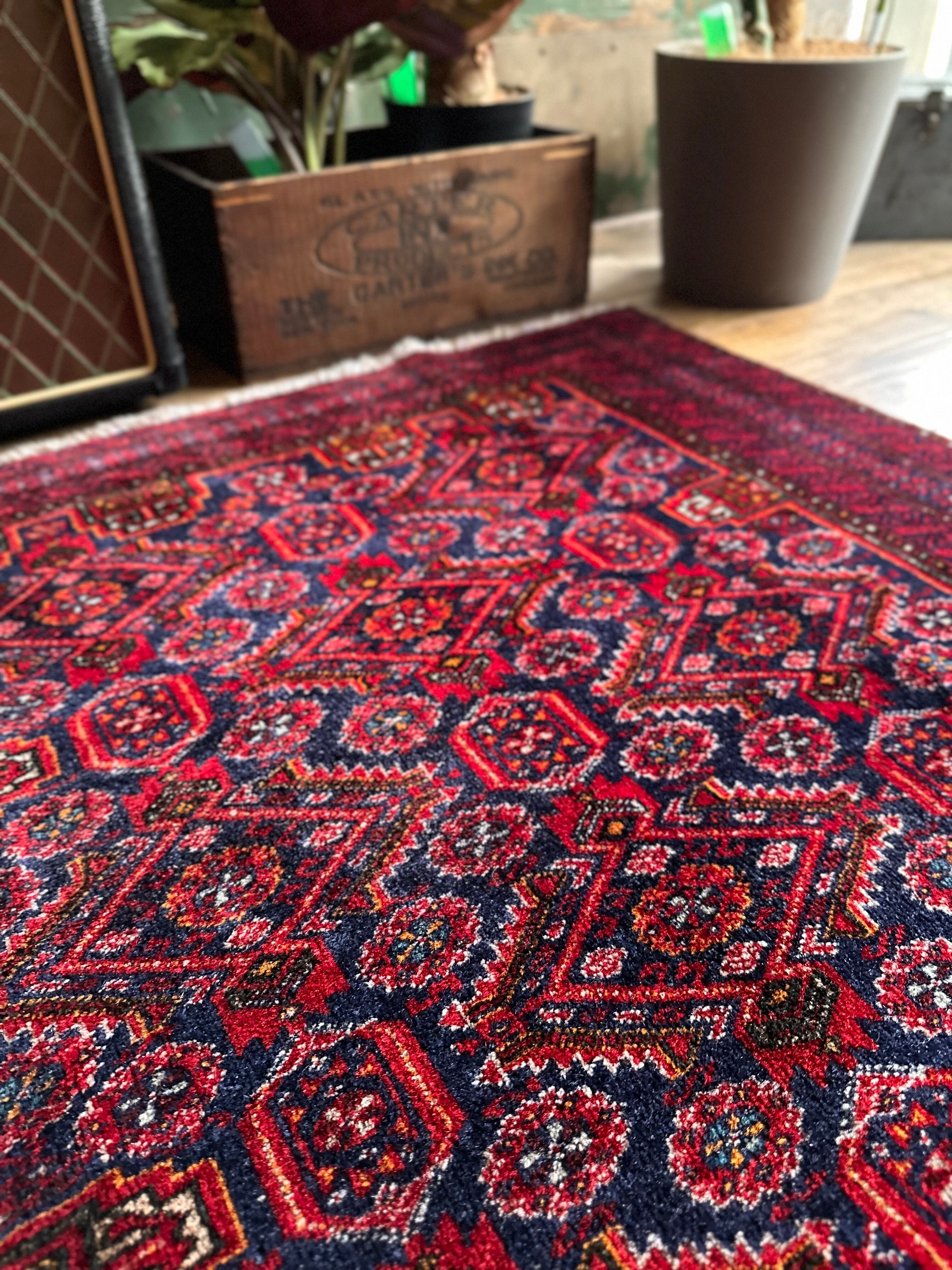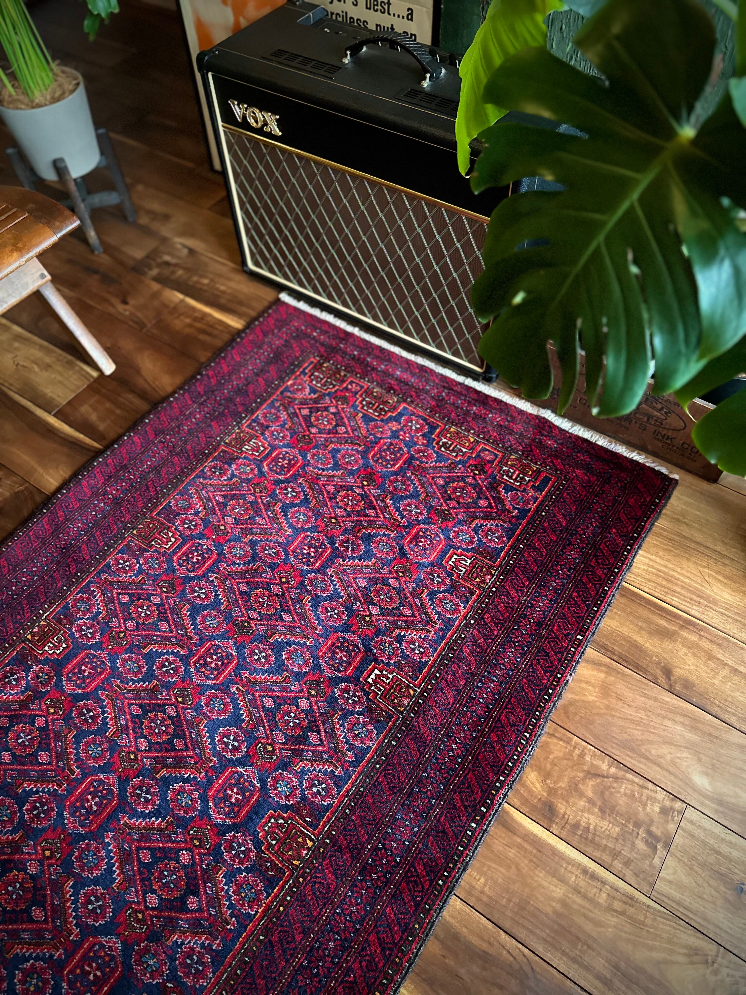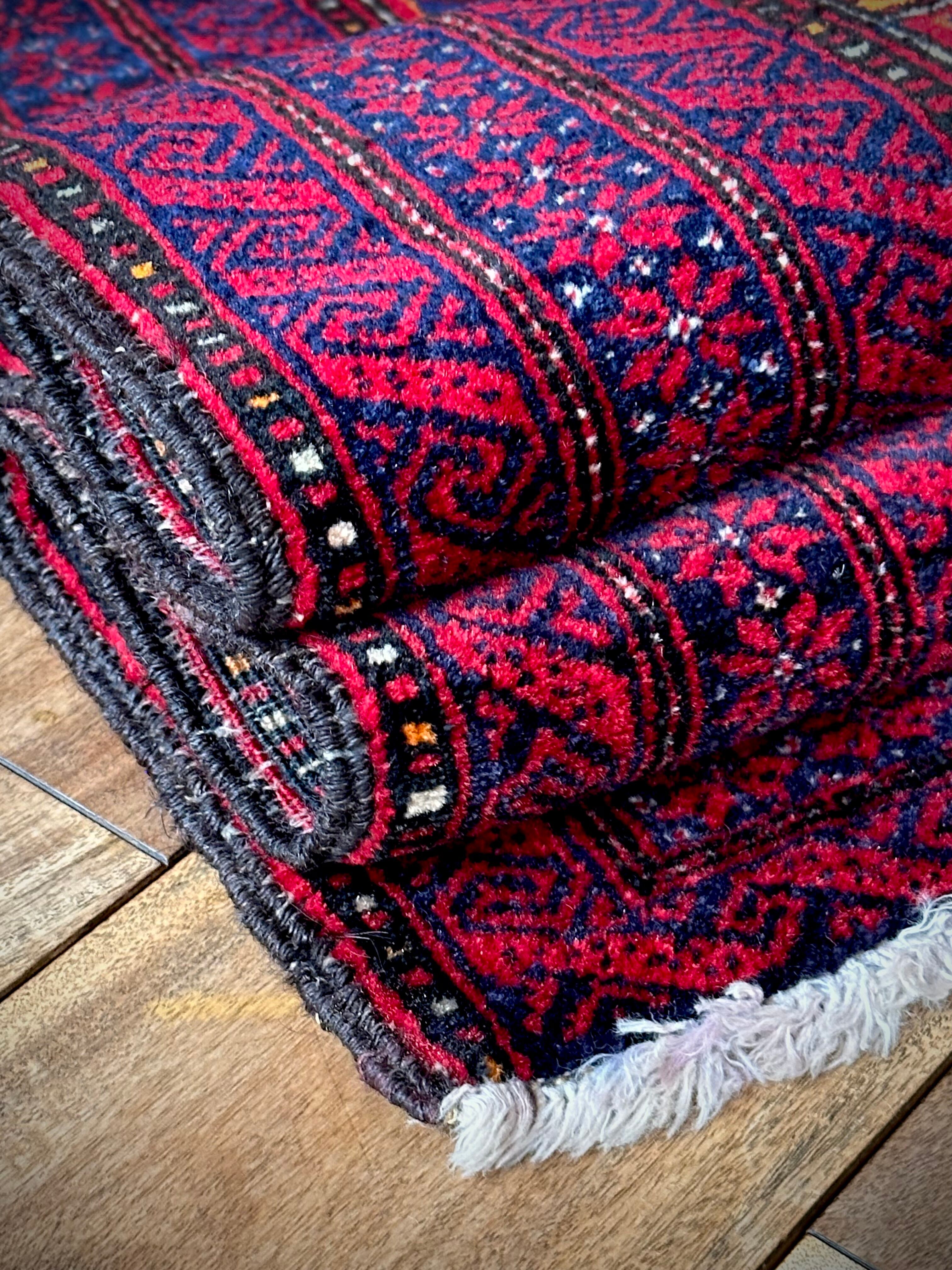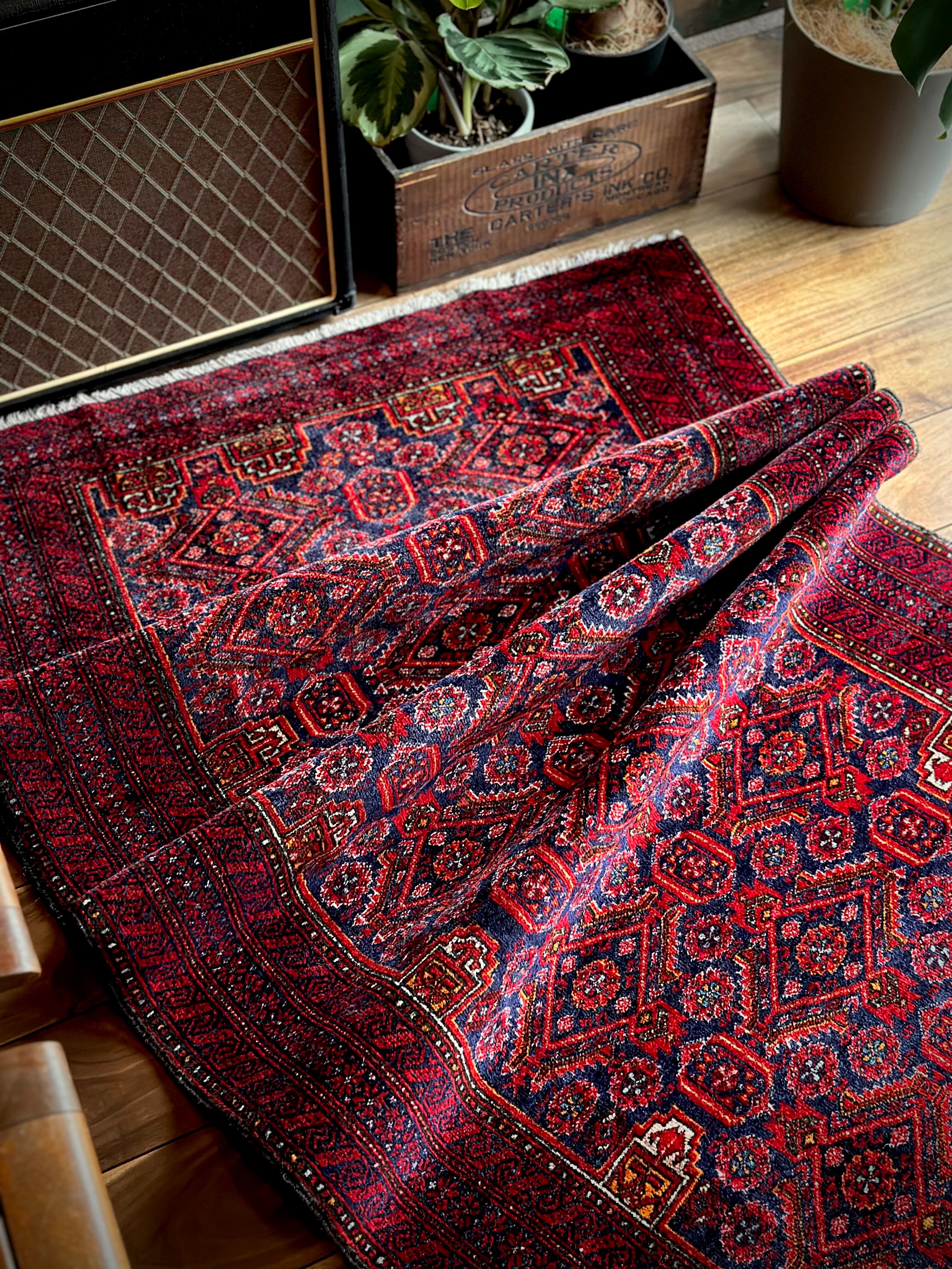 ネイビーブルーのベースにびっしりと埋め尽くされた花の紋様がカラフルな、イラン東部に居住するバルーチ族のトライバルラグで、ボーダーに描かれたチェーンの連続紋様が全体を引き締めてバルーチらしさを醸し出しています。