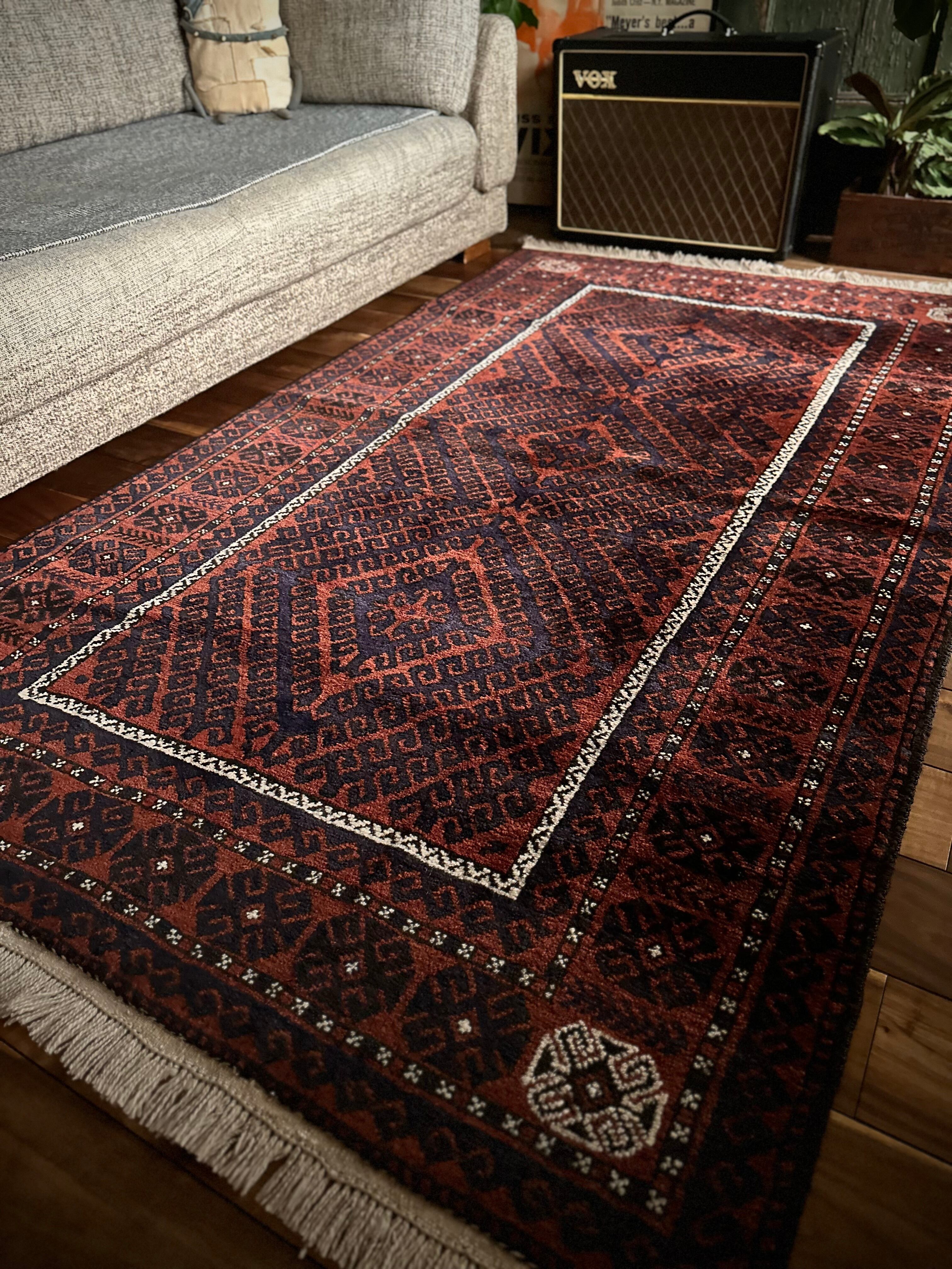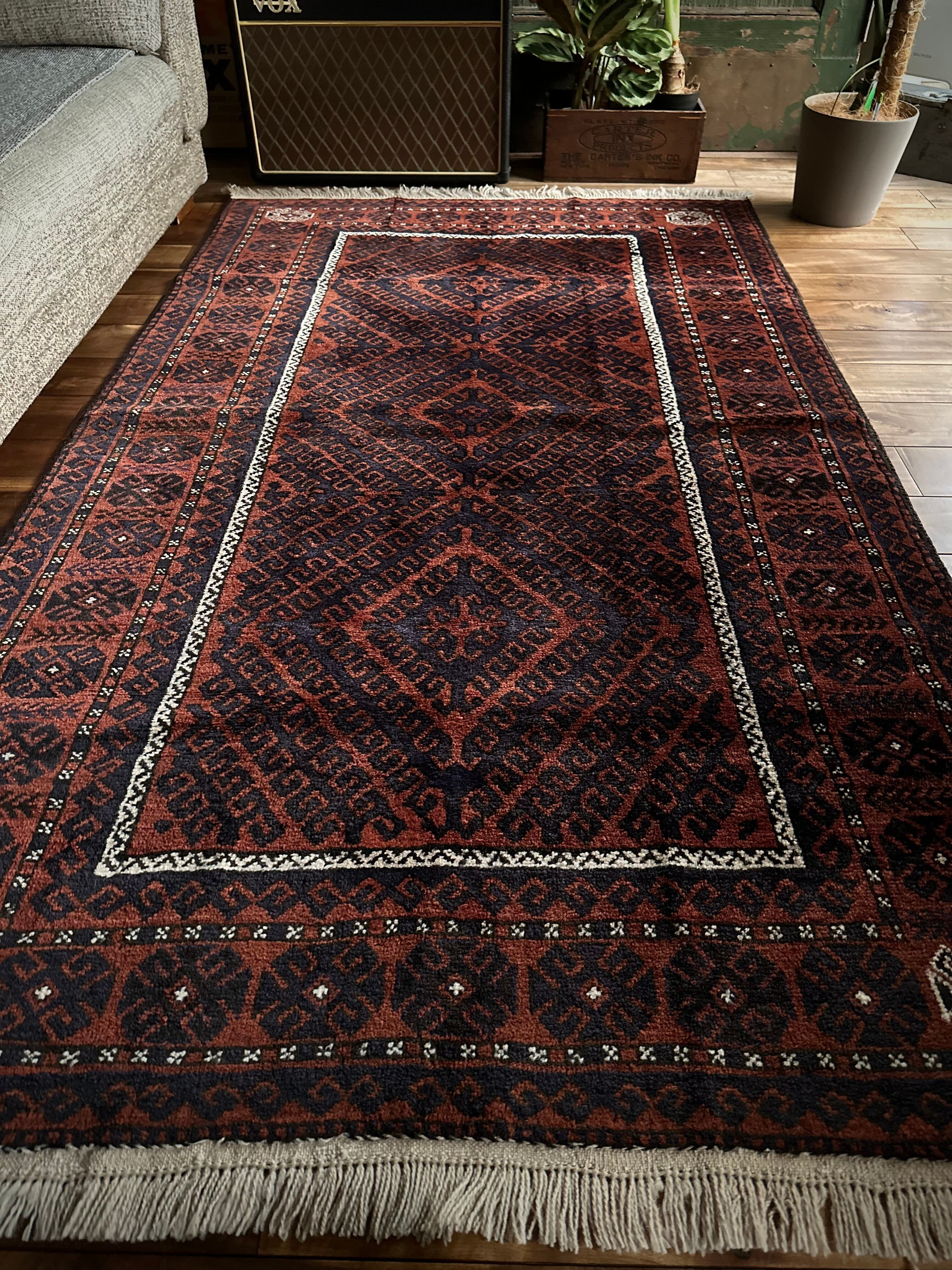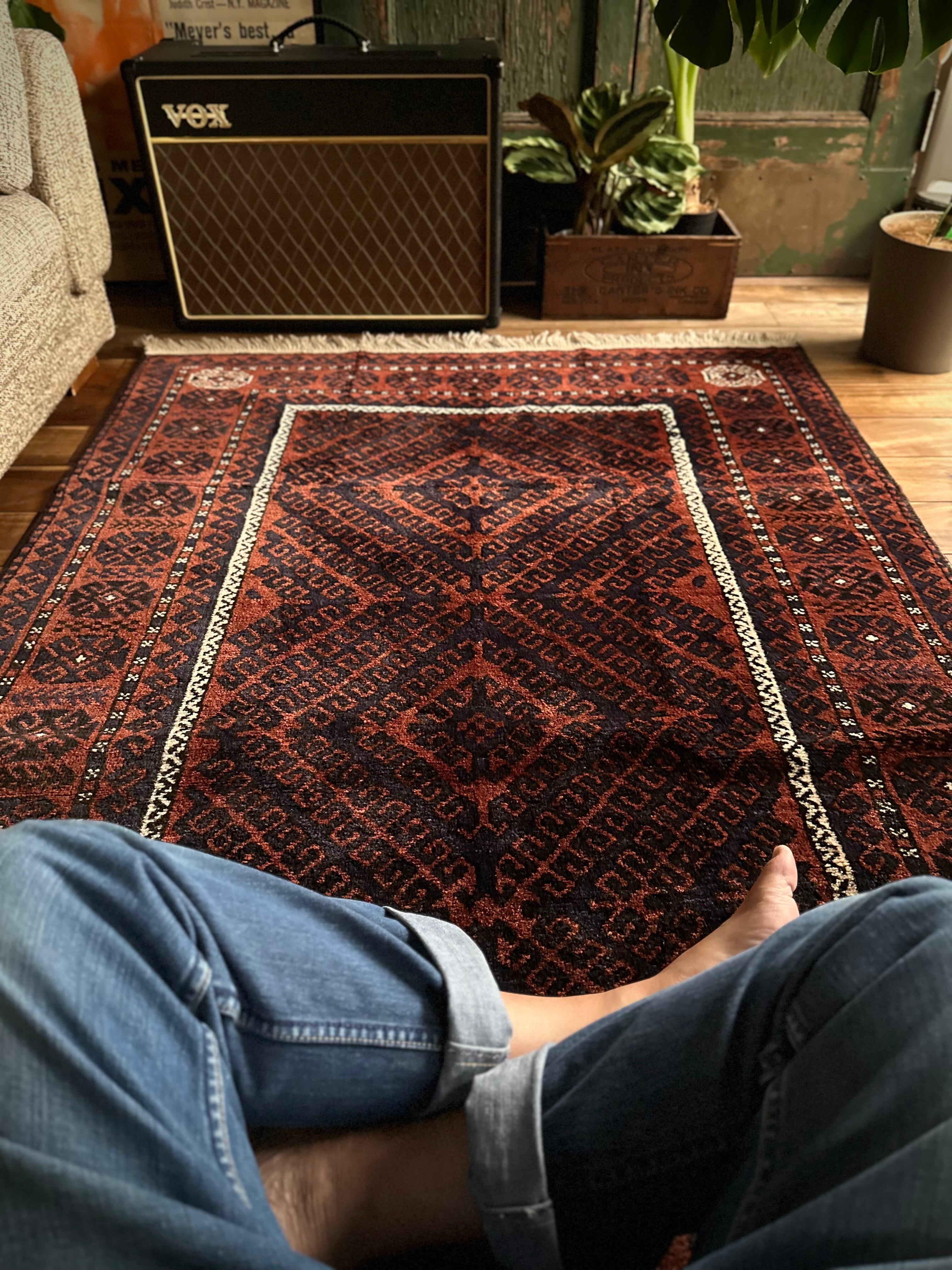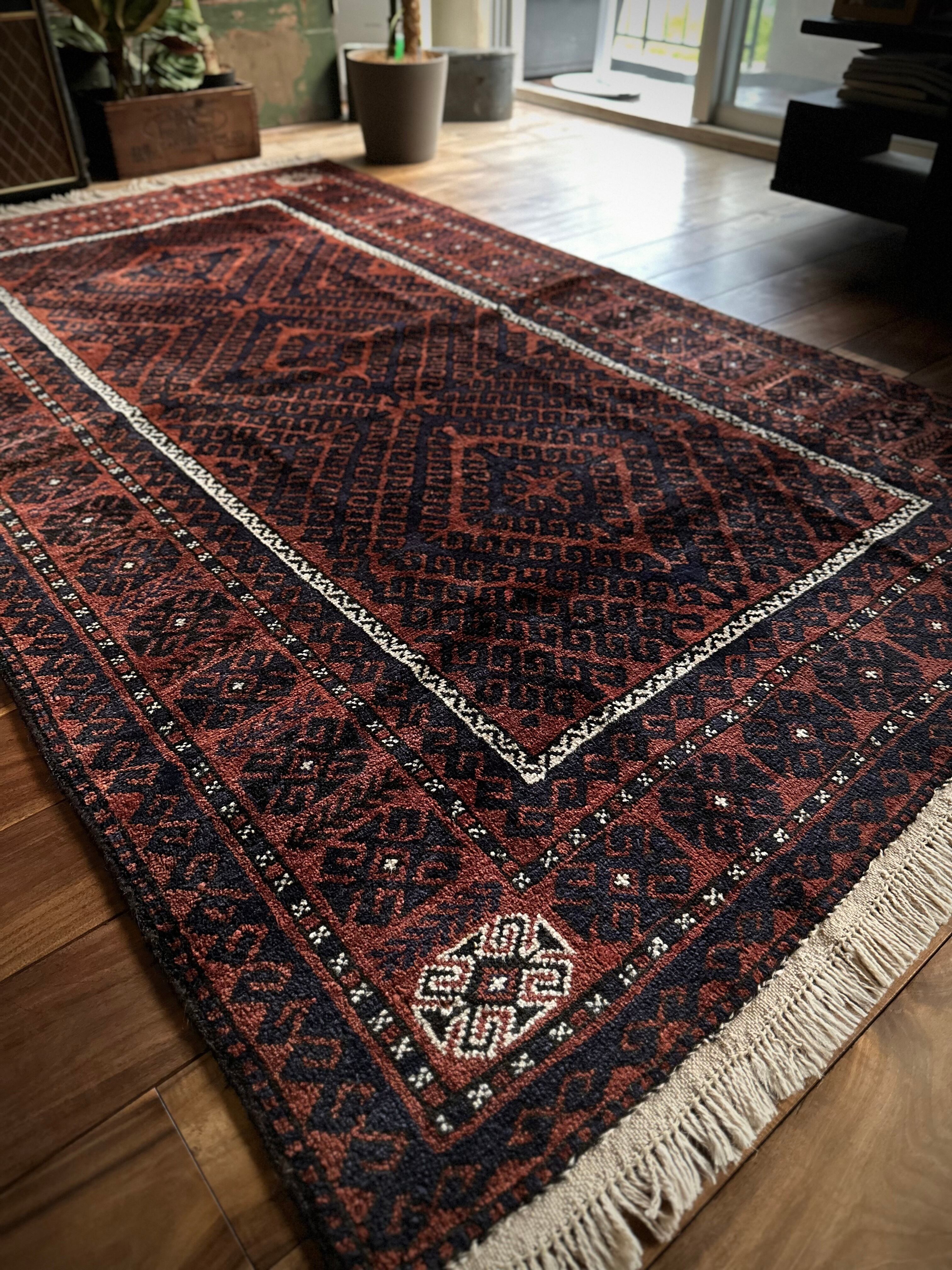 最後にラグそのものに関しては羊毛特有の匂いがあり、採寸は中央付近で計測していますが、手織りならではの歪みによる誤差や水洗いクリーニングによる縮み、また草木染めによる経年劣化の色ムラなどがありますが、それもまたヴィンテージラグの魅力かとご理解ください。