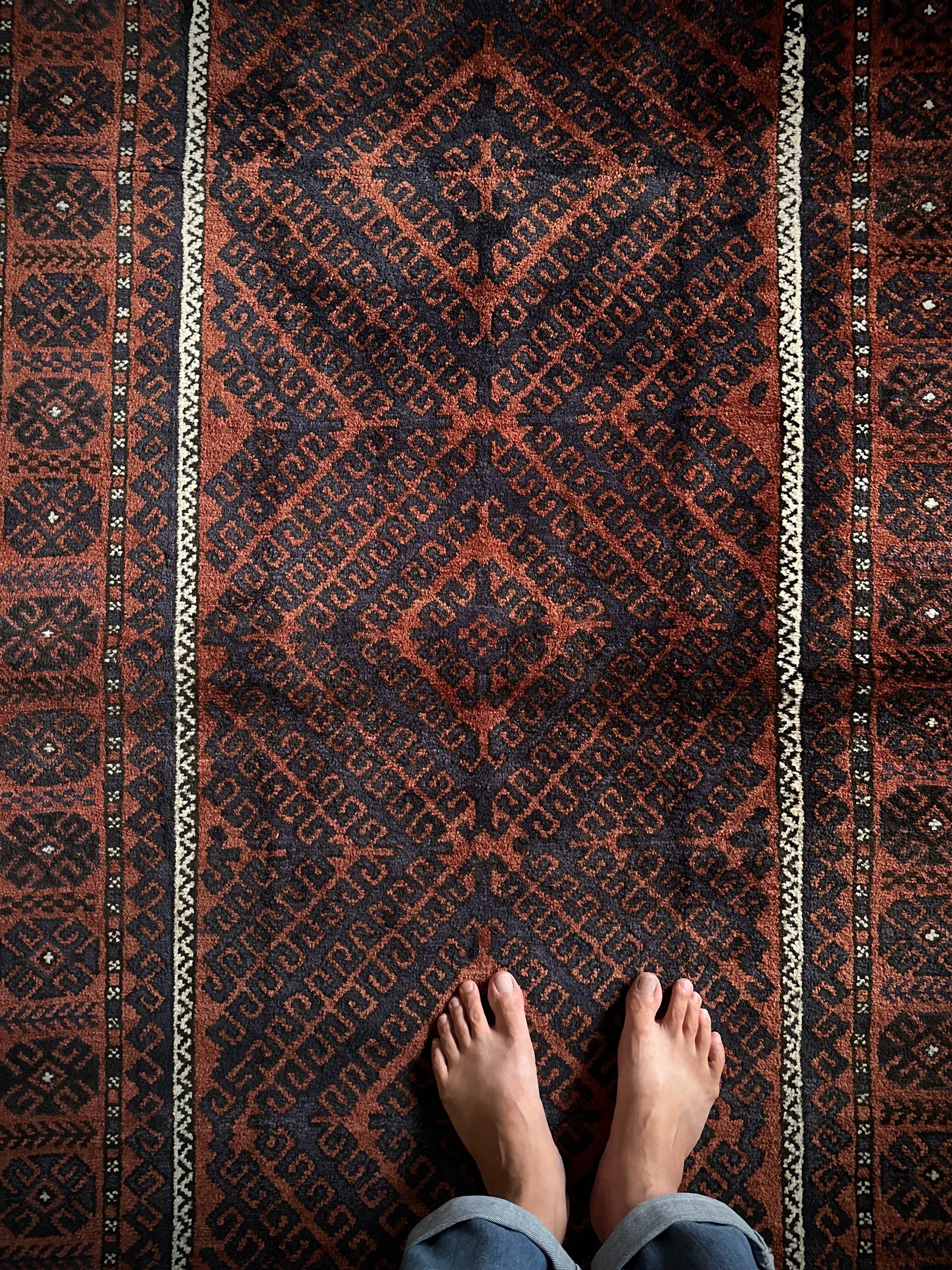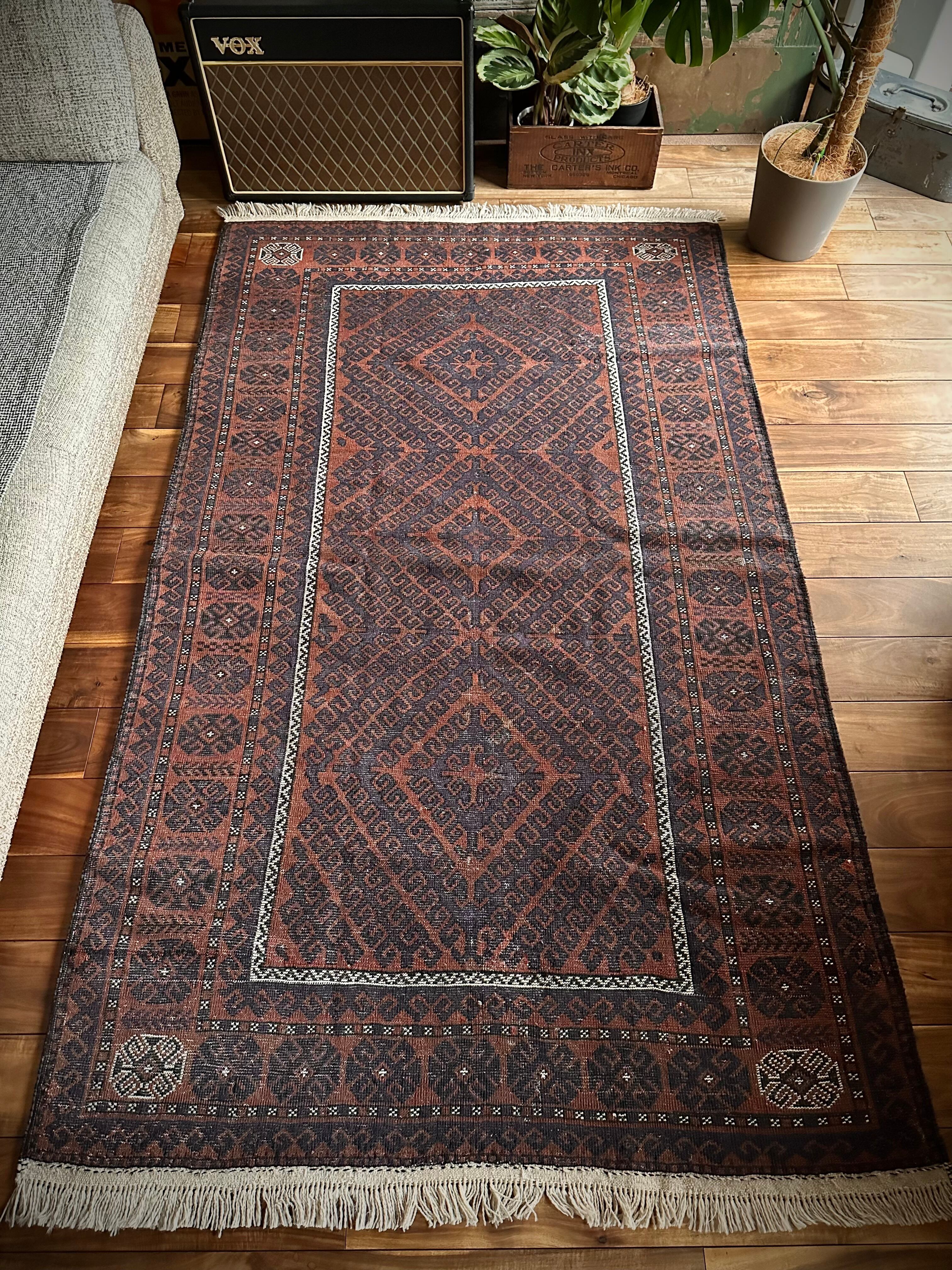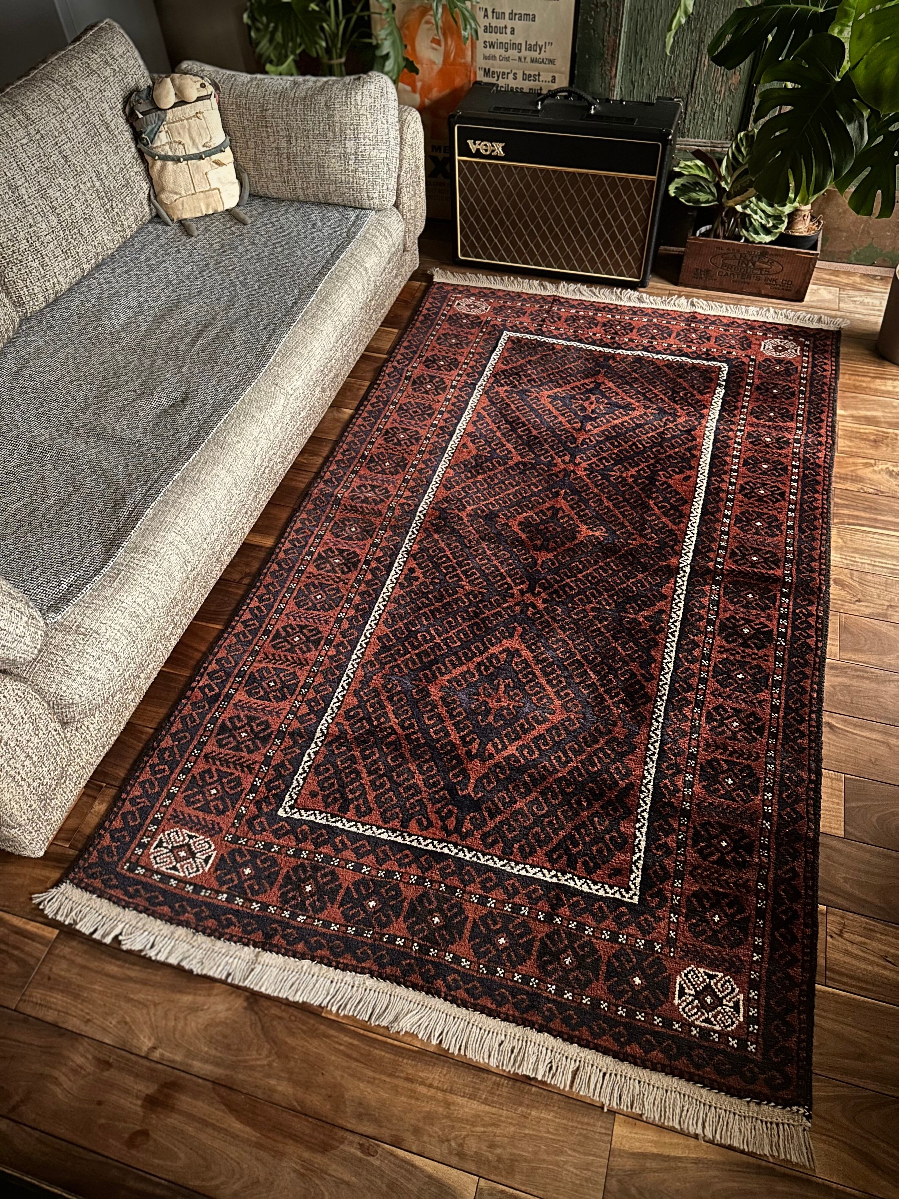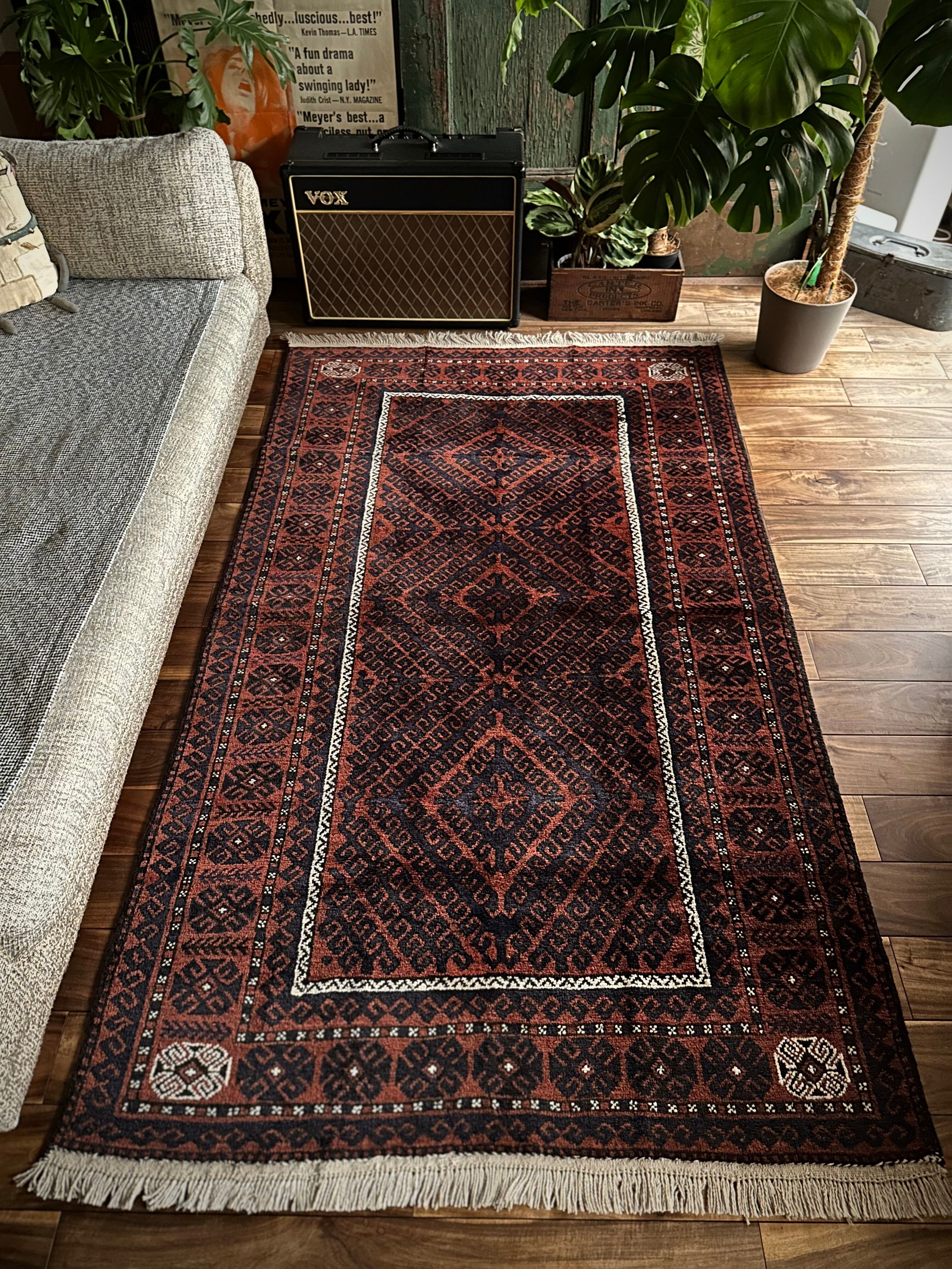 最後にラグそのものに関しては羊毛特有の匂いがあり、採寸は中央付近で計測していますが、手織りならではの歪みによる誤差や水洗いクリーニングによる縮み、また草木染めによる経年劣化の色ムラなどがありますが、それもまたヴィンテージラグの魅力かとご理解ください。