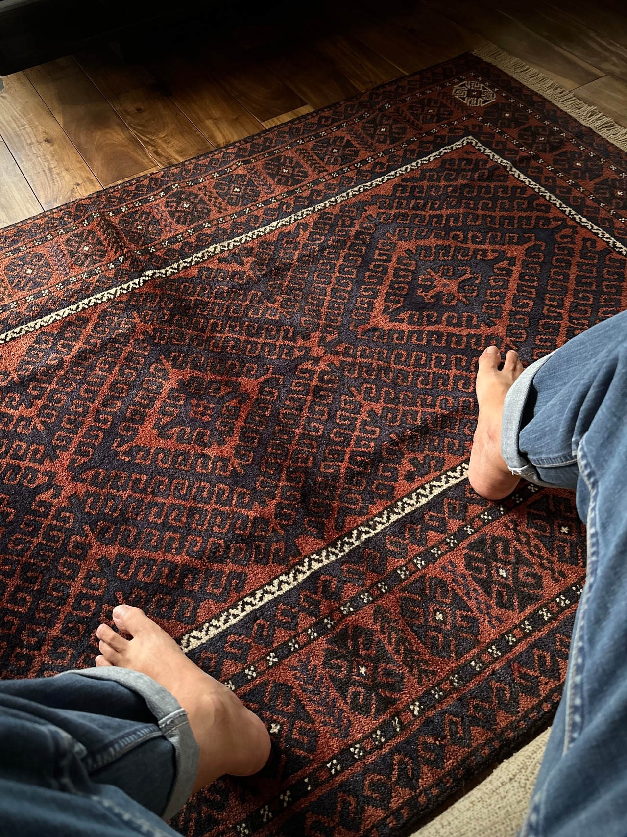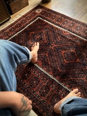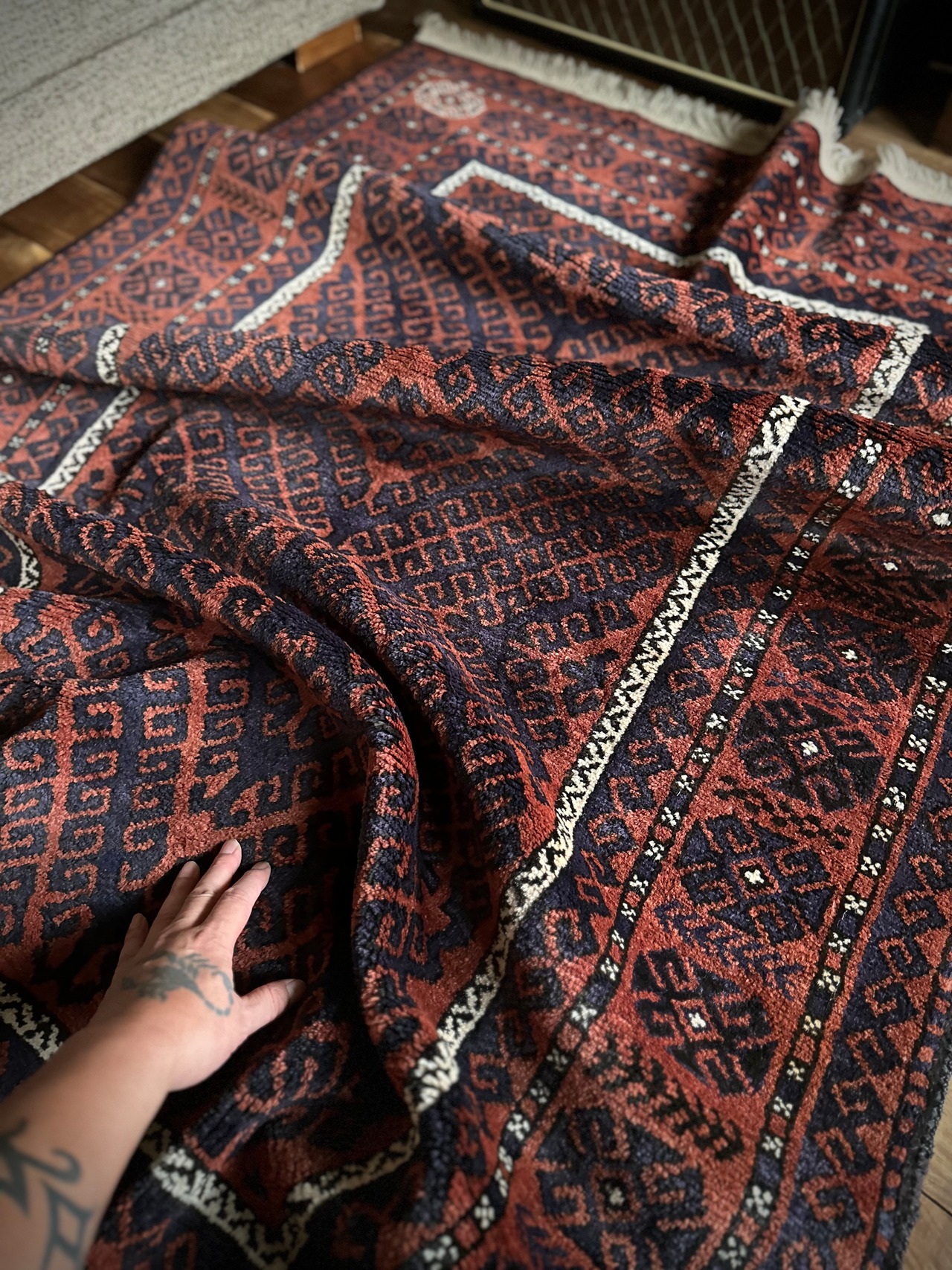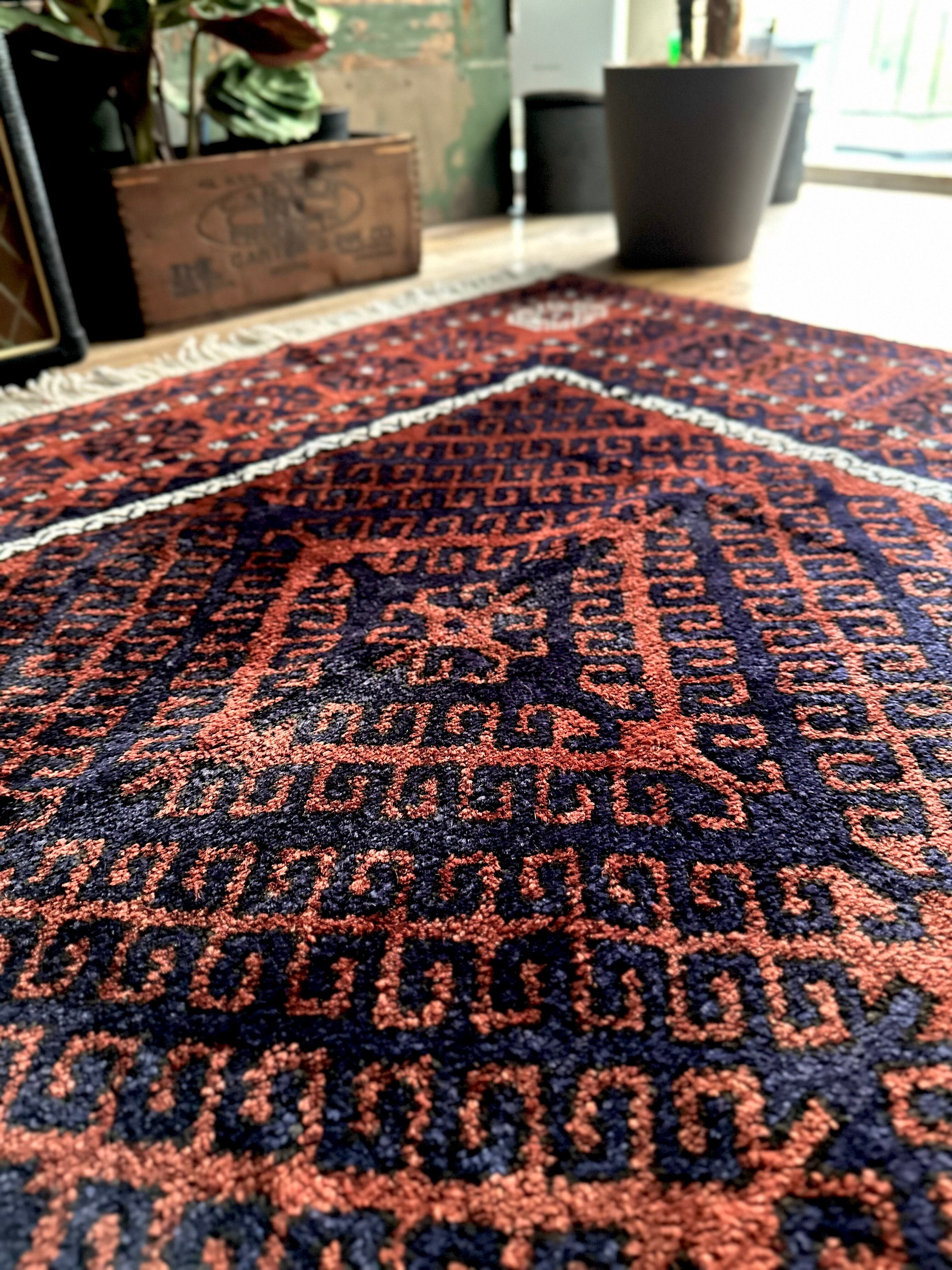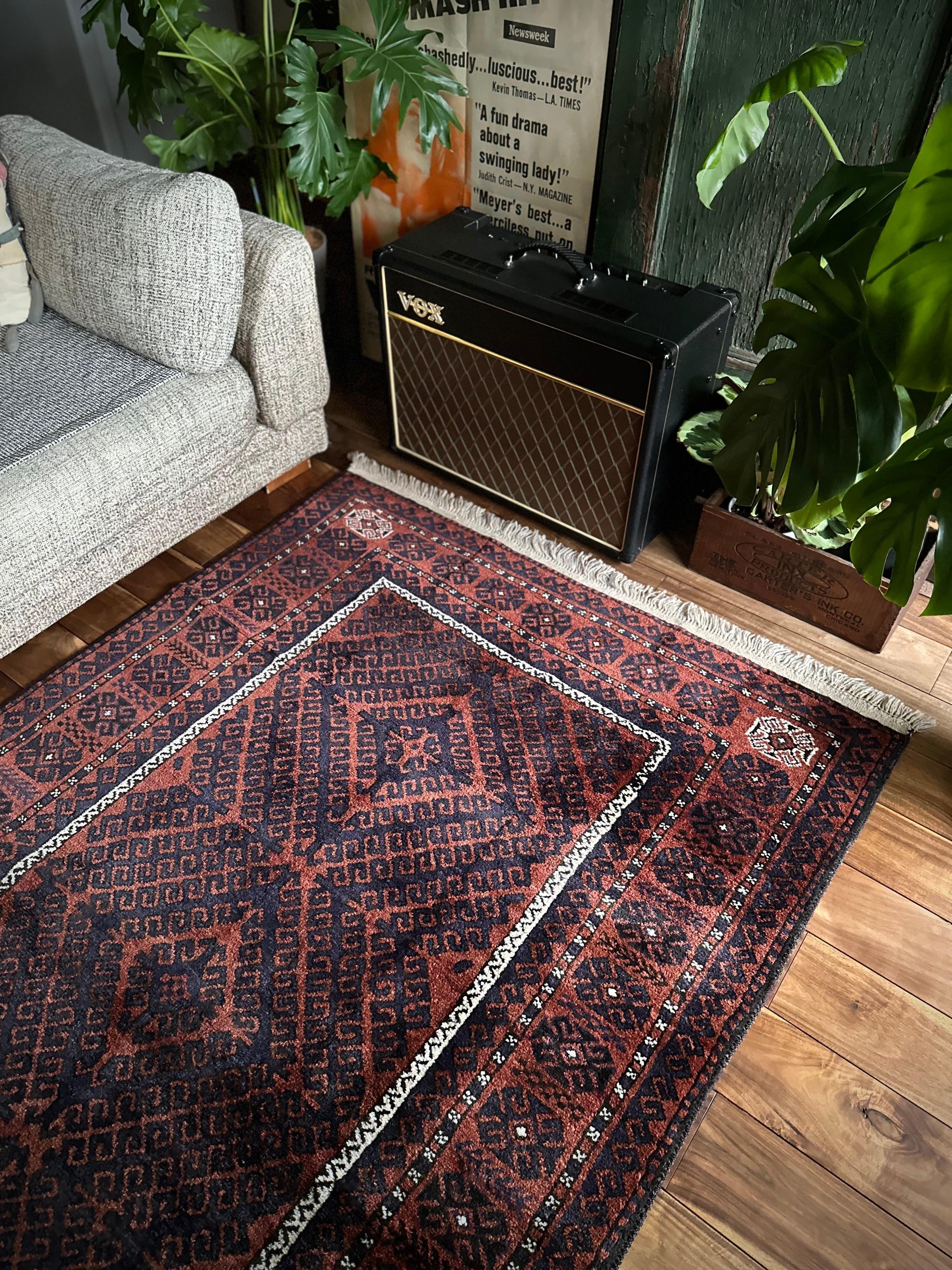 最後にラグそのものに関しては羊毛特有の匂いがあり、採寸は中央付近で計測していますが、手織りならではの歪みによる誤差や水洗いクリーニングによる縮み、また草木染めによる経年劣化の色ムラなどがありますが、それもまたヴィンテージラグの魅力かとご理解ください。