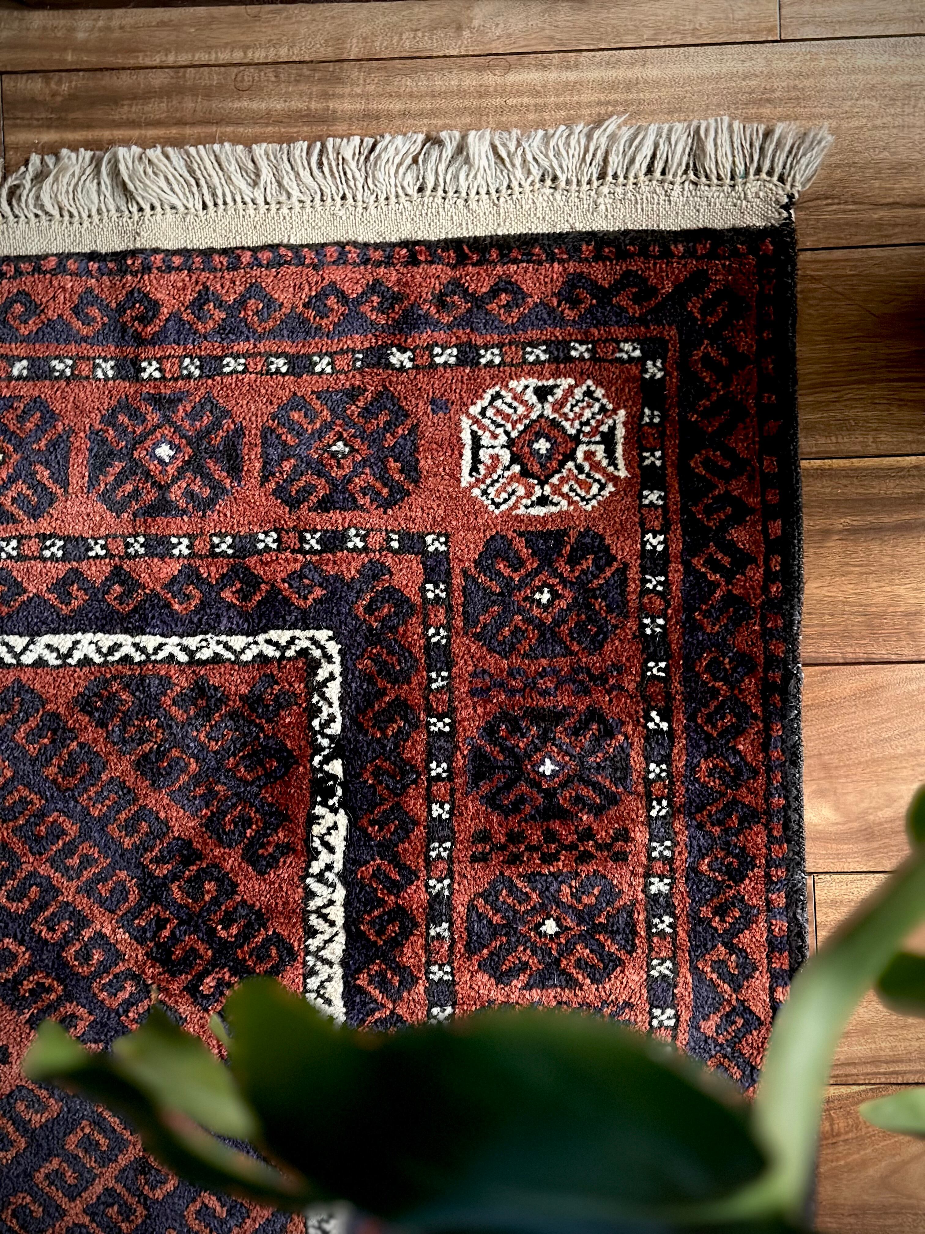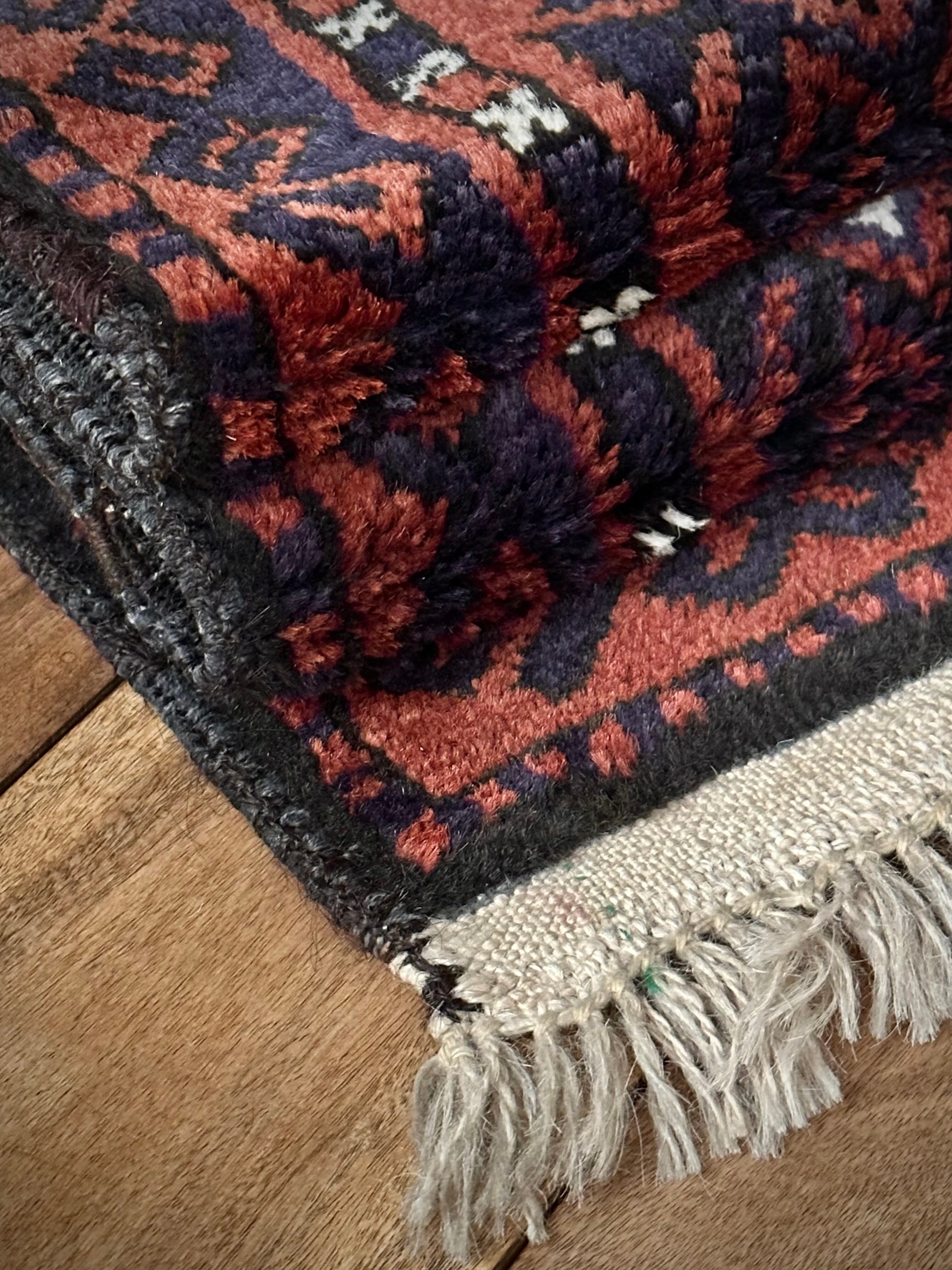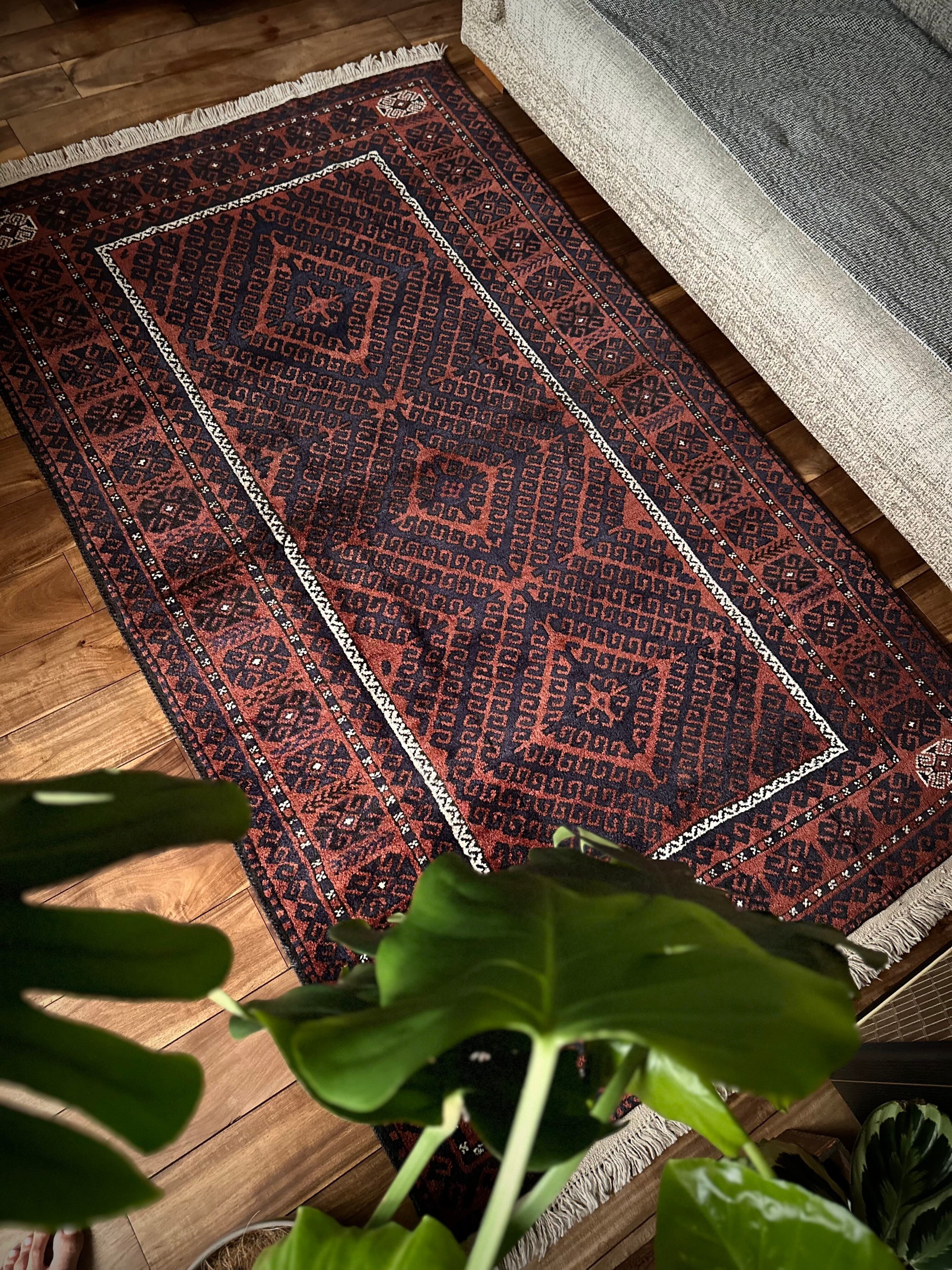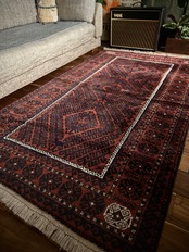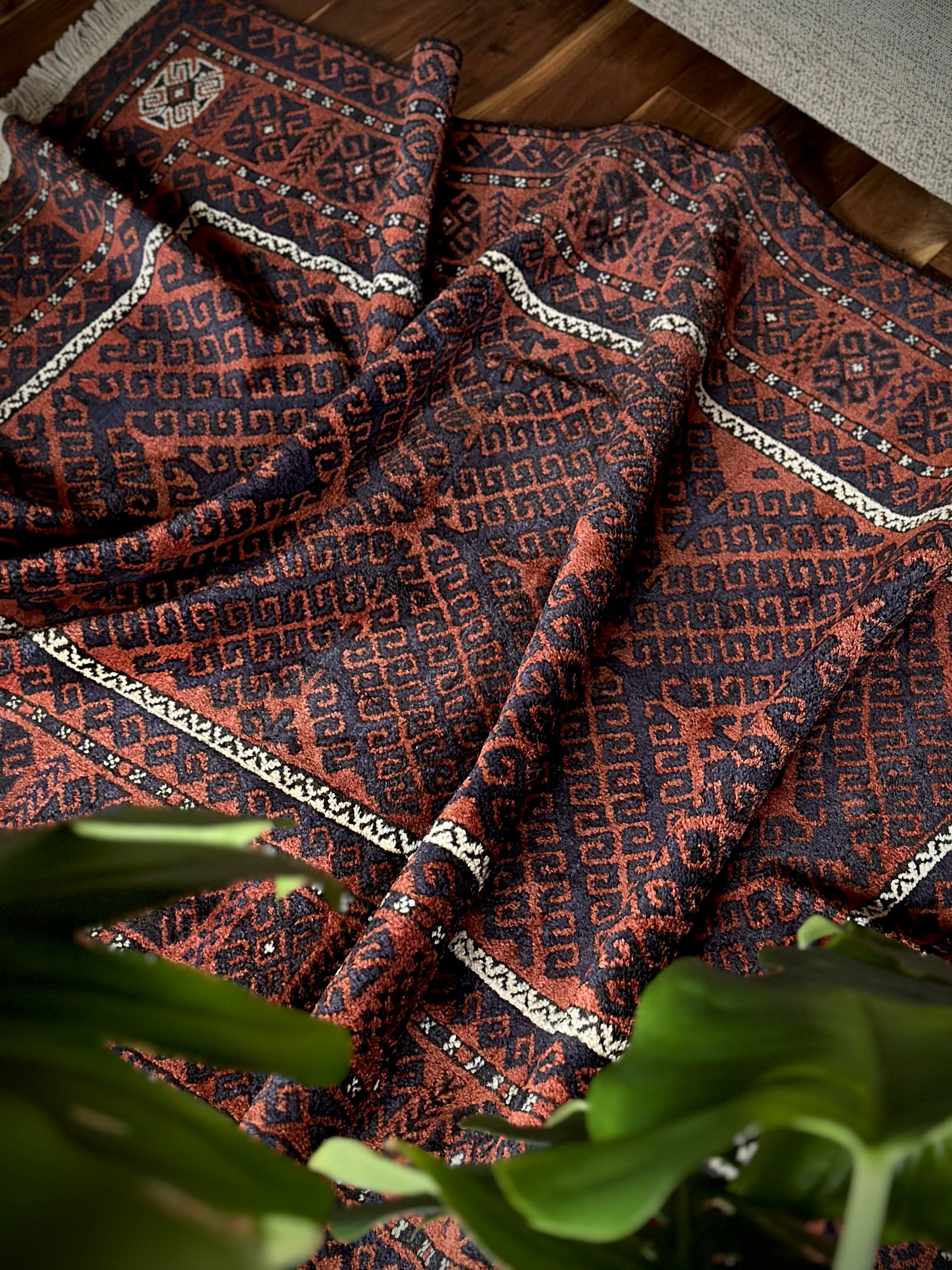 コーヒーブラウンのベースに褪色がかったブラックのフック模様がかっこいい、アフガニスタンはヘラート州に居住するタイマニ族のトライバルラグで、3連のメダリオンをフックが囲む”Zanjir Gul “と呼ばれるデザインになります。