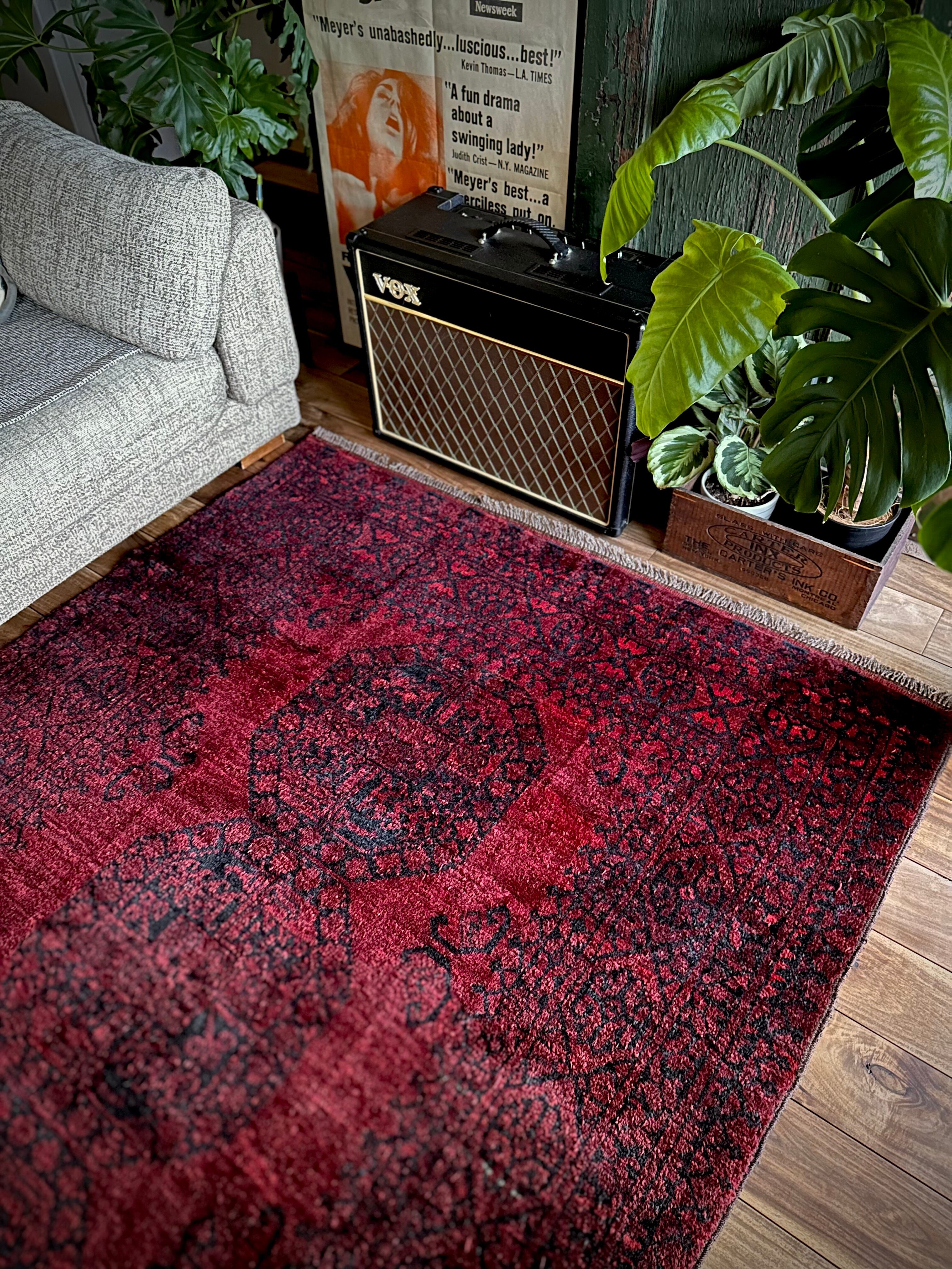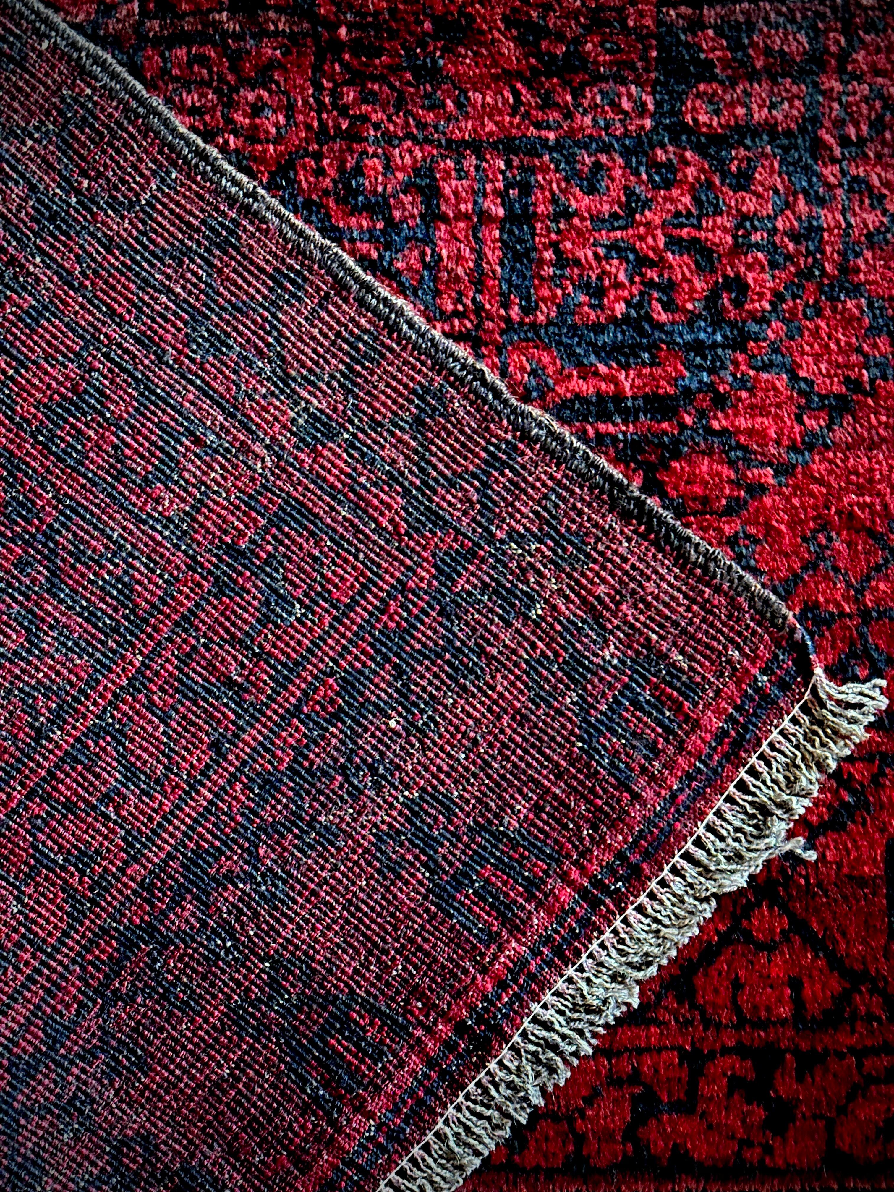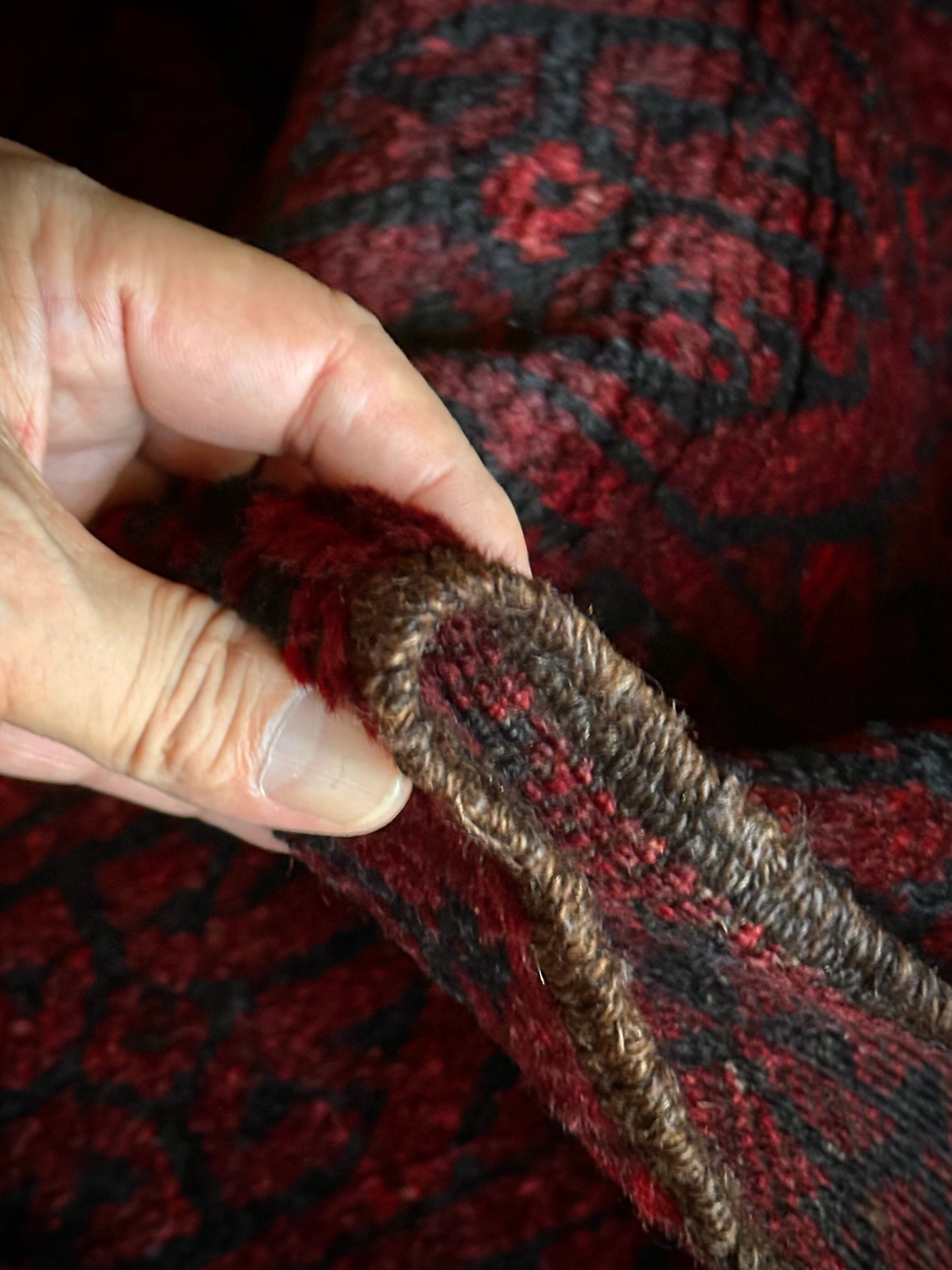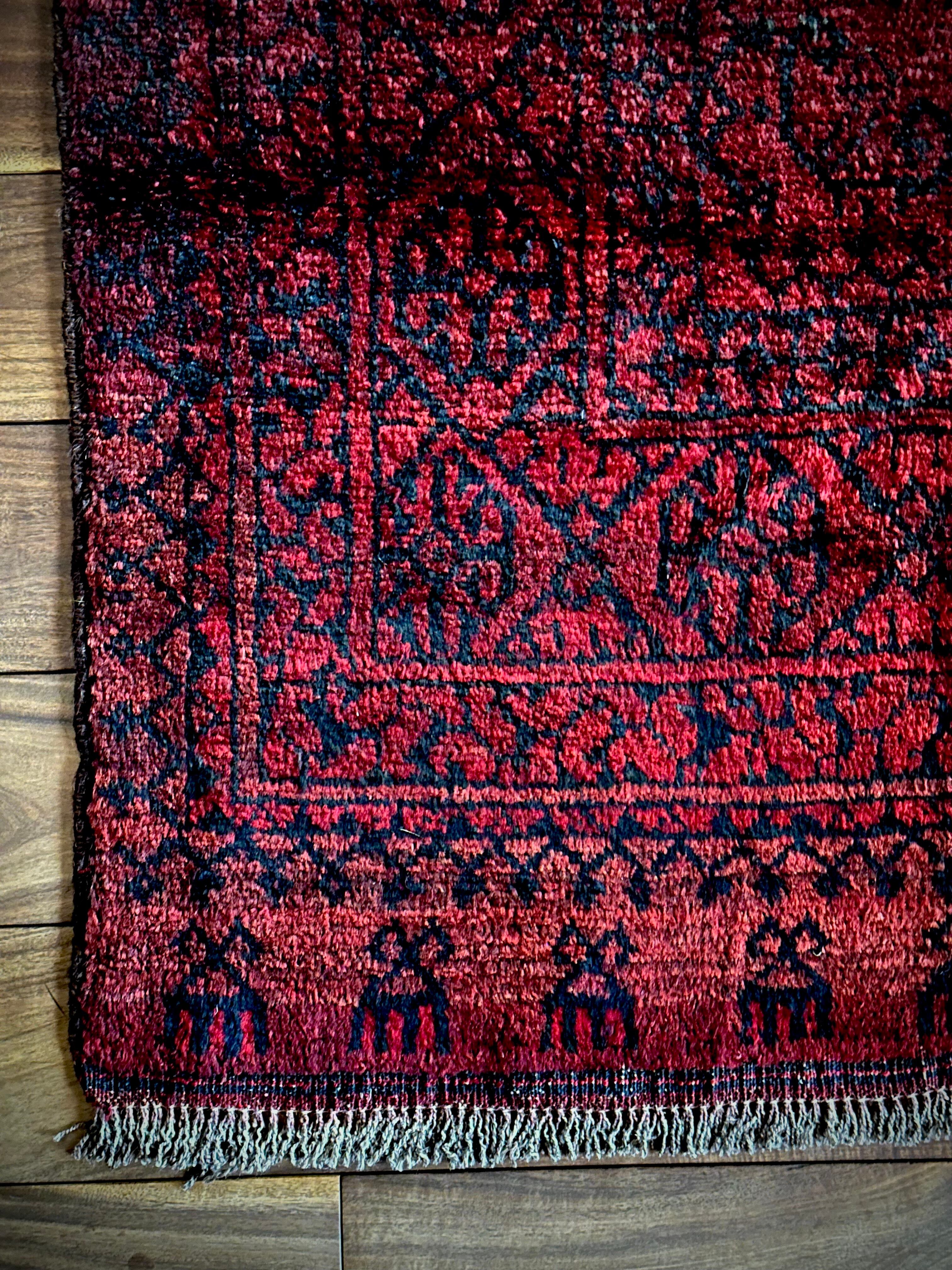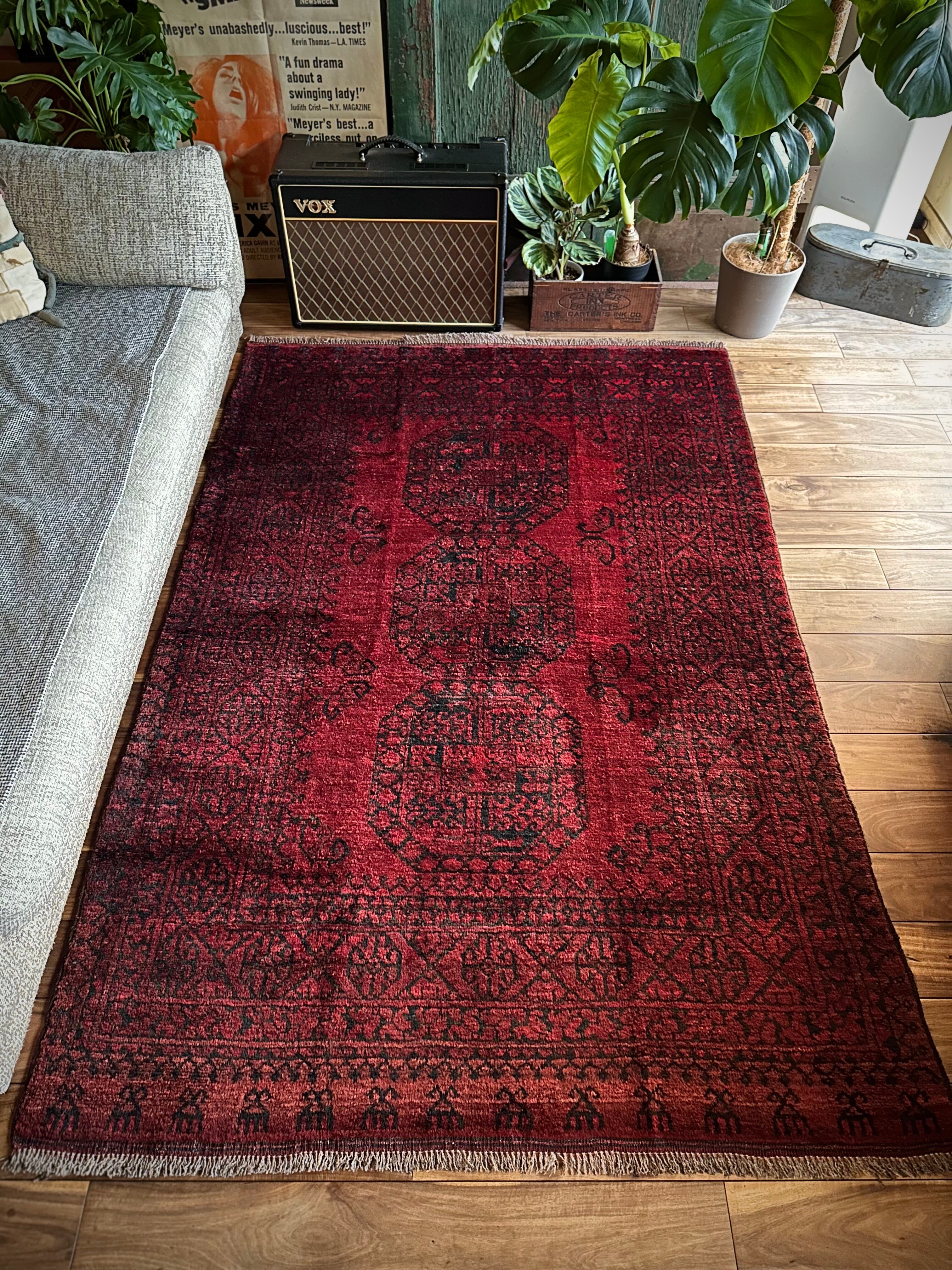ややアブラッシュがかった深みのあるバーガンディに象の足跡と称される3連のフィルパイ紋様が描かれた、アフガニスタン北部の国境付近アンドホイに居住するトルクメンの支族であるエルサリ族のトライバルラグになります。