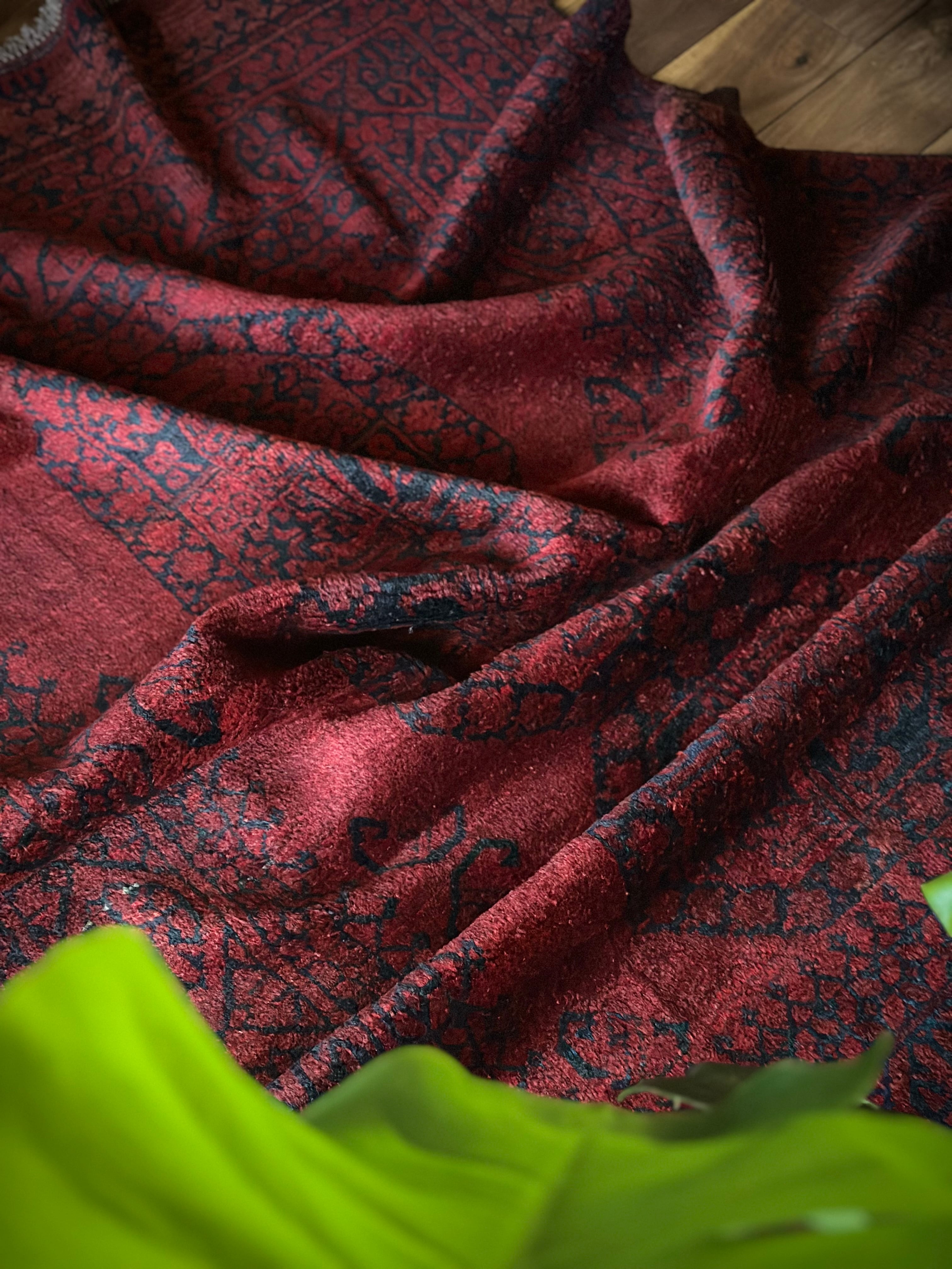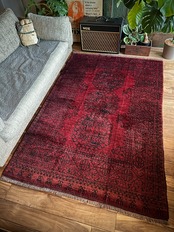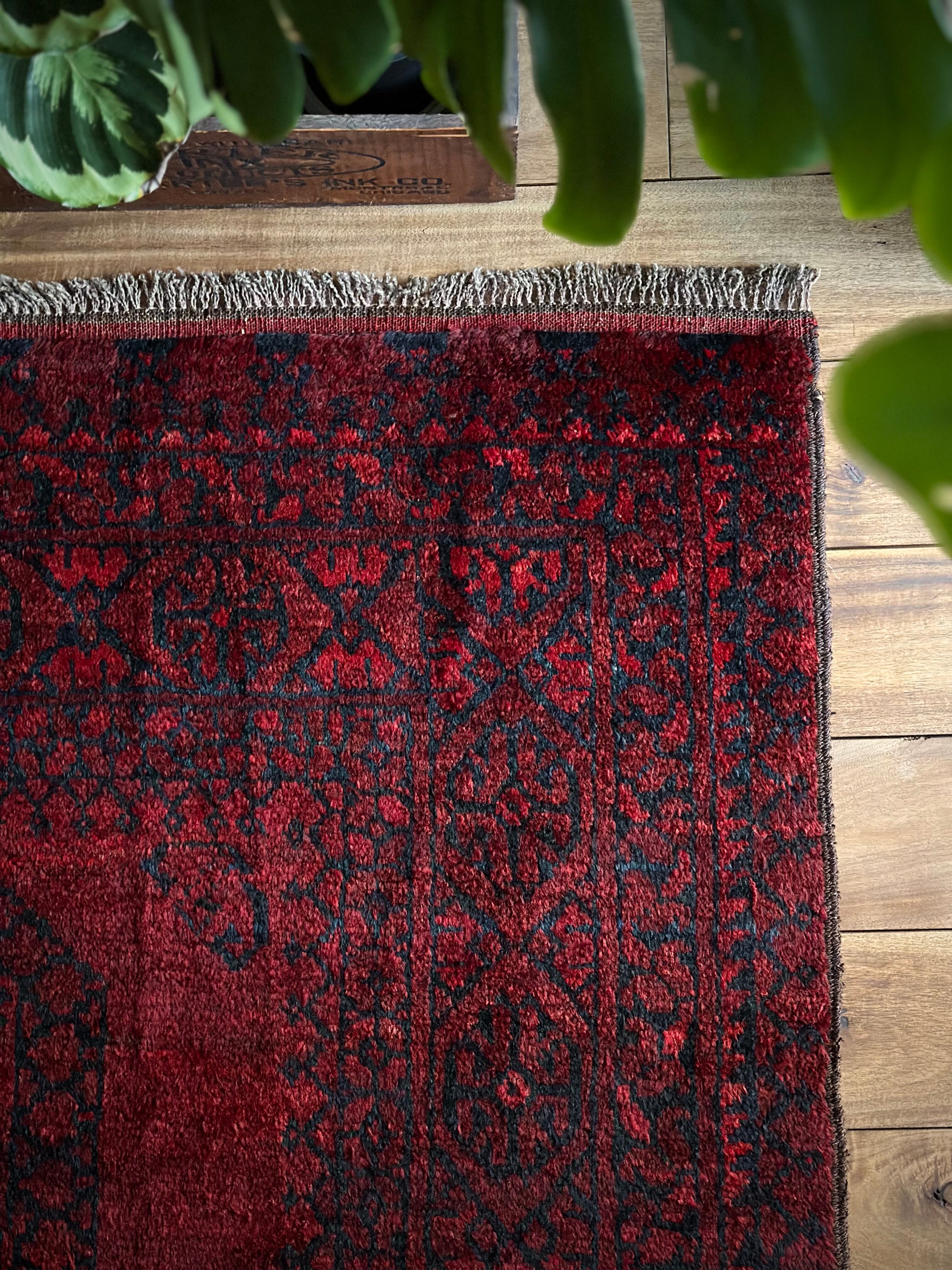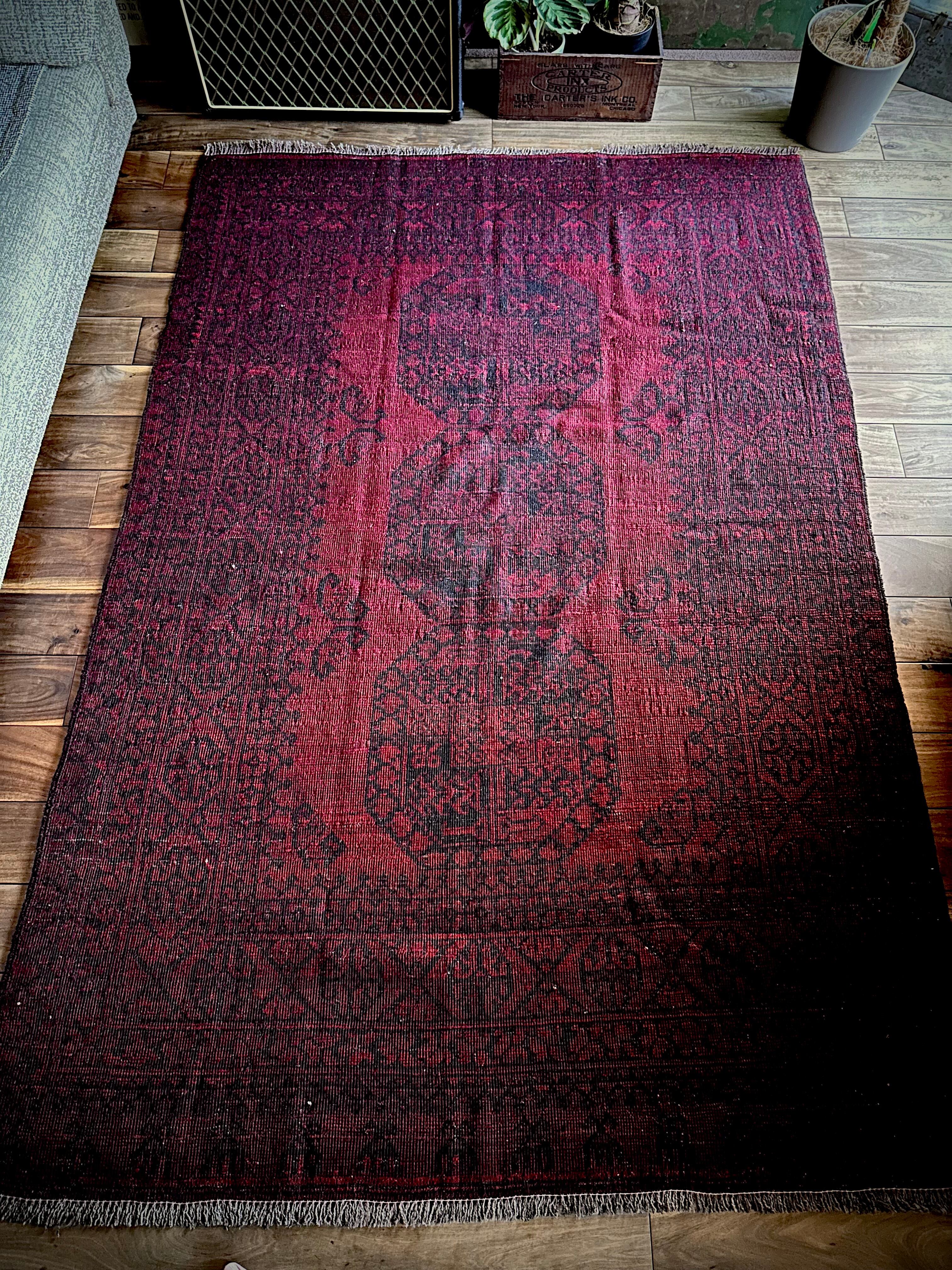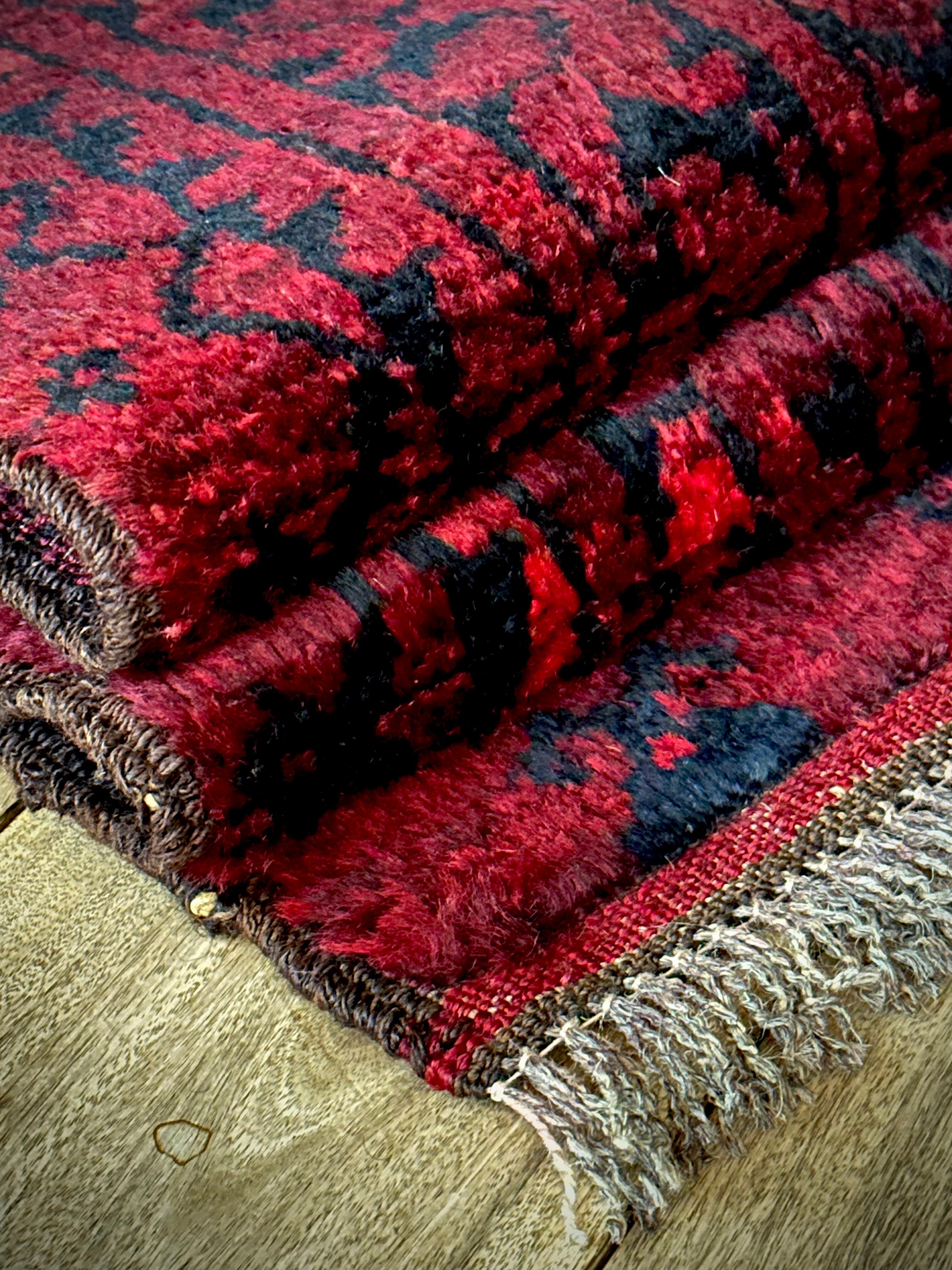 ややアブラッシュがかった深みのあるバーガンディに象の足跡と称される3連のフィルパイ紋様が描かれた、アフガニスタン北部の国境付近アンドホイに居住するトルクメンの支族であるエルサリ族のトライバルラグになります。