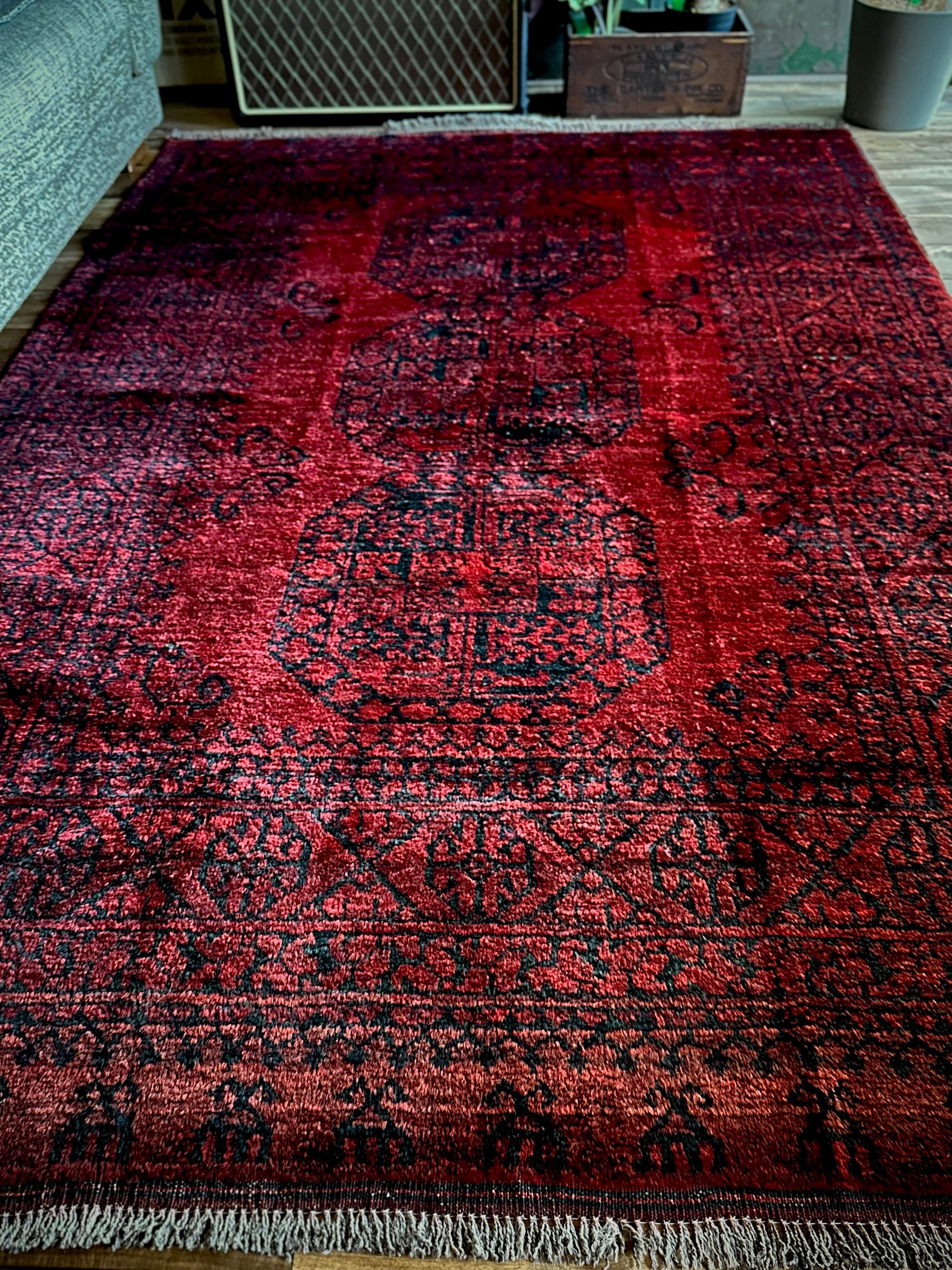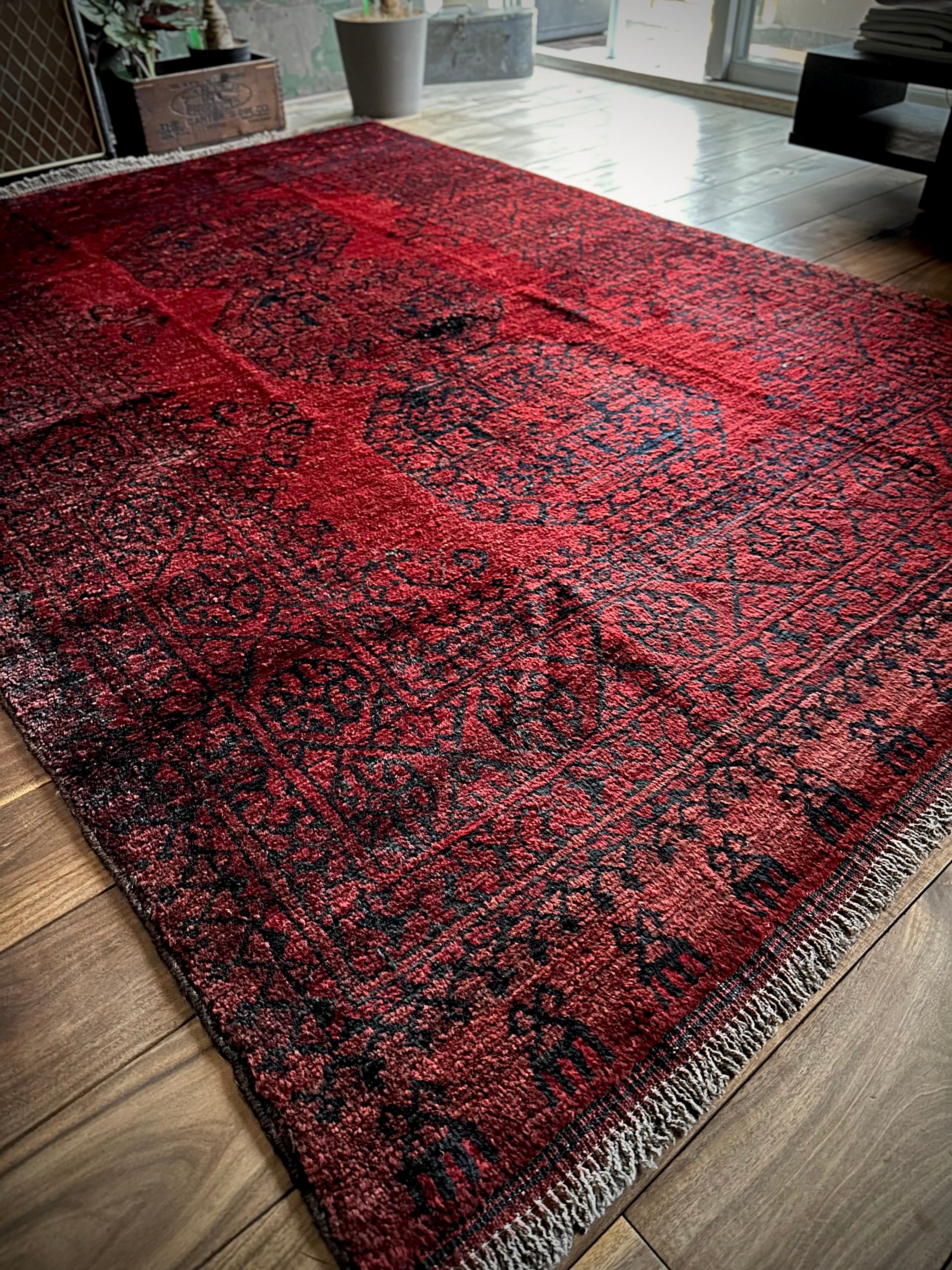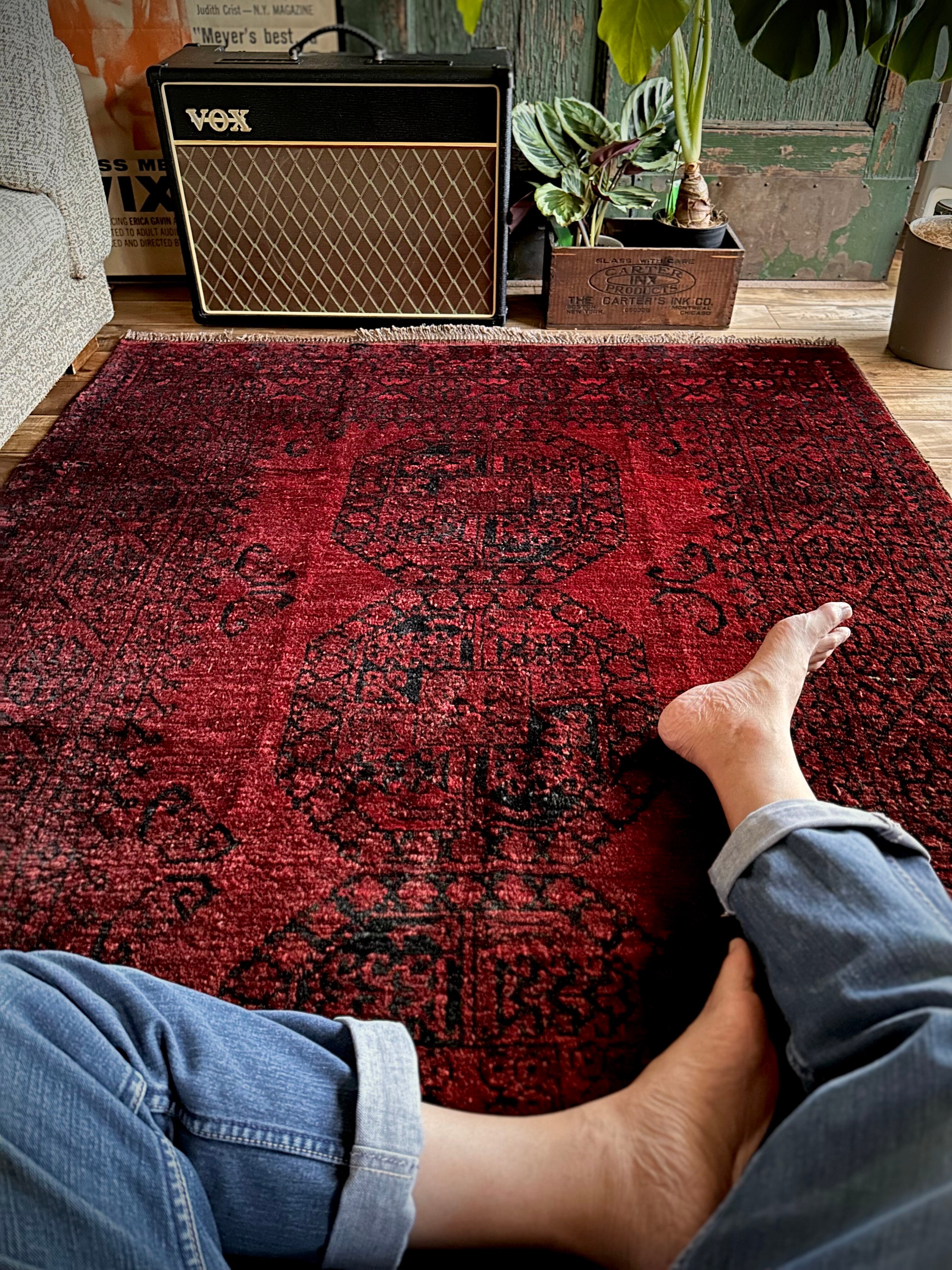 通常の細長いラグとは違い幅のあるどっしりとしたサイズ感が魅力的な1枚で、お部屋のリビングの真ん中にデデ〜ンと敷かれるその姿を想像するだけで高揚感が増しますが、トルクメンにしてはざっくりとした織りに厚みがあり、それでいてソフトな質感に足触りのよいしっとりとした長めのパイルが気持ちいいです。