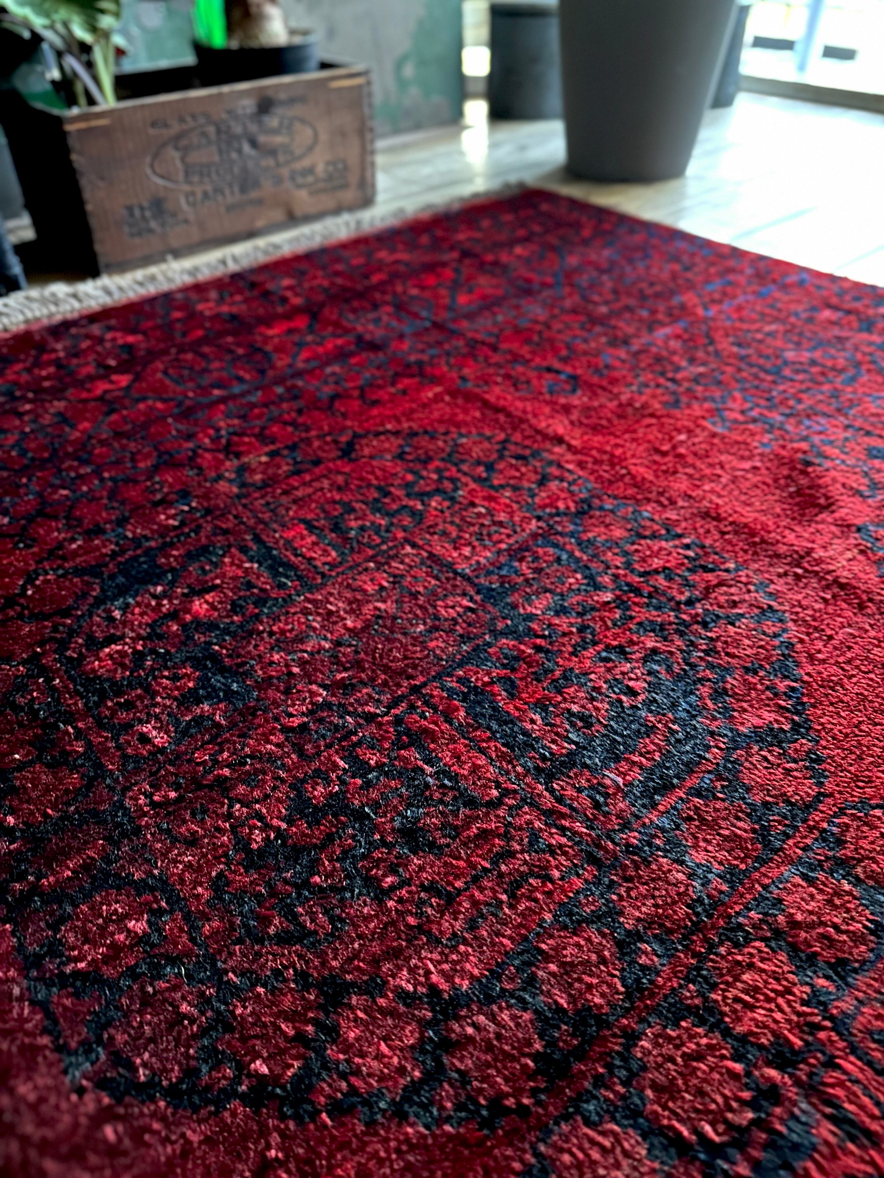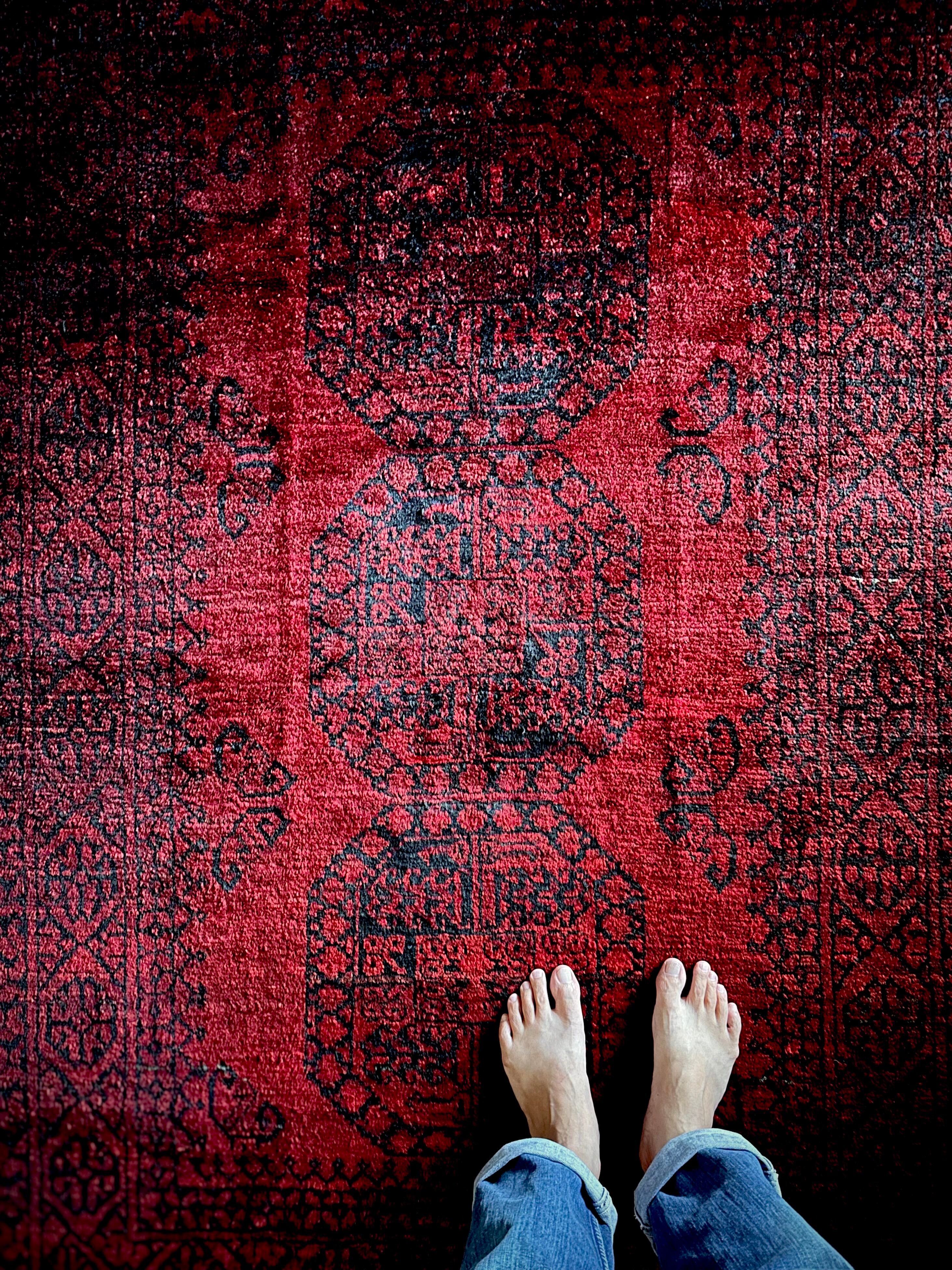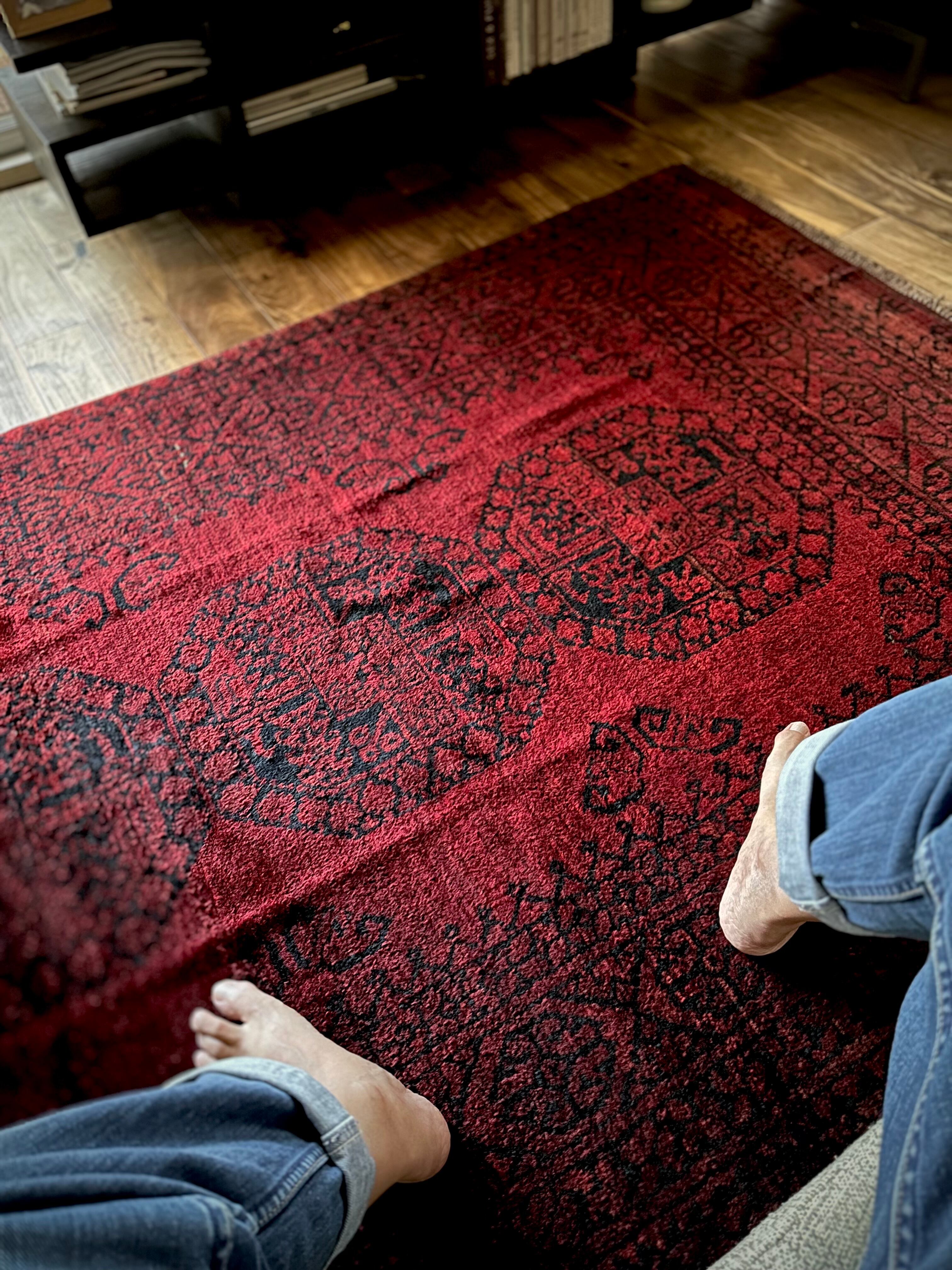 通常の細長いラグとは違い幅のあるどっしりとしたサイズ感が魅力的な1枚で、お部屋のリビングの真ん中にデデ〜ンと敷かれるその姿を想像するだけで高揚感が増しますが、トルクメンにしてはざっくりとした織りに厚みがあり、それでいてソフトな質感に足触りのよいしっとりとした長めのパイルが気持ちいいです。