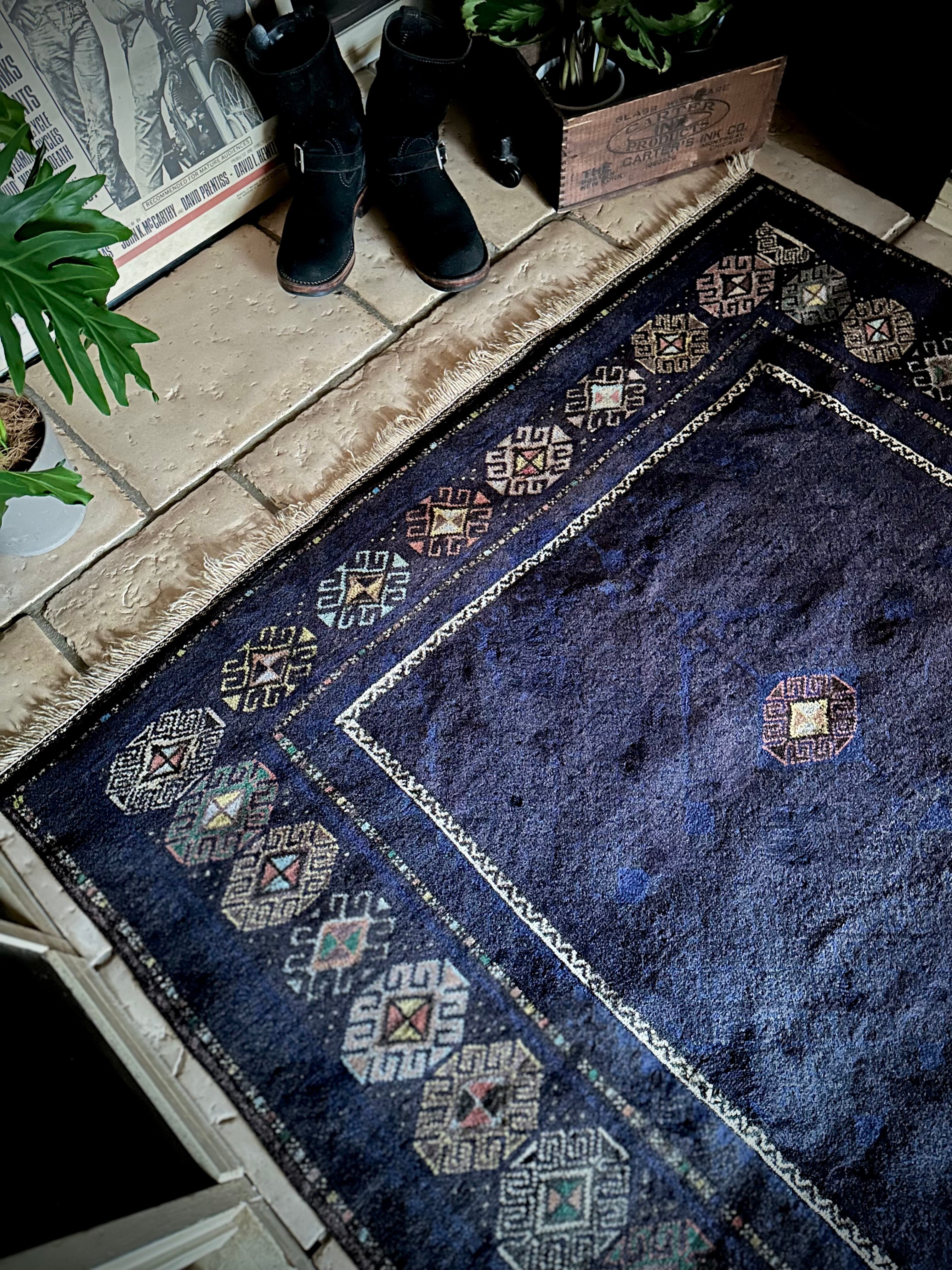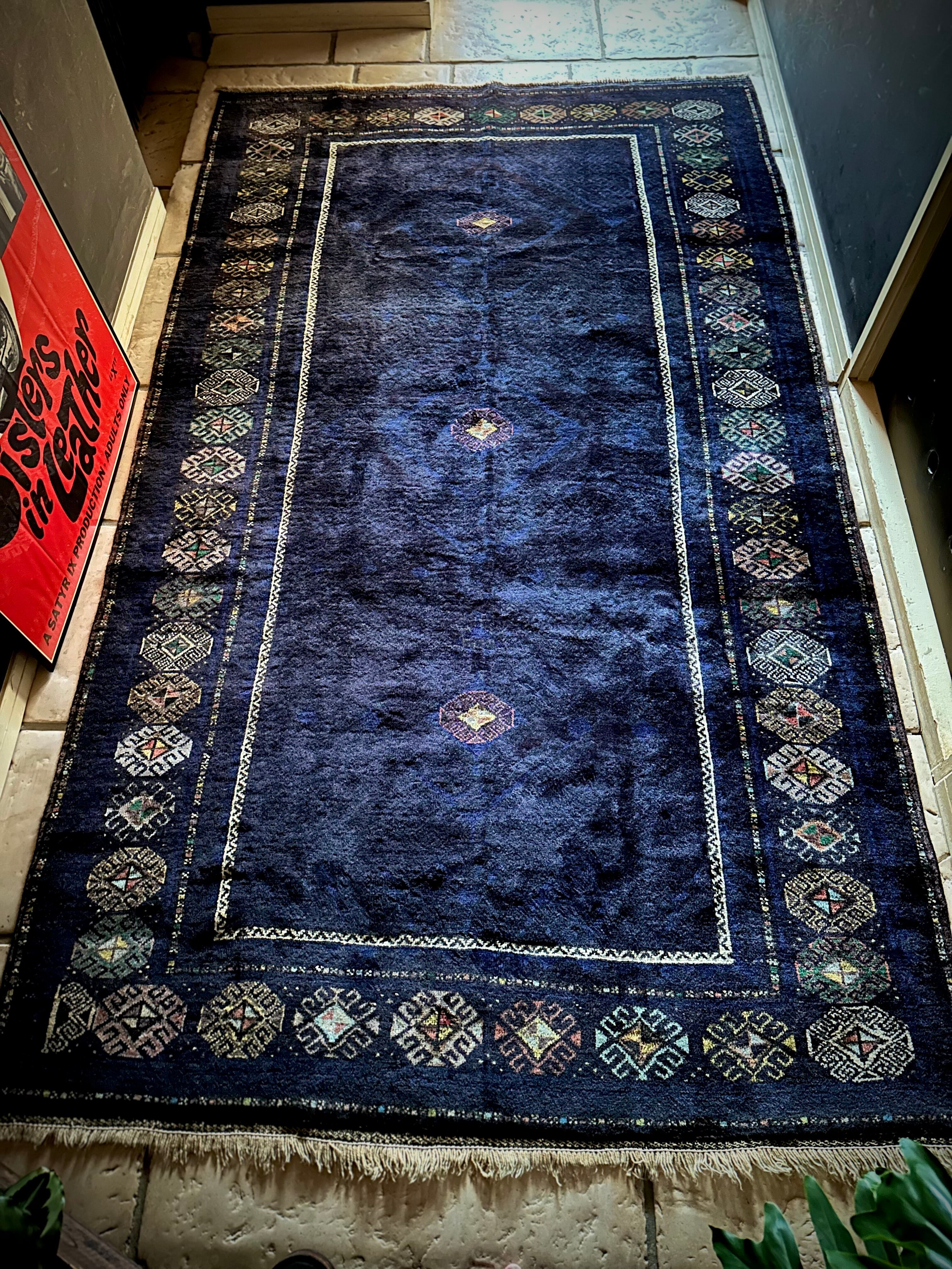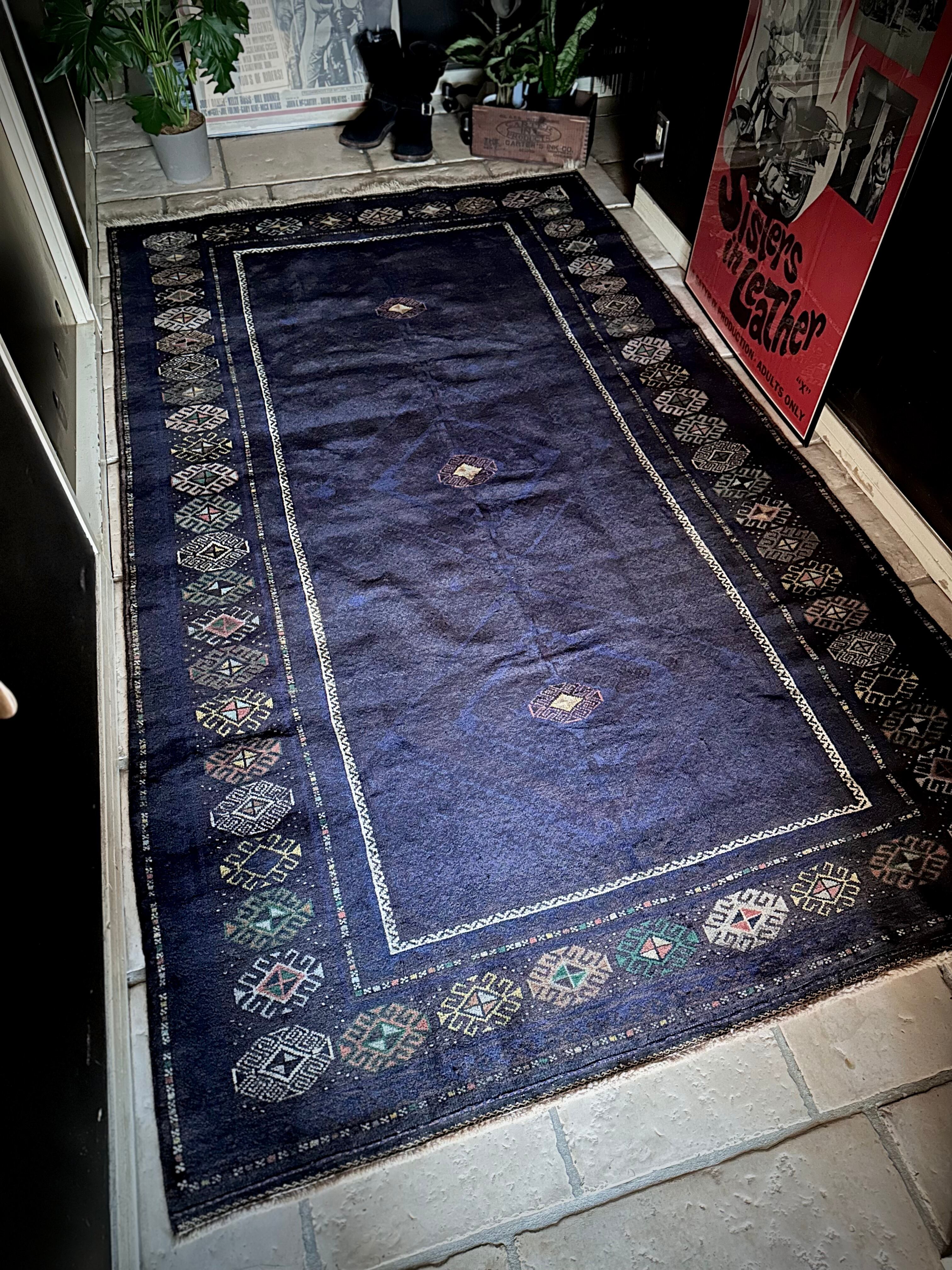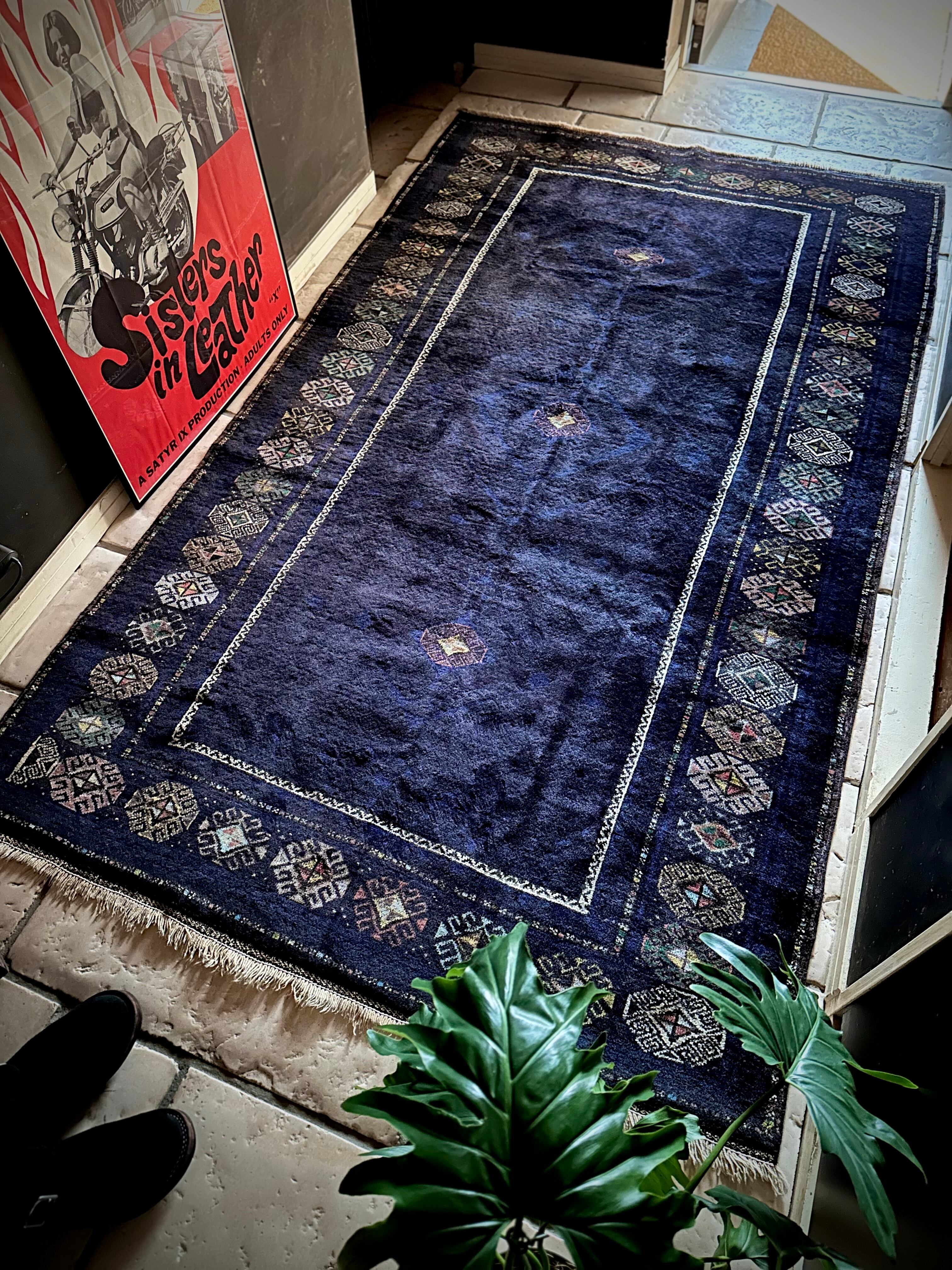 なんとも艶々なネイビーブルーにブラックが織り交わった一見してネイビーにしか見えない様が興味深い、アフガニスタンはヘラート州に居住するバルーチ族のトライバルラグで、直射日光に照らされると浮かび上がるフックの連続紋様の”Zanjir gul “がカッコよくて堪らないメインラグになります。