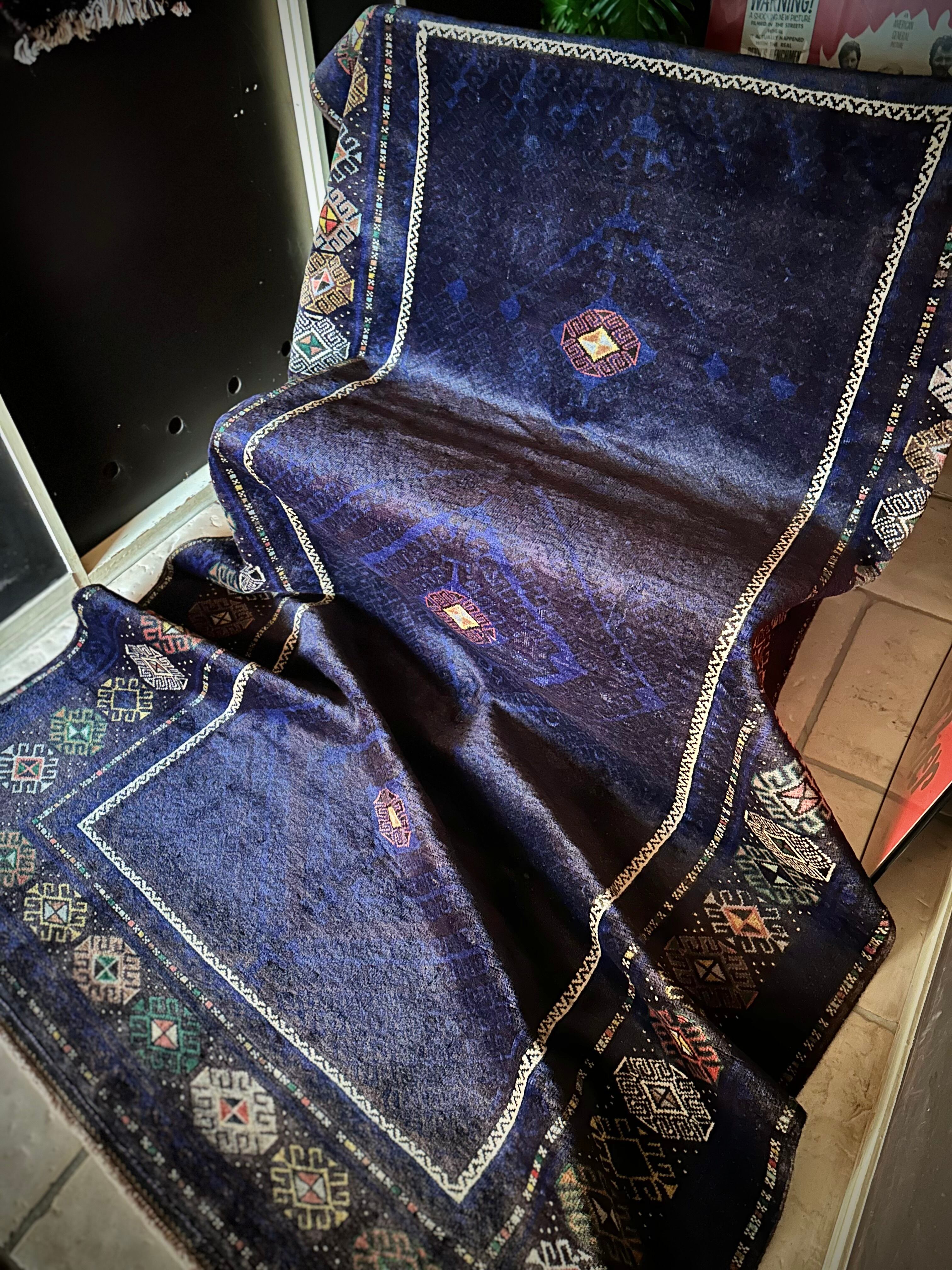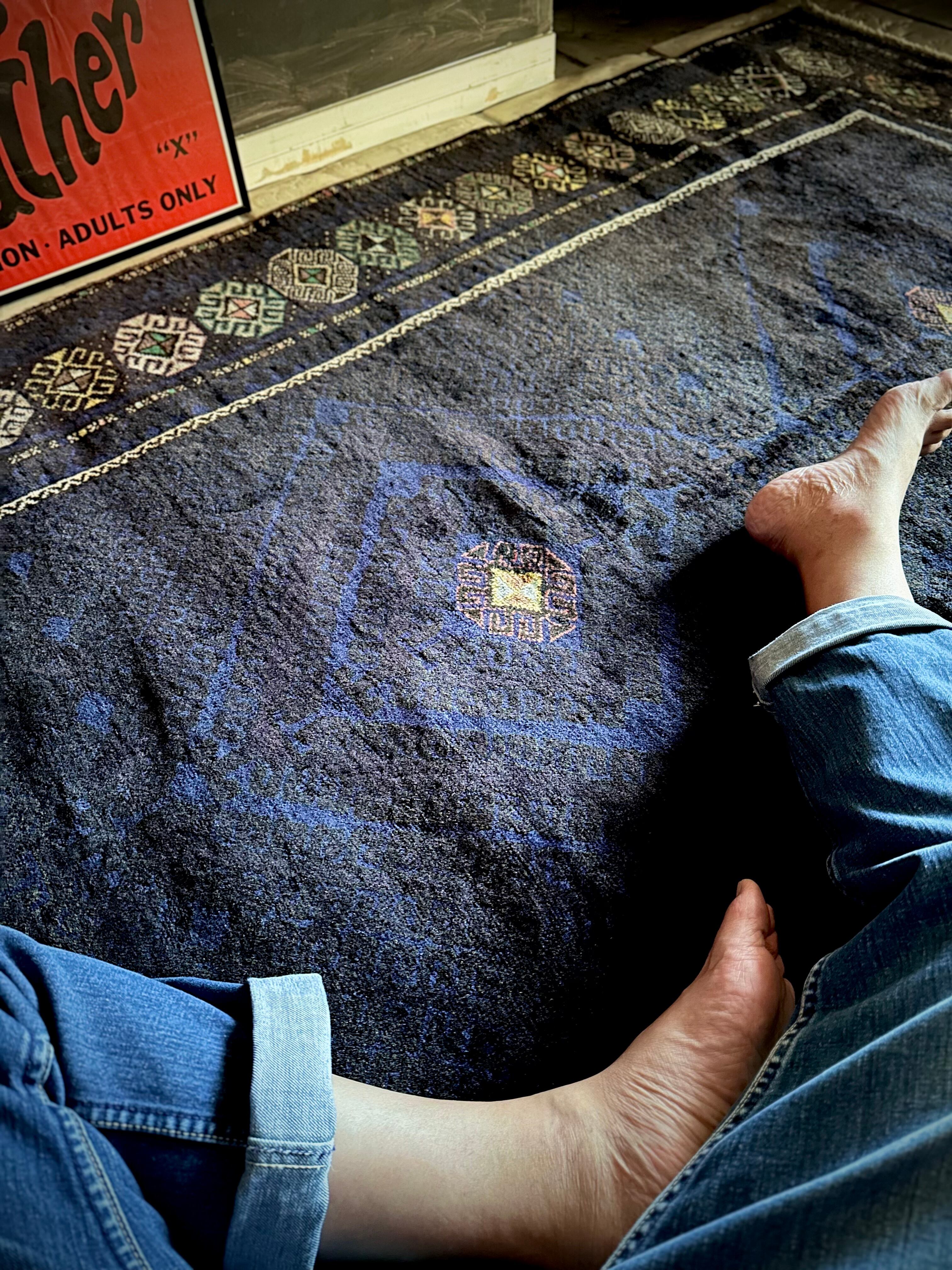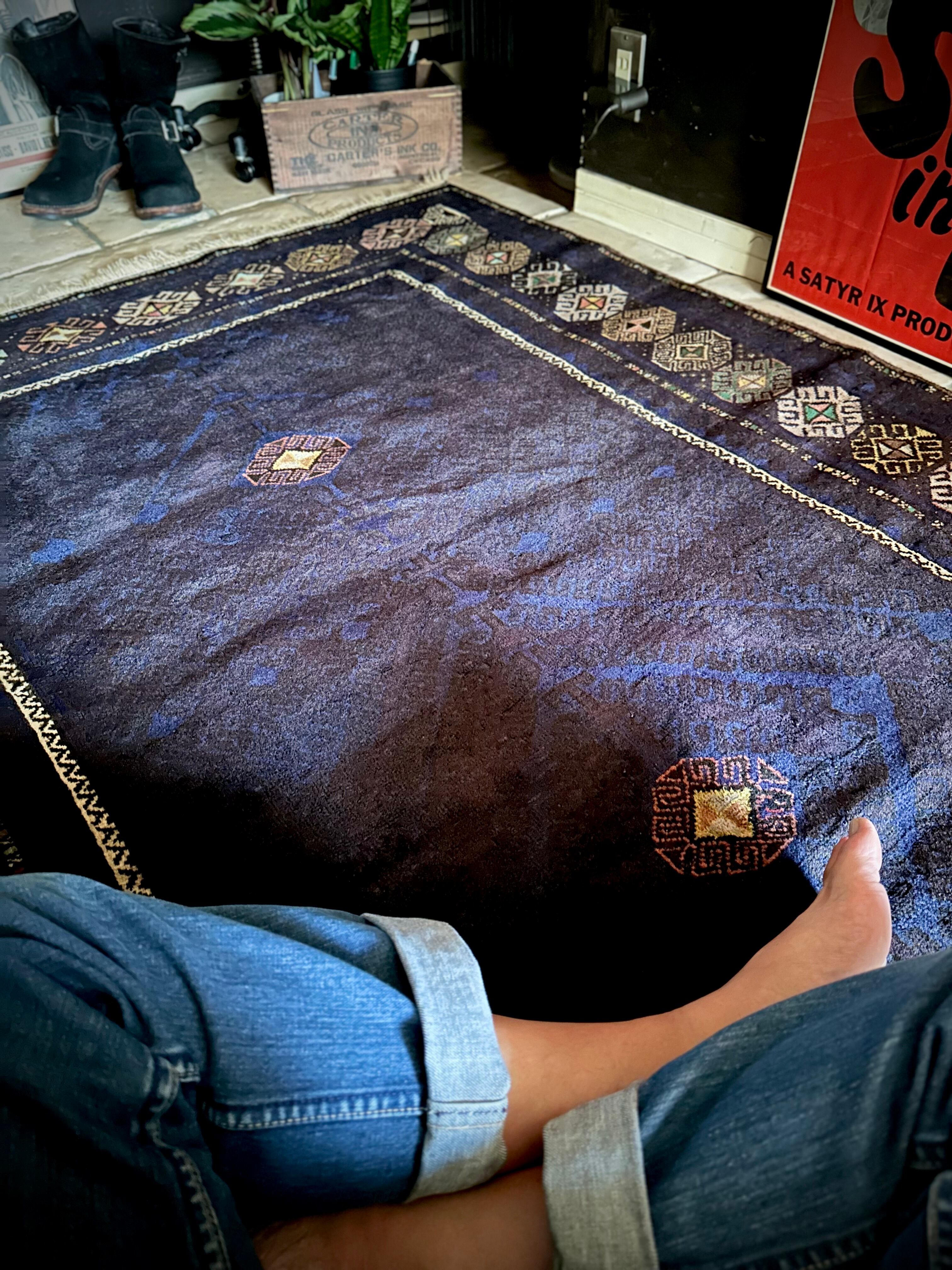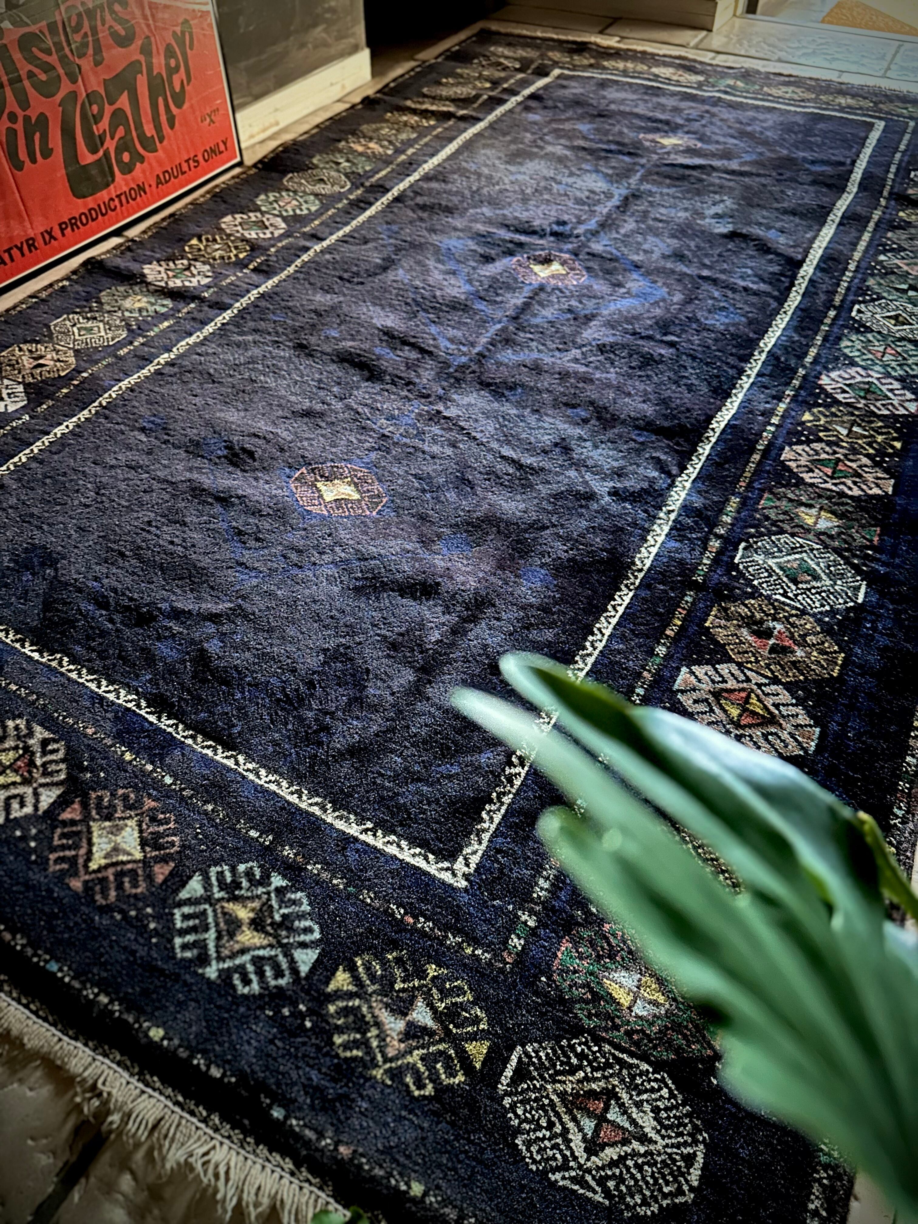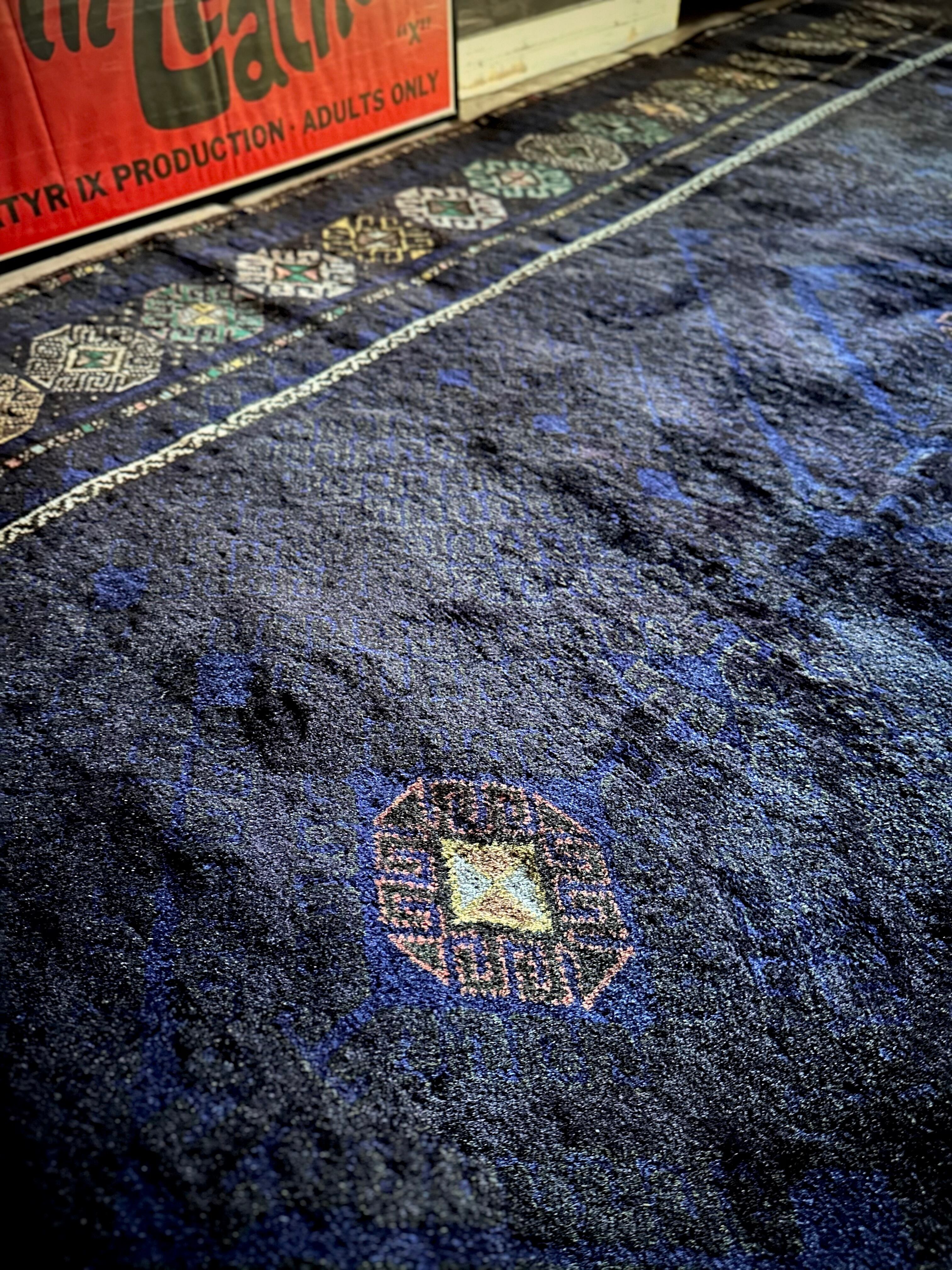 なんとも艶々なネイビーブルーにブラックが織り交わった一見してネイビーにしか見えない様が興味深い、アフガニスタンはヘラート州に居住するバルーチ族のトライバルラグで、直射日光に照らされると浮かび上がるフックの連続紋様の”Zanjir gul “がカッコよくて堪らないメインラグになります。