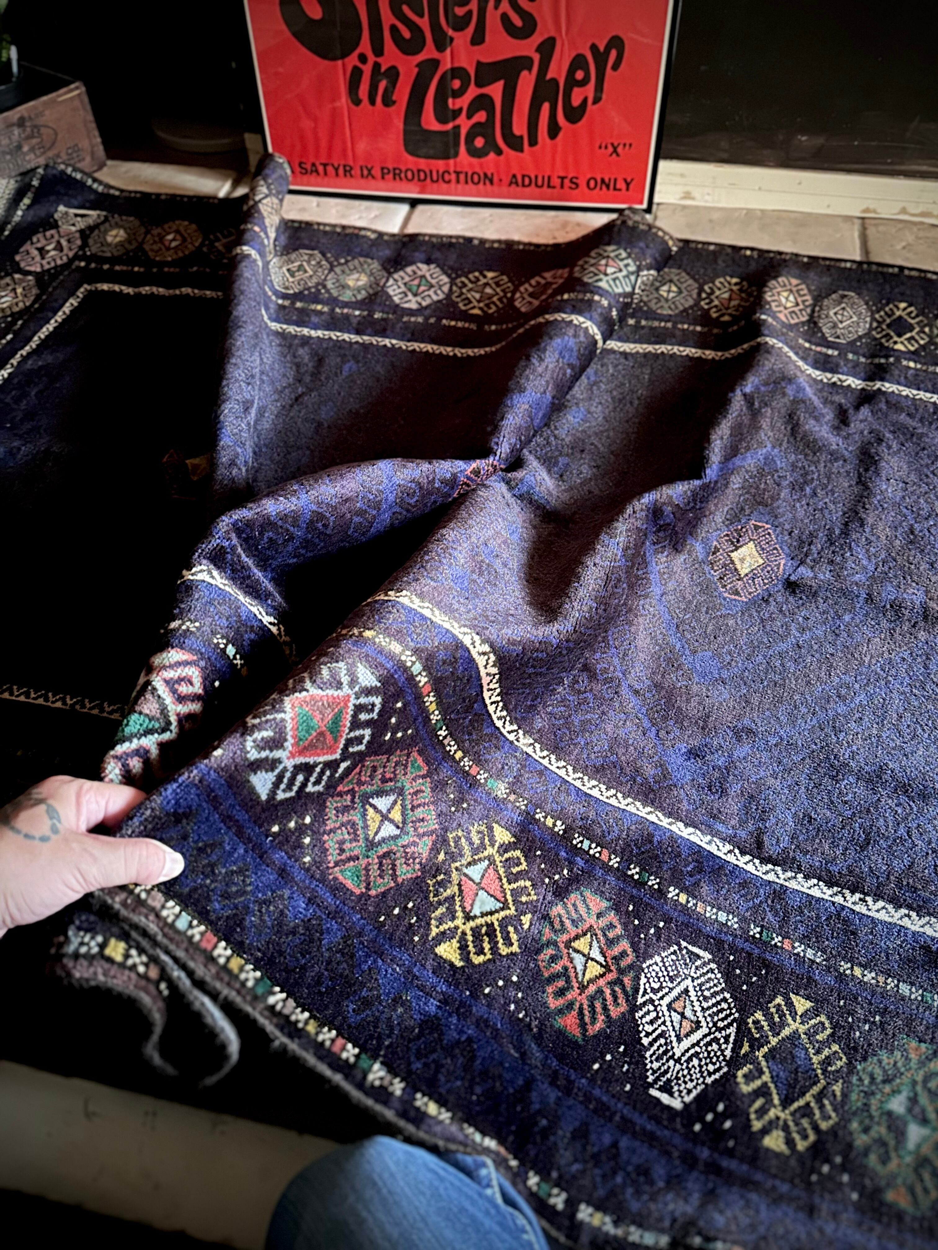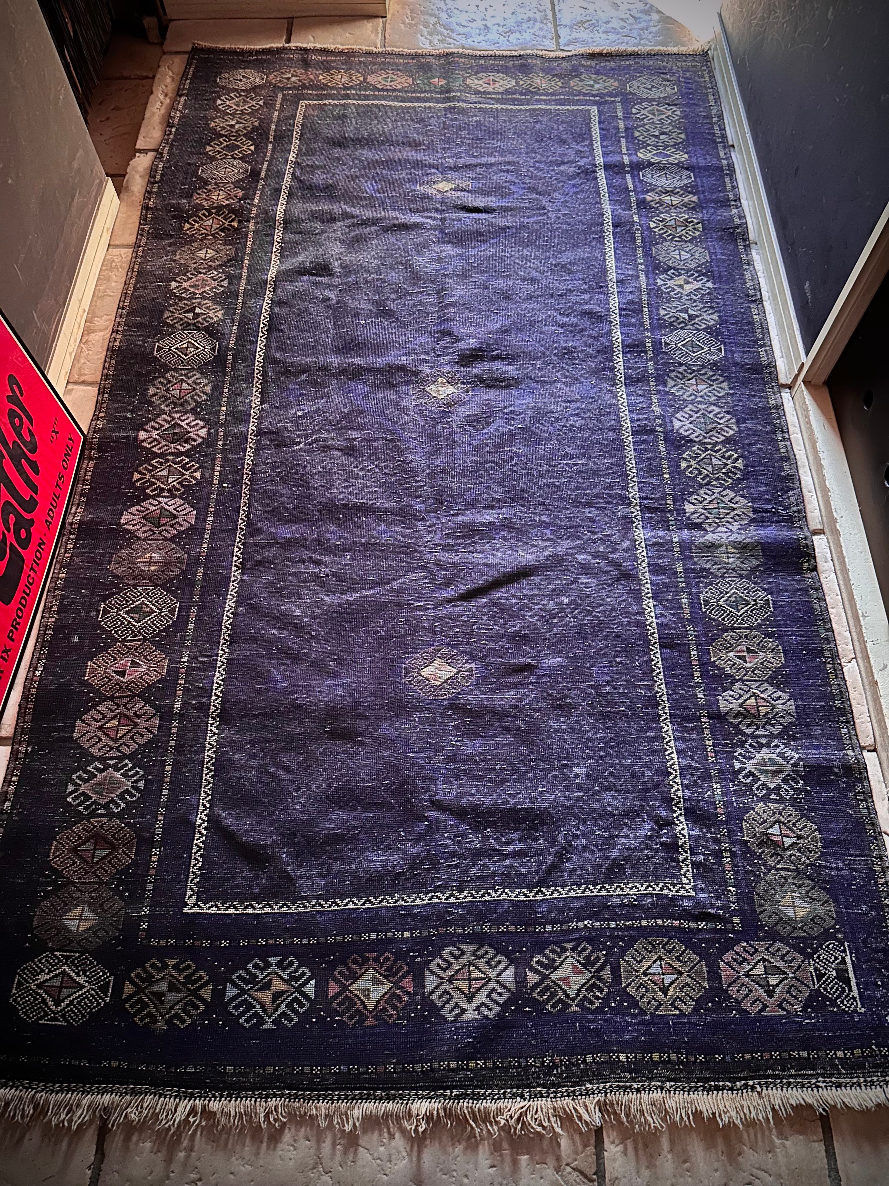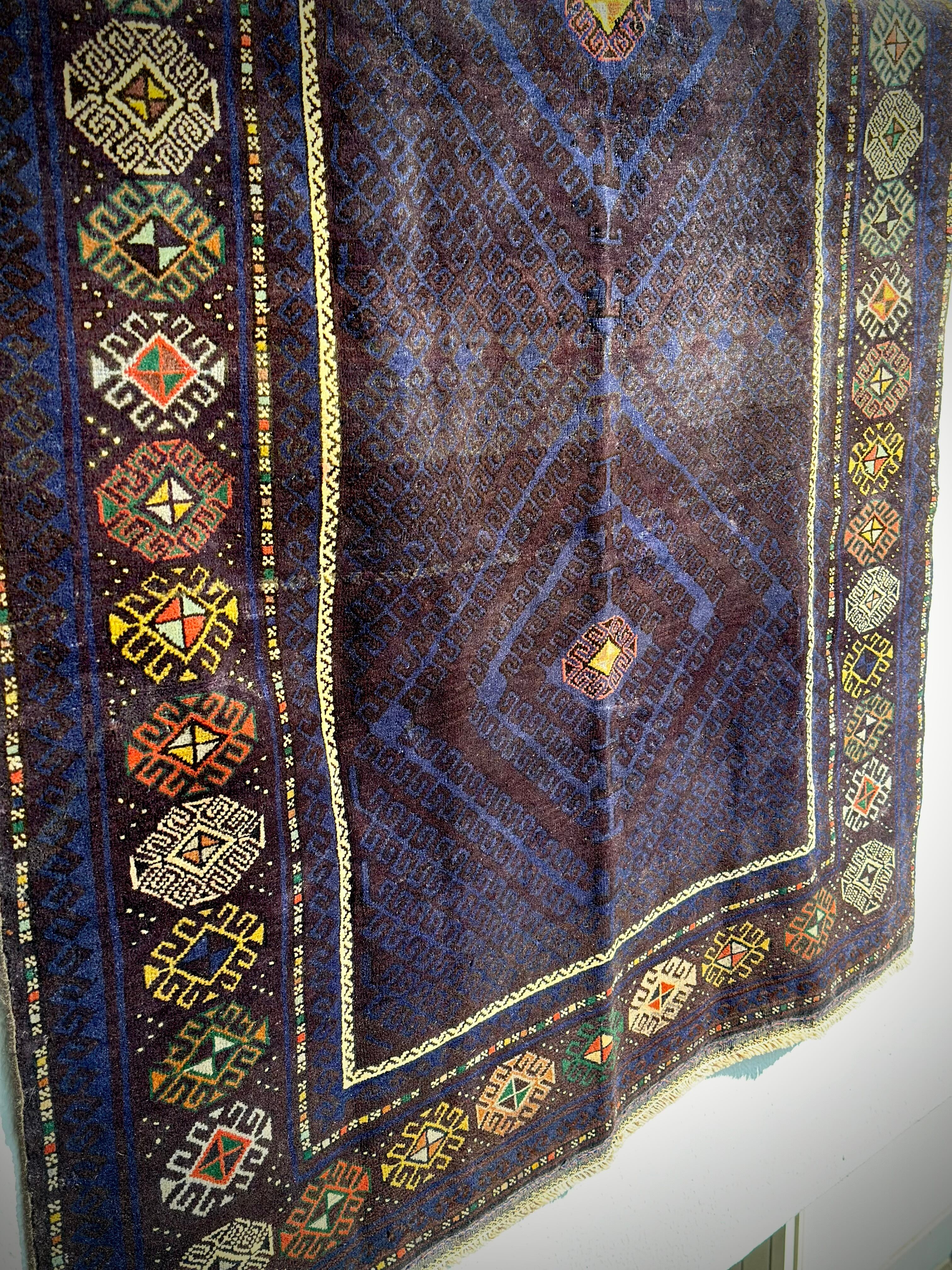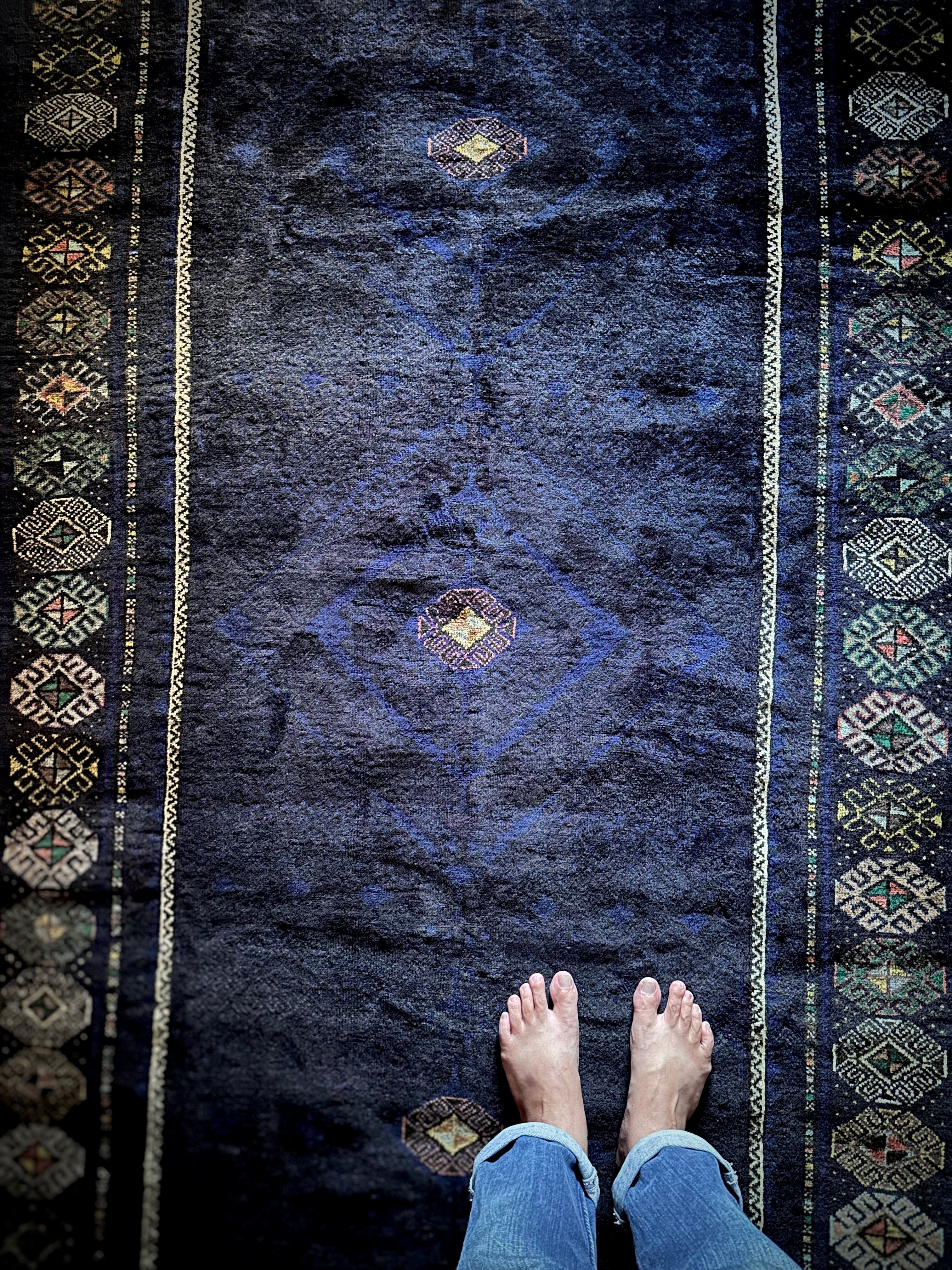 なんとも艶々なネイビーブルーにブラックが織り交わった一見してネイビーにしか見えない様が興味深い、アフガニスタンはヘラート州に居住するバルーチ族のトライバルラグで、直射日光に照らされると浮かび上がるフックの連続紋様の”Zanjir gul “がカッコよくて堪らないメインラグになります。