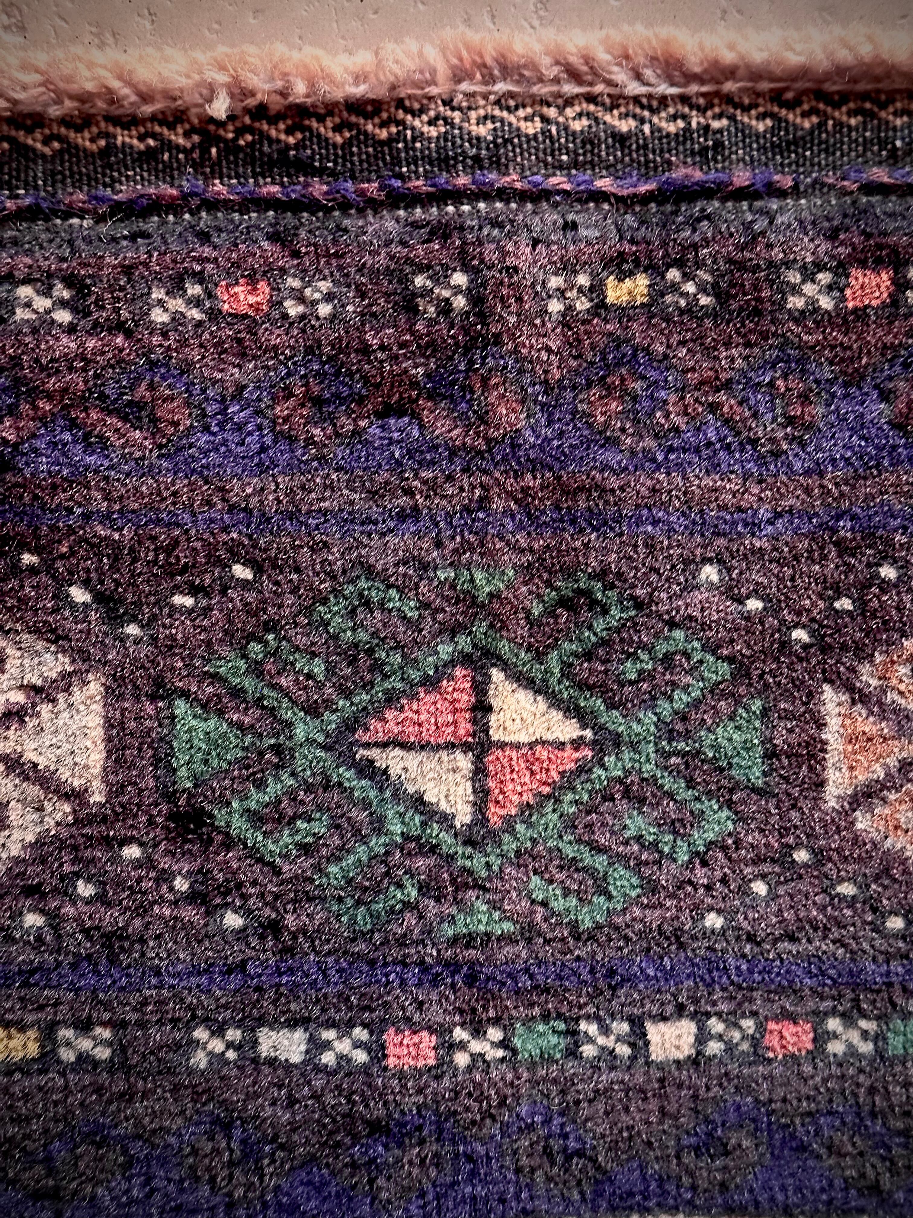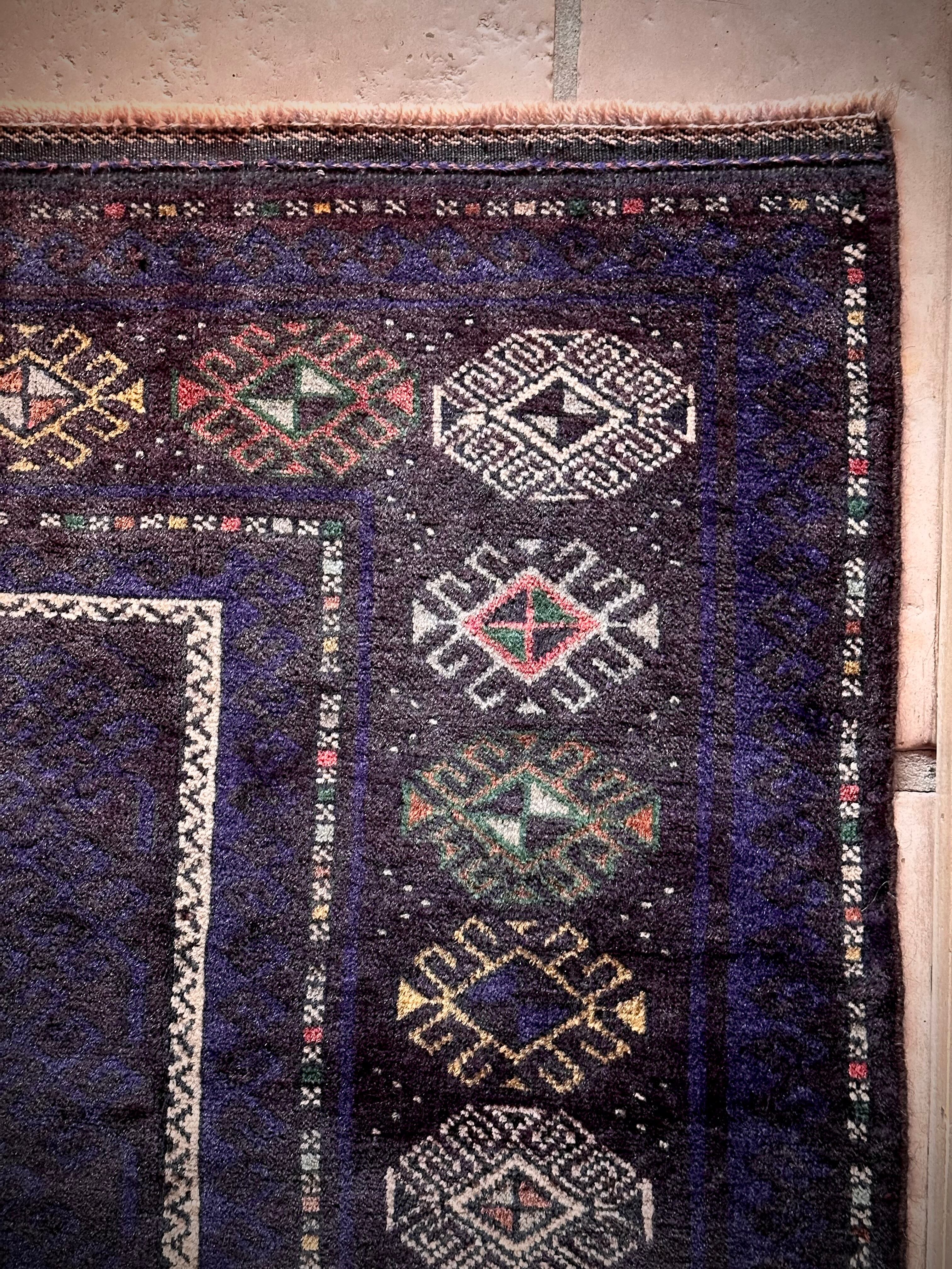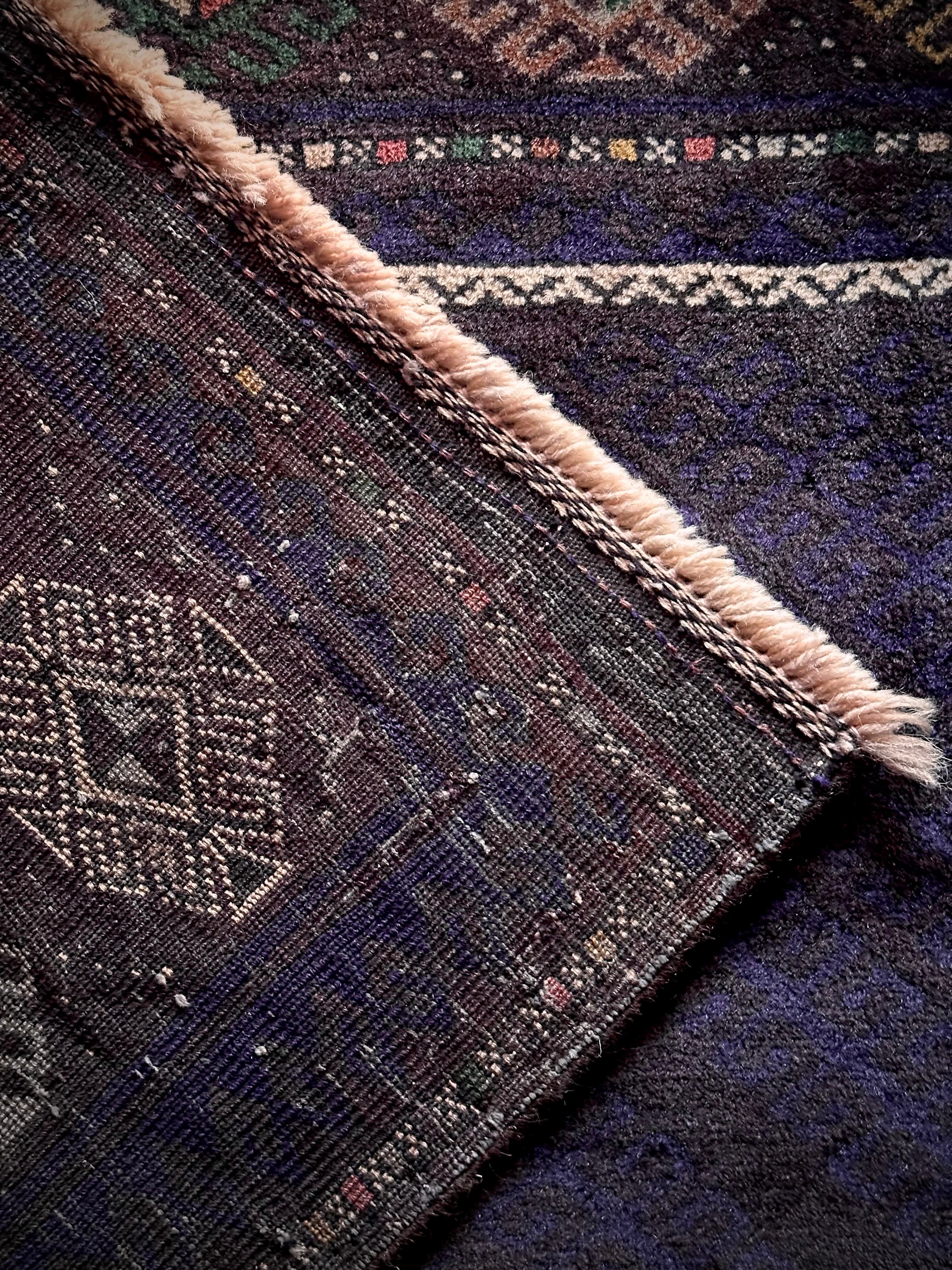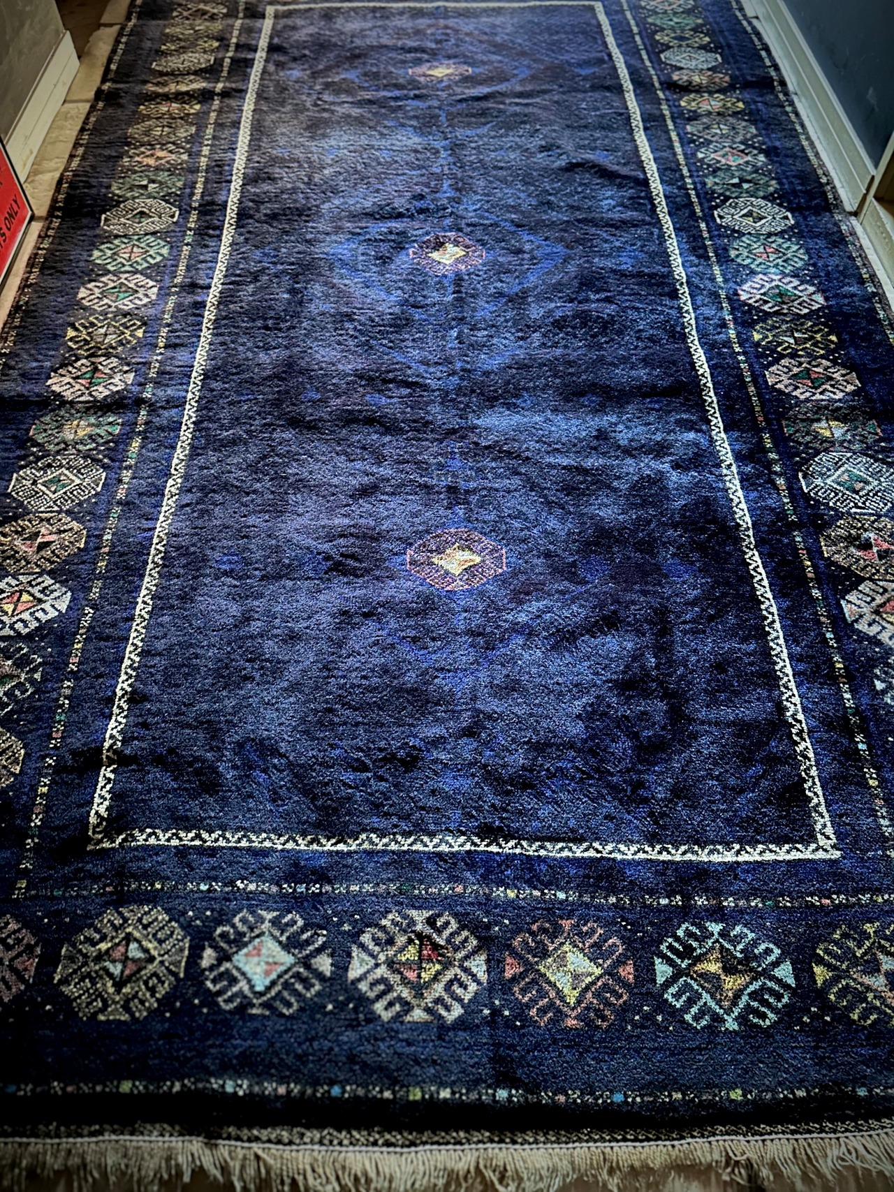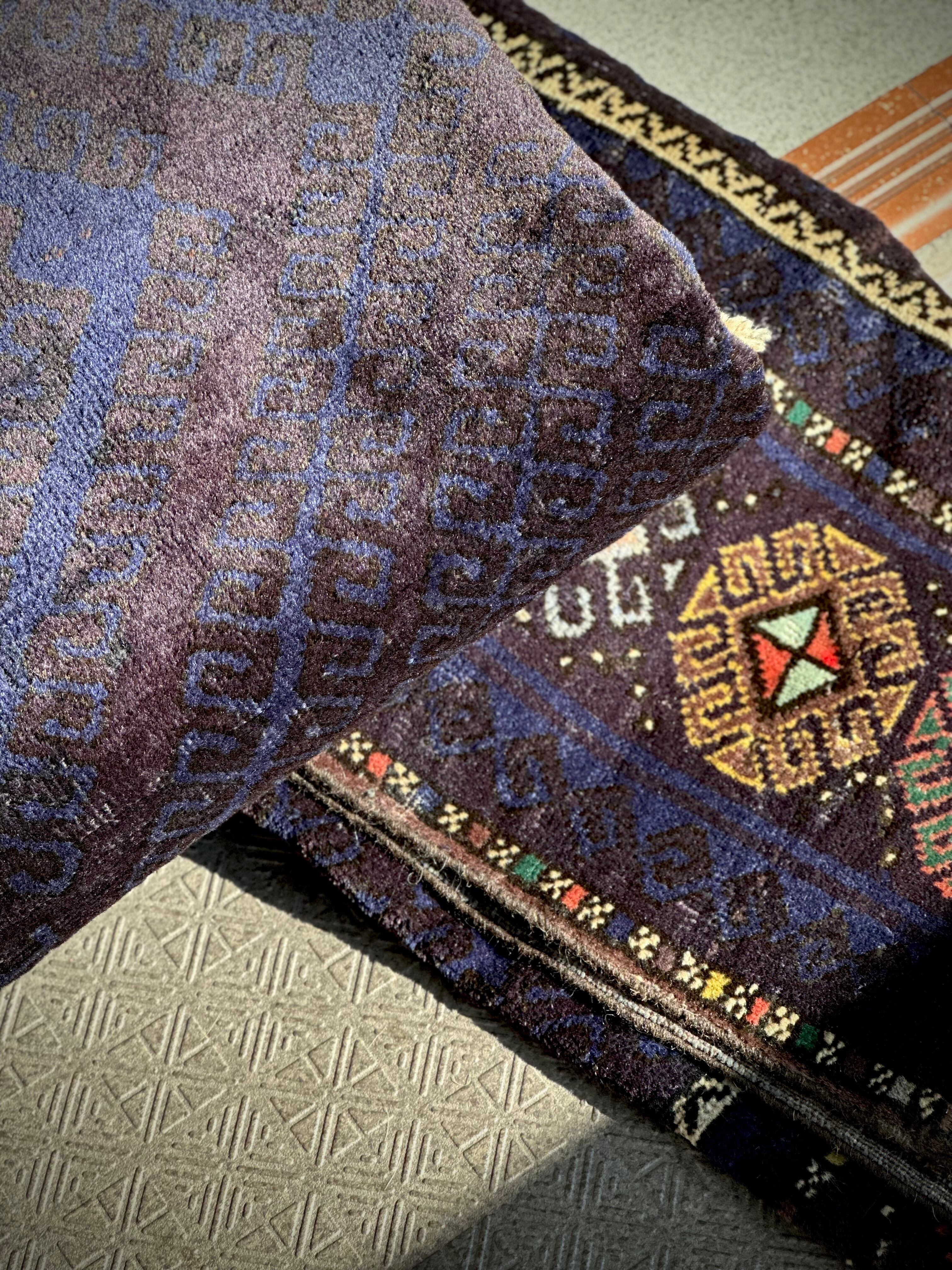 なんとも艶々なネイビーブルーにブラックが織り交わった一見してネイビーにしか見えない様が興味深い、アフガニスタンはヘラート州に居住するバルーチ族のトライバルラグで、直射日光に照らされると浮かび上がるフックの連続紋様の”Zanjir gul “がカッコよくて堪らないメインラグになります。