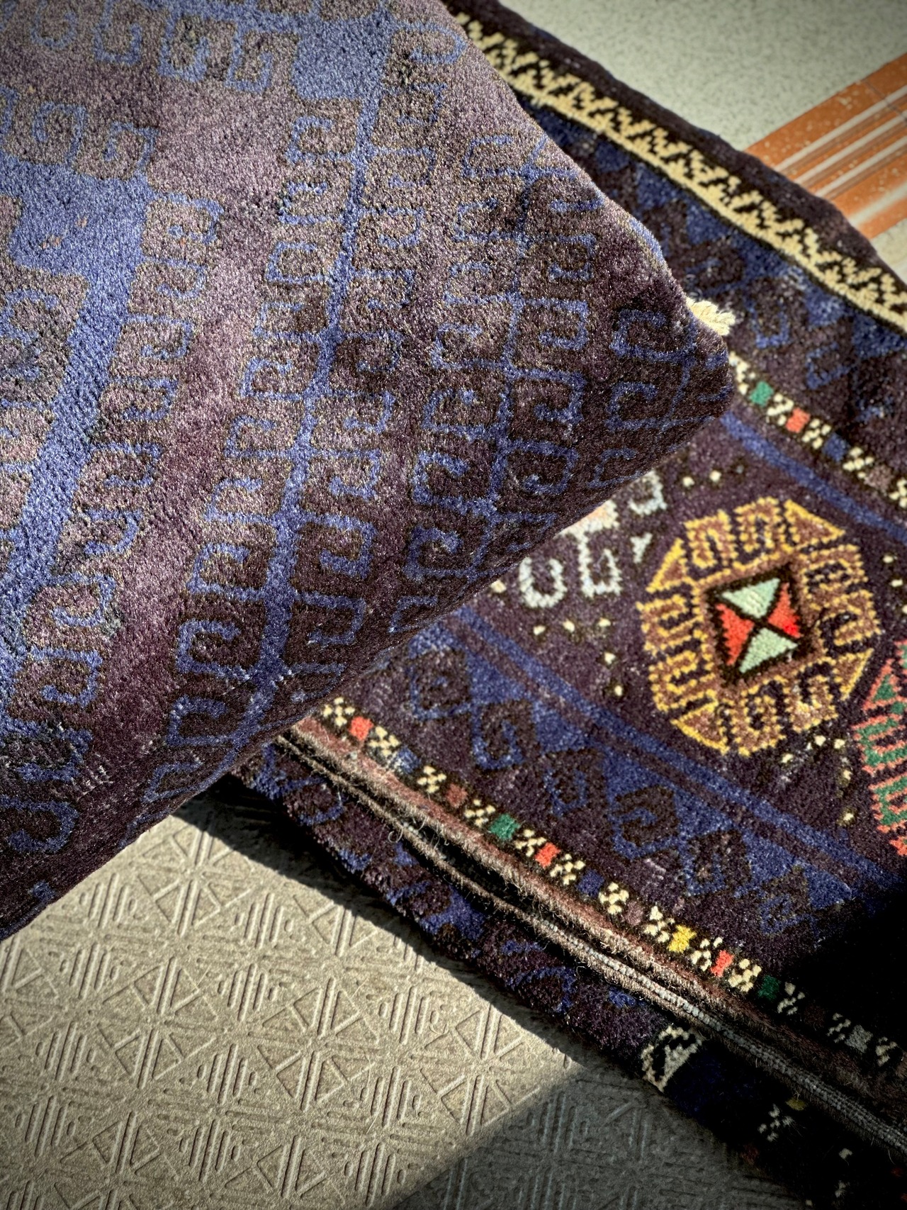 自然光の室内での撮影ではその味わい深さを表現するのが非常に難しく、2枚の写真のみが野外でのベストショットになりますが、ボーダーを取り囲んだカラフルなギュルとは相対的なネイビーに全体的なツヤ感が渋い1枚で、大きさ的には3人掛けソファ前にちょうどいいリビングサイズになります。