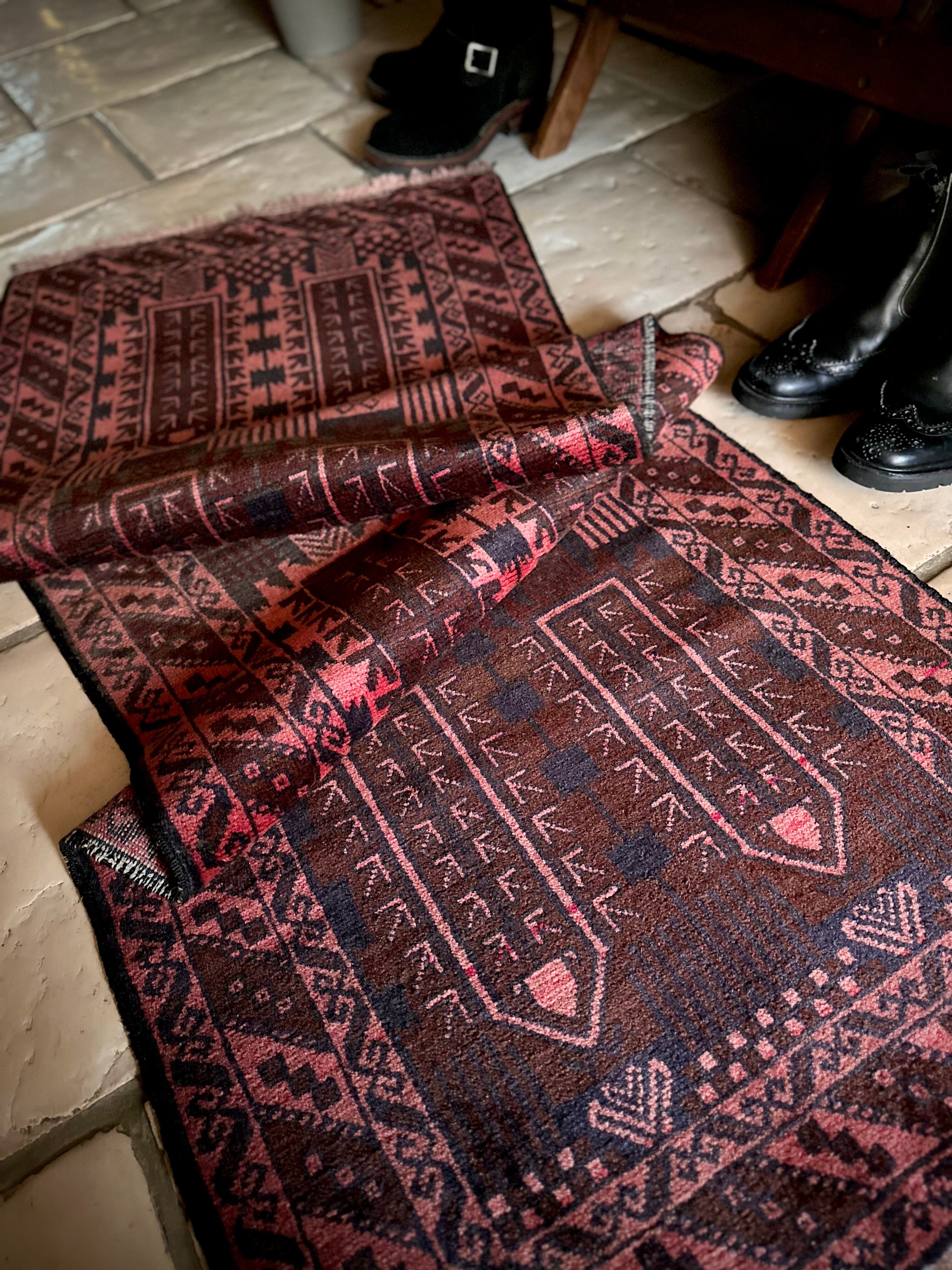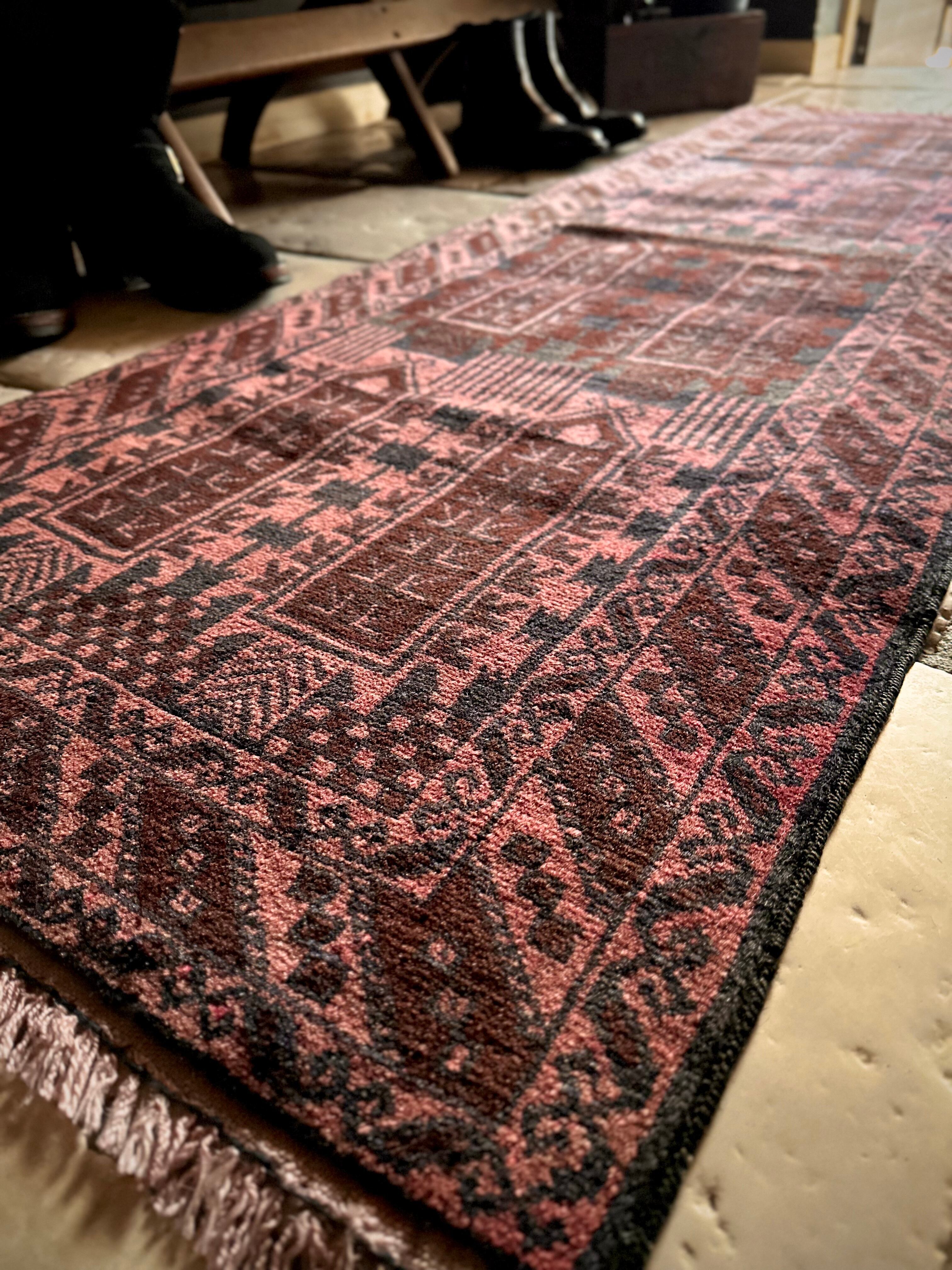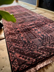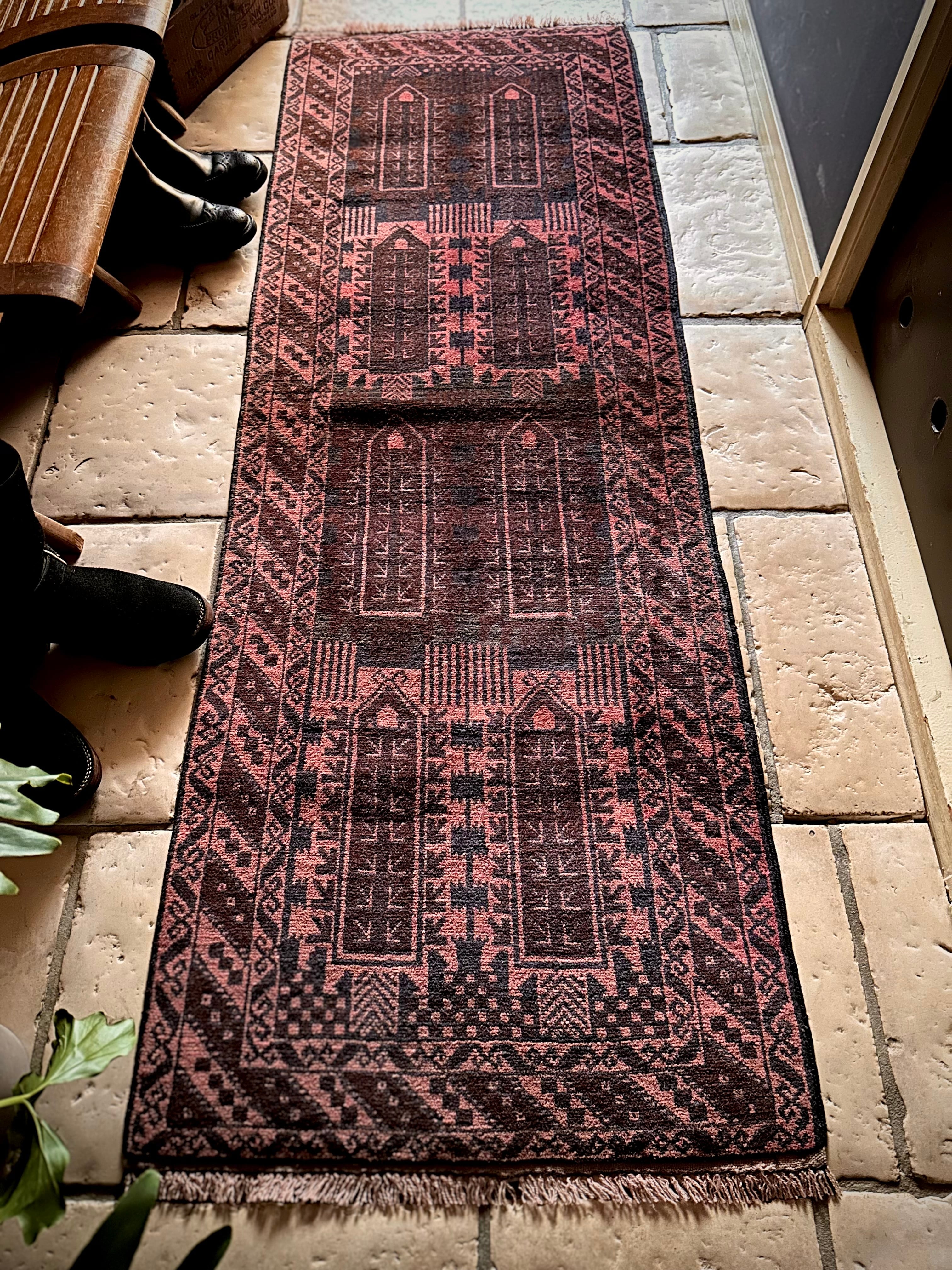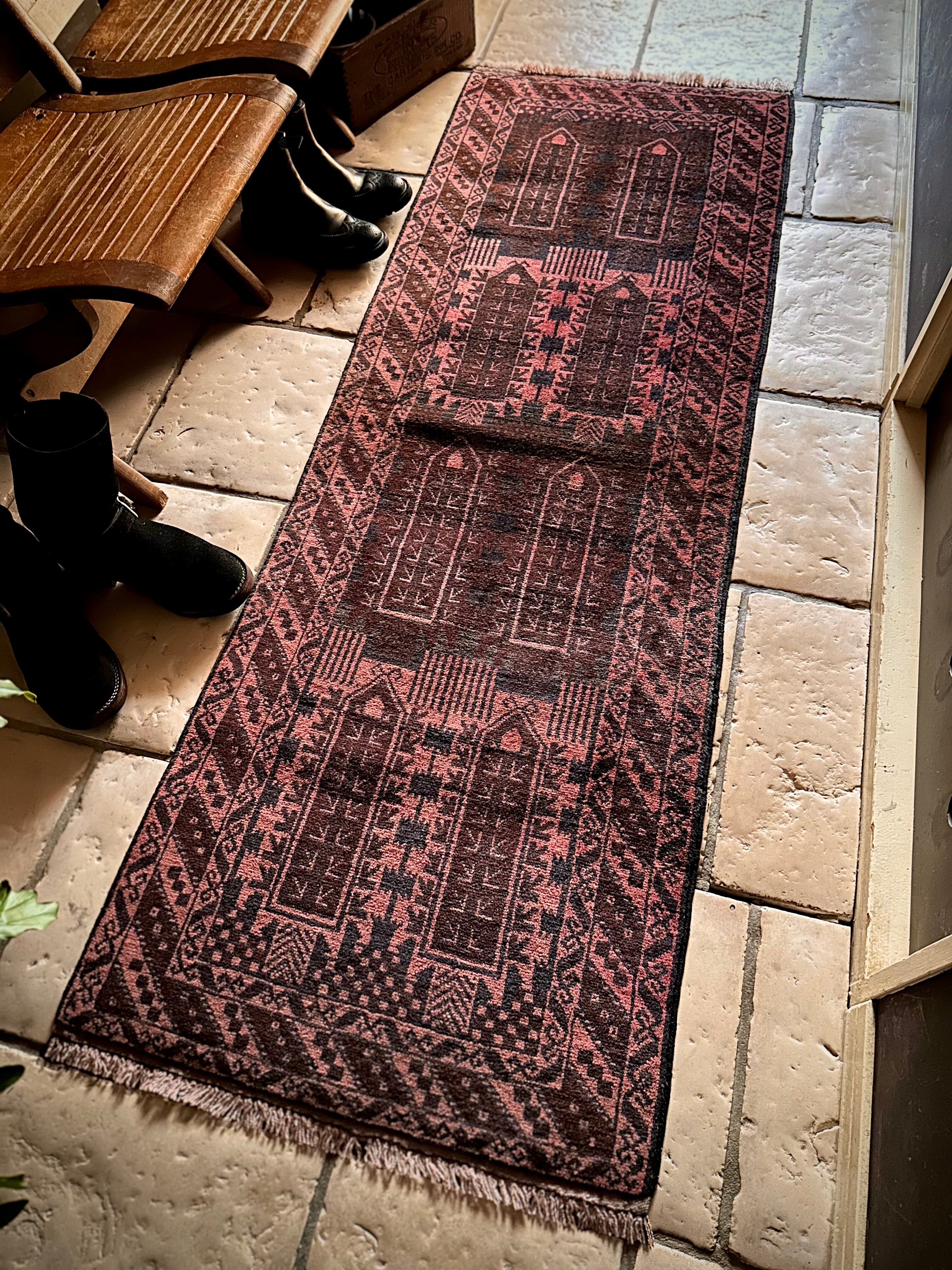 経年劣化と草木染めにる茜色が褪色した風合いがくすみピンクへと変貌した1枚で、個人的にも好きな細長いランナーサイズと呼ばれる、アフガニスタンはヘラート州に居住するバルーチ族のトライバルラグになります。