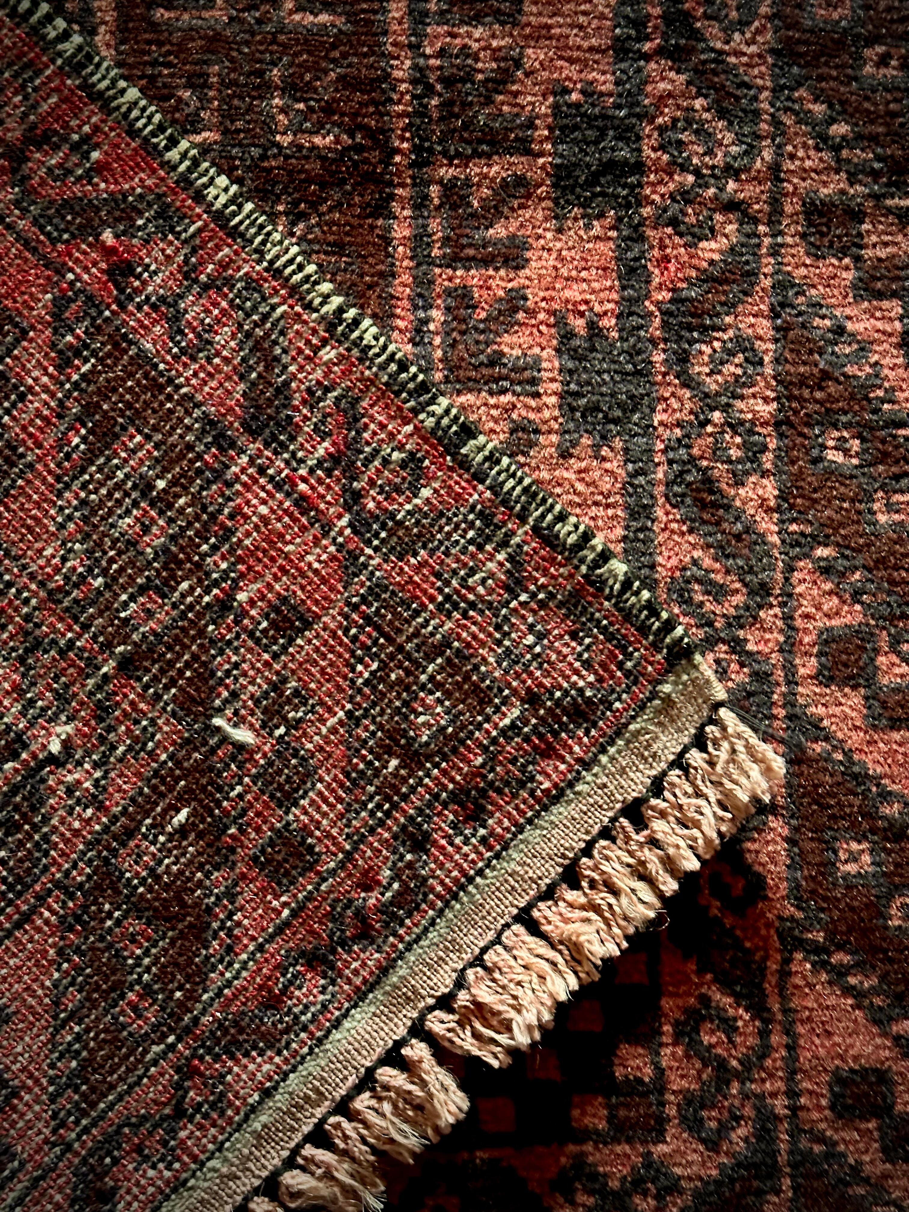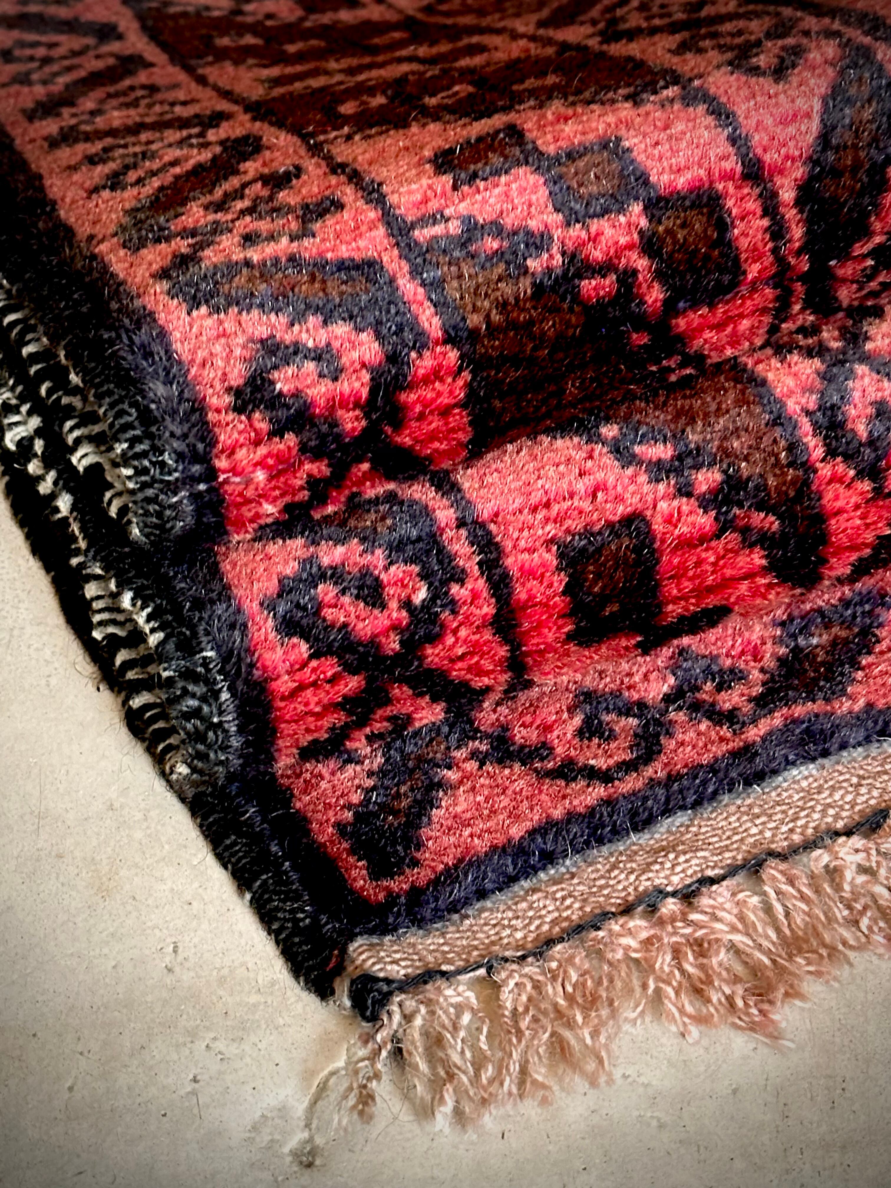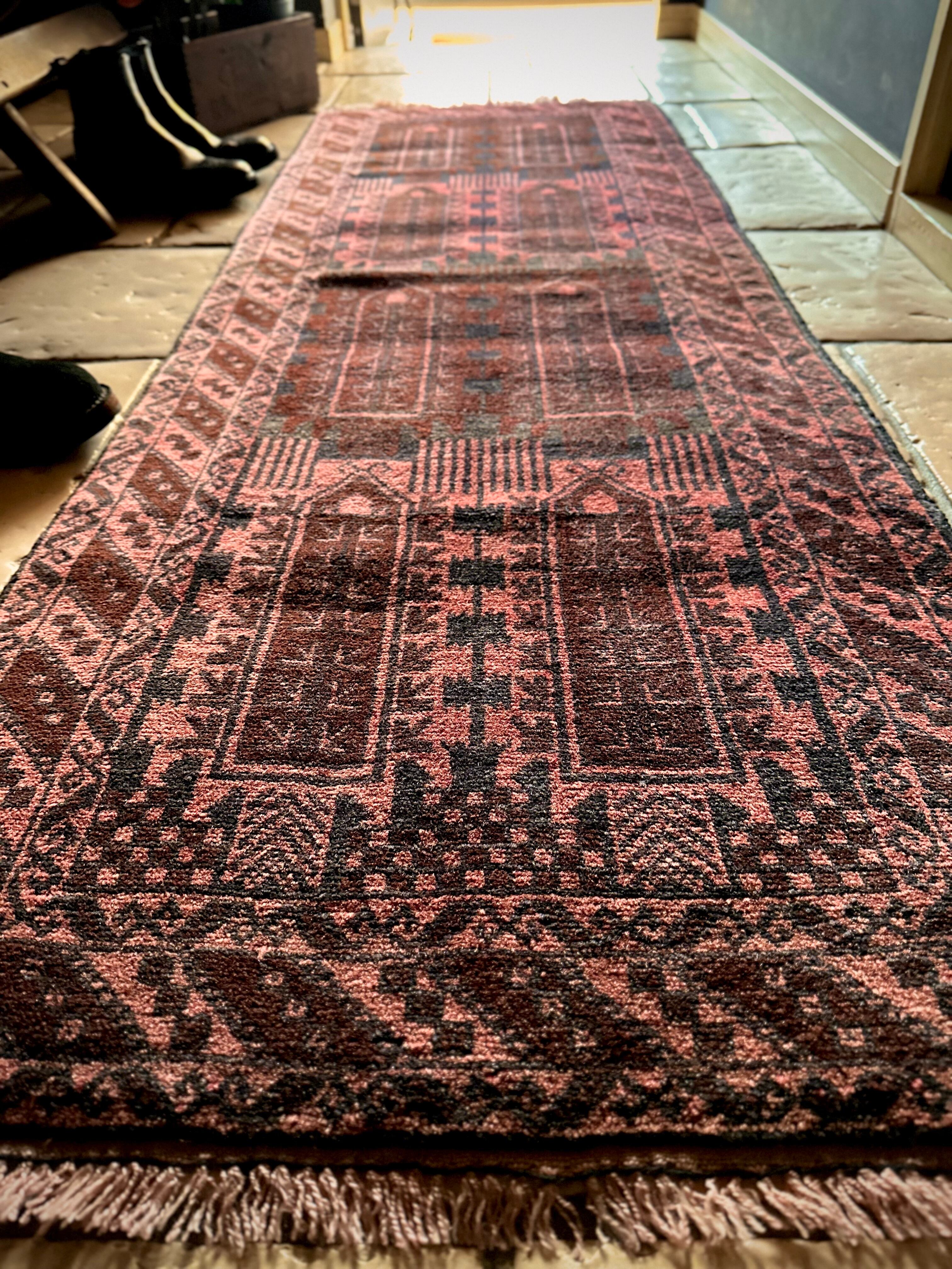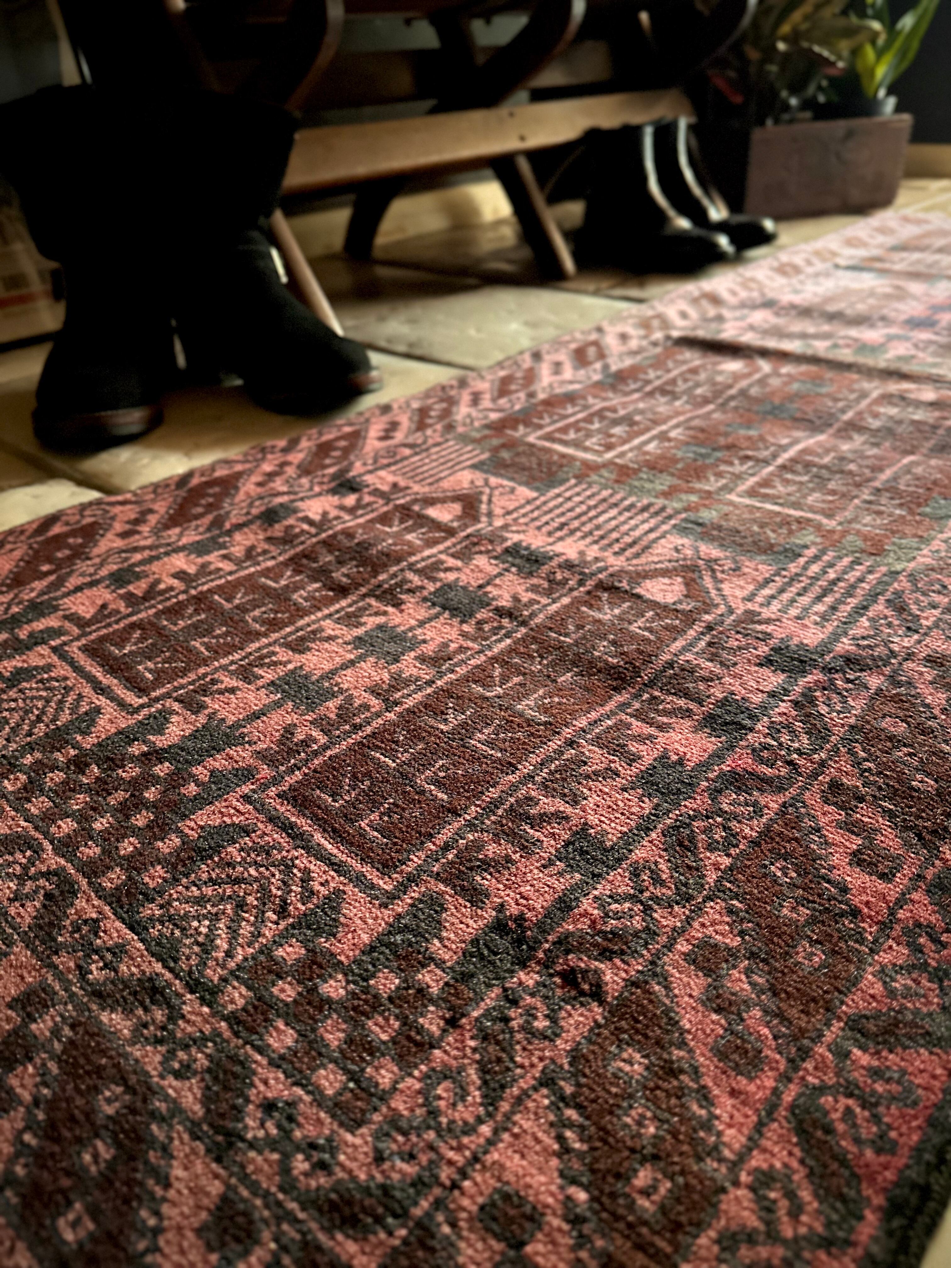 経年劣化と草木染めにる茜色が褪色した風合いがくすみピンクへと変貌した1枚で、個人的にも好きな細長いランナーサイズと呼ばれる、アフガニスタンはヘラート州に居住するバルーチ族のトライバルラグになります。