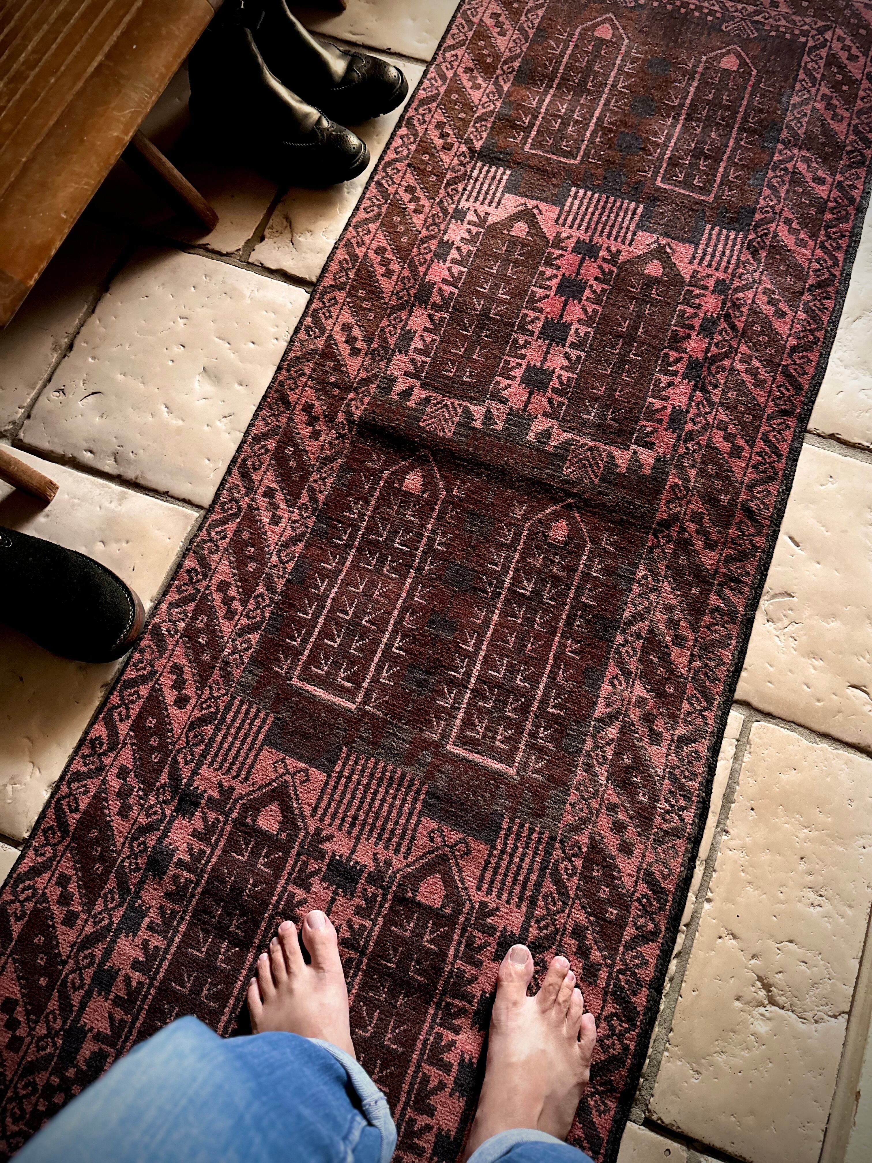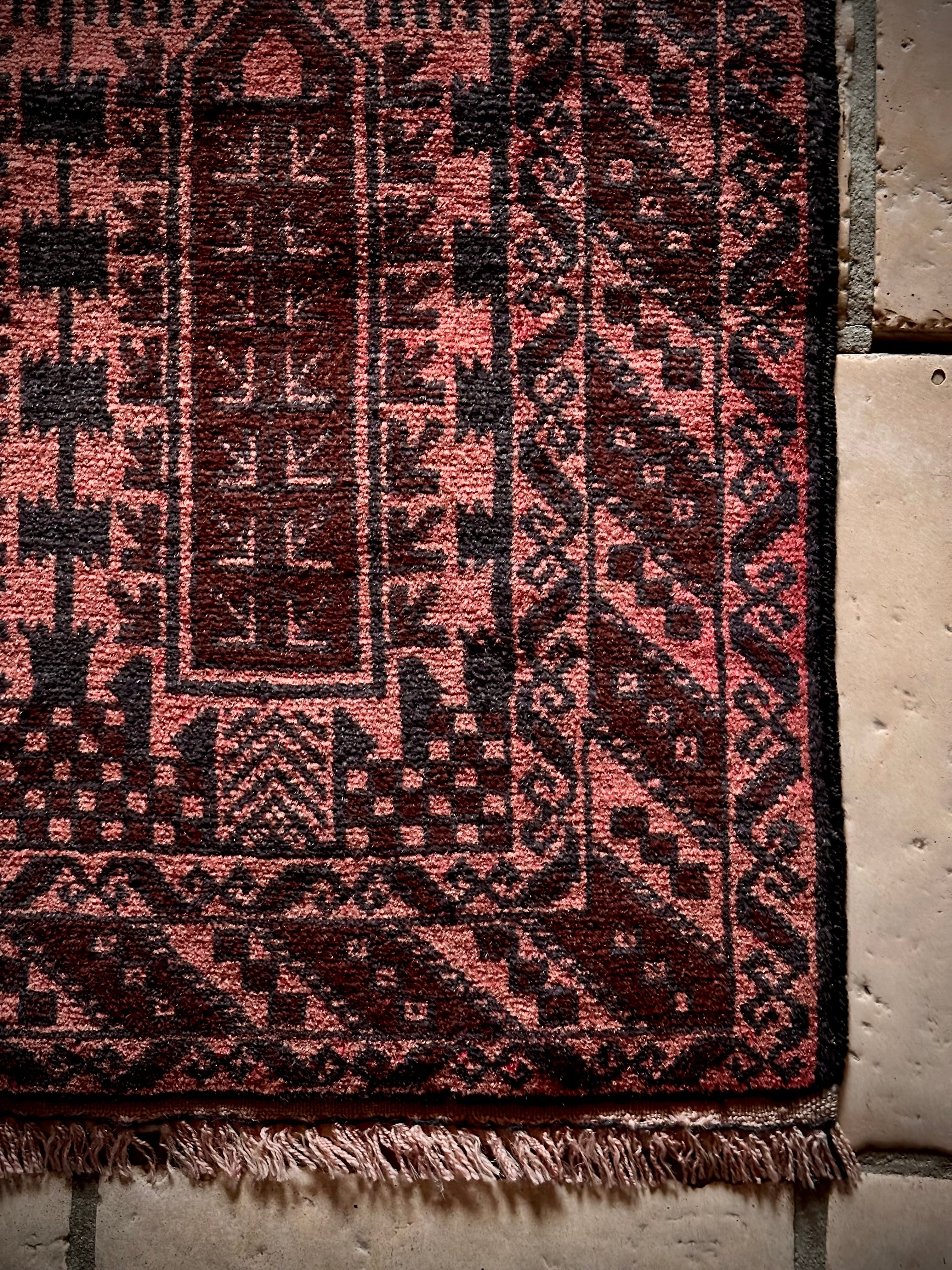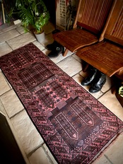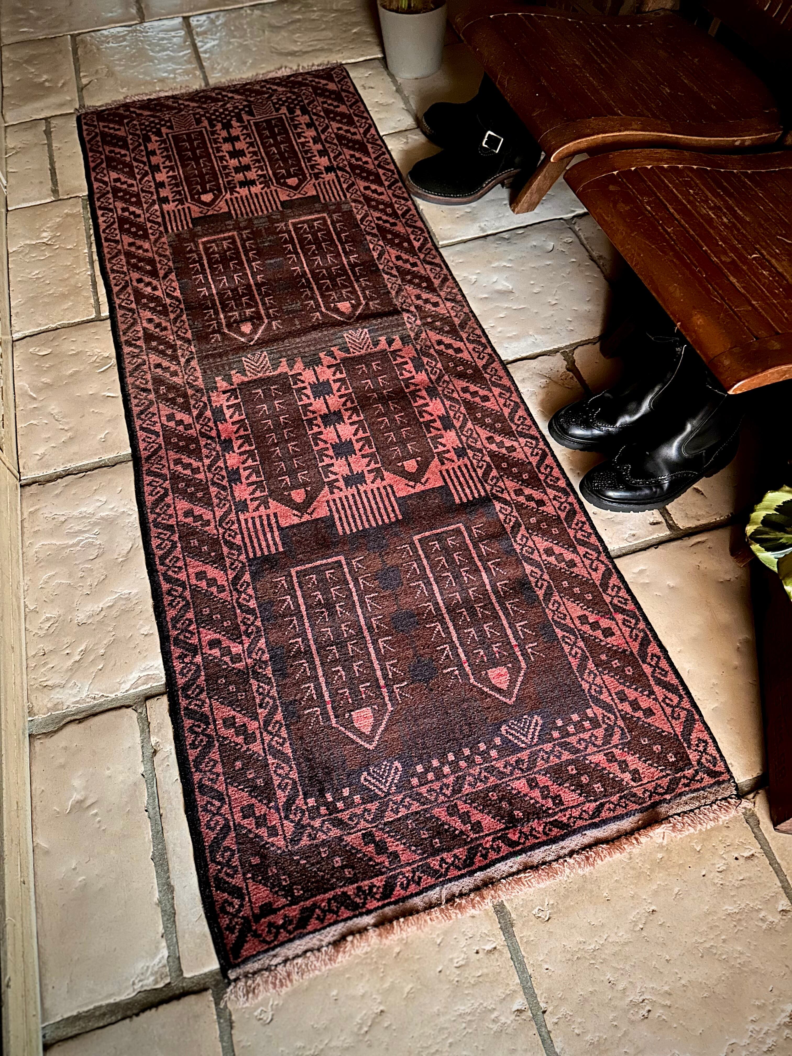 なかでもこちらはバルーチの伝統的な柄として用いられるカラムドネと呼ばれるペン立てをモチーフにした柄で、バーガンディの色合いとも相まってシンプルな構図がランナータイプにお似合いでしょうか。写真のように廊下や台所に敷いていただくと様になります。