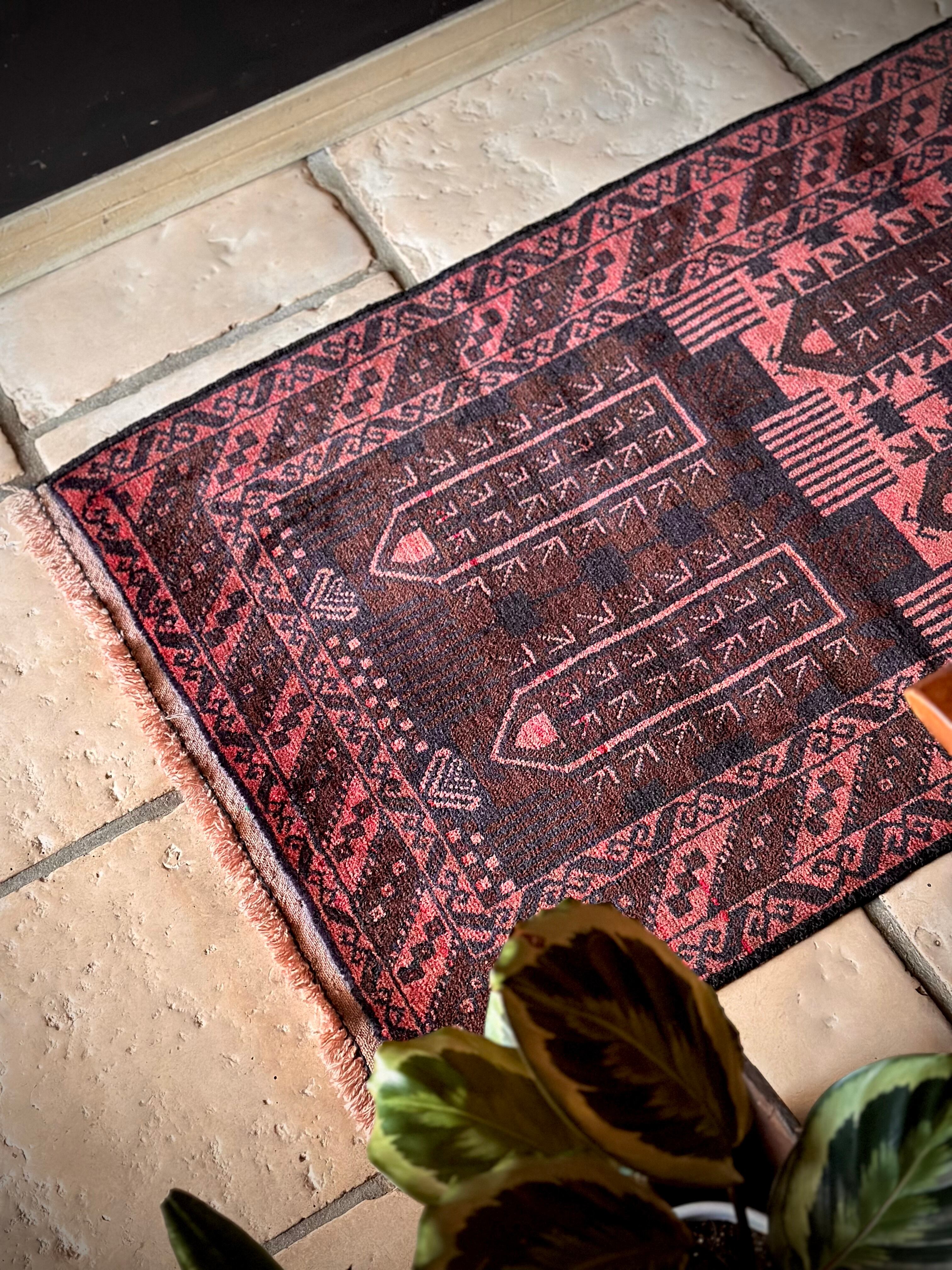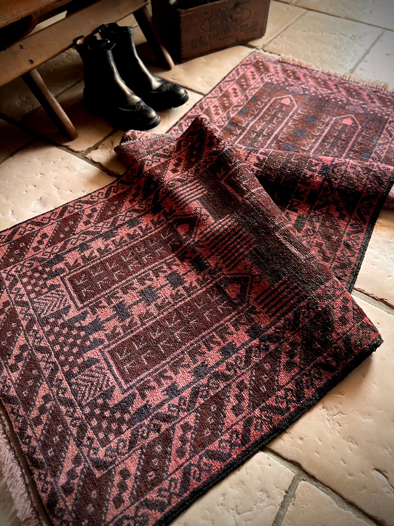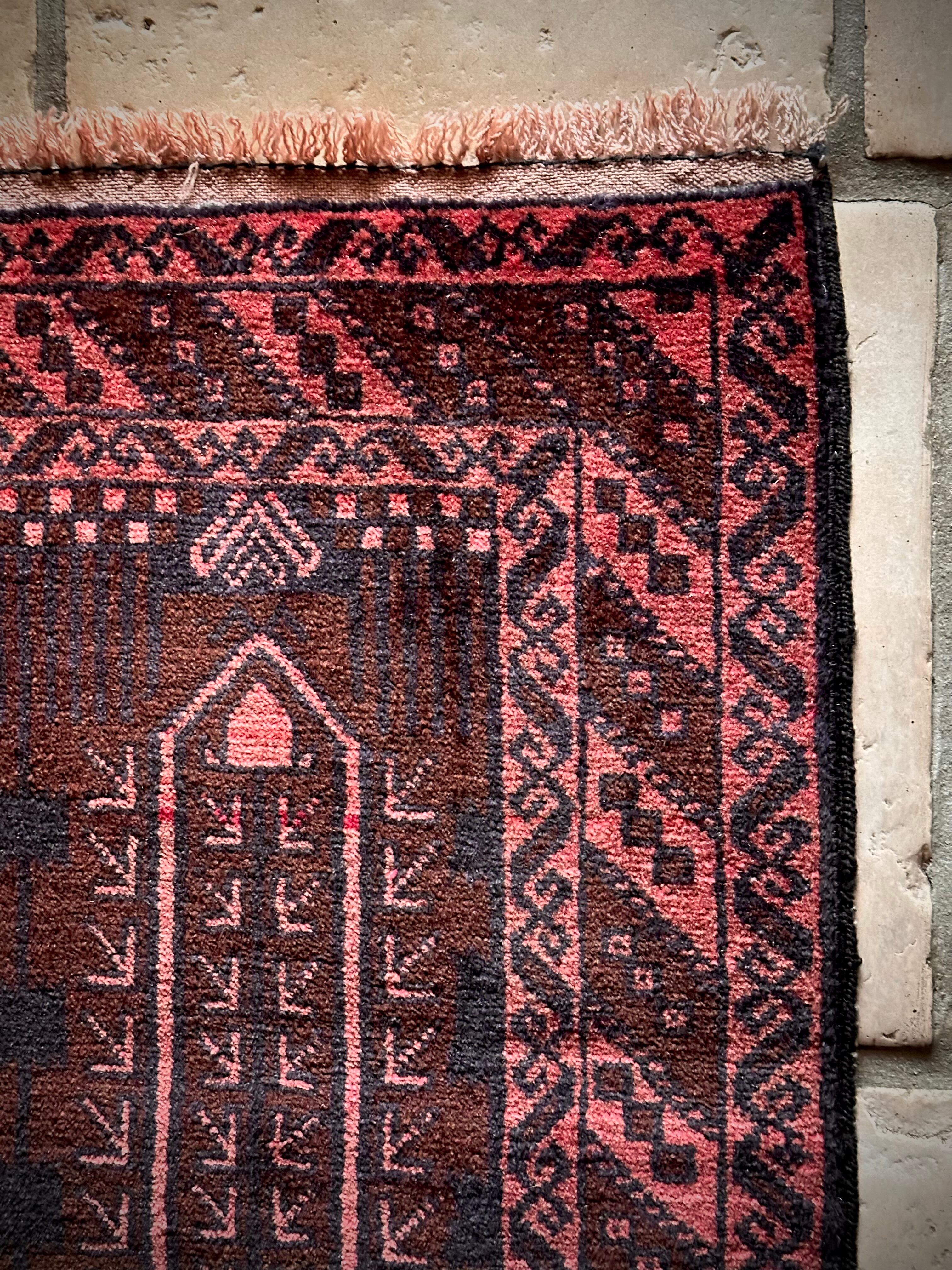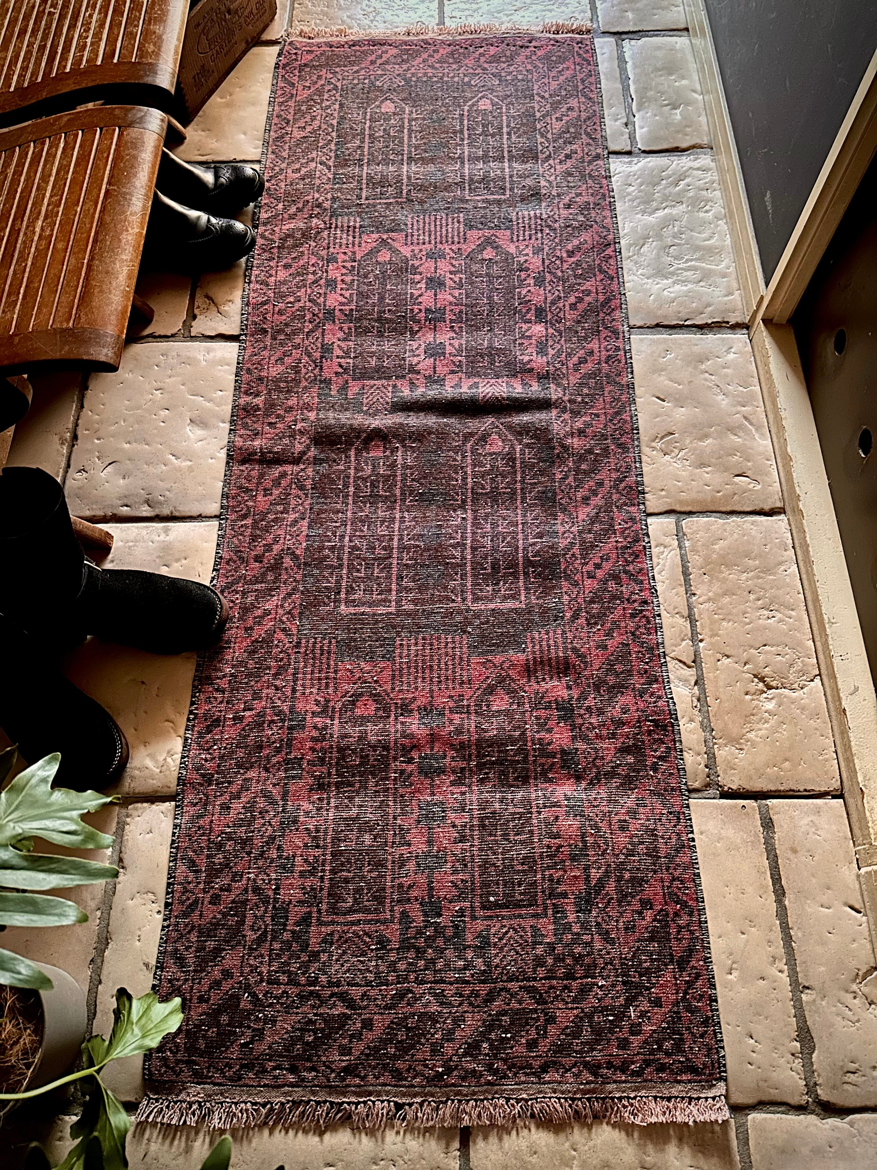 なかでもこちらはバルーチの伝統的な柄として用いられるカラムドネと呼ばれるペン立てをモチーフにした柄で、バーガンディの色合いとも相まってシンプルな構図がランナータイプにお似合いでしょうか。写真のように廊下や台所に敷いていただくと様になります。