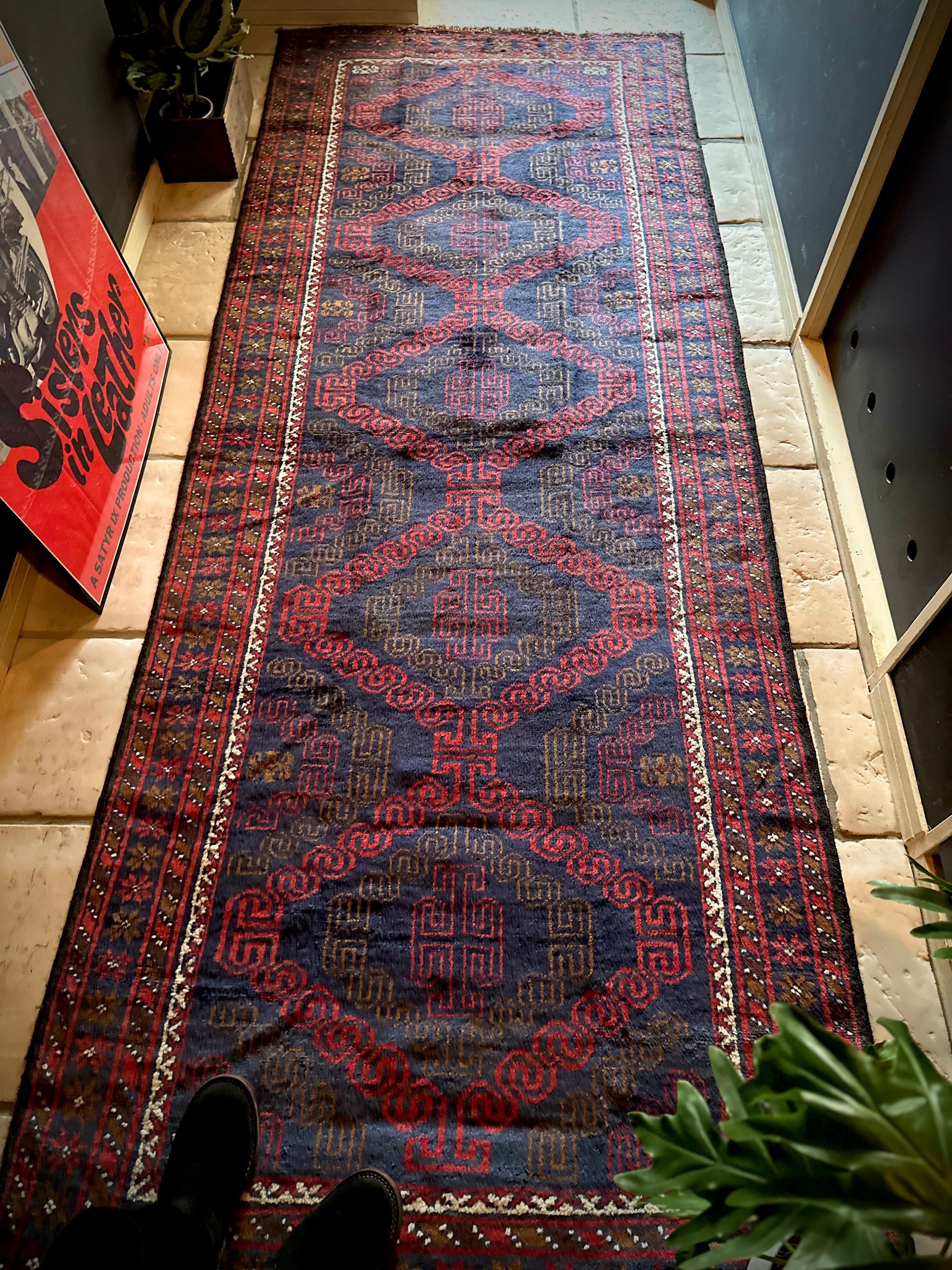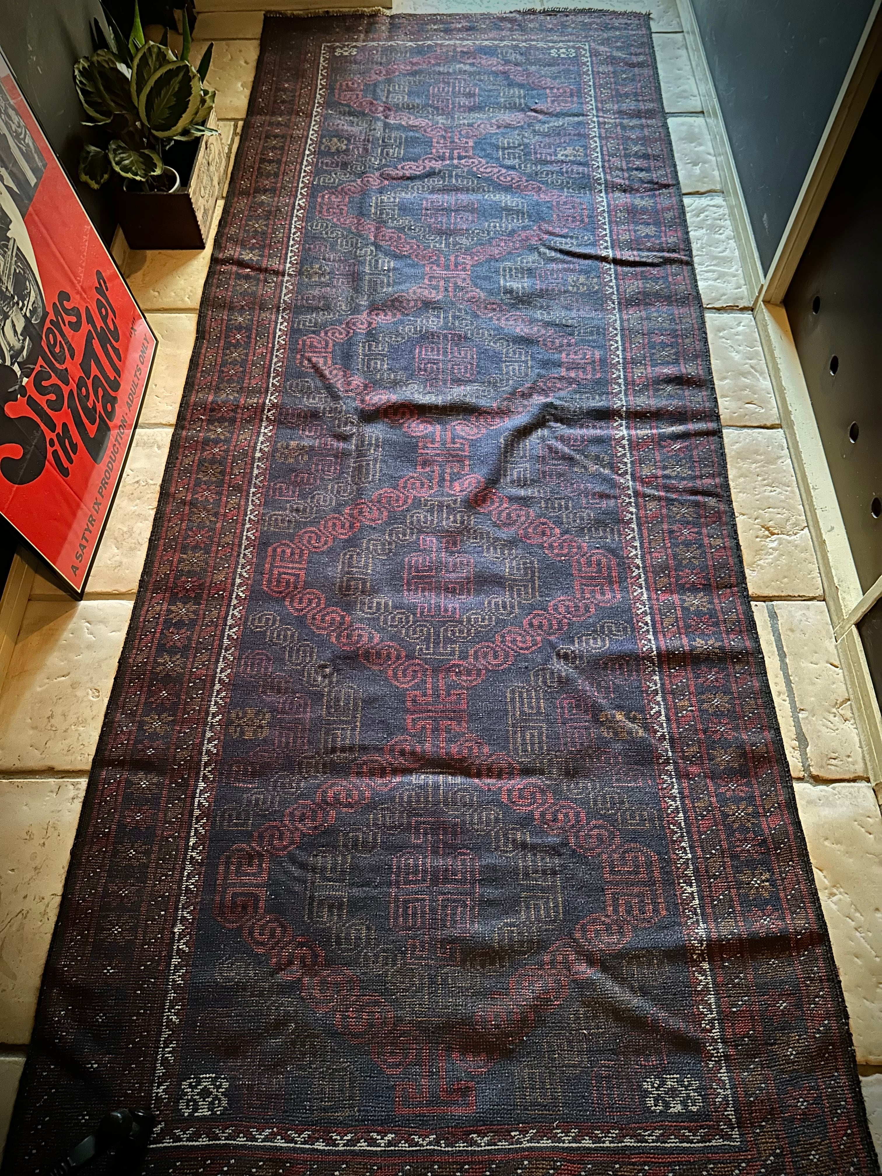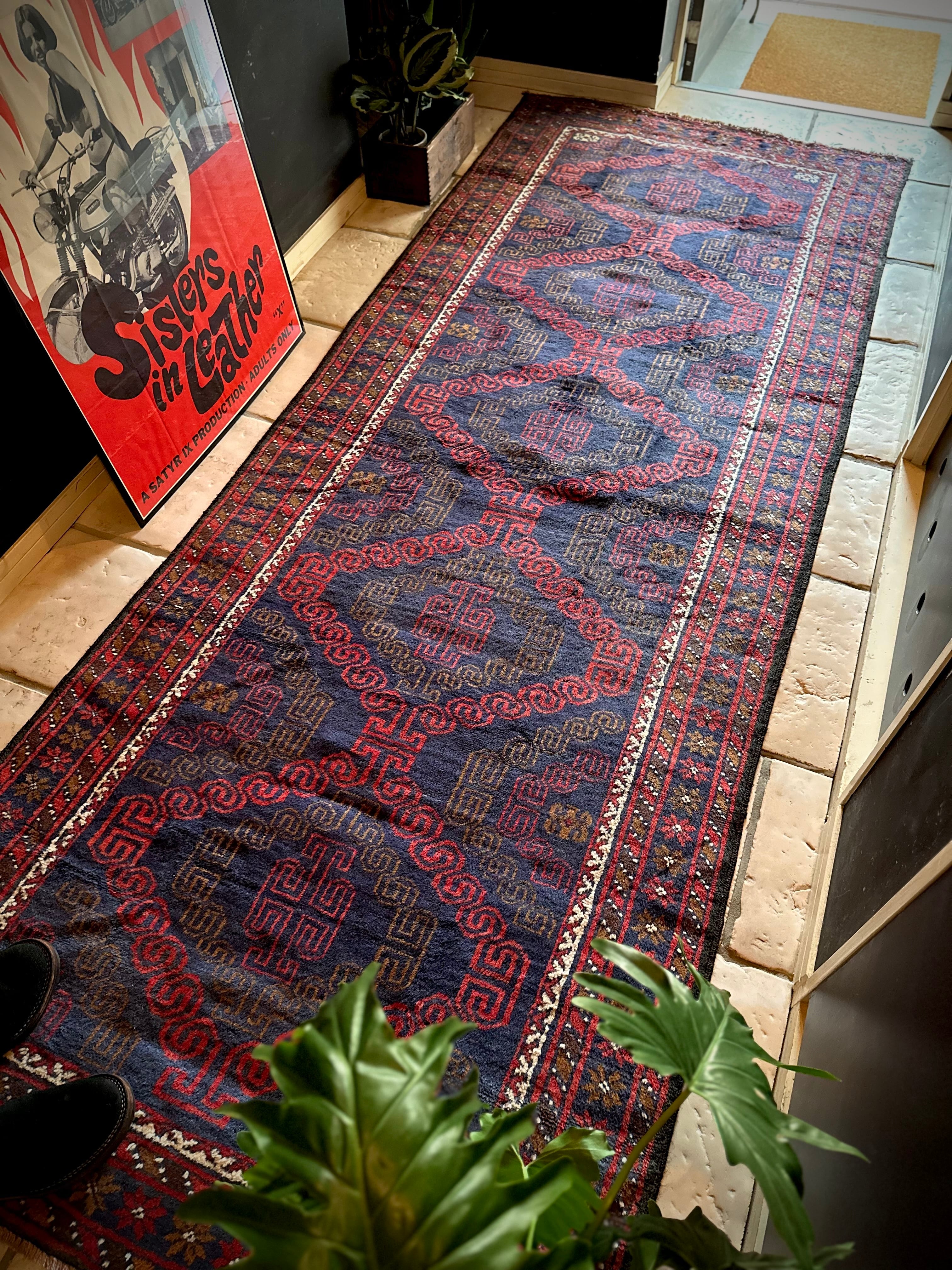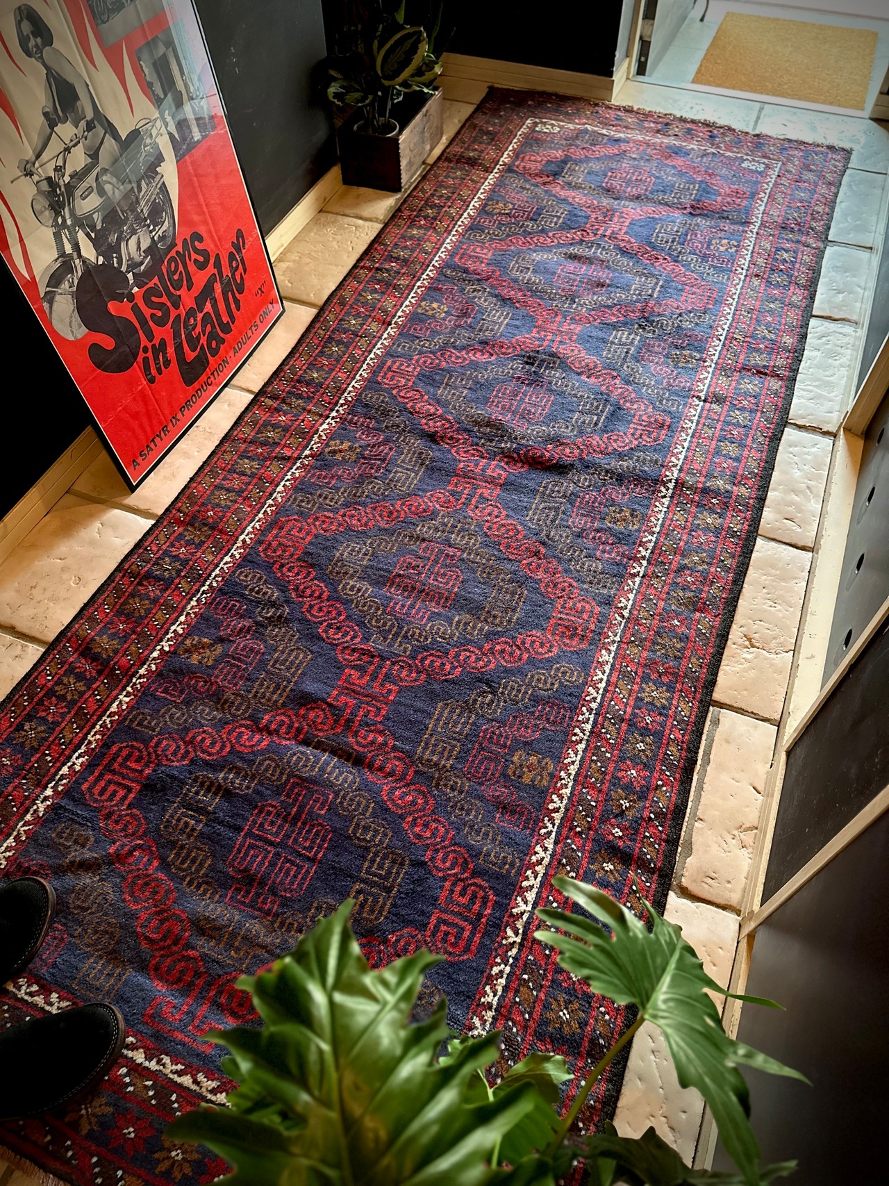 室内の廊下を覆う3メートルを超える圧巻なサイズのこちらは、アフガニスタンはヘラート州に居住するバルーチ族のトライバルラグで、あまり見かける事がないですが水の流れを表したバルーチの伝統的な紋様になります。