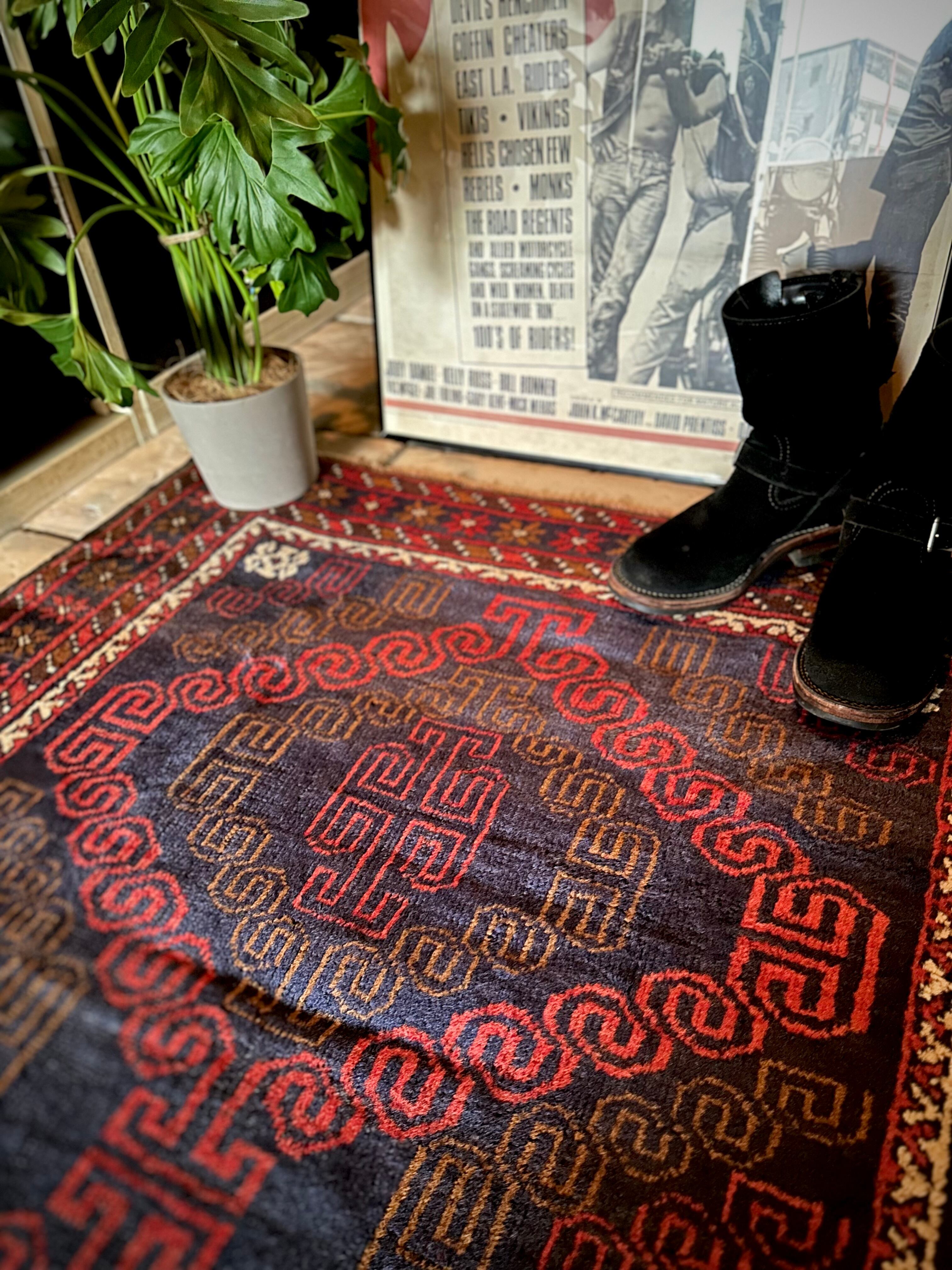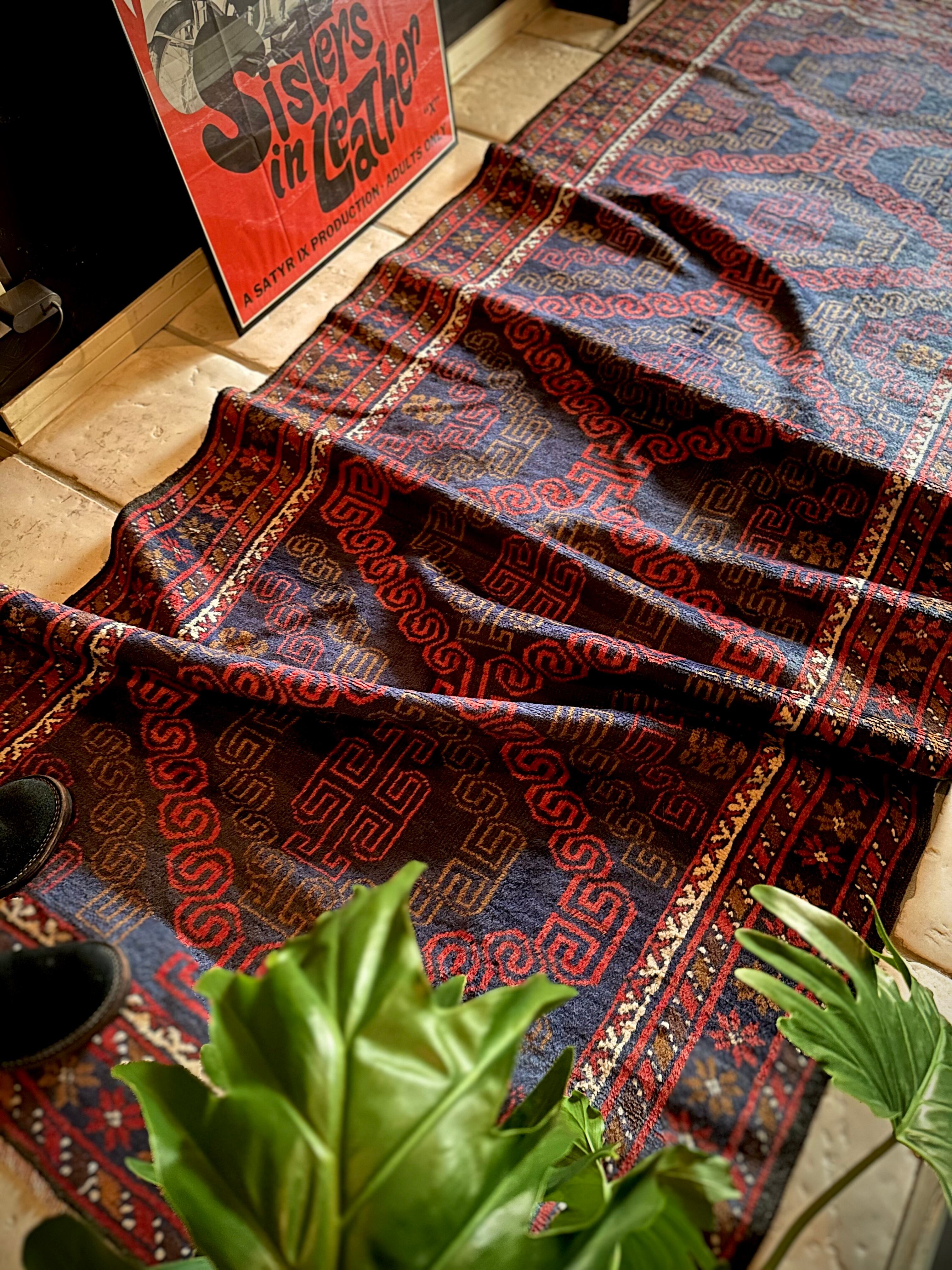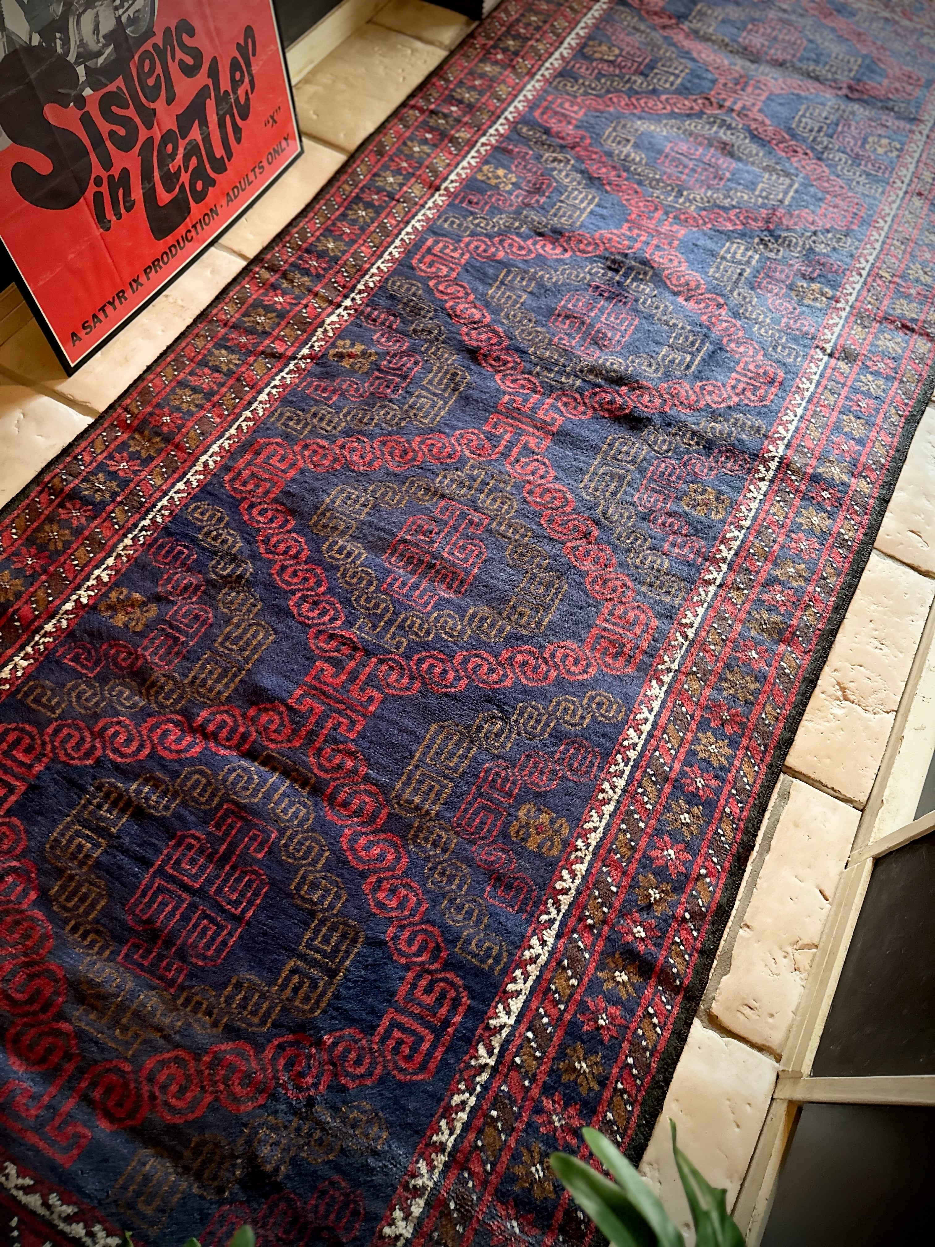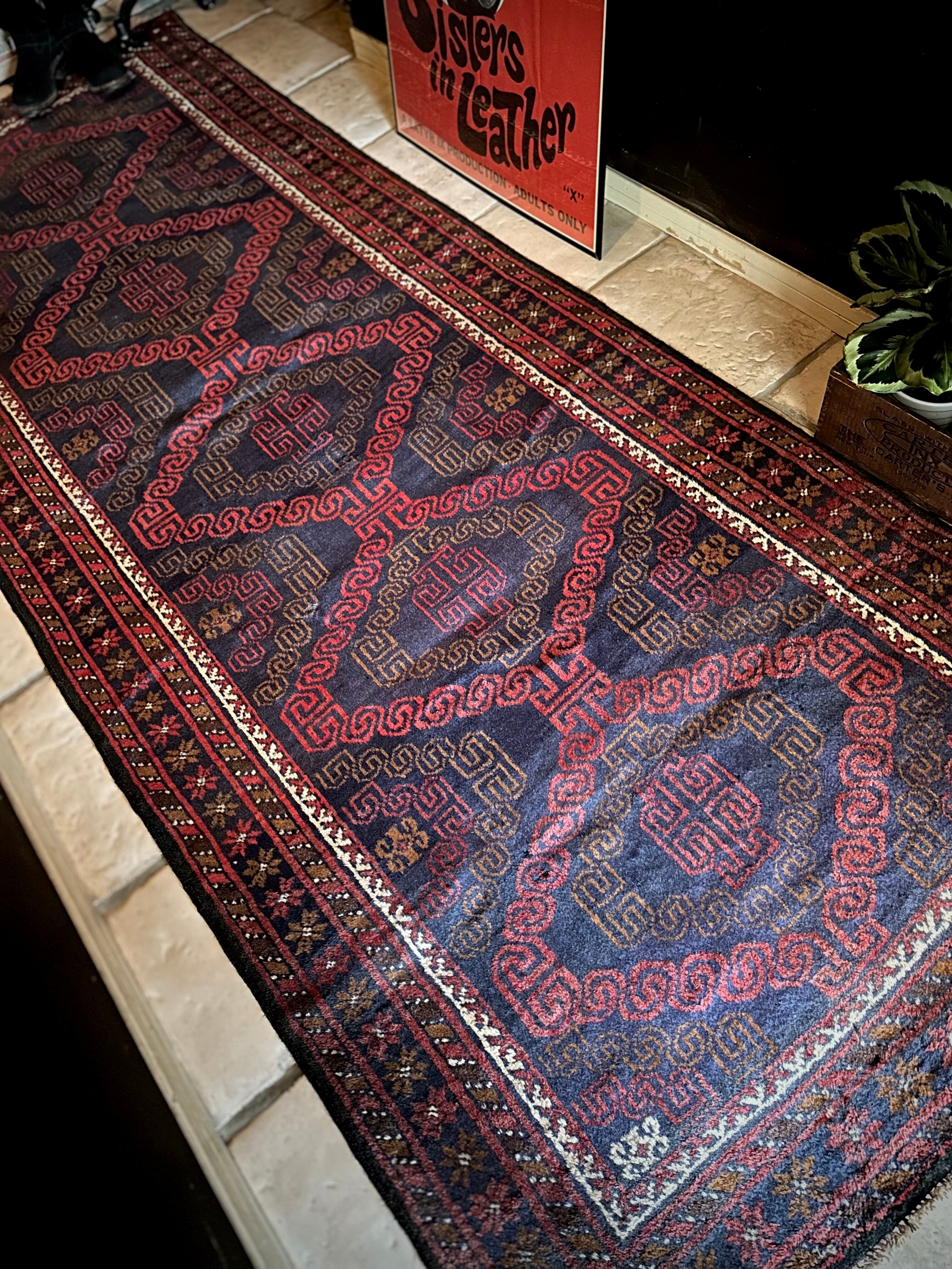 室内の廊下を覆う3メートルを超える圧巻なサイズのこちらは、アフガニスタンはヘラート州に居住するバルーチ族のトライバルラグで、あまり見かける事がないですが水の流れを表したバルーチの伝統的な紋様になります。