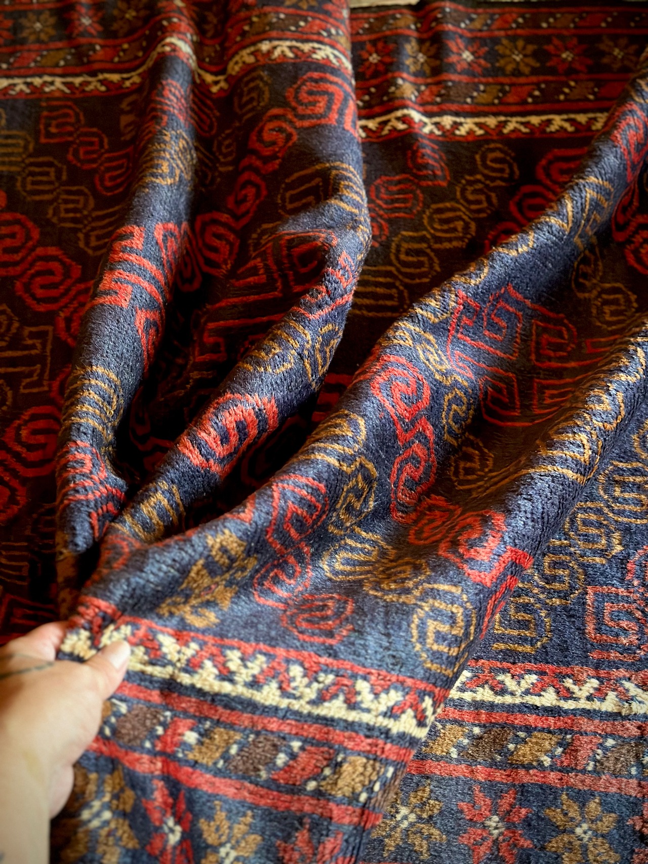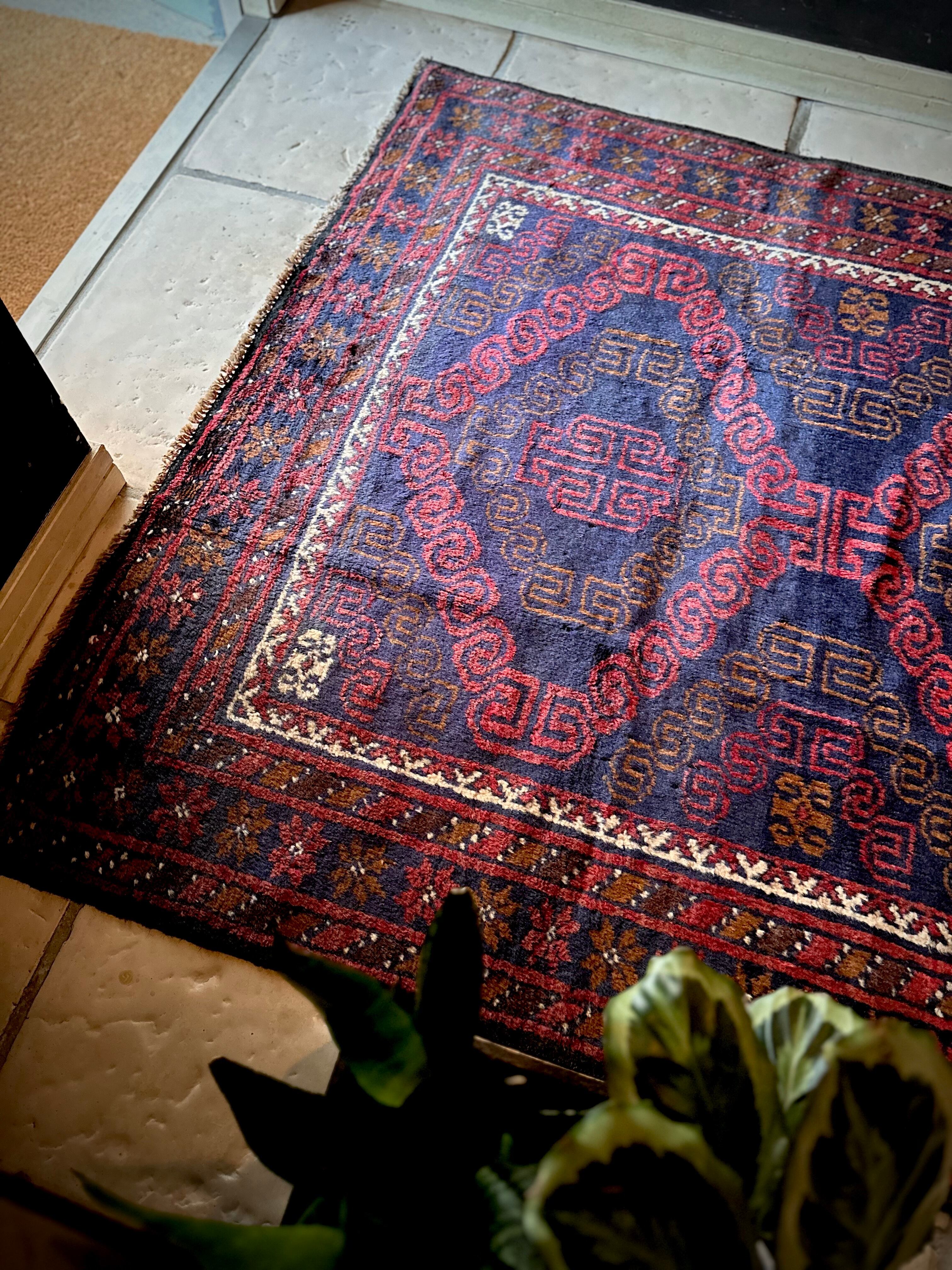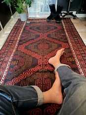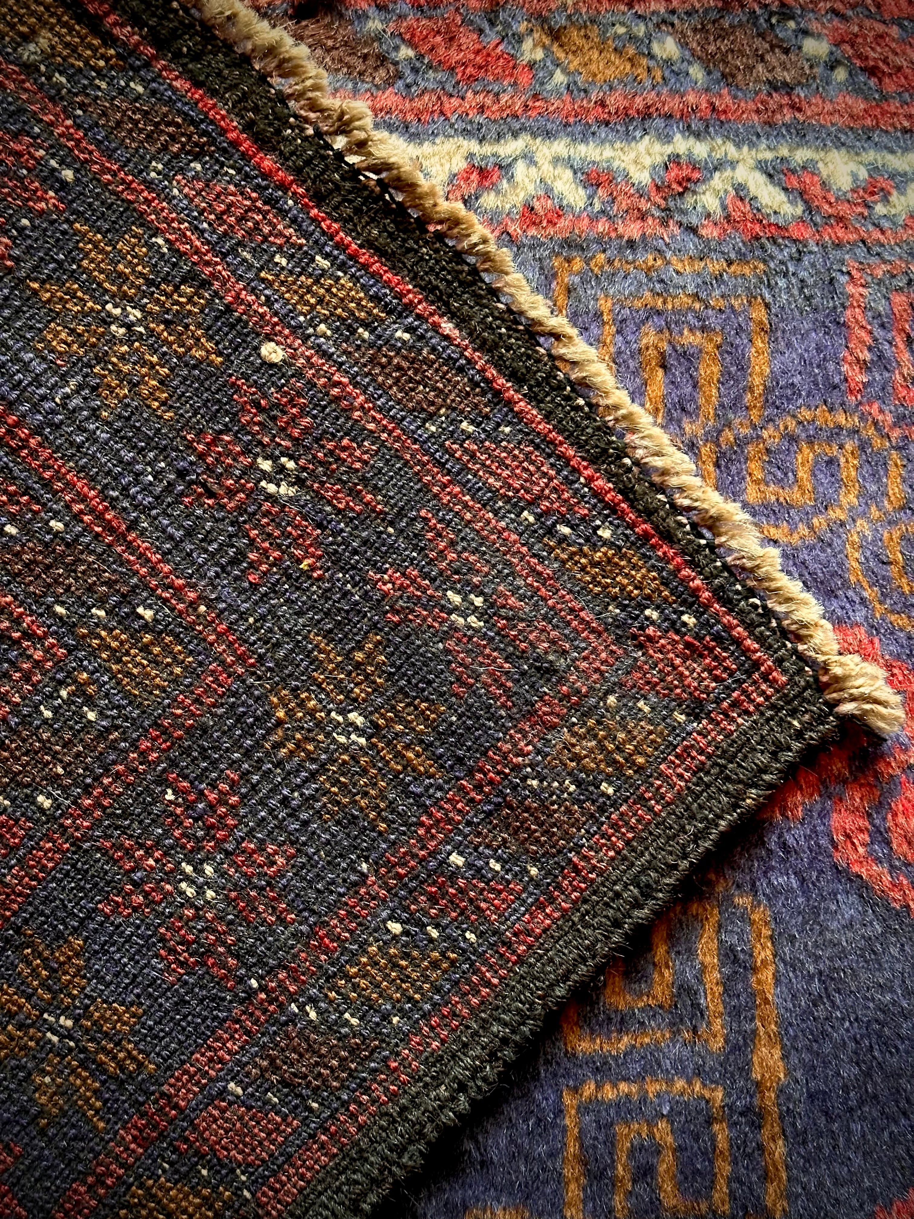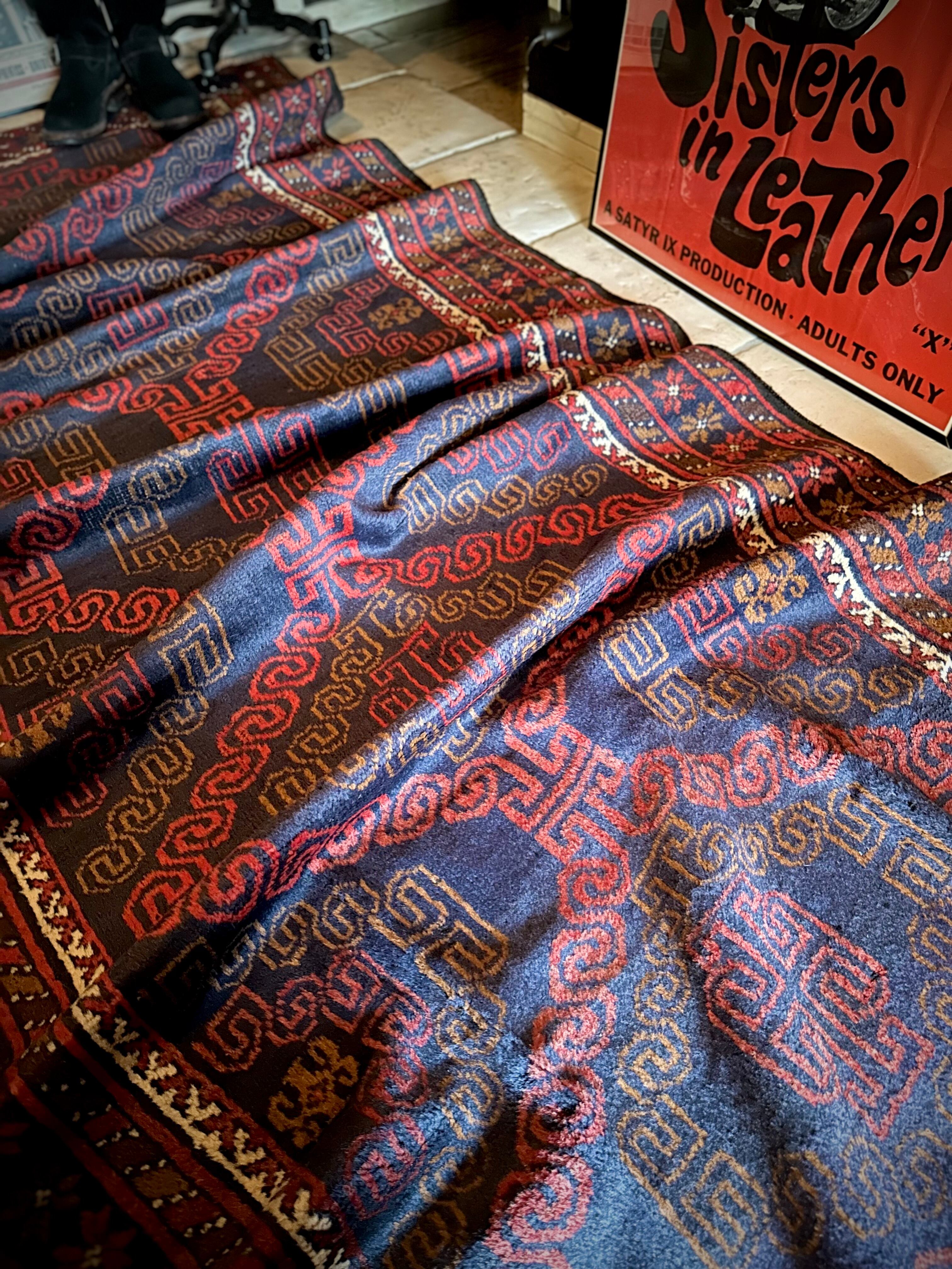 室内の廊下を覆う3メートルを超える圧巻なサイズのこちらは、アフガニスタンはヘラート州に居住するバルーチ族のトライバルラグで、あまり見かける事がないですが水の流れを表したバルーチの伝統的な紋様になります。