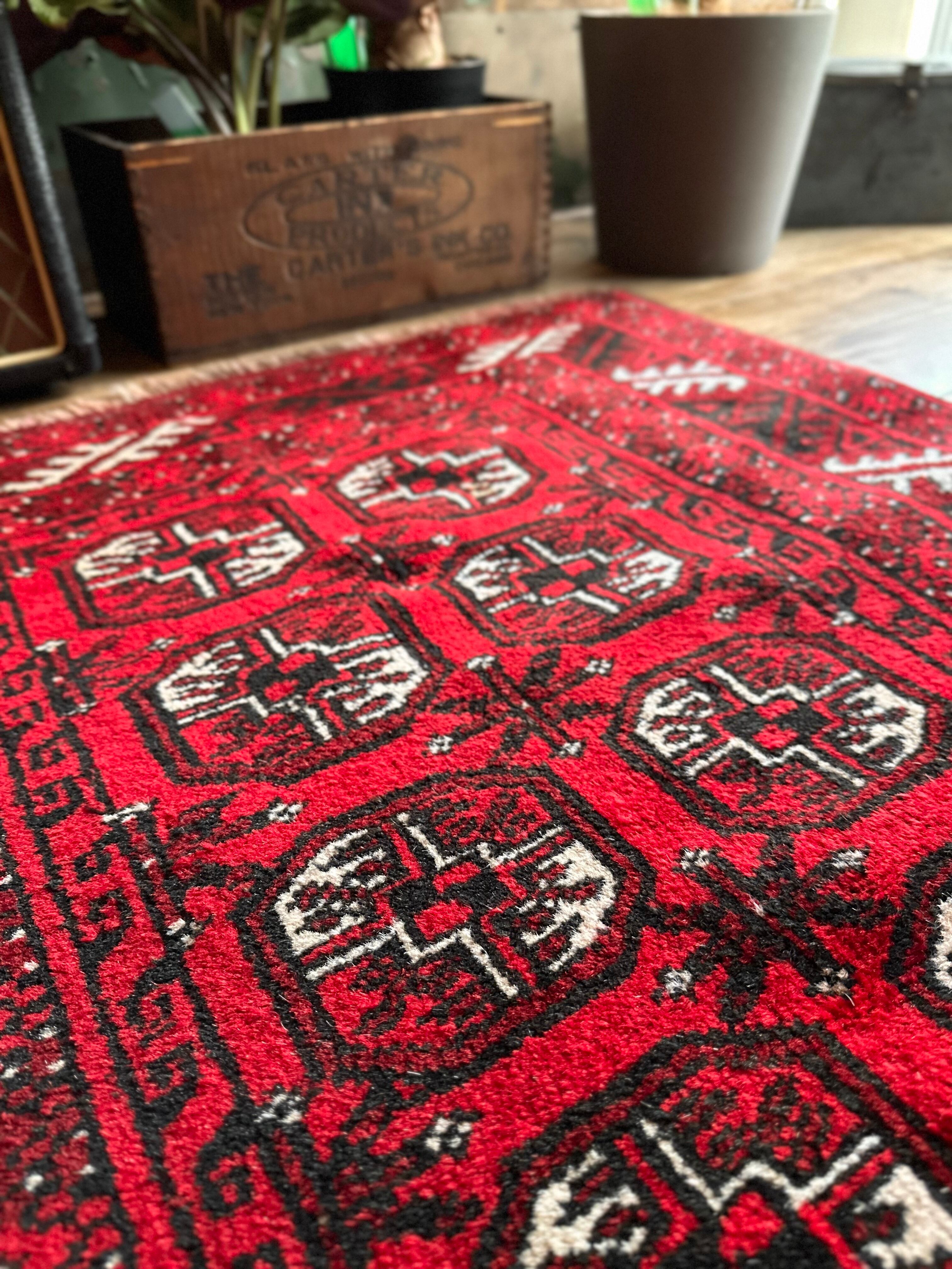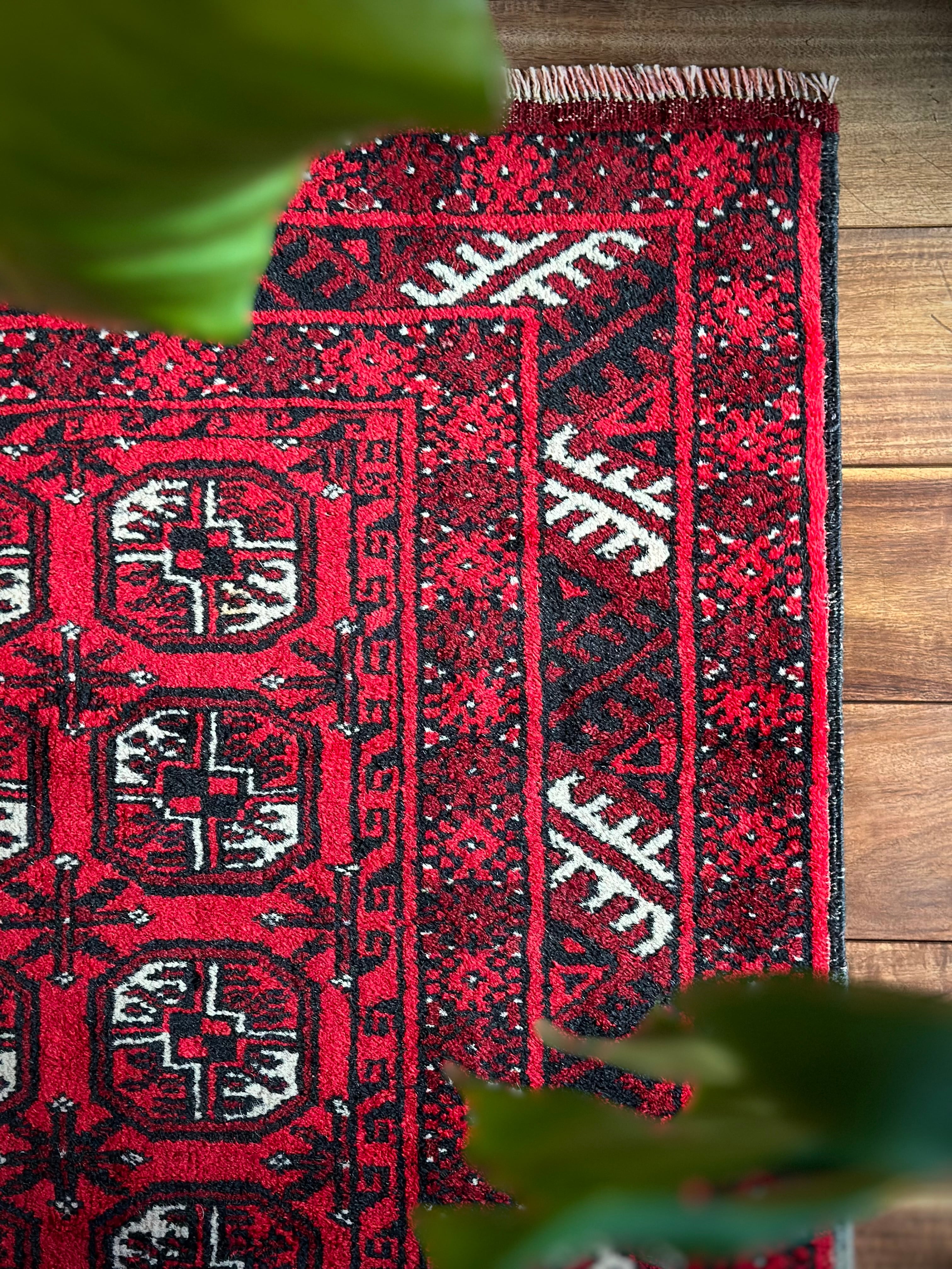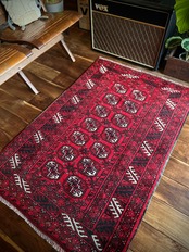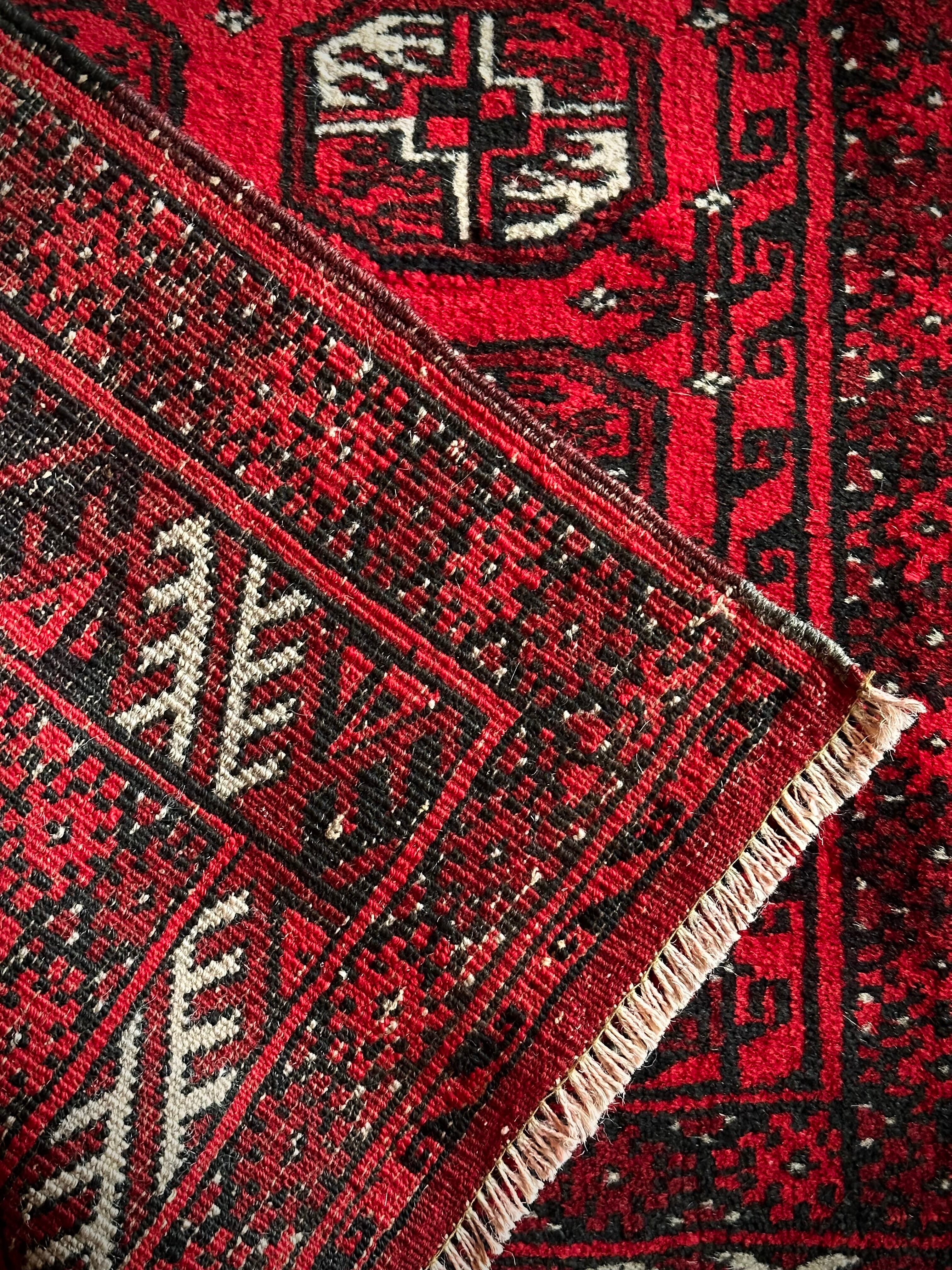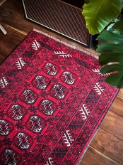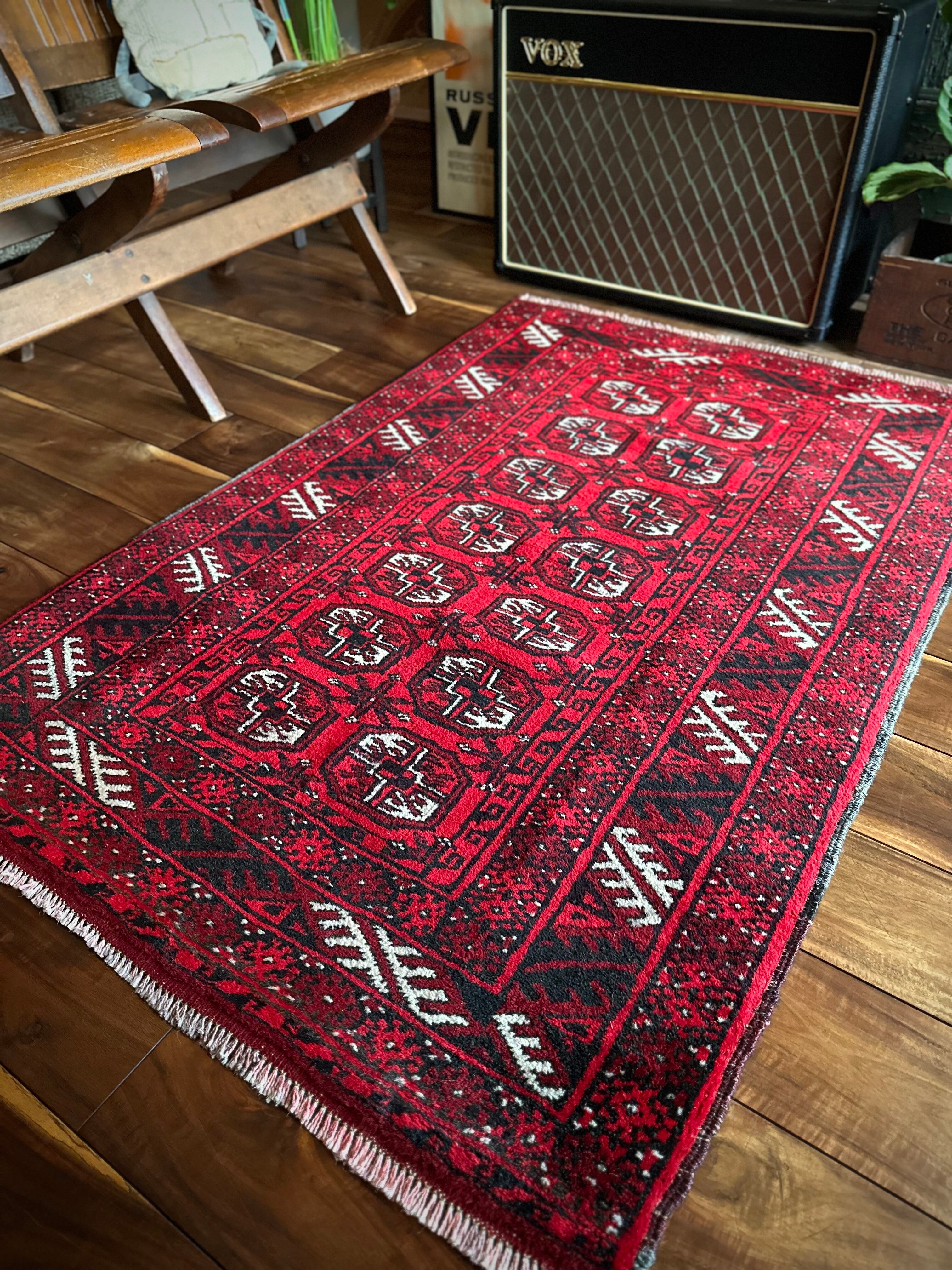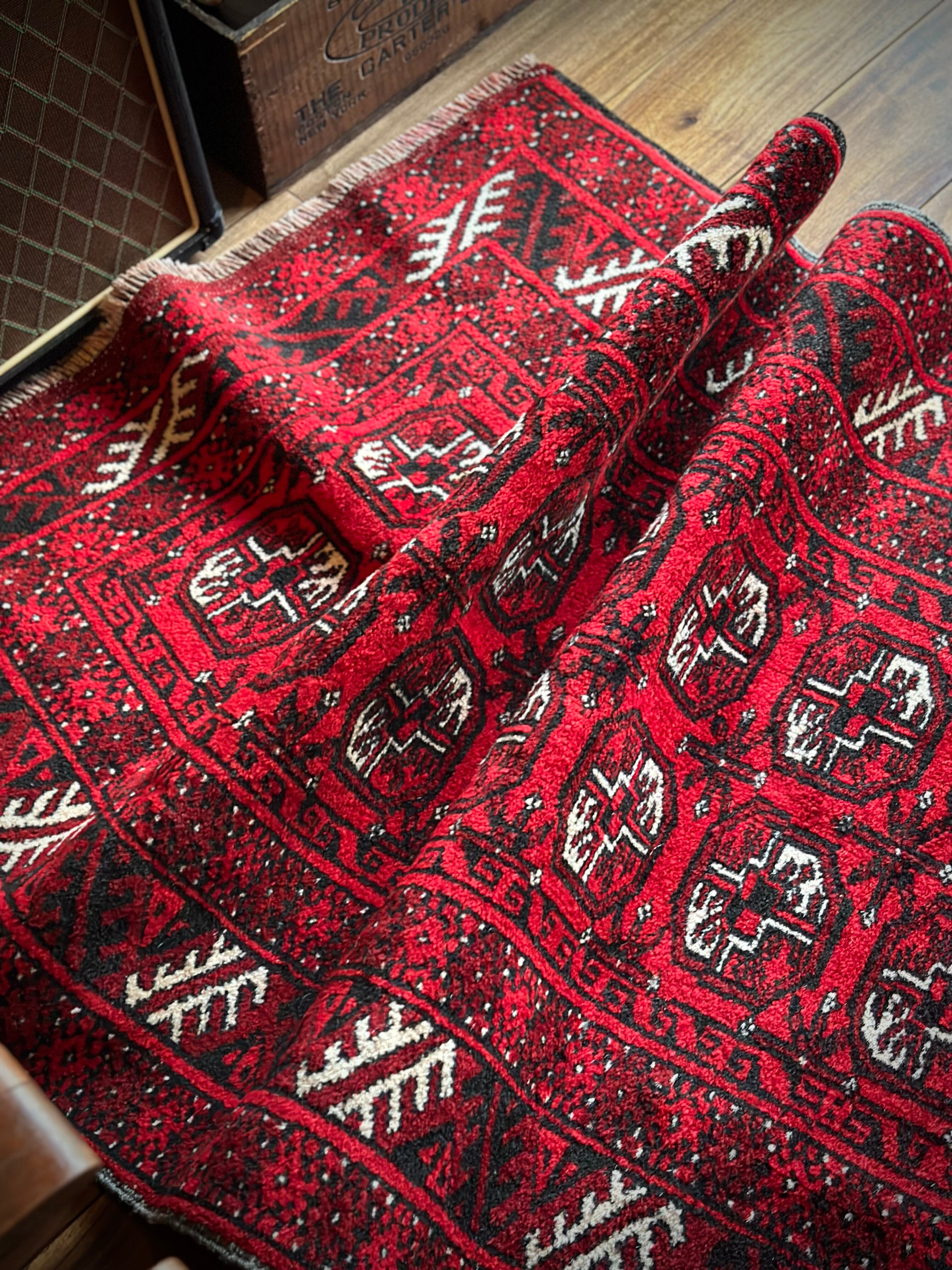 こちら典型的な赤い絨毯の代名詞でお馴染みのスタイルが誇らしく、ガッシリとした厚手の織りで玄関マットやチェスト前にも最適な、アフガニスタン北部のアンドホイに居住するトルクメン族のトライバルラグになります。