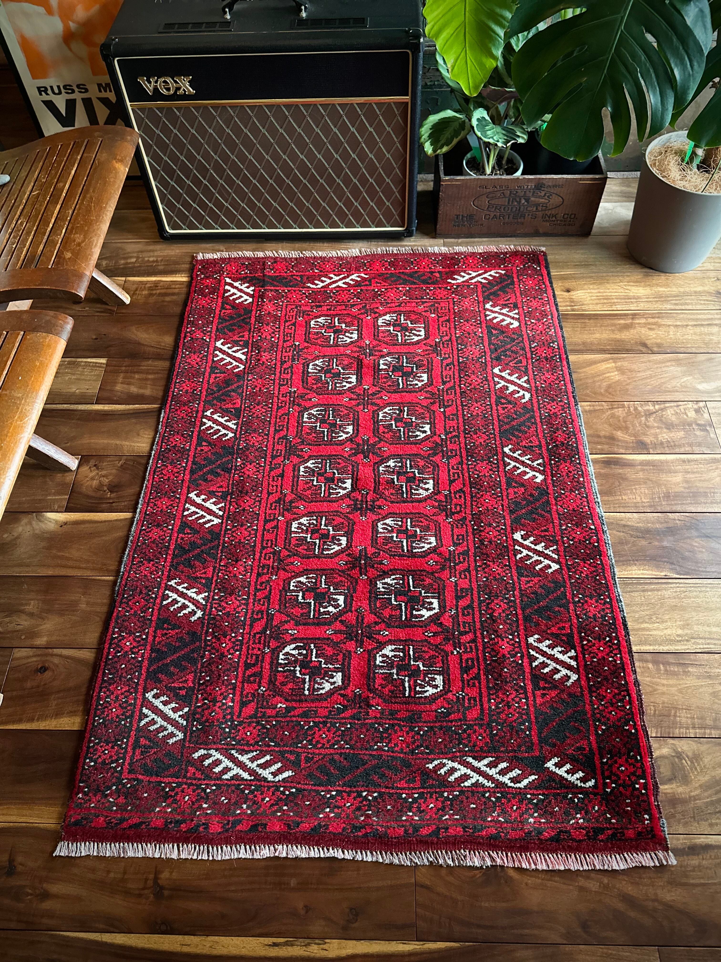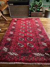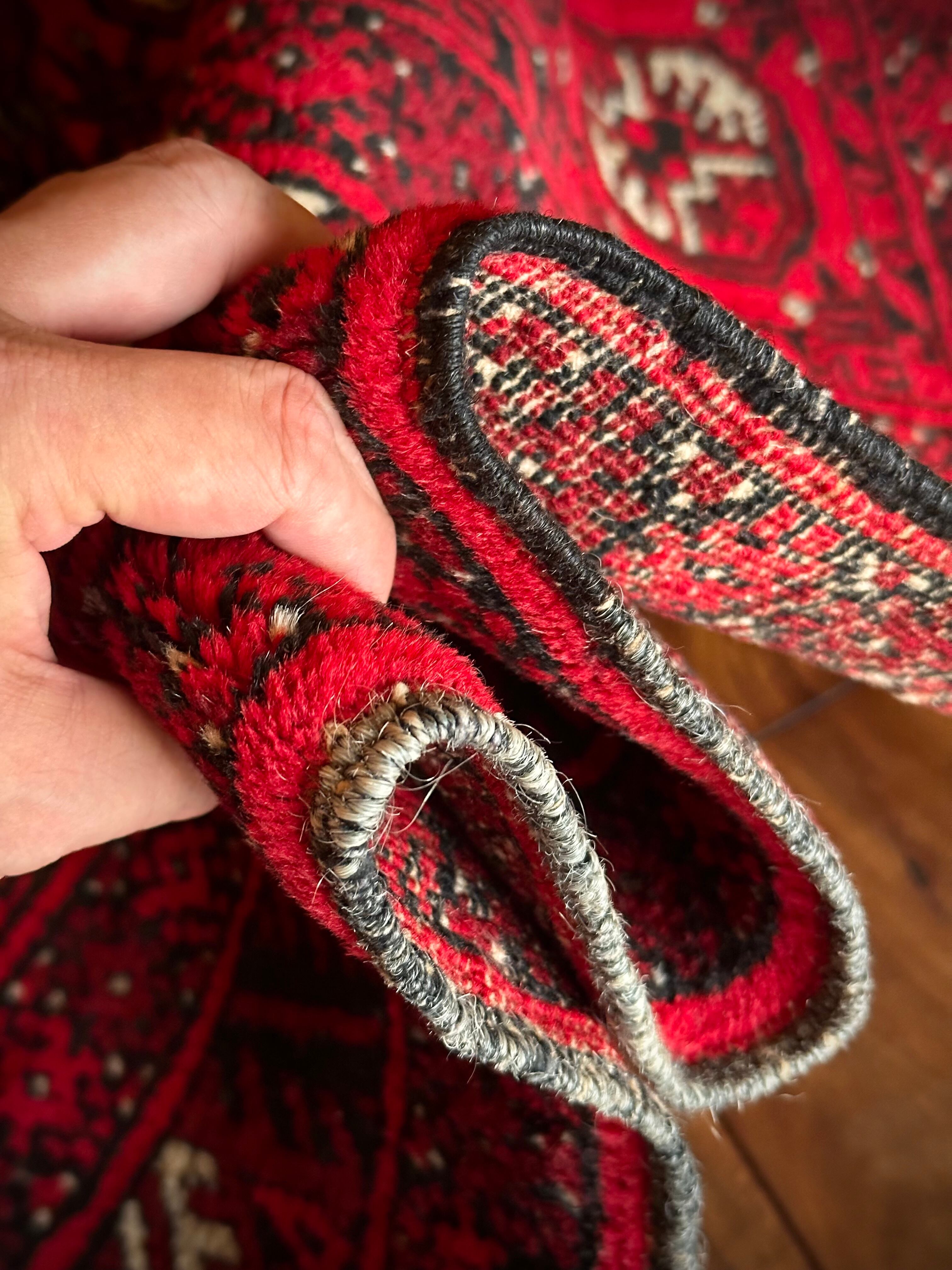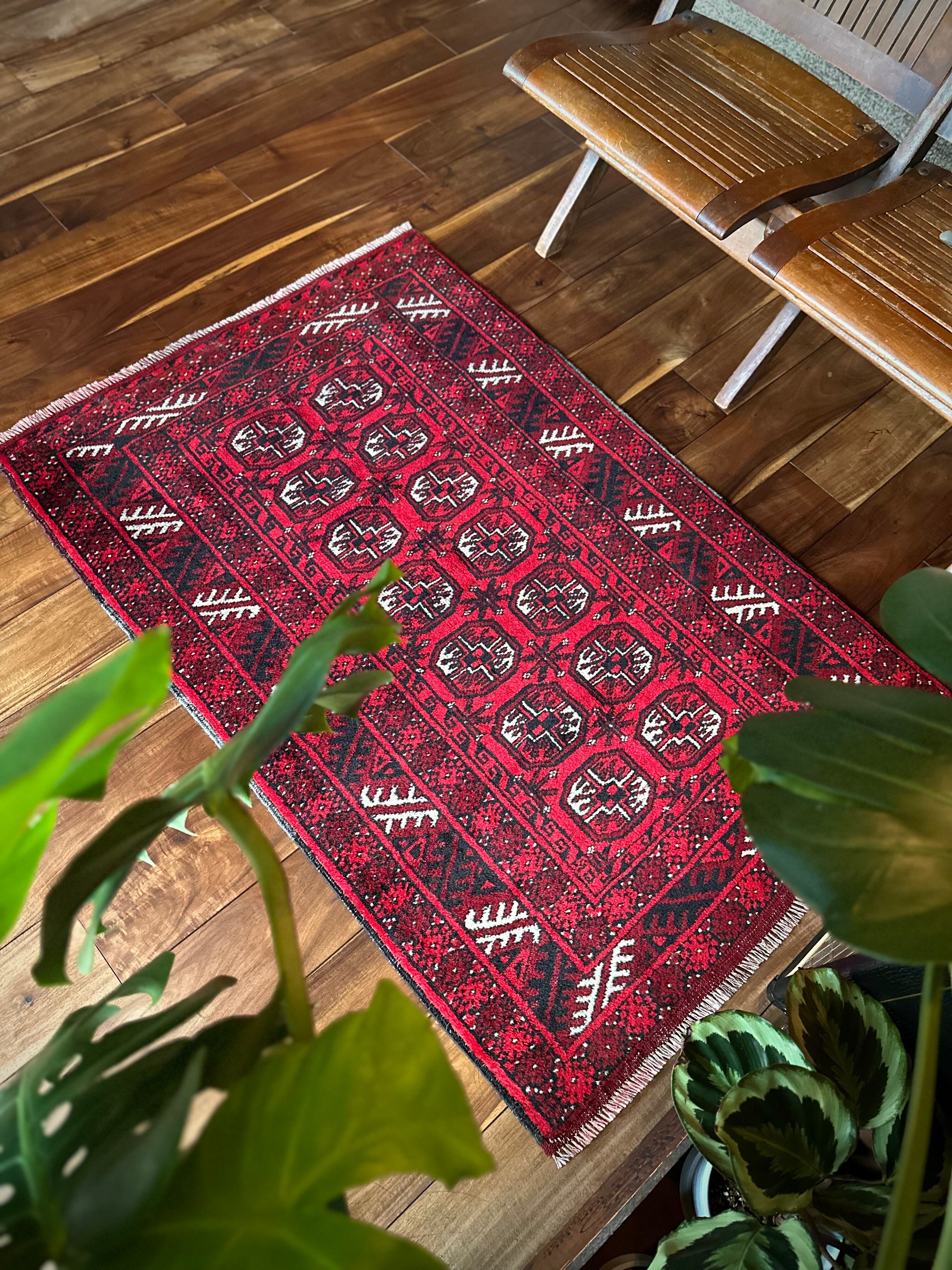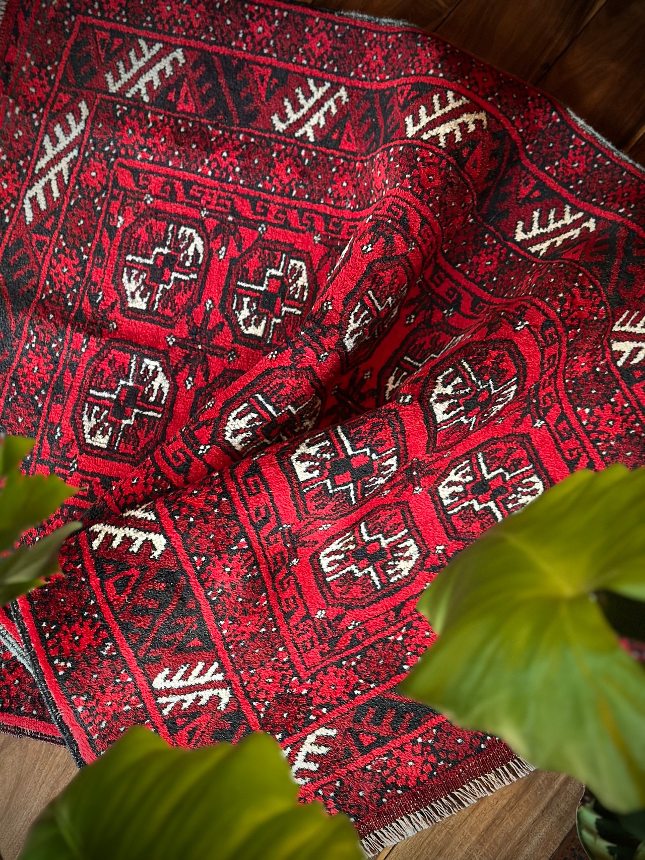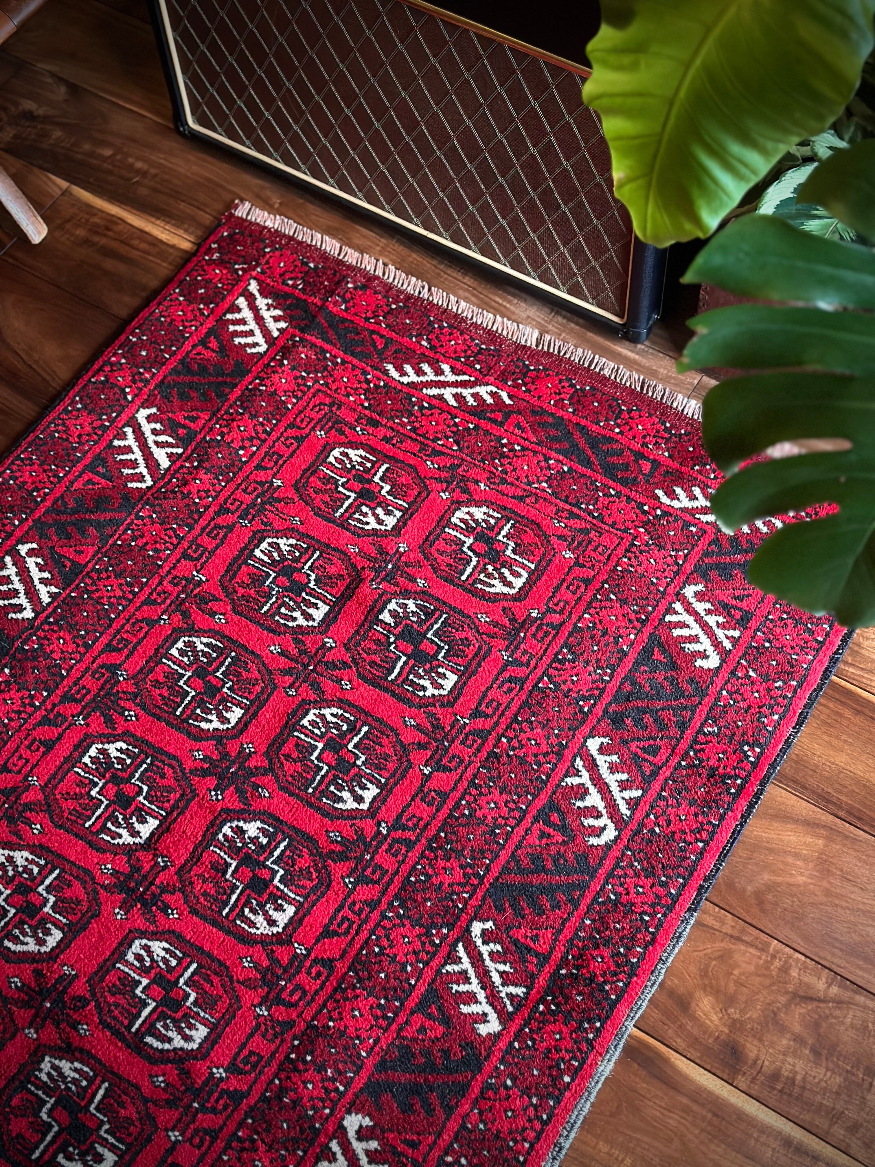 こちら典型的な赤い絨毯の代名詞でお馴染みのスタイルが誇らしく、ガッシリとした厚手の織りで玄関マットやチェスト前にも最適な、アフガニスタン北部のアンドホイに居住するトルクメン族のトライバルラグになります。