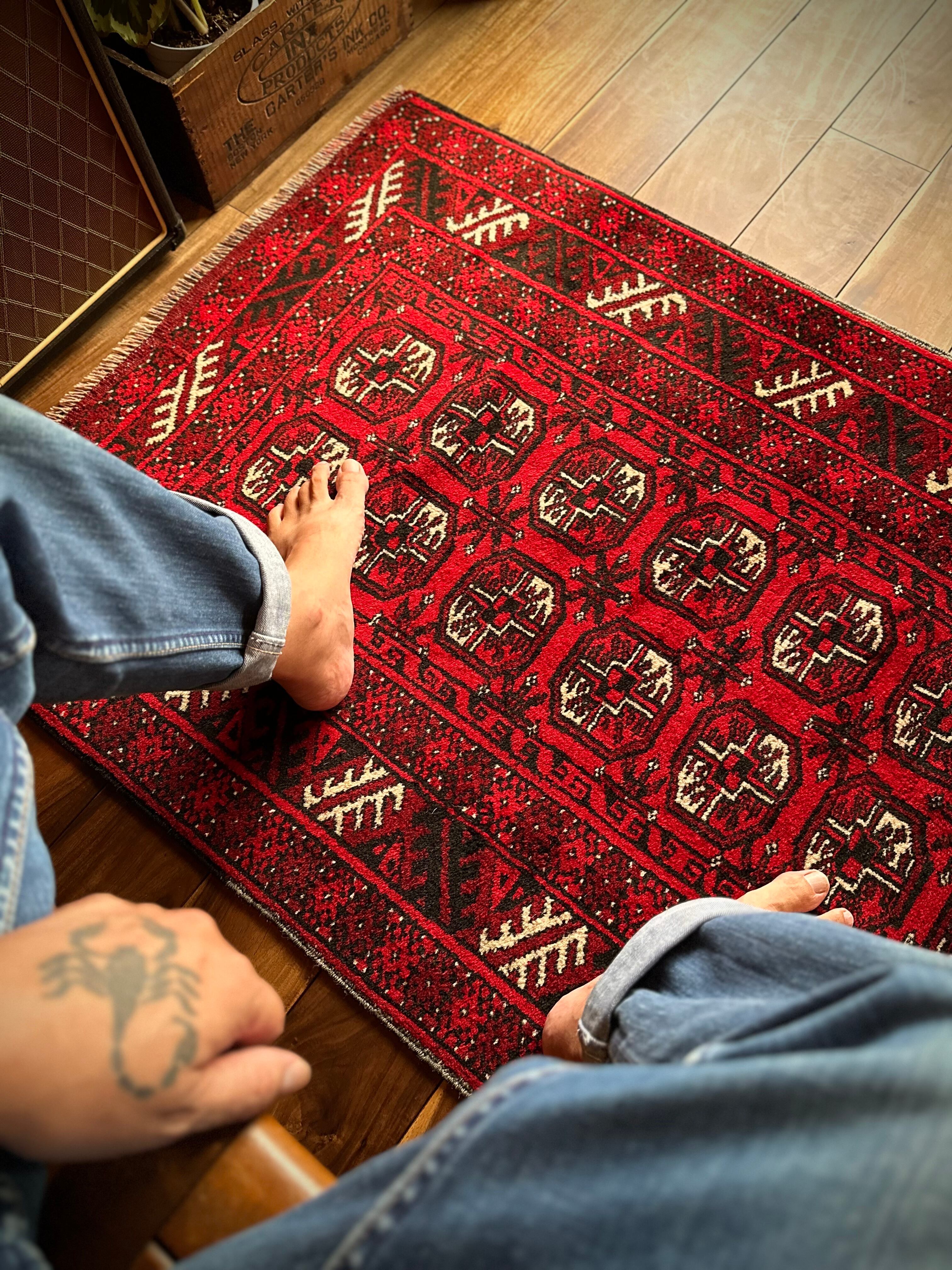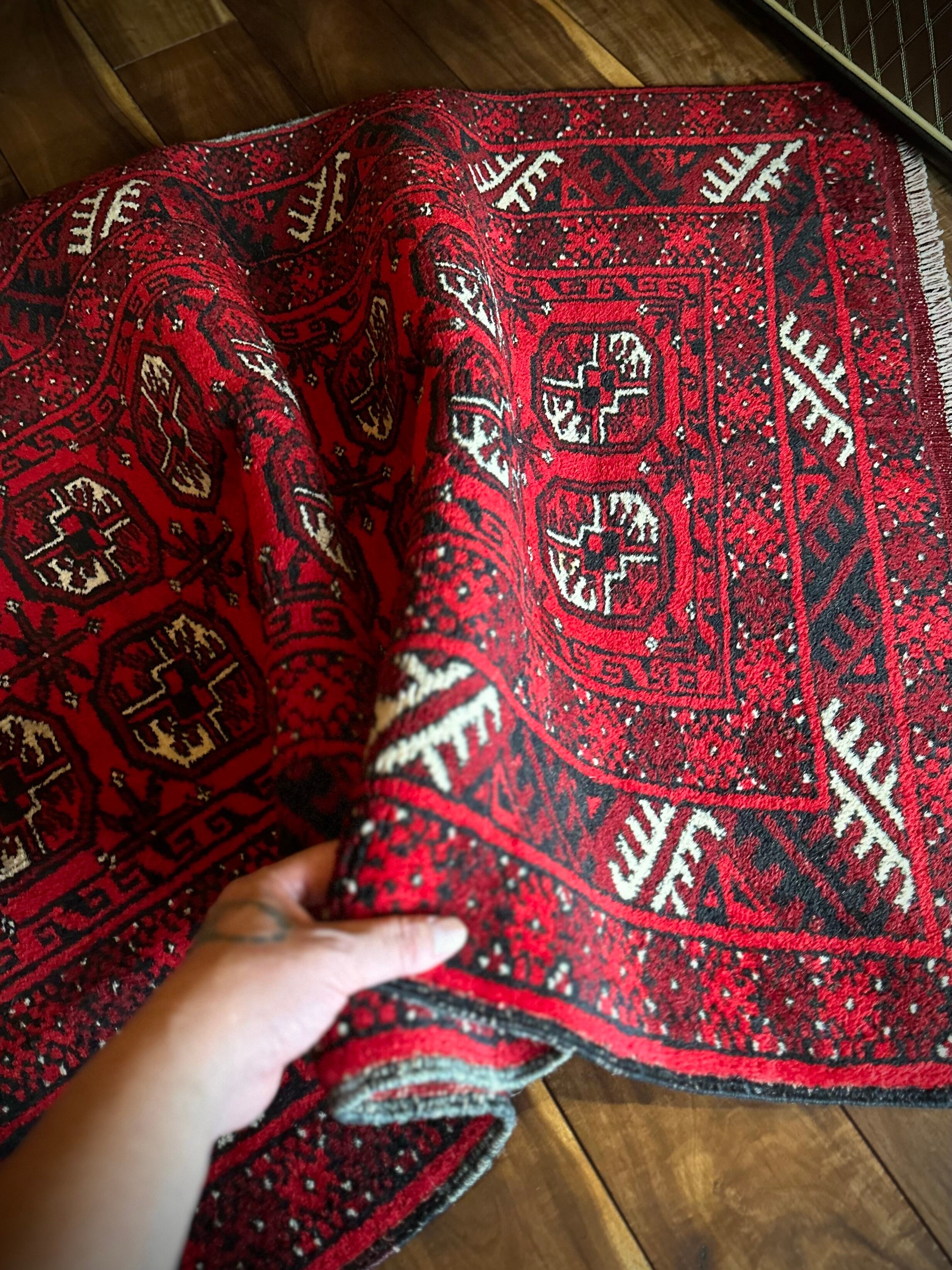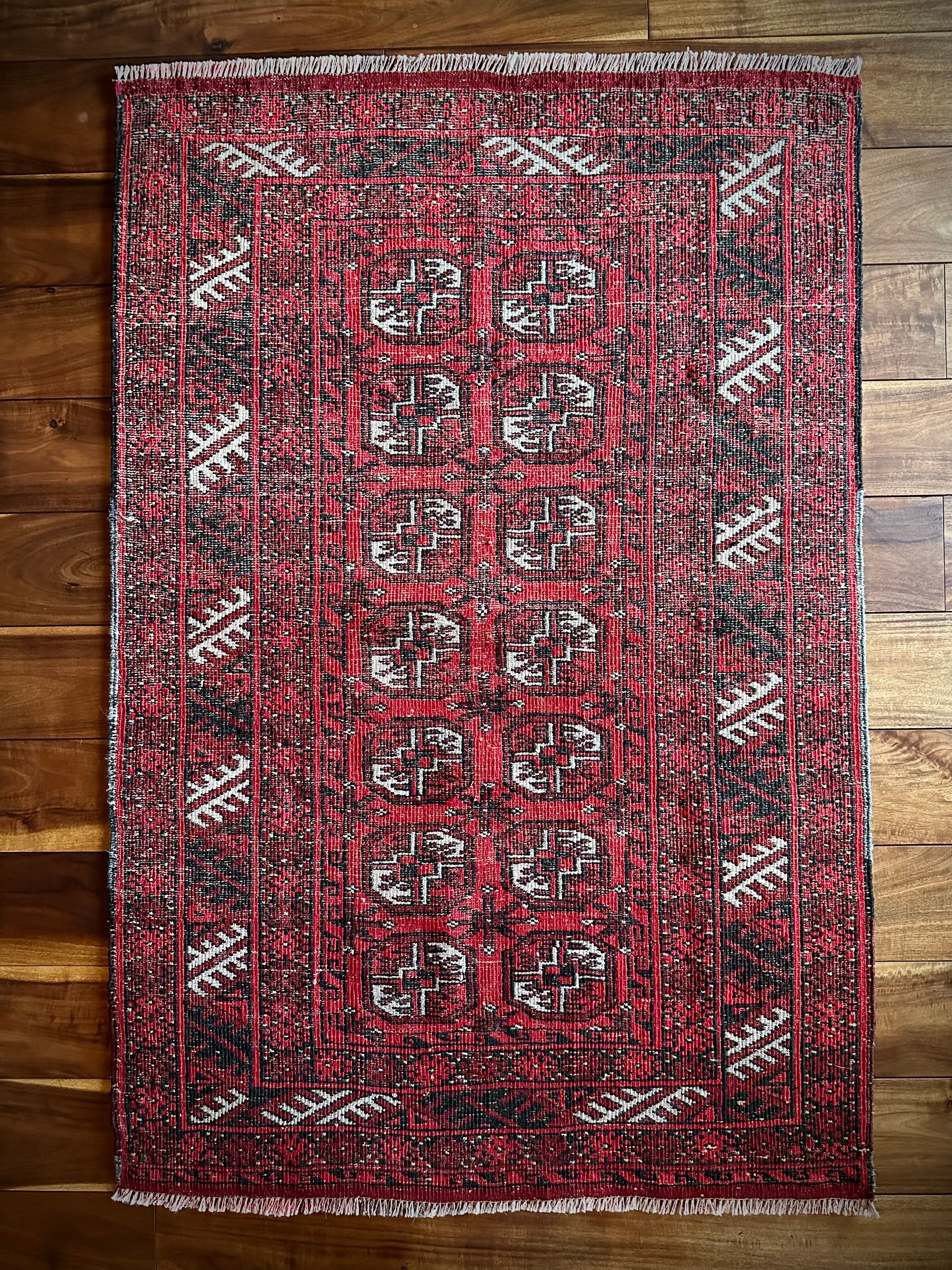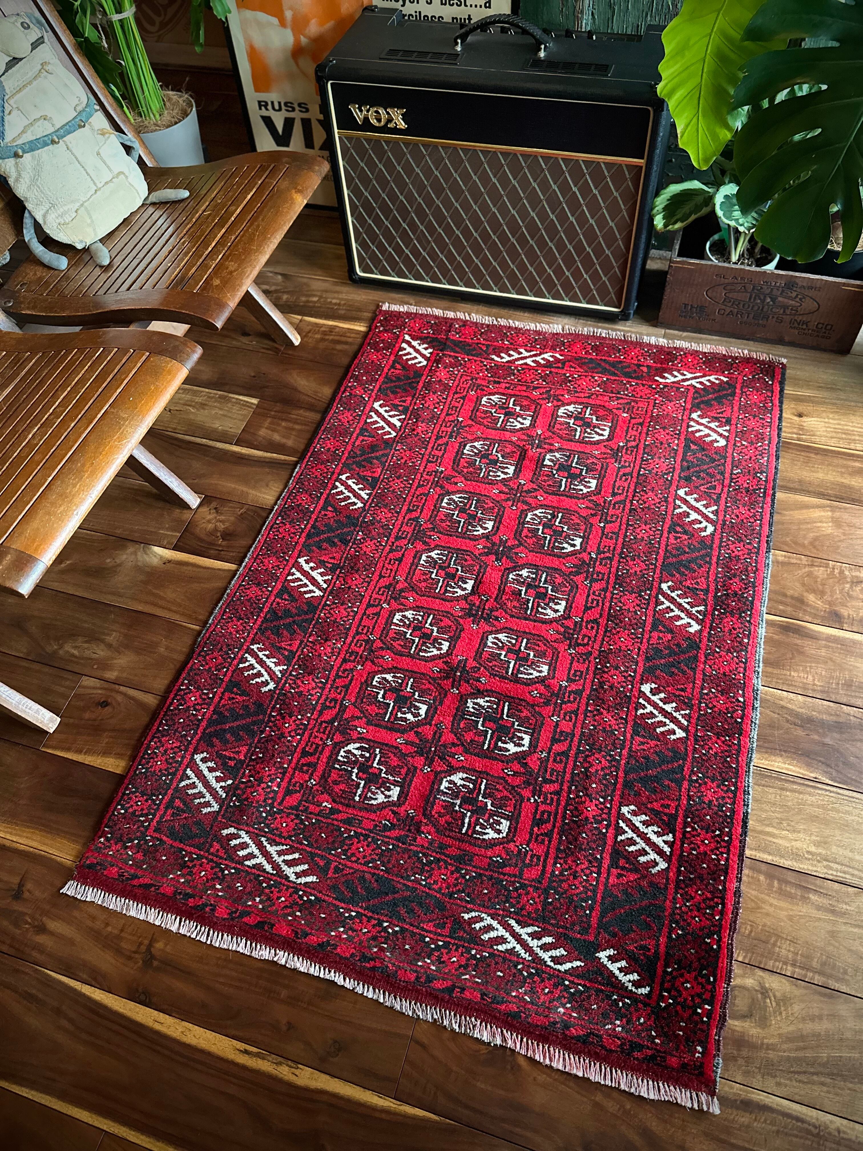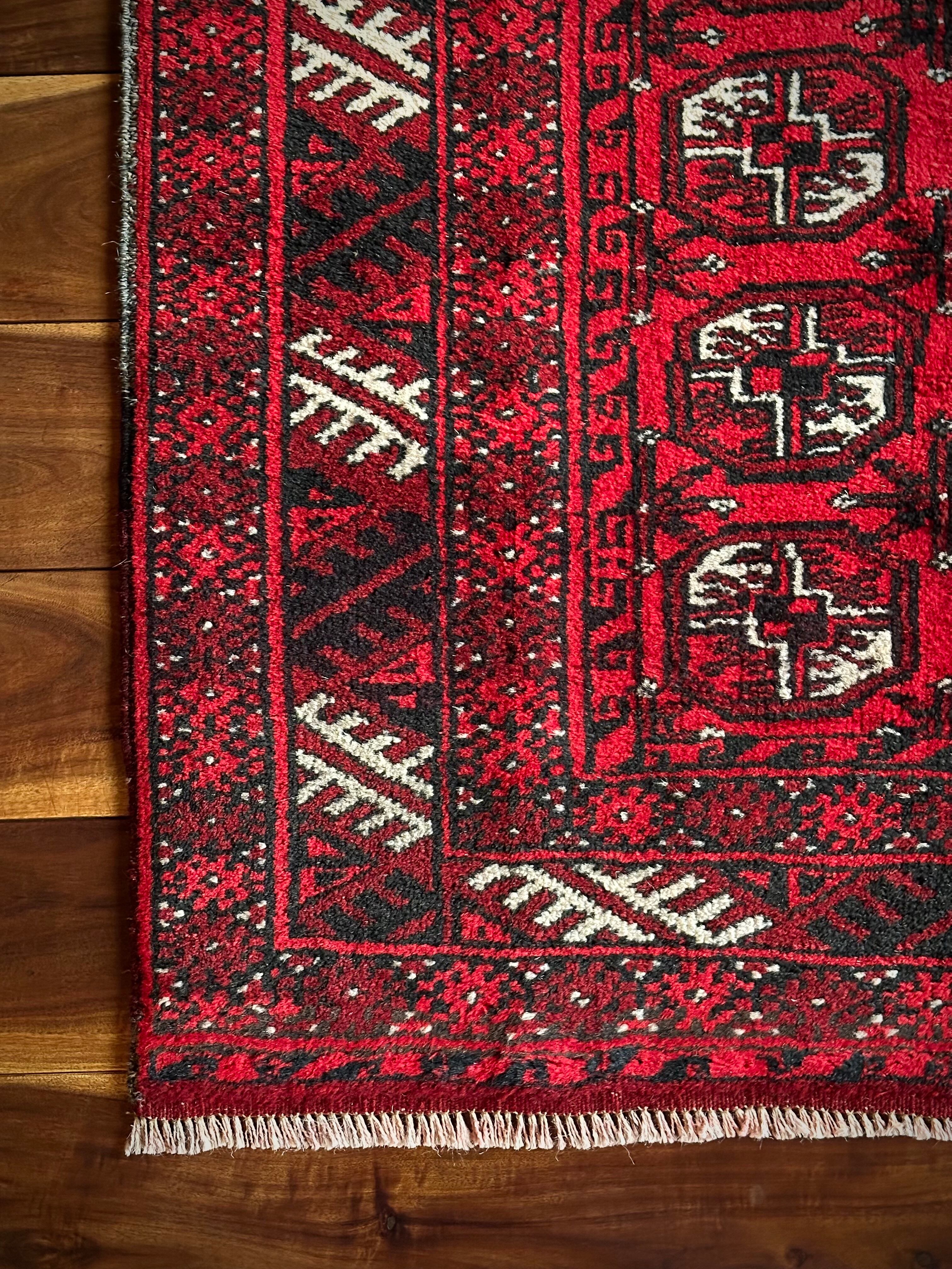 こちら典型的な赤い絨毯の代名詞でお馴染みのスタイルが誇らしく、ガッシリとした厚手の織りで玄関マットやチェスト前にも最適な、アフガニスタン北部のアンドホイに居住するトルクメン族のトライバルラグになります。