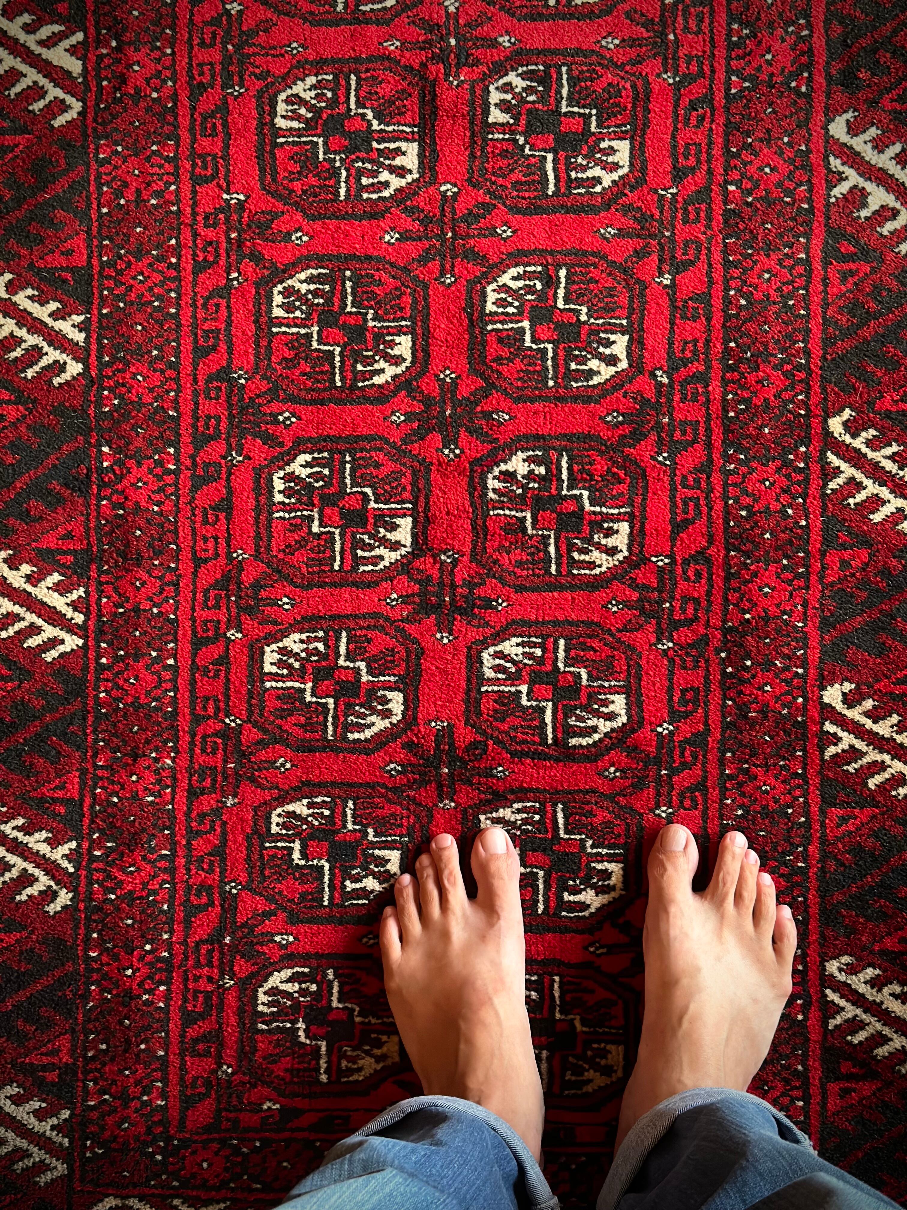 大概のトルクメンは薄手タイプが多いなか、こちらは8ミリという分厚さで安定した1枚かと。パイル自体はさほど長くはなくサラッとした手触りで、最近よく目にするギター・アンプの前に敷くのにも手頃なサイズ感がおすすめでしょうか。