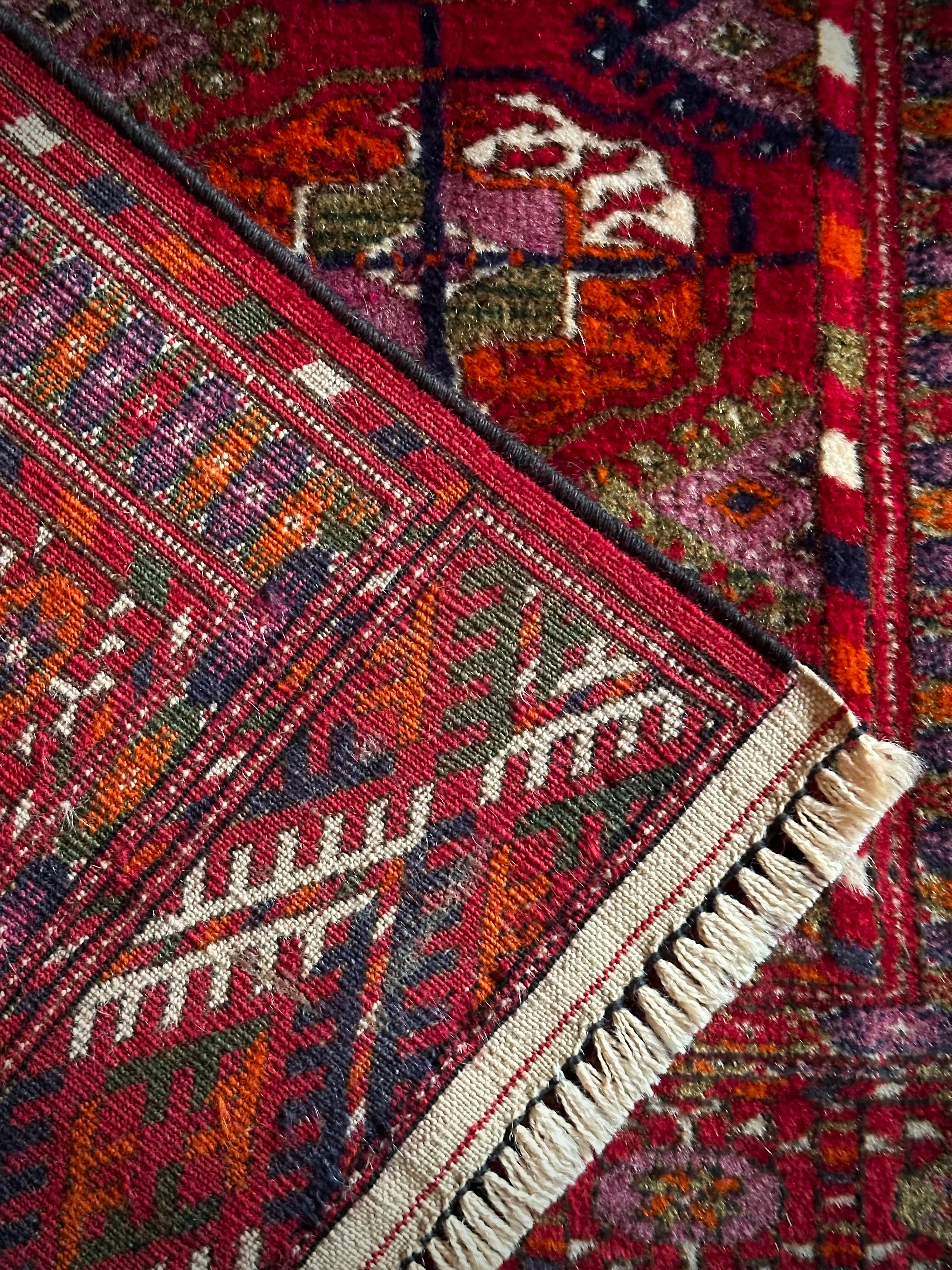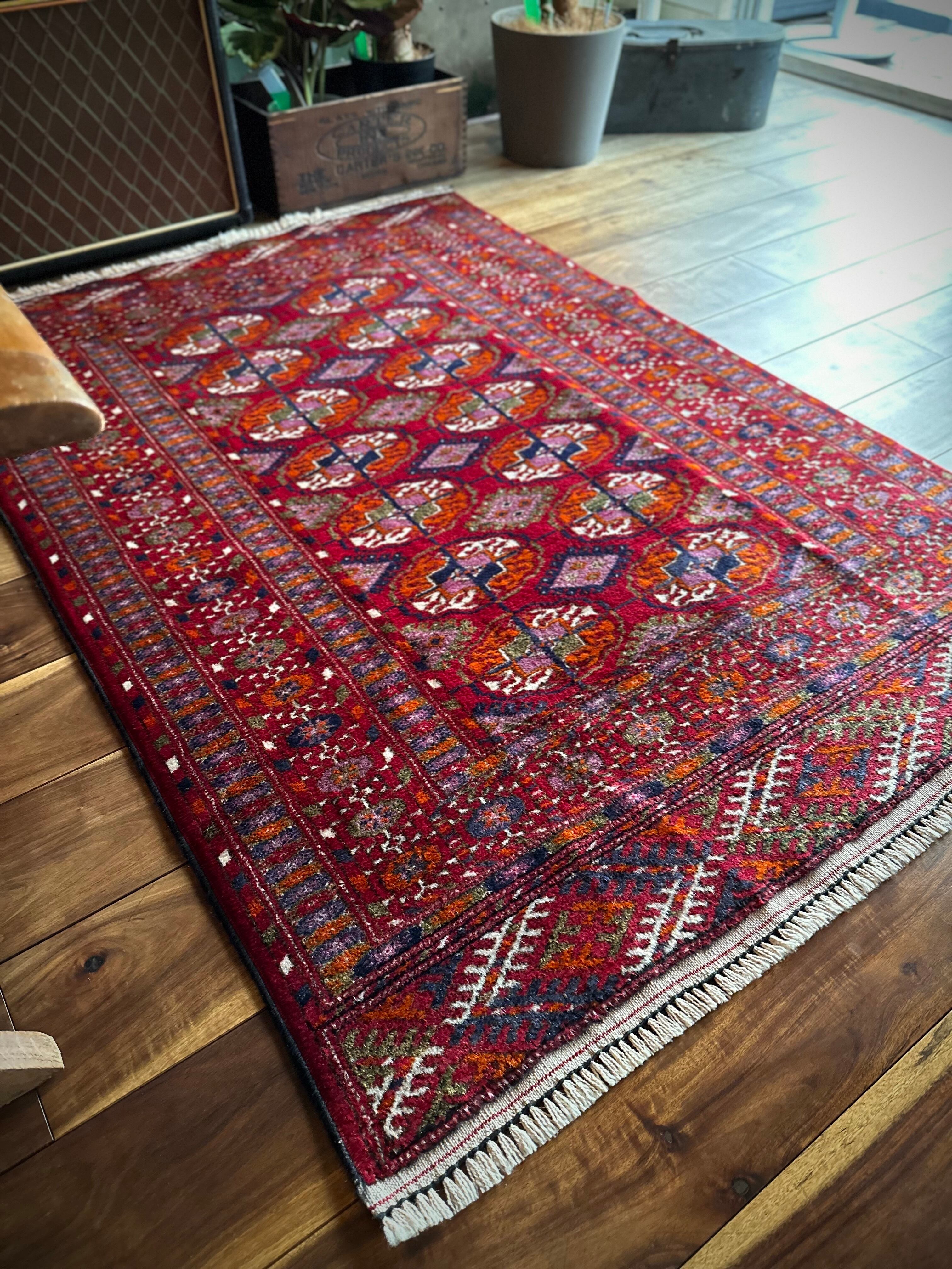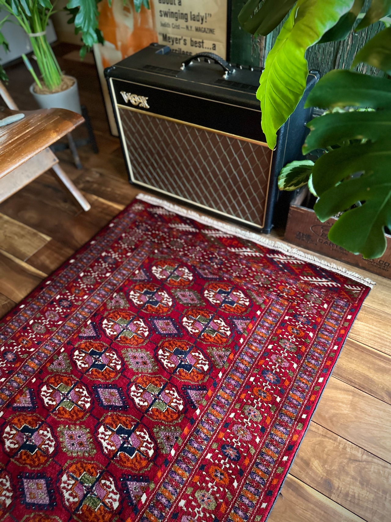 経年としては60年と見た目からしてヴィンテージラグらしい風格でしょうか。特に目立つようなダメージやリペア箇所は見当たらないグッドなコンディションで、他とは違う深みのある色合いがかっこいい本物のトルクメンラグと言えるでしょうか。