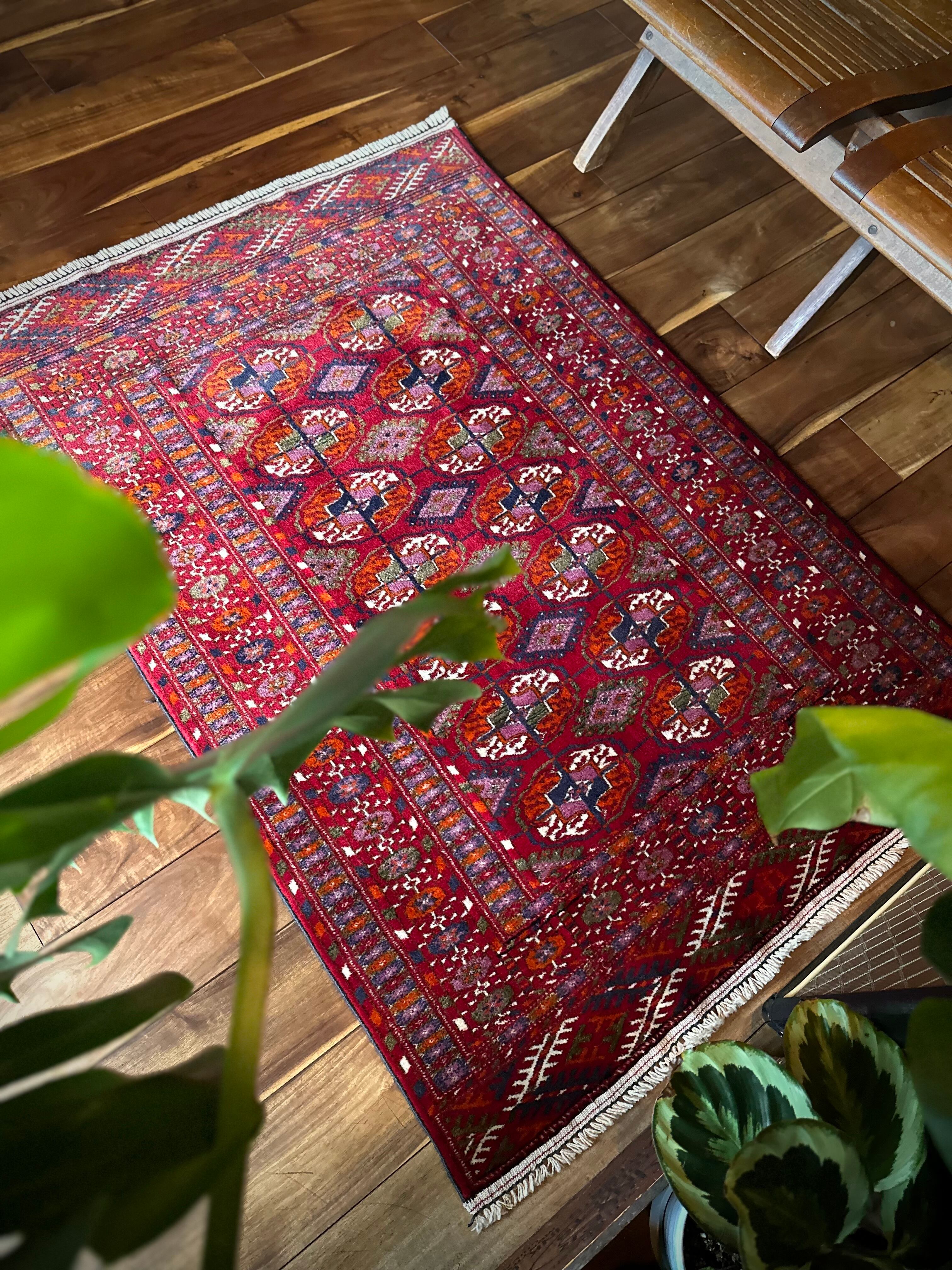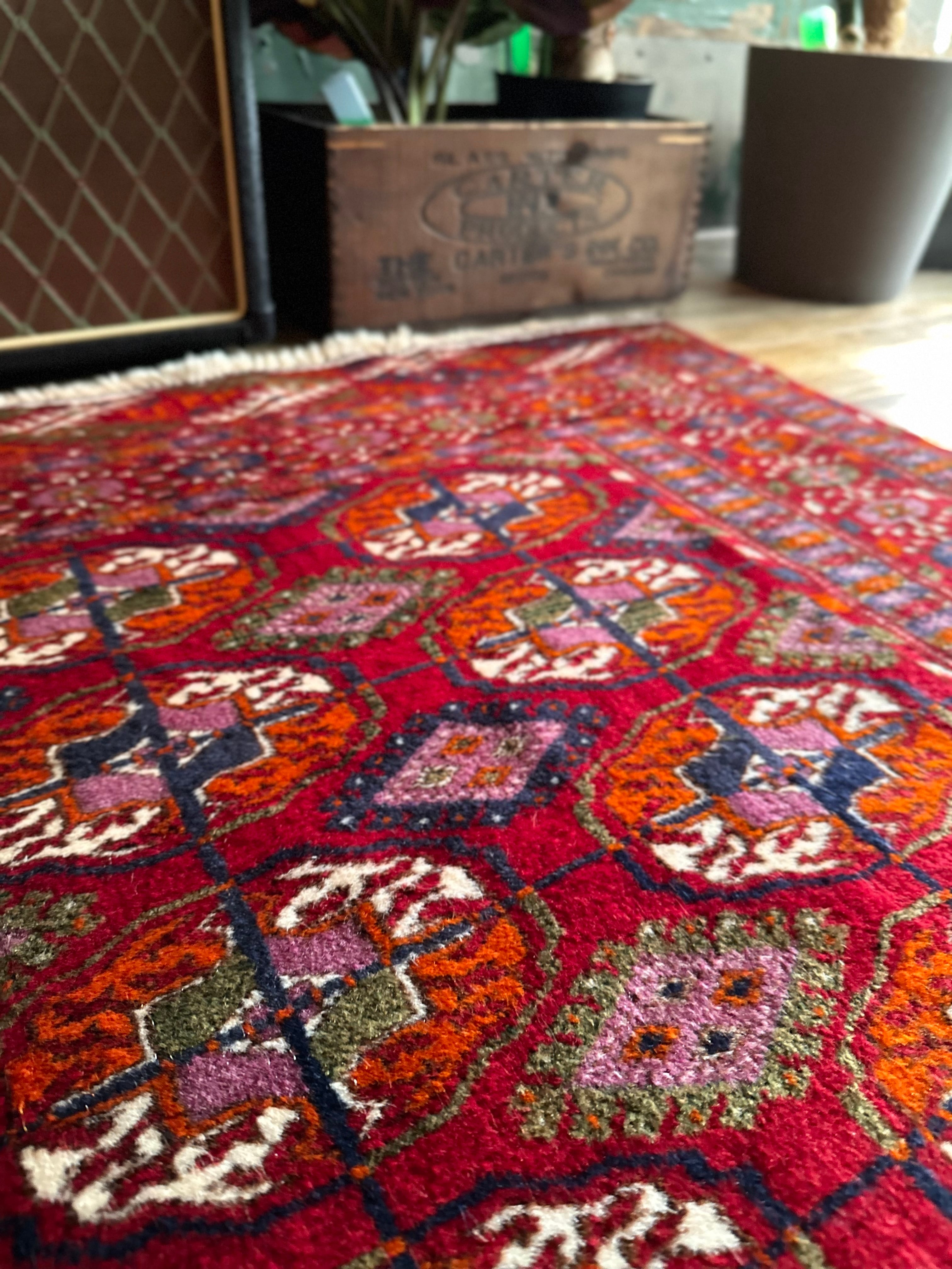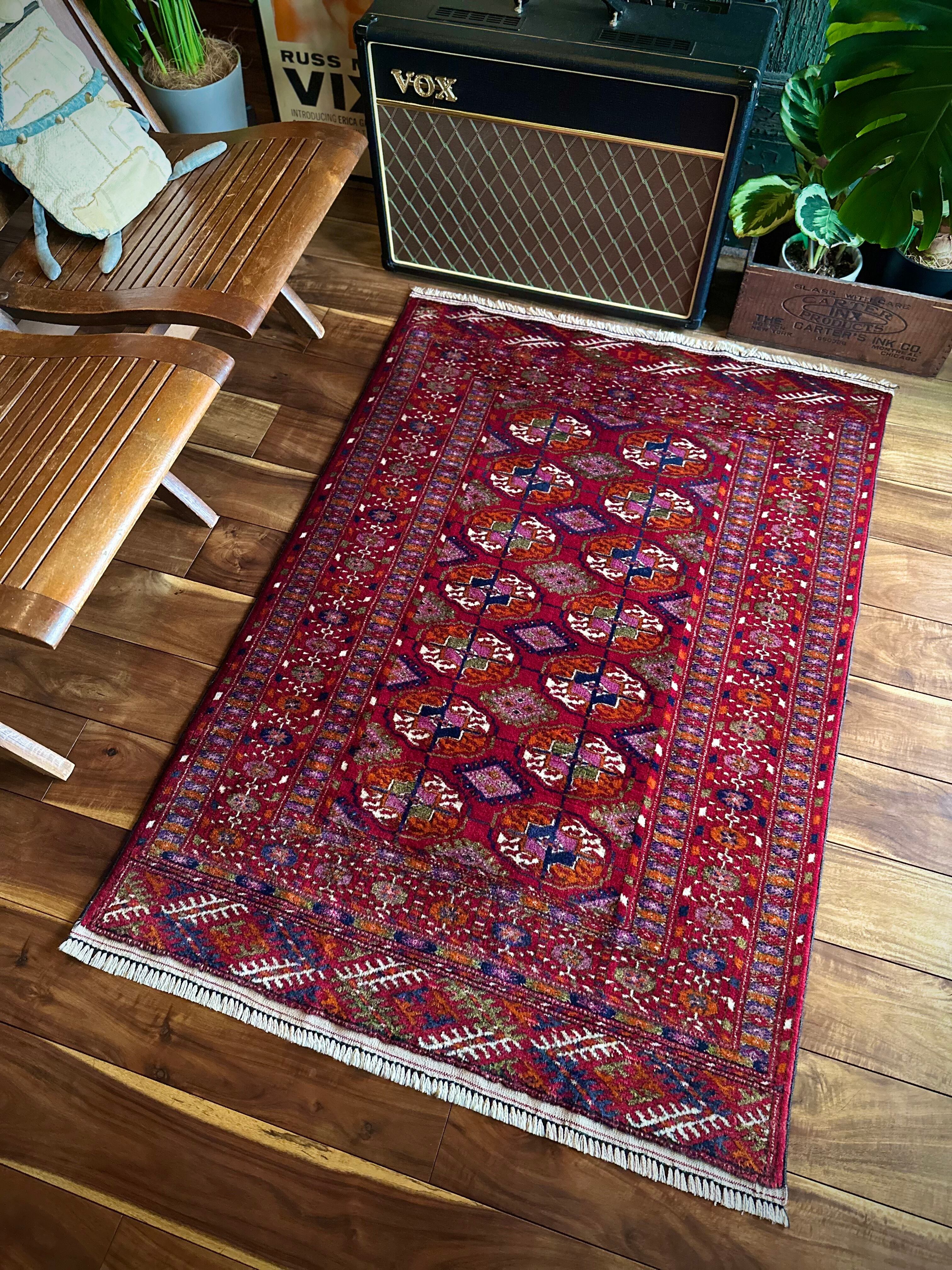 経年としては60年と見た目からしてヴィンテージラグらしい風格でしょうか。特に目立つようなダメージやリペア箇所は見当たらないグッドなコンディションで、他とは違う深みのある色合いがかっこいい本物のトルクメンラグと言えるでしょうか。