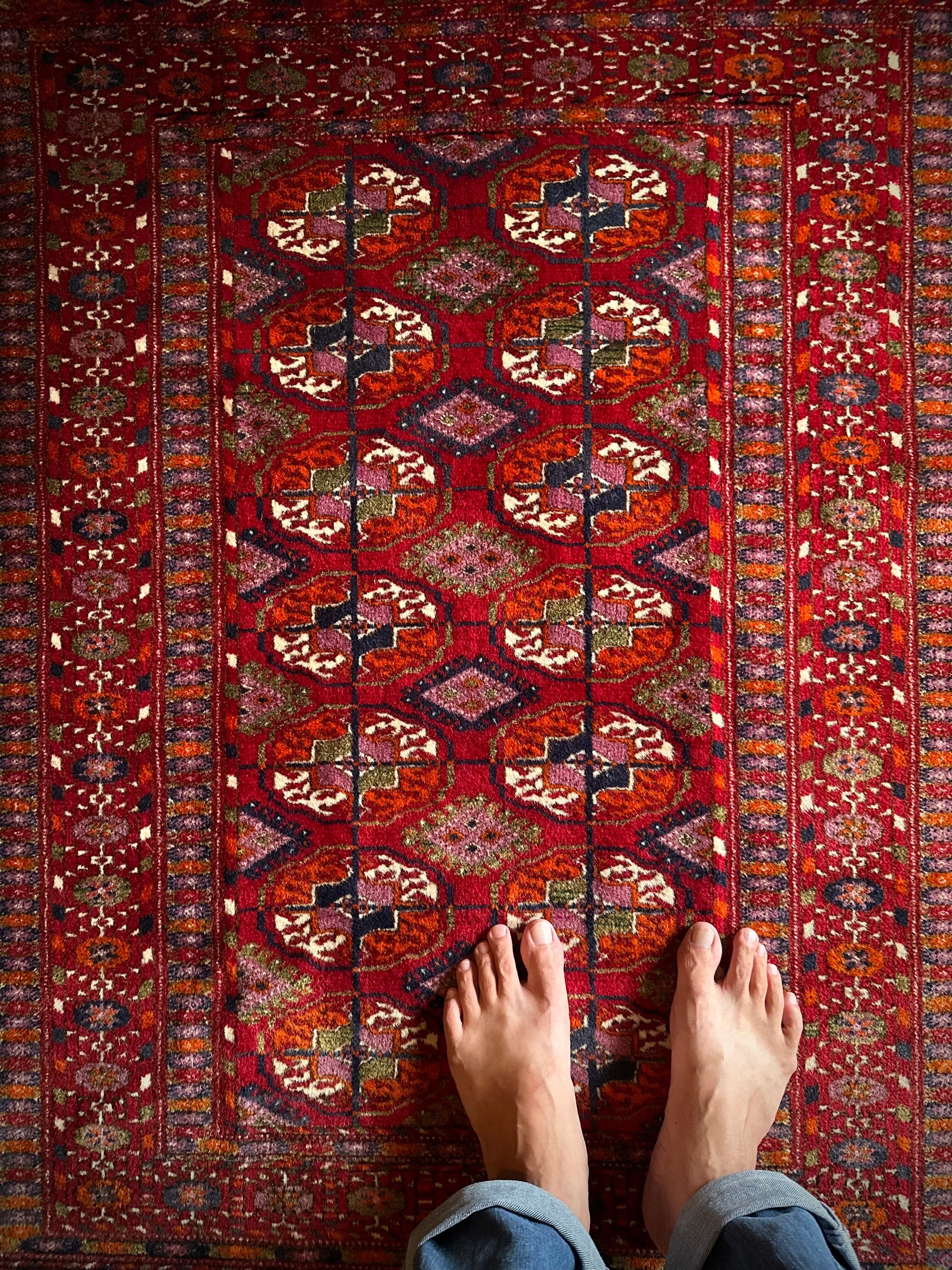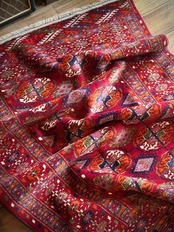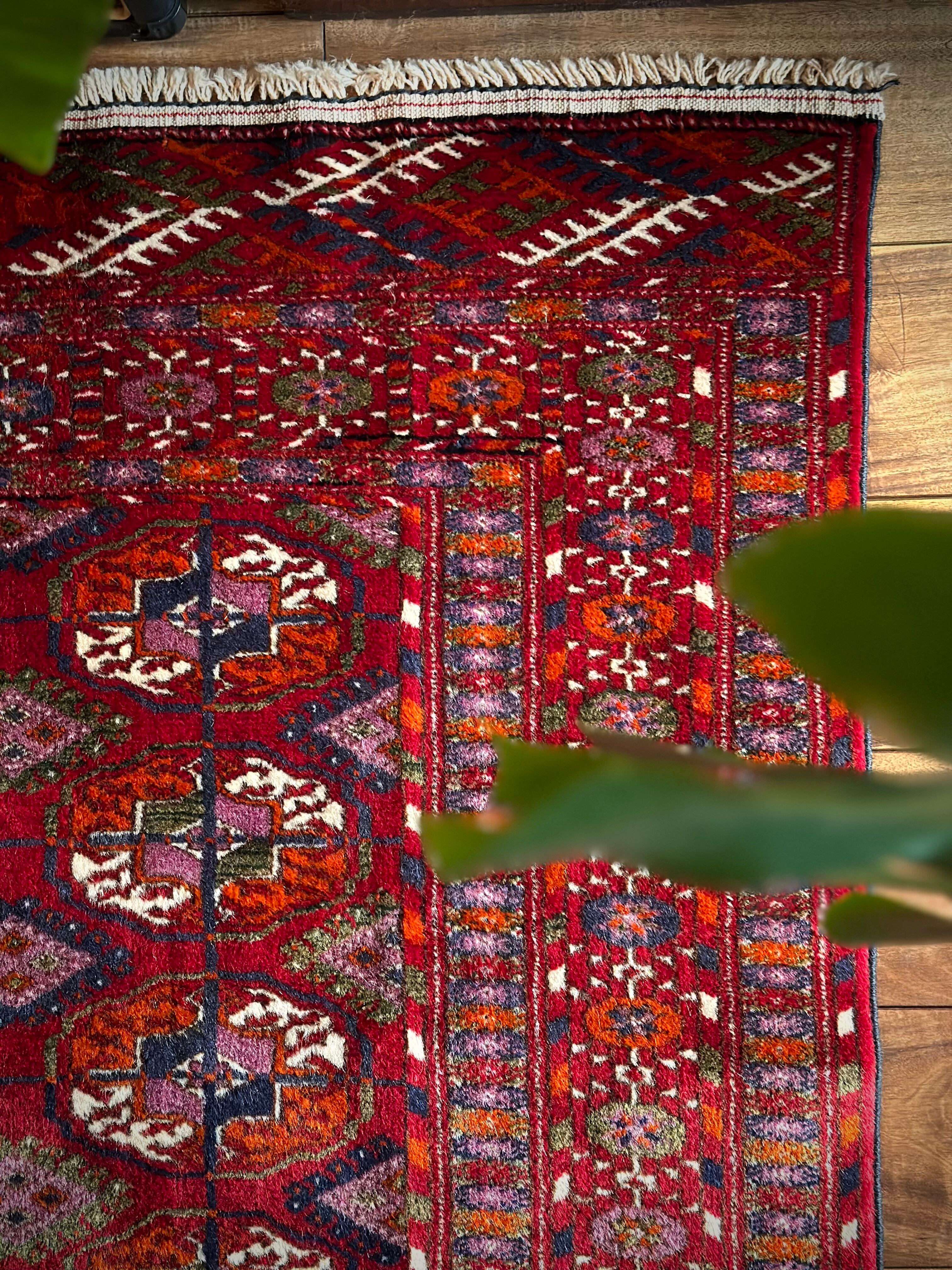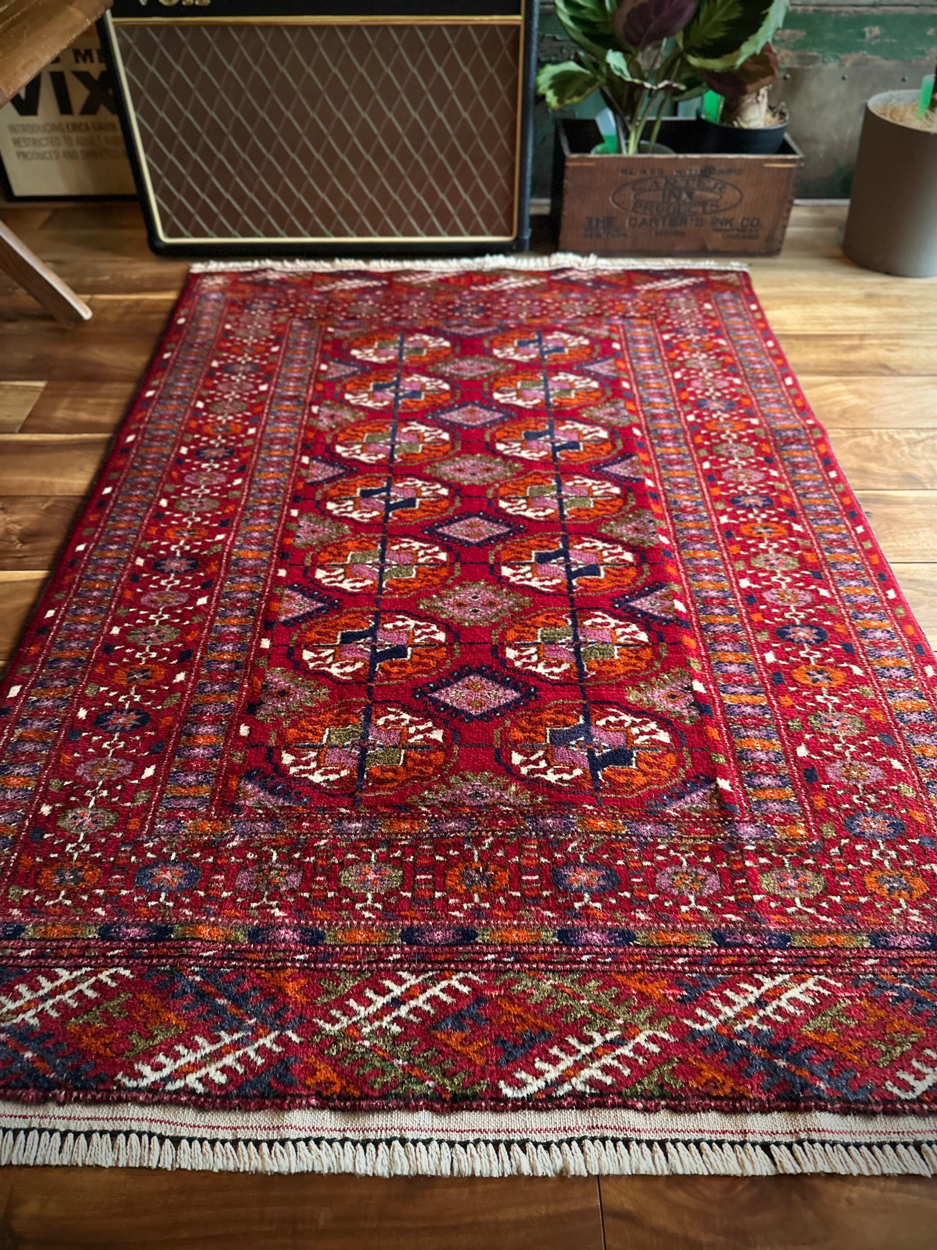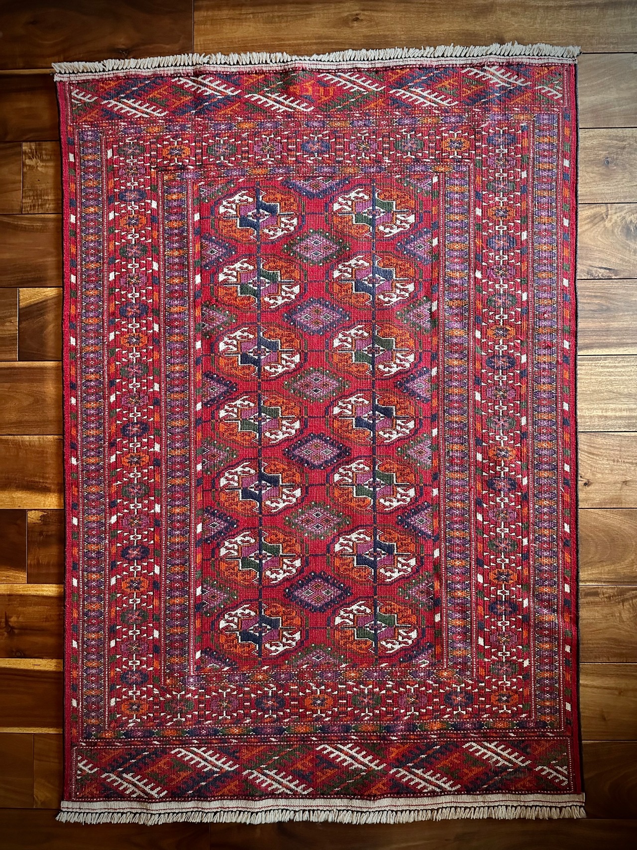 現在のトルクメン人の多くはその国名が示す通りにトルクメニスタンが主な居住区となりますが、その長い歴史とソビエト連邦下での東アジアから中央アジアに広く分布していて、こちらは最大勢力でもあるテッケ族が多く住むウズベキスタンで織られたトライバルラグになります。