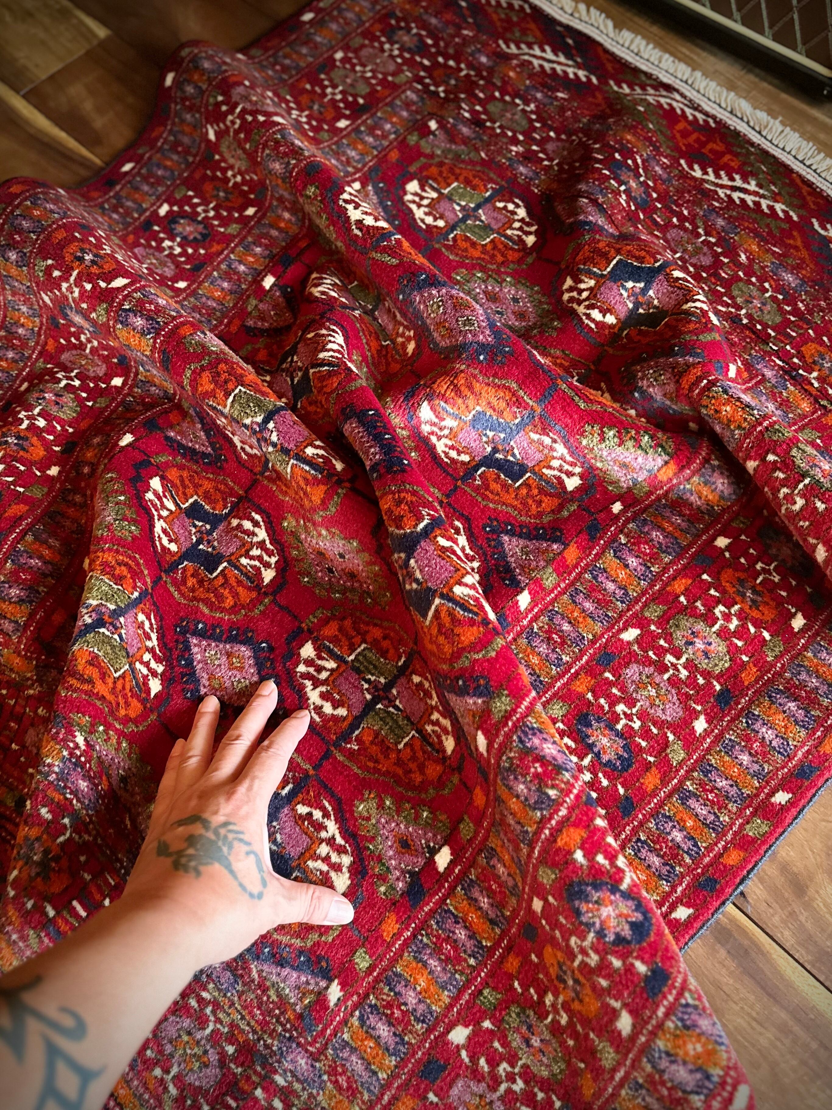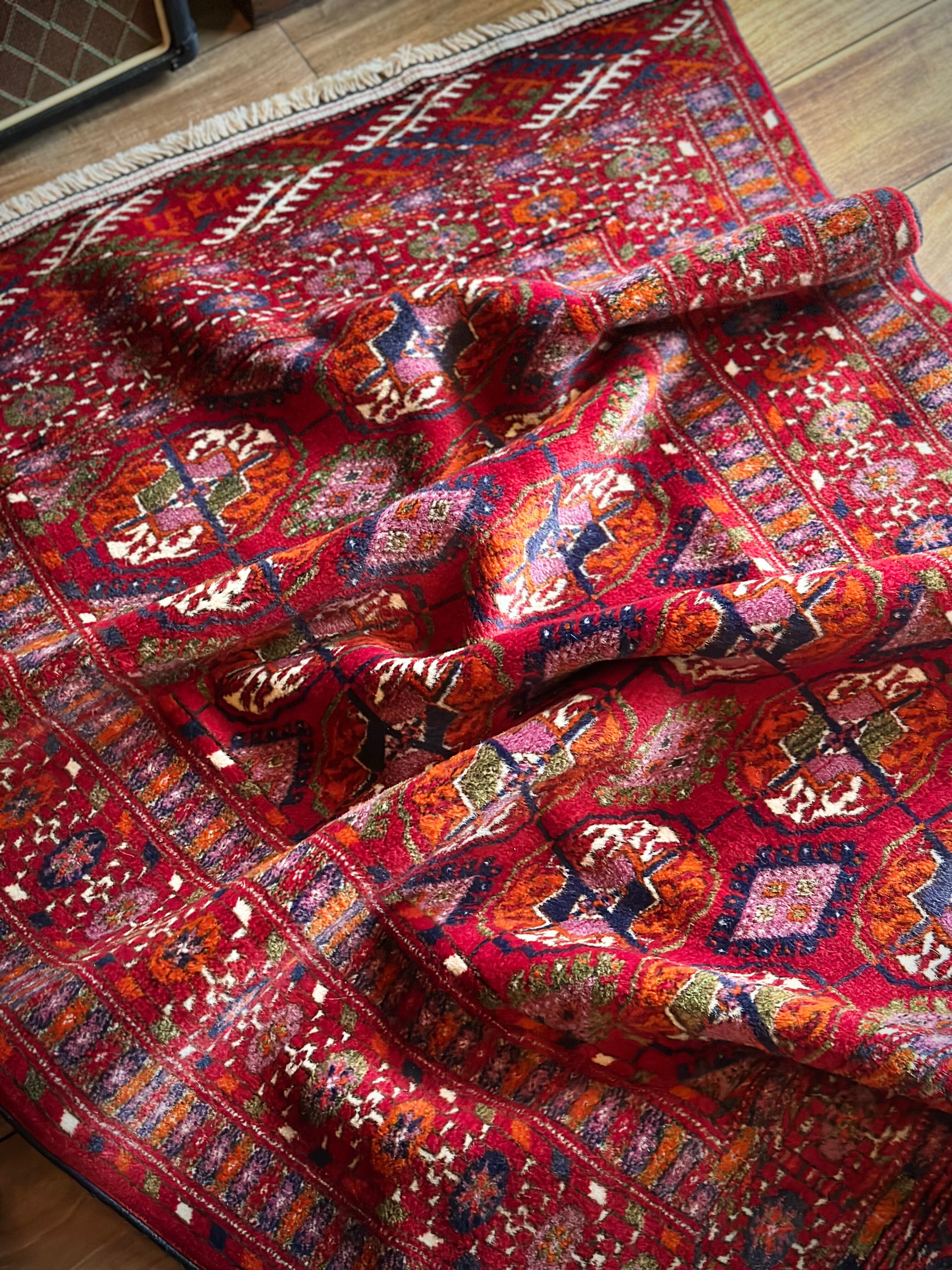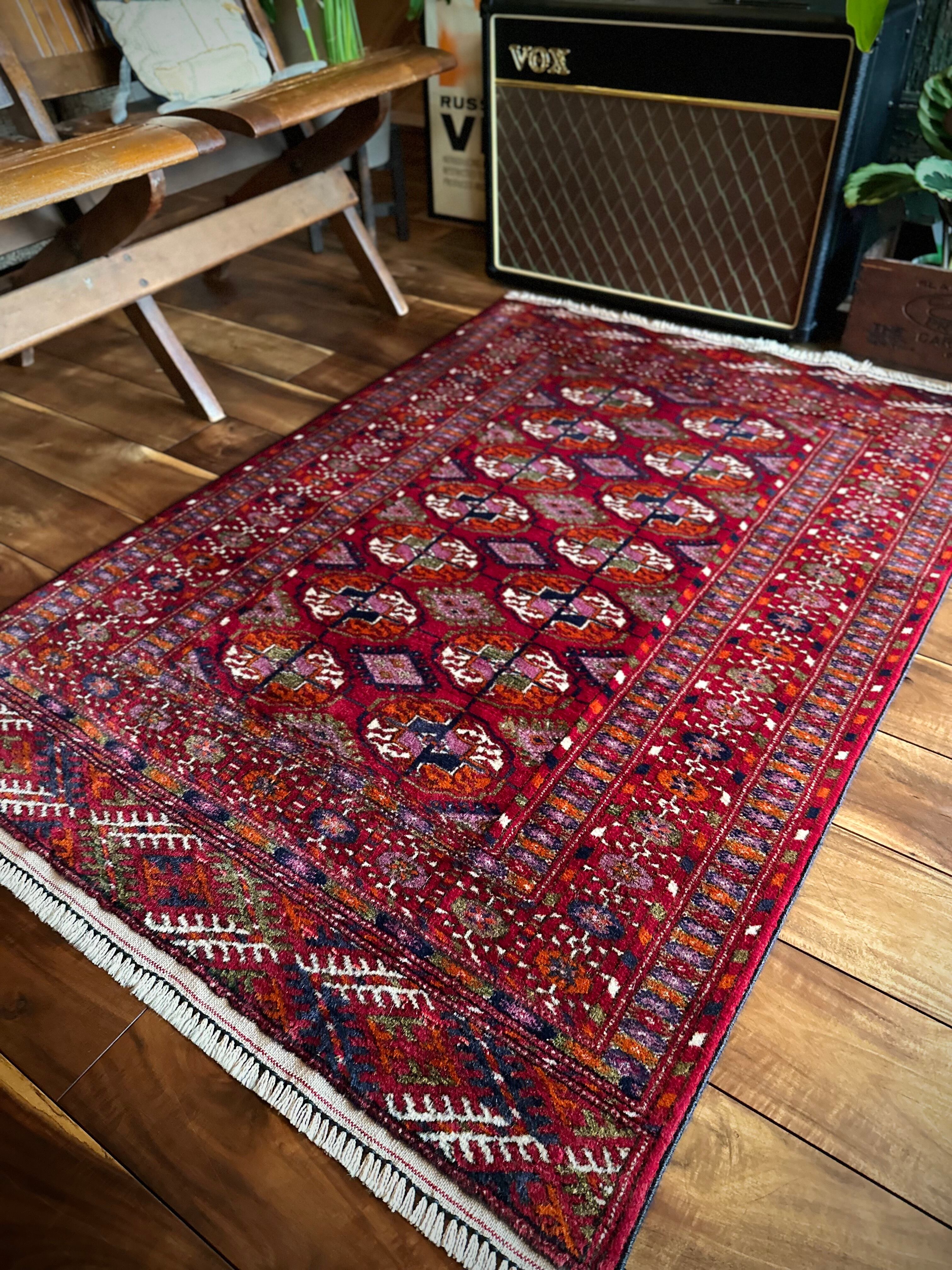 イランやアフガニスタンに住むトルクメンのラグとは趣が違うこちらは、由緒あるテッケ族の家紋が記されたブハラ柄と呼ばれる1枚で、薄手ながらも編み目の細かさが際立つ非常に柔らかな質感となり、短めのパイルでしっとりとした手触りのラグになります。
