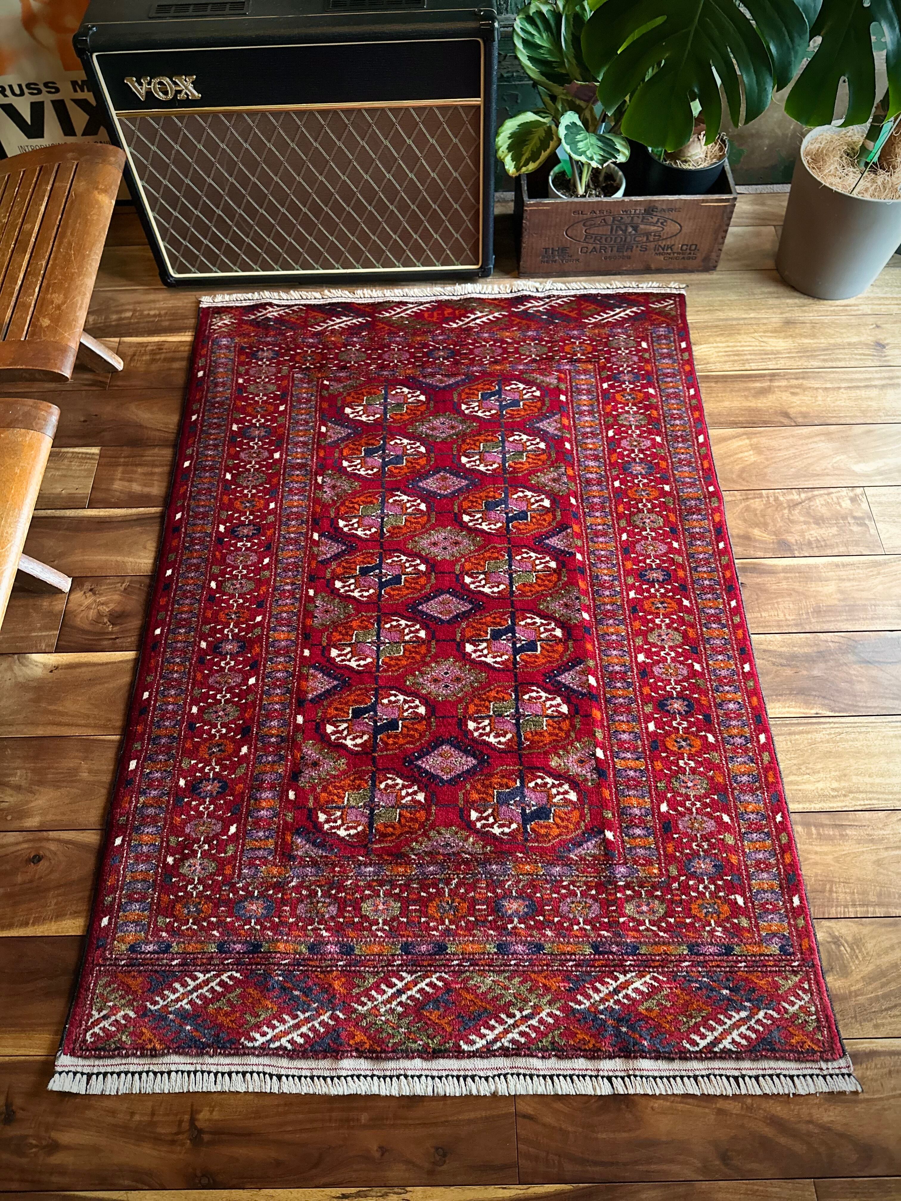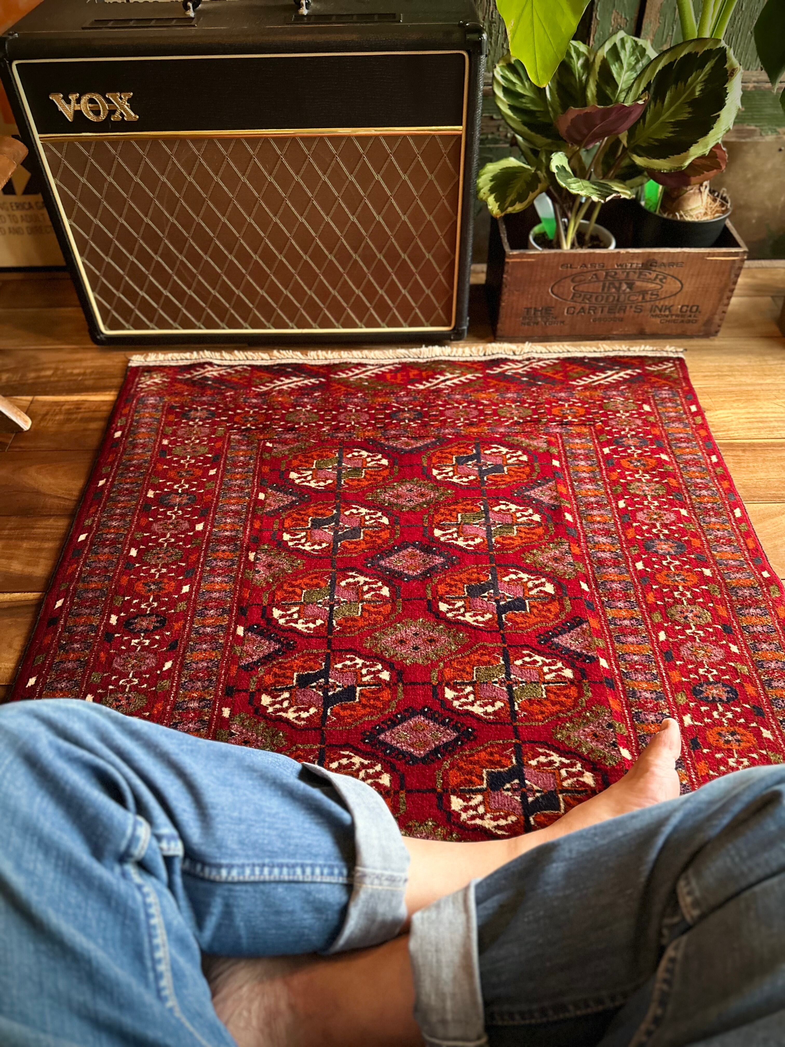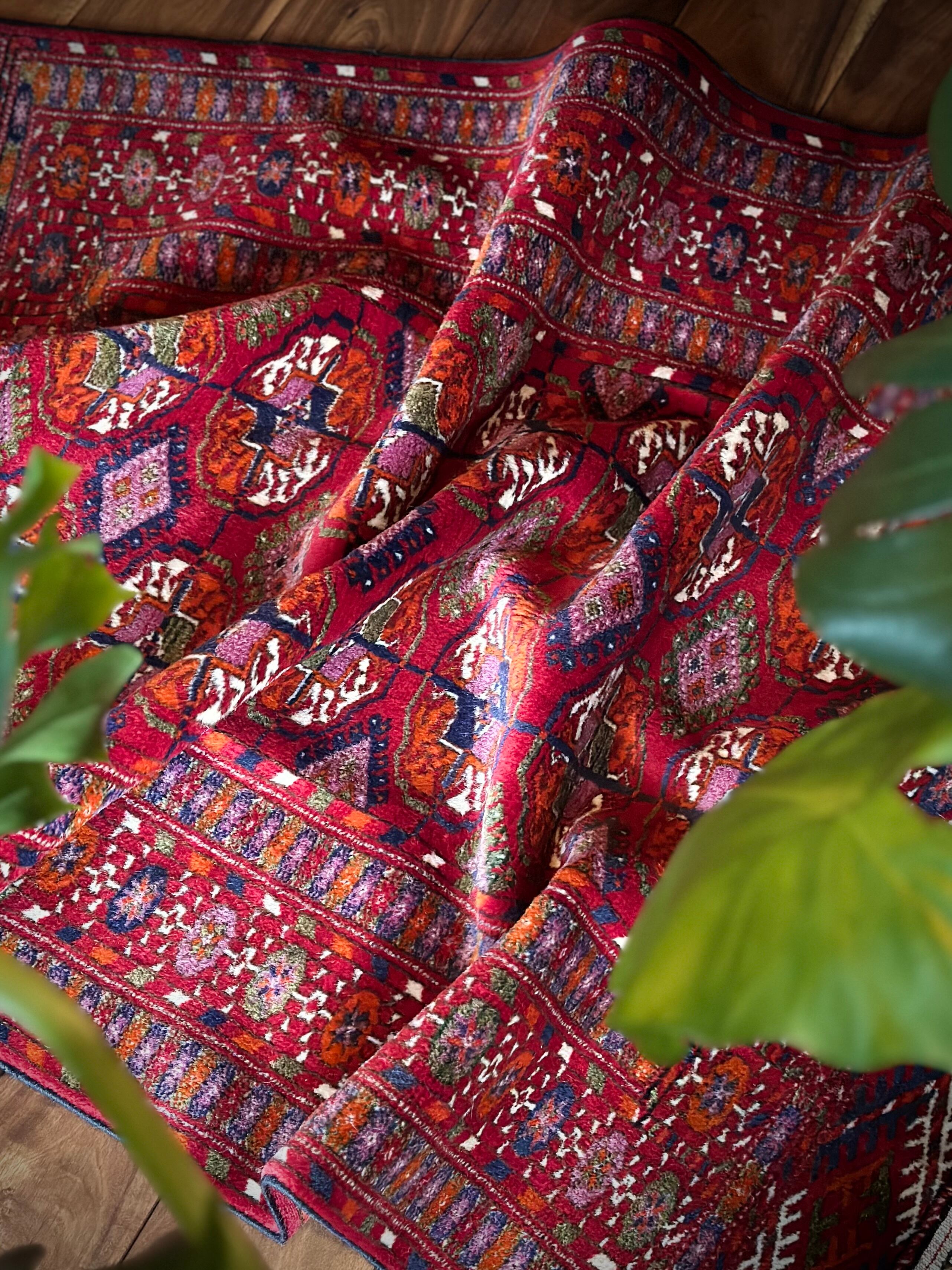イランやアフガニスタンに住むトルクメンのラグとは趣が違うこちらは、由緒あるテッケ族の家紋が記されたブハラ柄と呼ばれる1枚で、薄手ながらも編み目の細かさが際立つ非常に柔らかな質感となり、短めのパイルでしっとりとした手触りのラグになります。