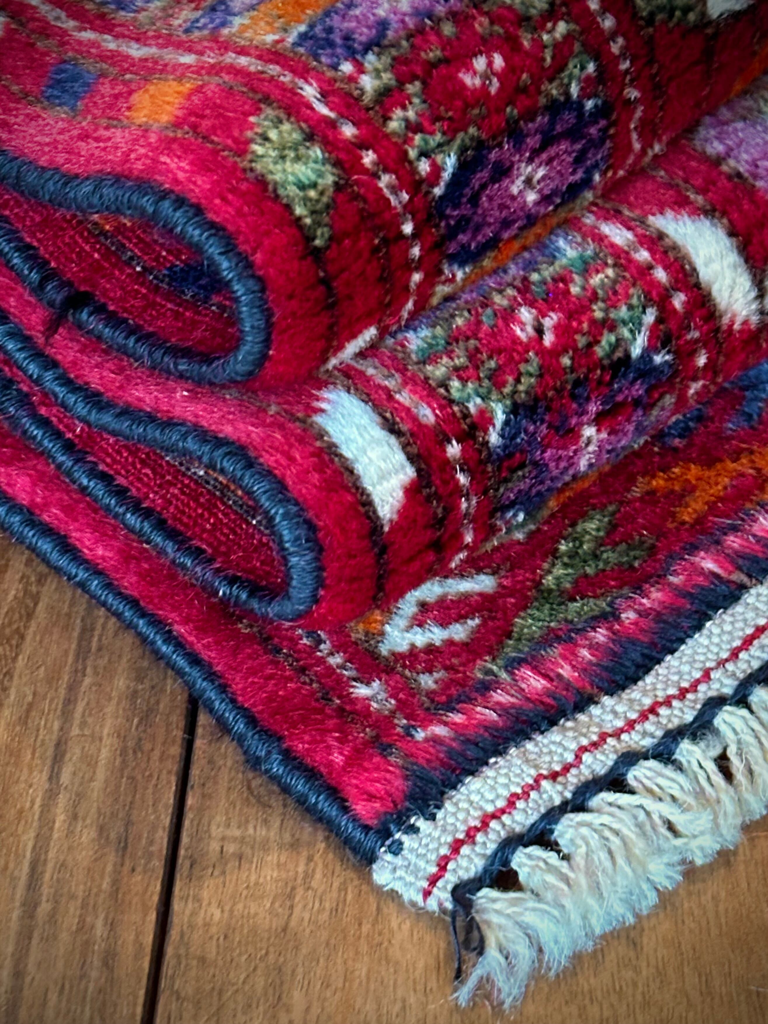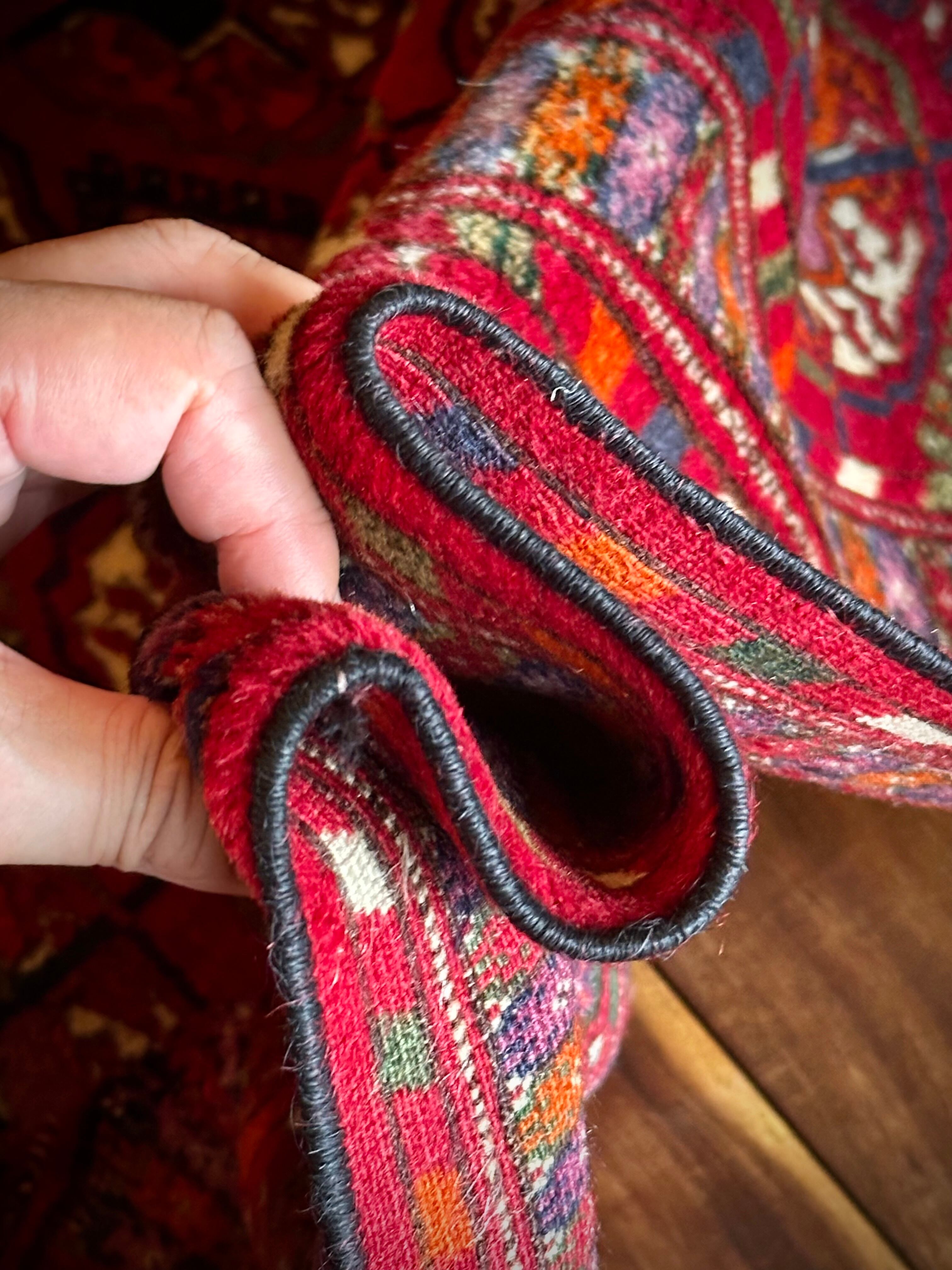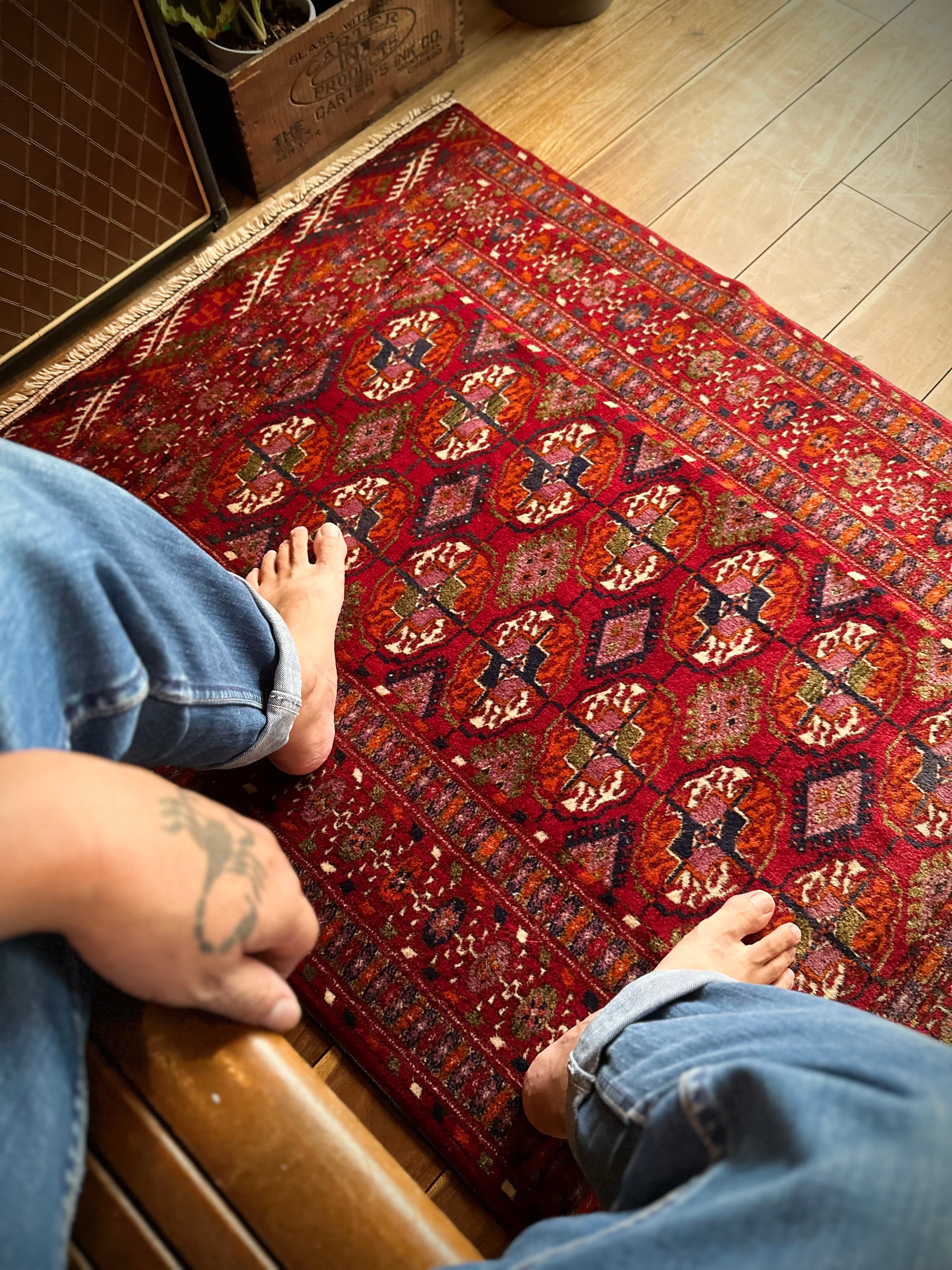 最後にラグそのものに関しては羊毛特有の匂いがあり、採寸は中央付近で計測していますが、手織りならではの歪みによる誤差や水洗いクリーニングによる縮み、また草木染めによる経年劣化の色ムラなどがありますが、それもまたヴィンテージラグの魅力かとご理解ください。