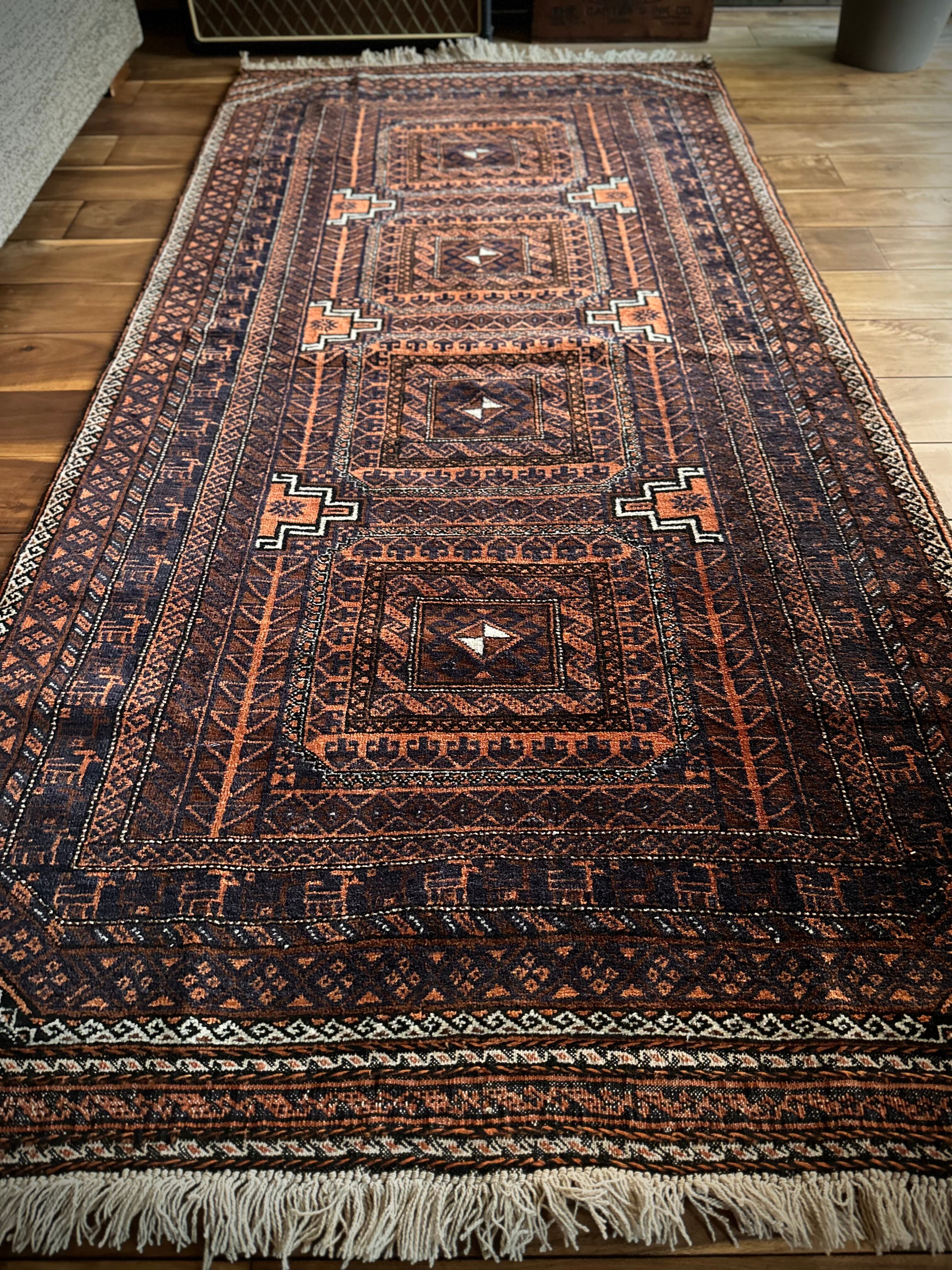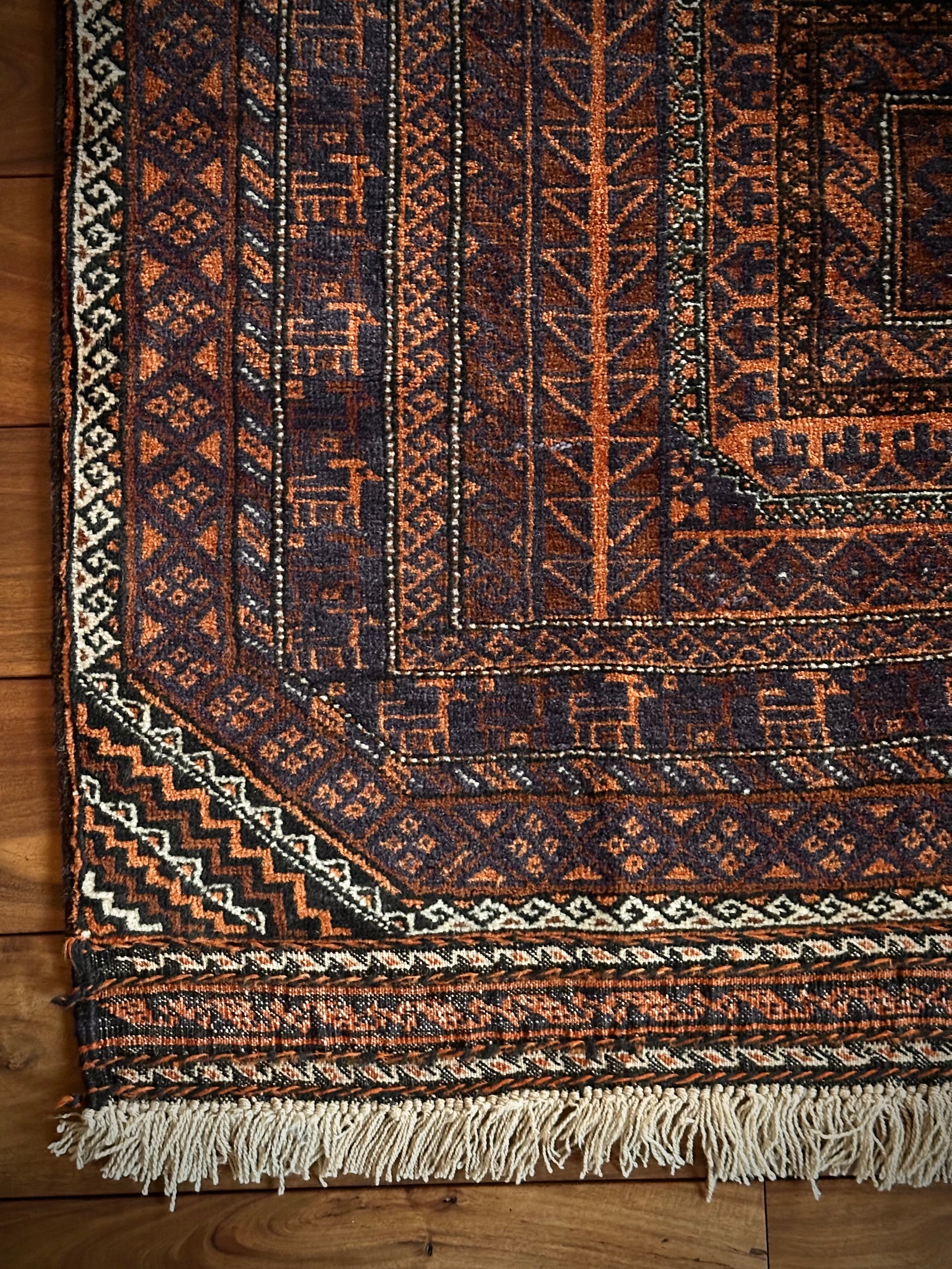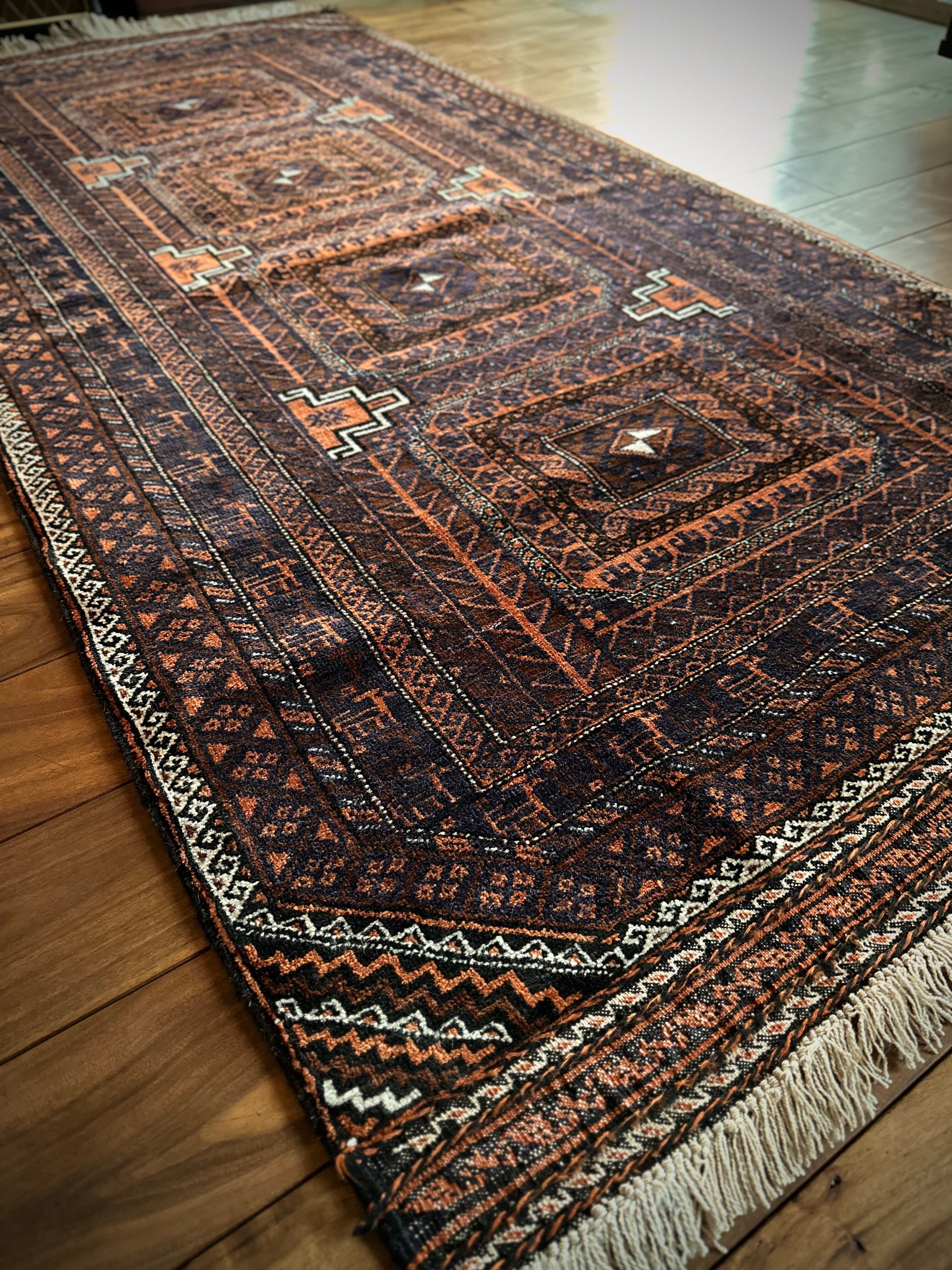 ブラウンをベースにレンガ色のテラコッタとブラックでシックにまとめられた色合いがかっこよく、4蓮メダリオンを取り囲むように緻密に描かれた紋様が素晴らしい、イラン東部に居住するバルーチ族によるかなり古いトライバルラグになります。