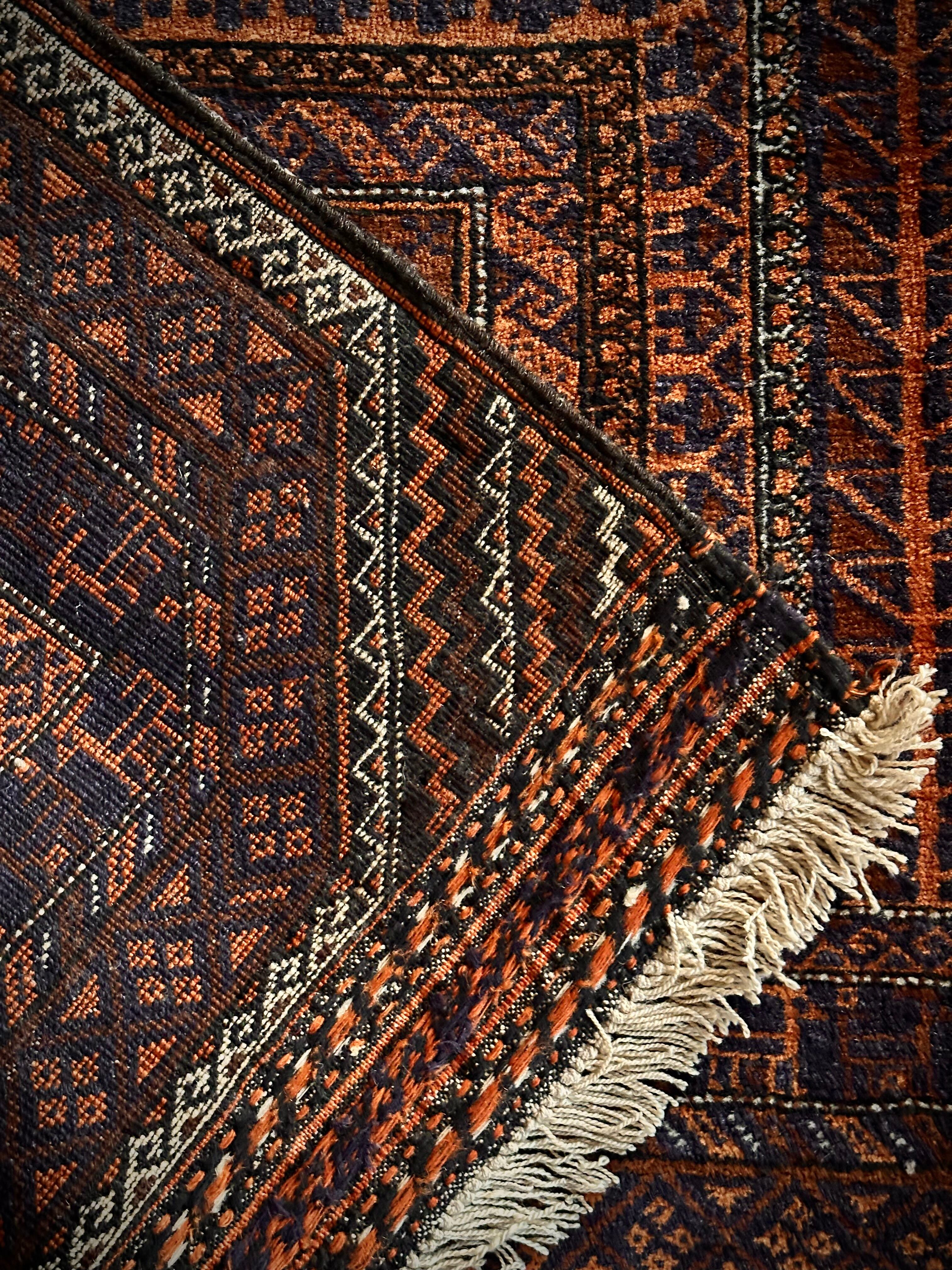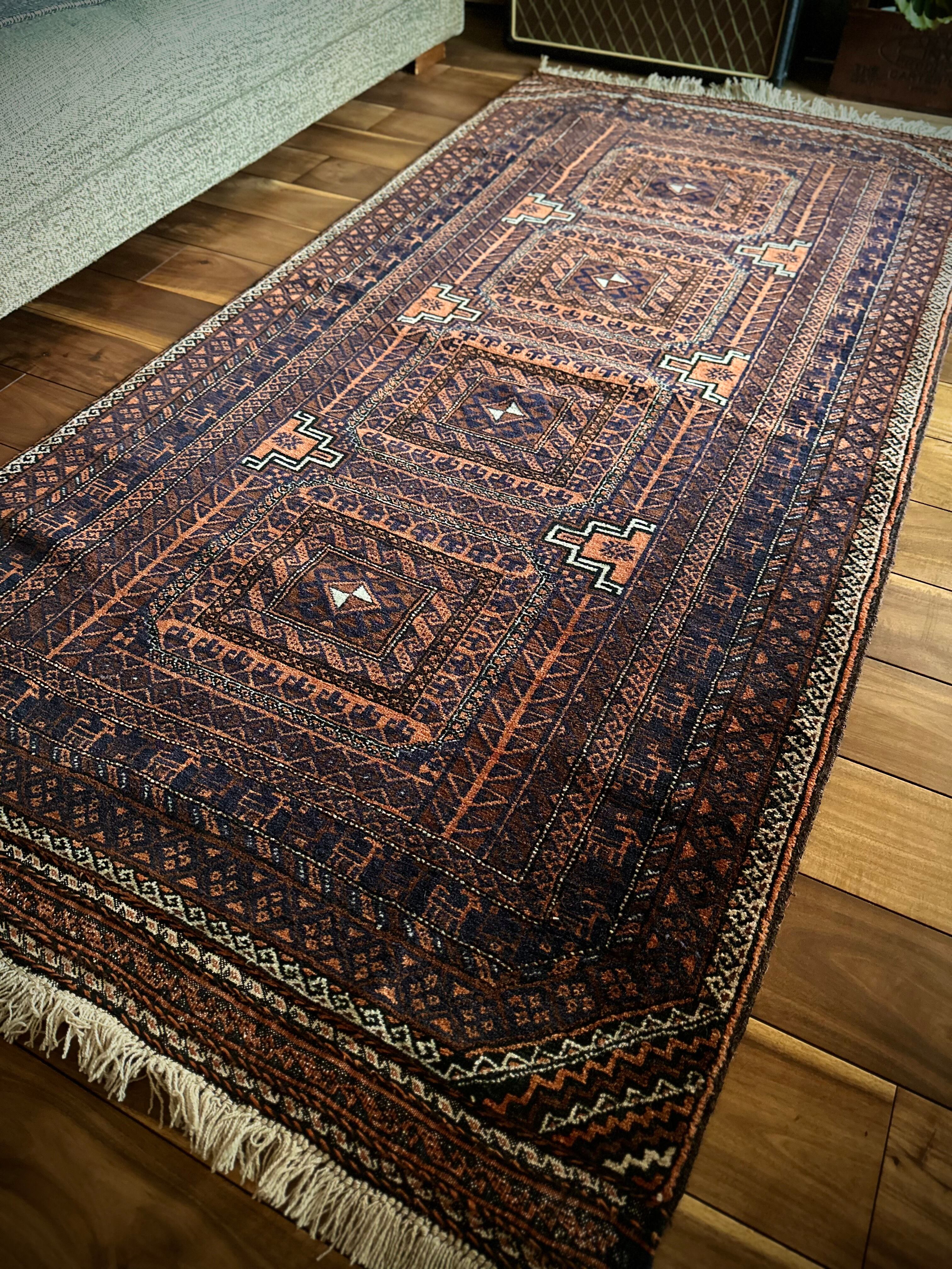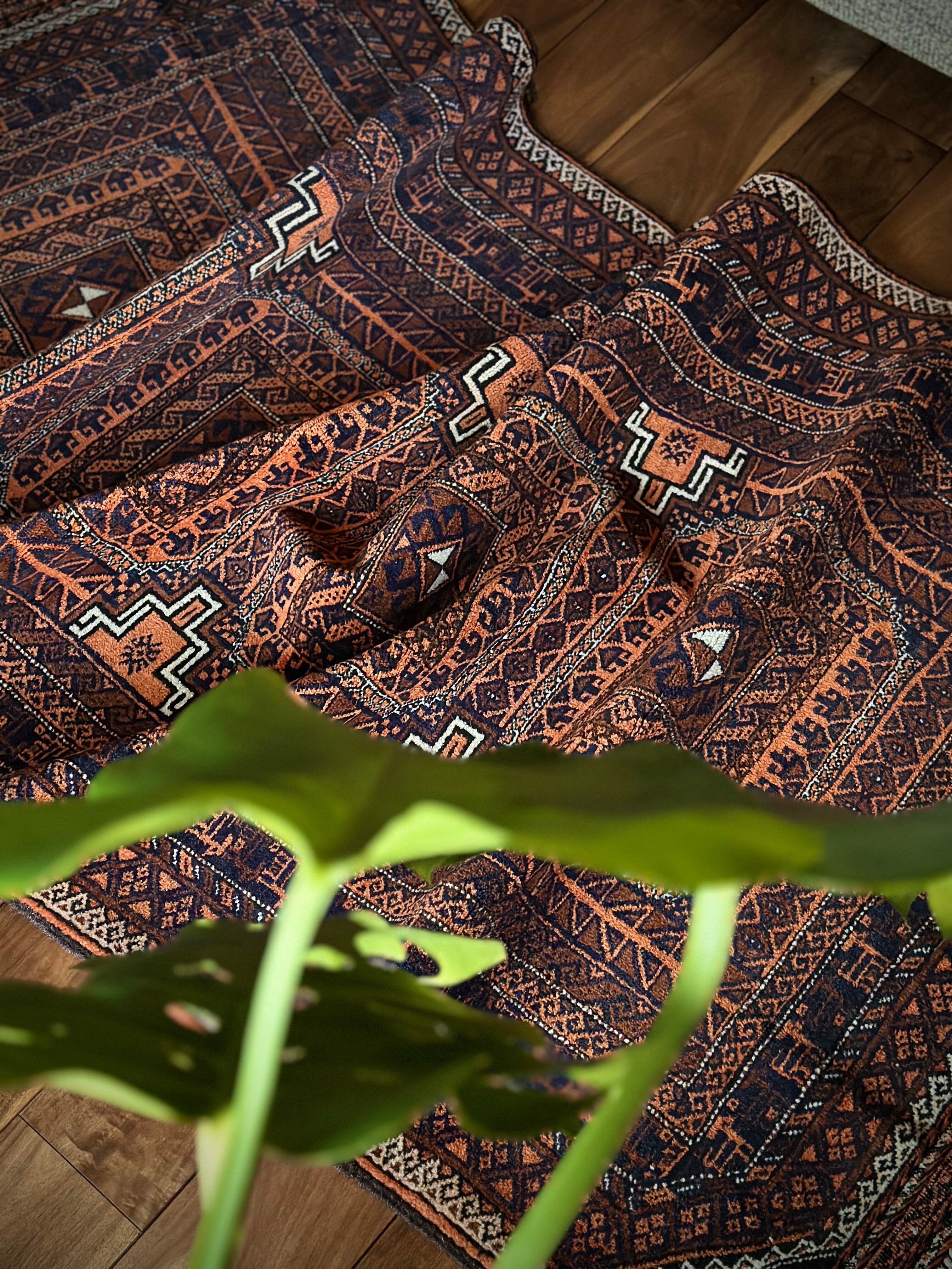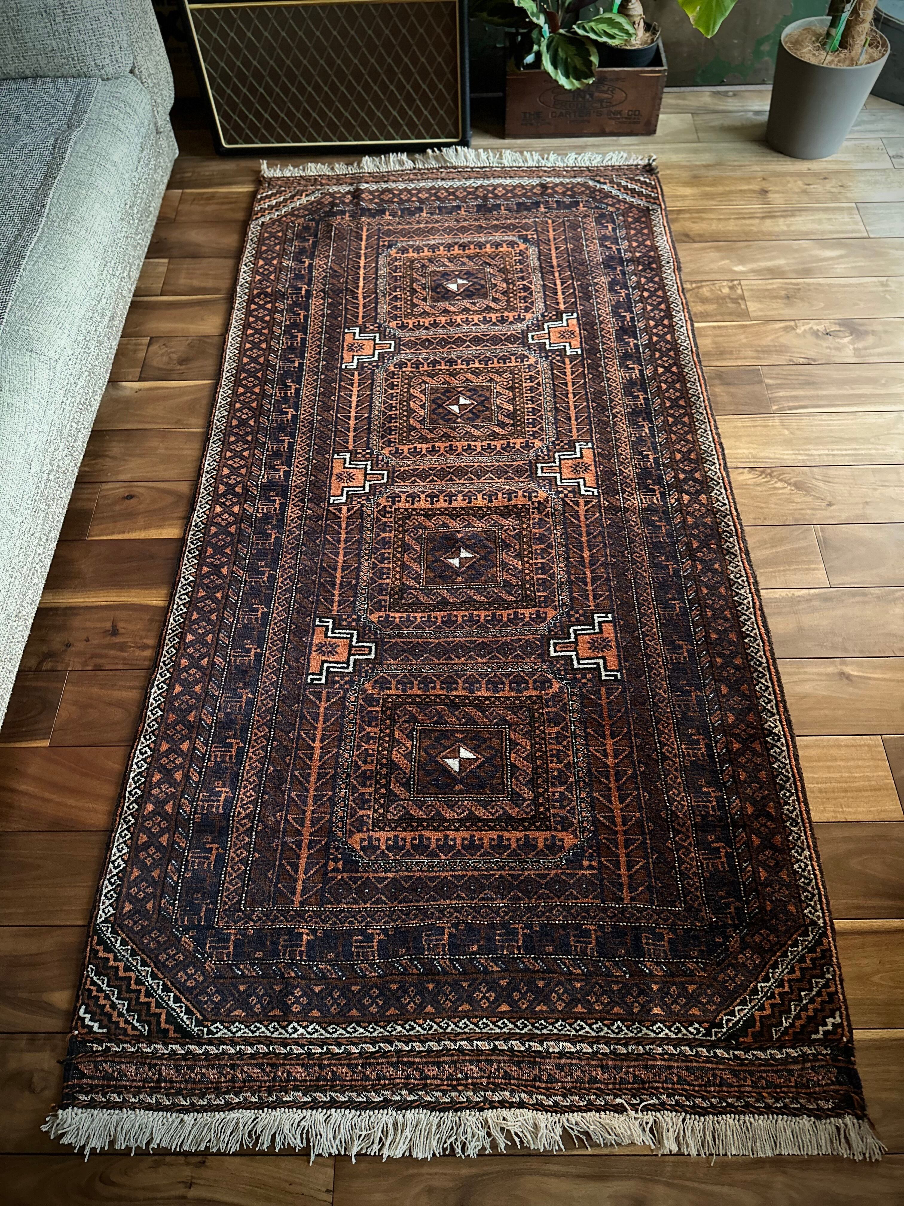 経年としては今まで扱ったなかでは一番古い85年のセミアンティーク品となりますが、目立つ経年劣化もなく、気になるダメージにリペア箇所は見当たらないグッドコンディションで、大きさ的にはバルーチ特有の細長さがベッドサイドやチェスト前にしっくりなサイズ感になりますが、個人的には壁に掛けてもかっこいい1枚と言えます。