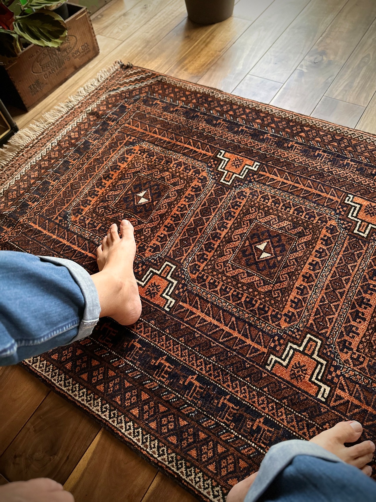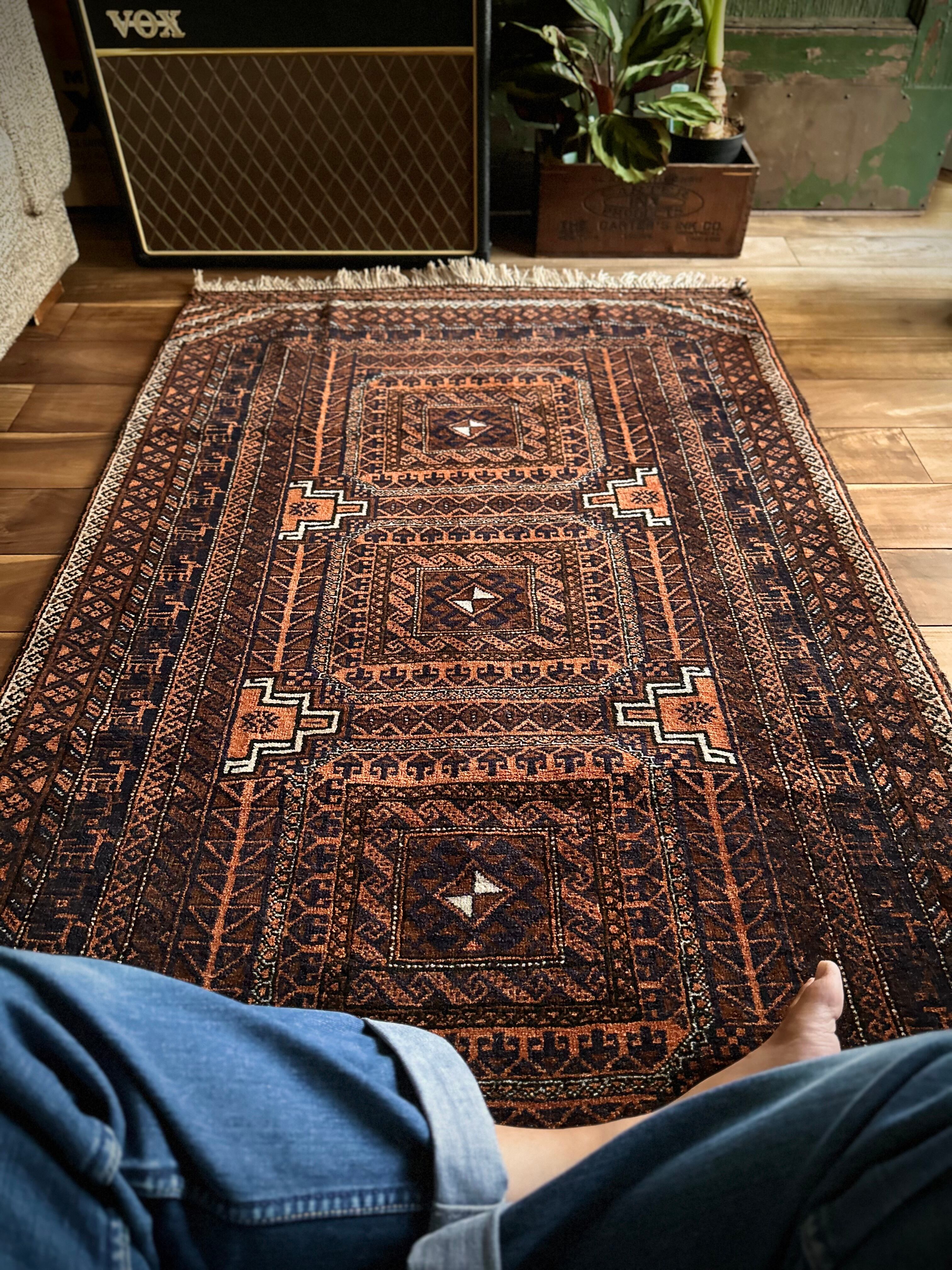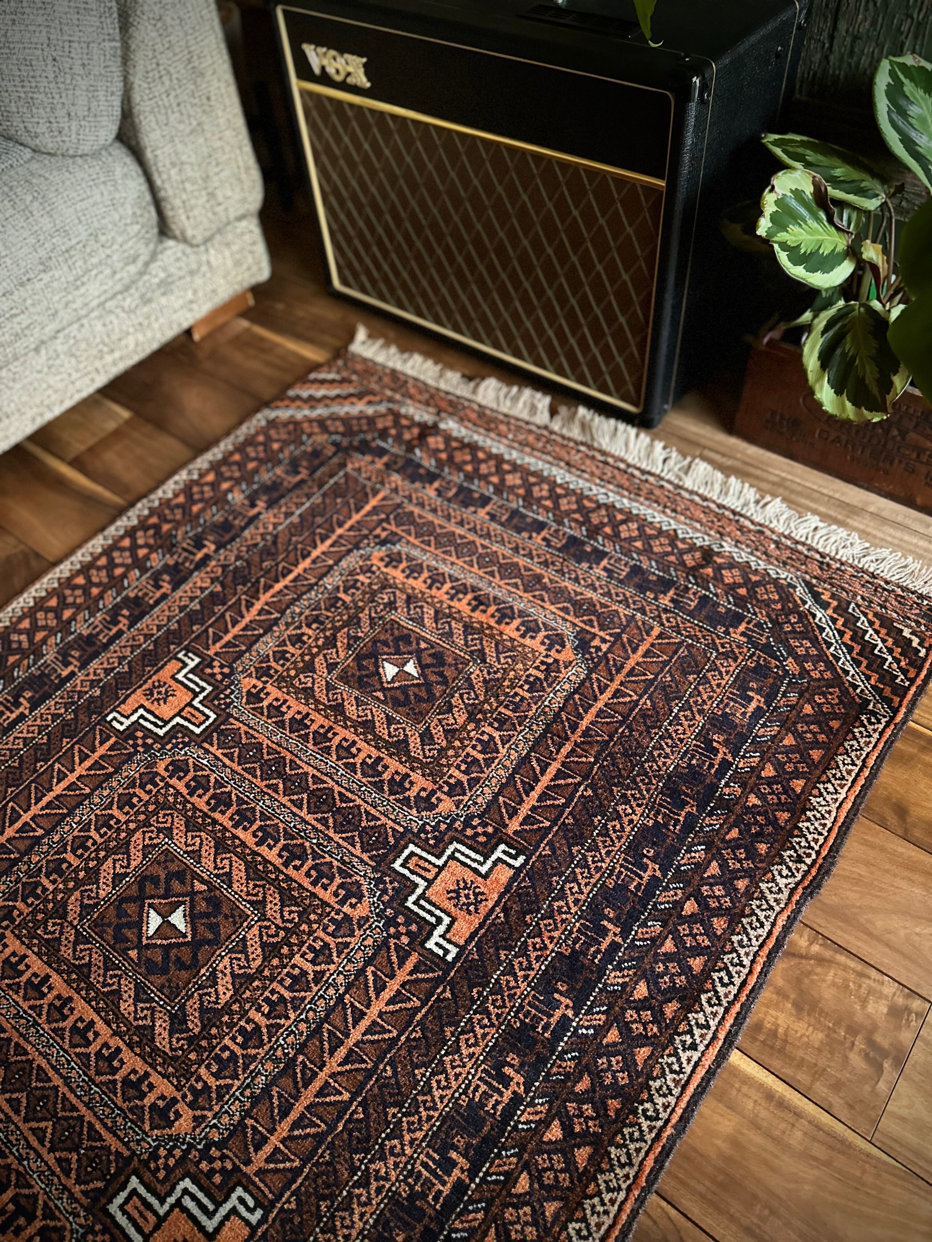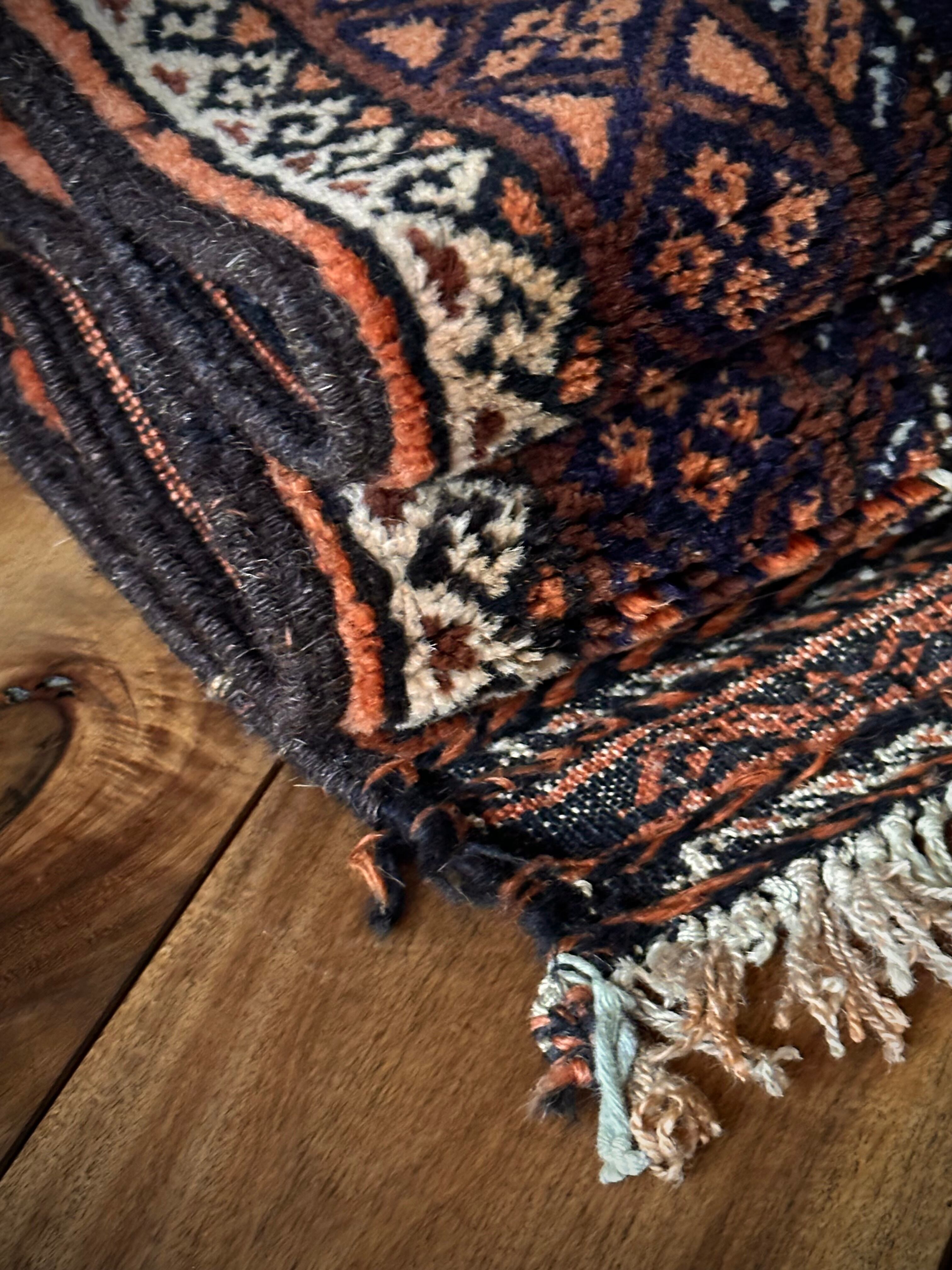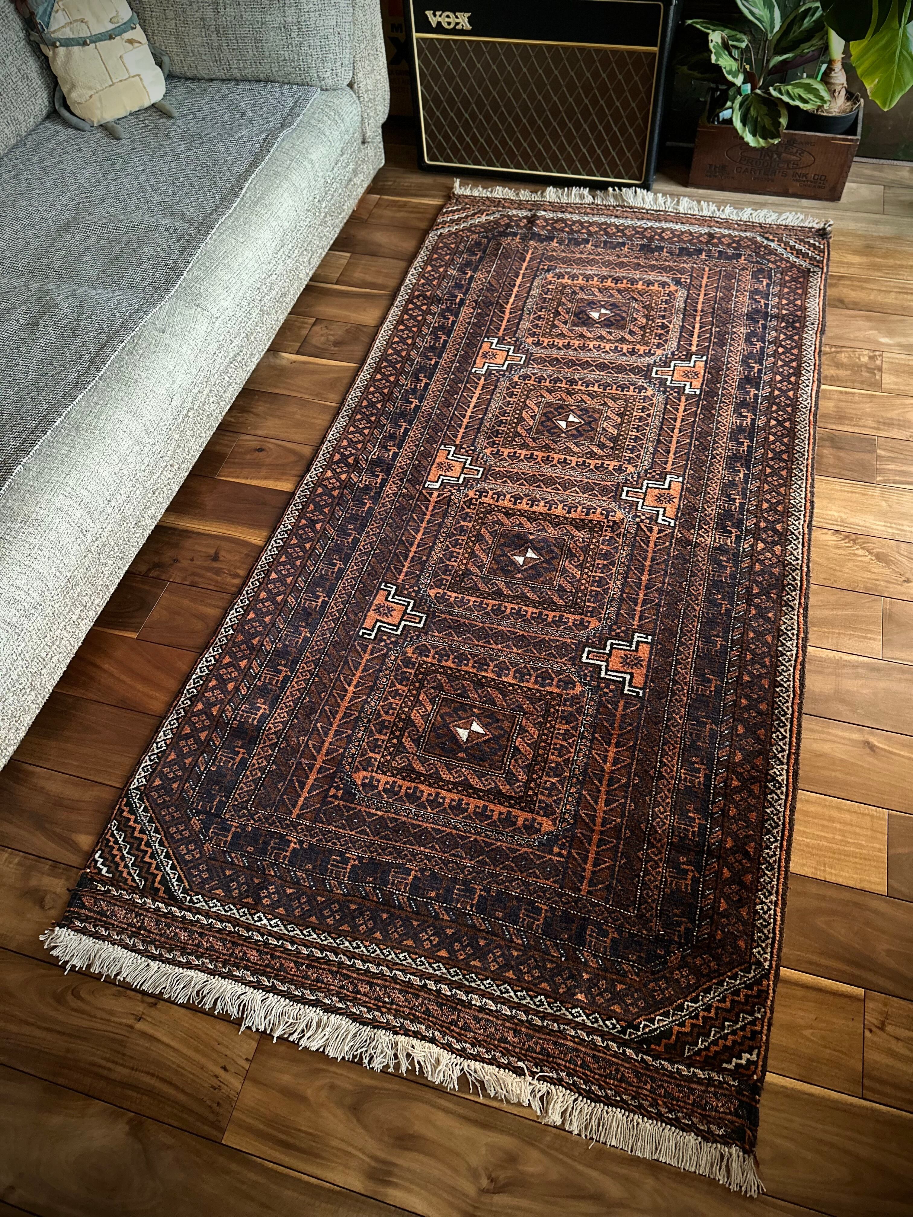 経年としては今まで扱ったなかでは一番古い85年のセミアンティーク品となりますが、目立つ経年劣化もなく、気になるダメージにリペア箇所は見当たらないグッドコンディションで、大きさ的にはバルーチ特有の細長さがベッドサイドやチェスト前にしっくりなサイズ感になりますが、個人的には壁に掛けてもかっこいい1枚と言えます。