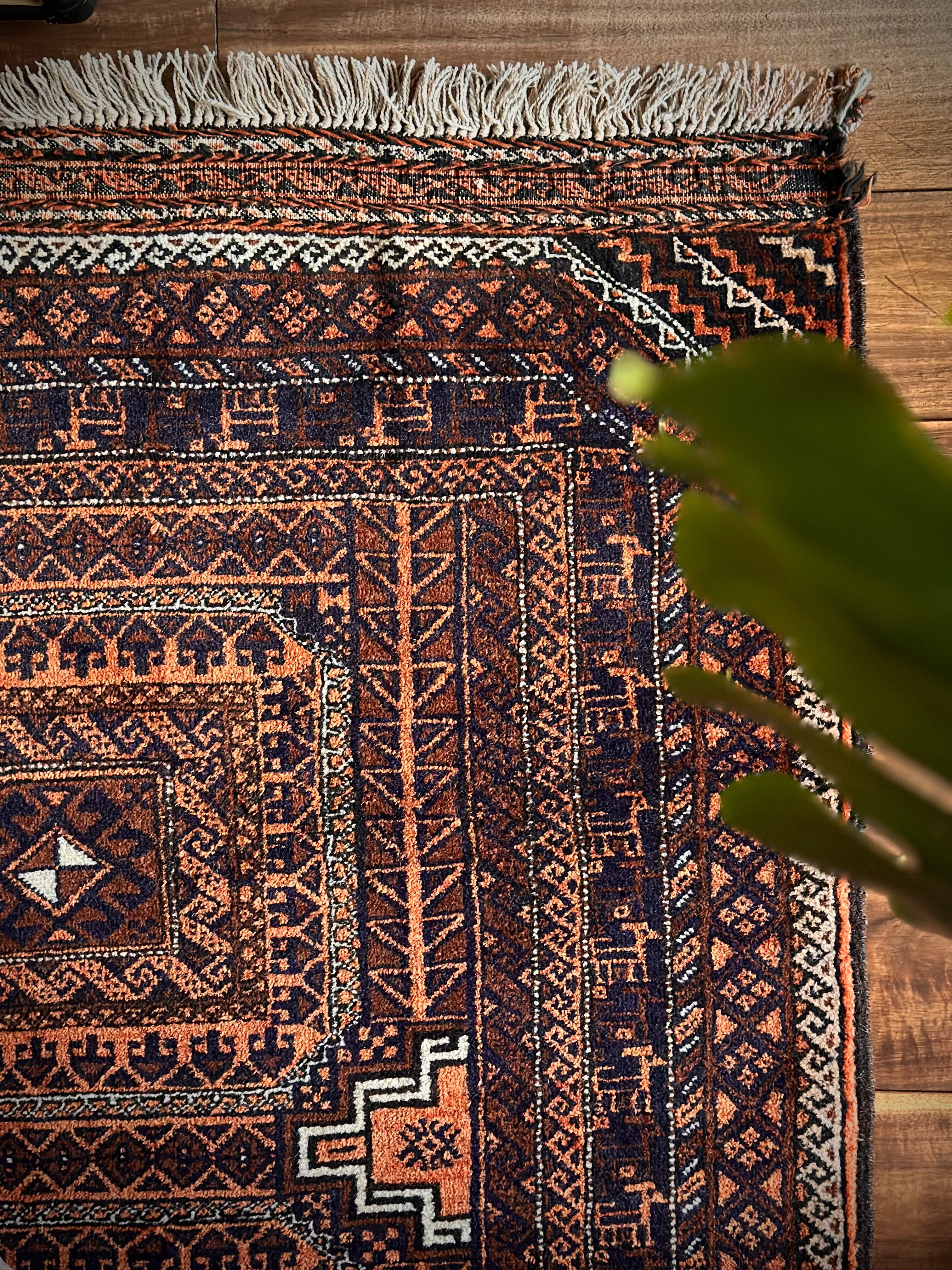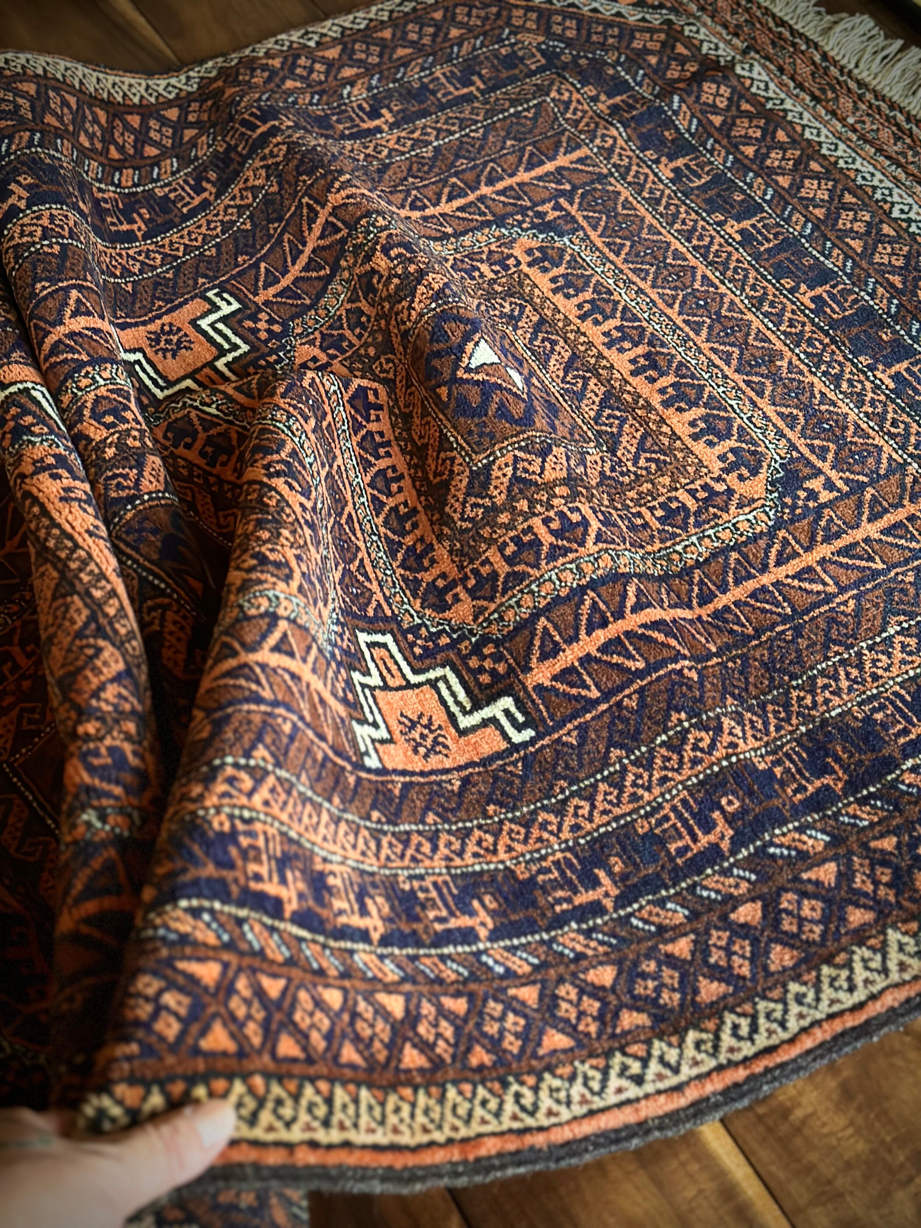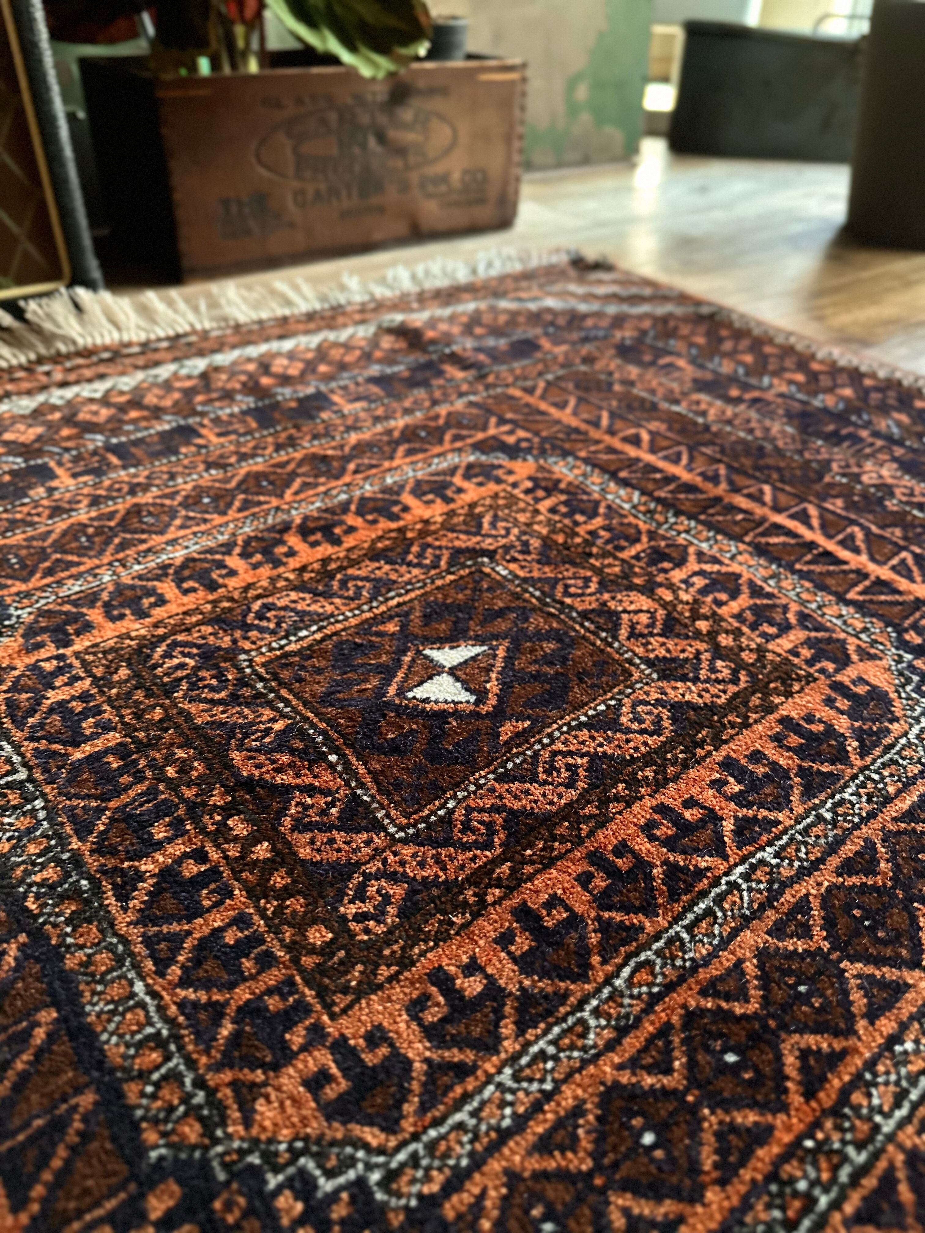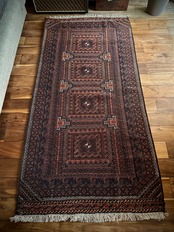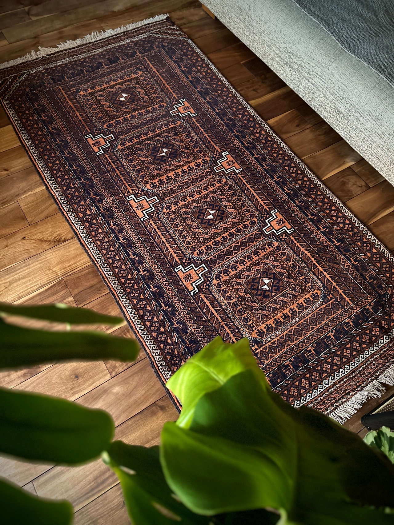 経年としては今まで扱ったなかでは一番古い85年のセミアンティーク品となりますが、目立つ経年劣化もなく、気になるダメージにリペア箇所は見当たらないグッドコンディションで、大きさ的にはバルーチ特有の細長さがベッドサイドやチェスト前にしっくりなサイズ感になりますが、個人的には壁に掛けてもかっこいい1枚と言えます。