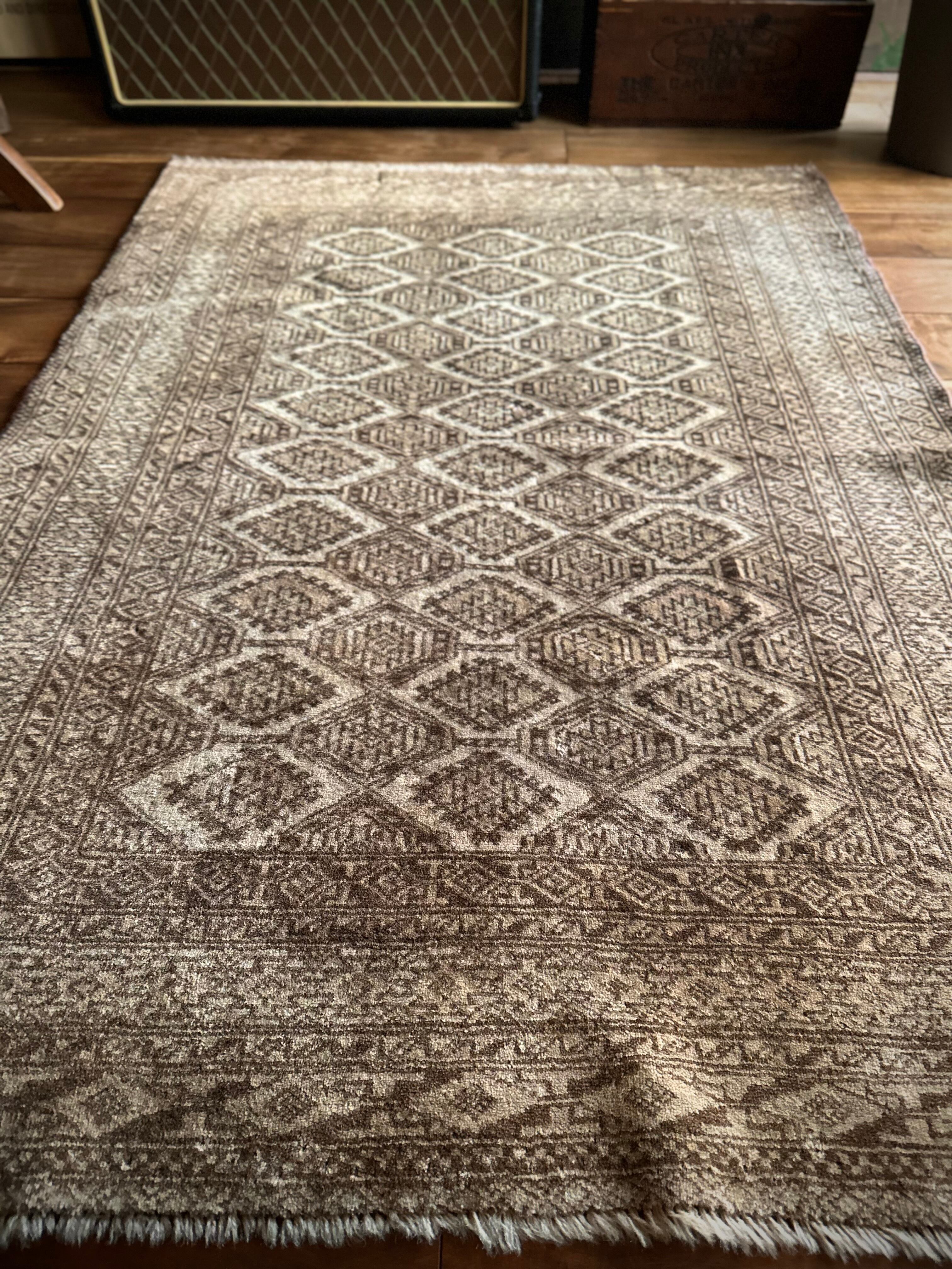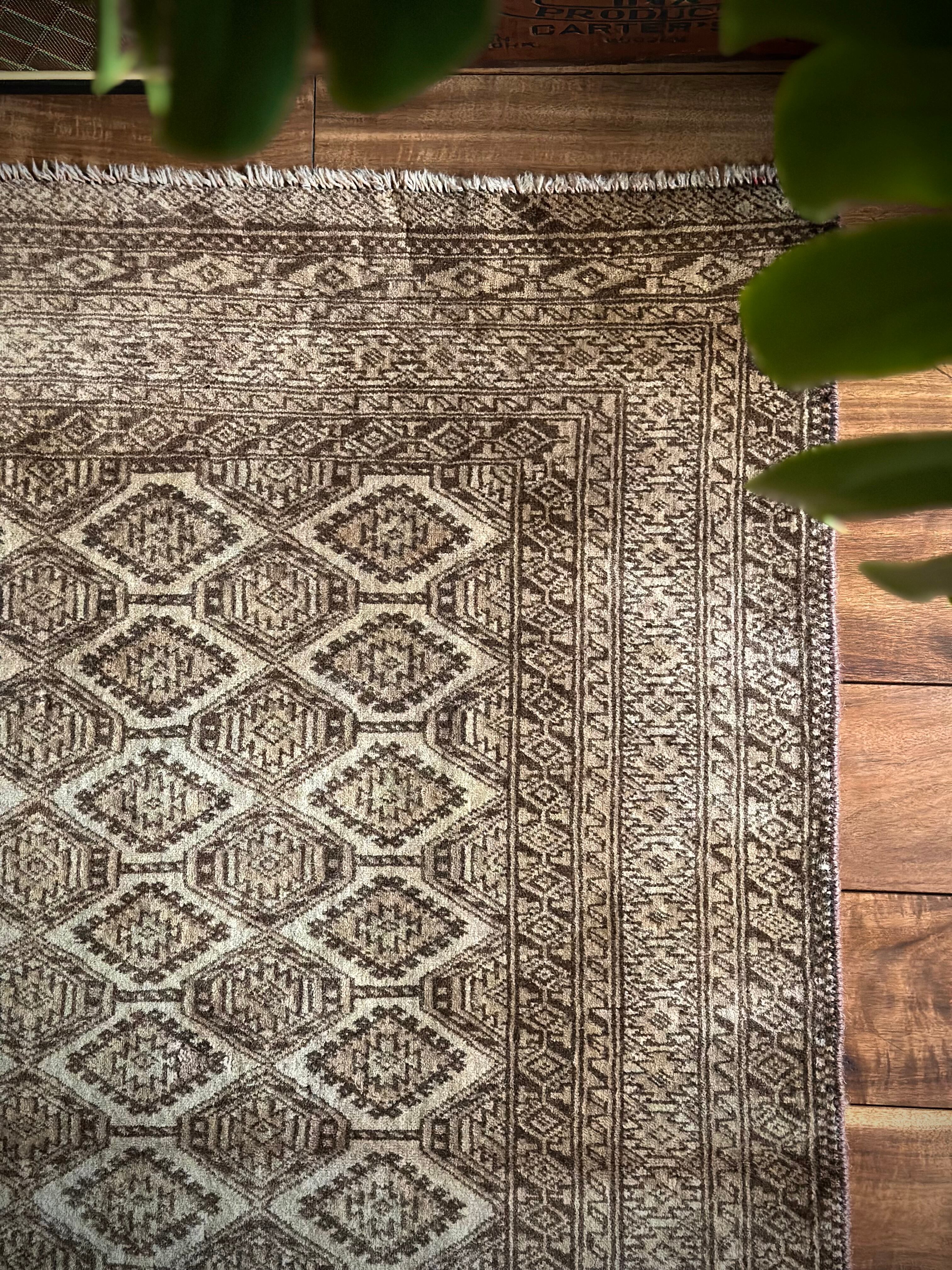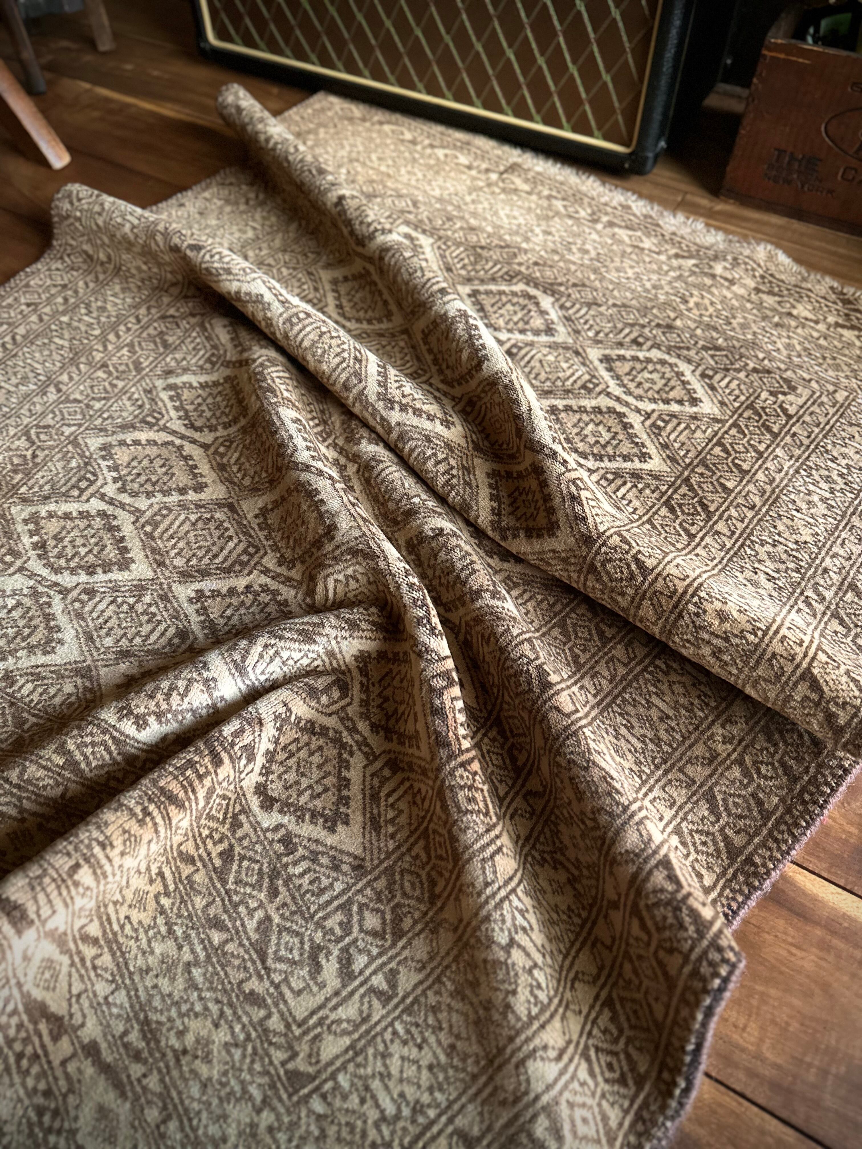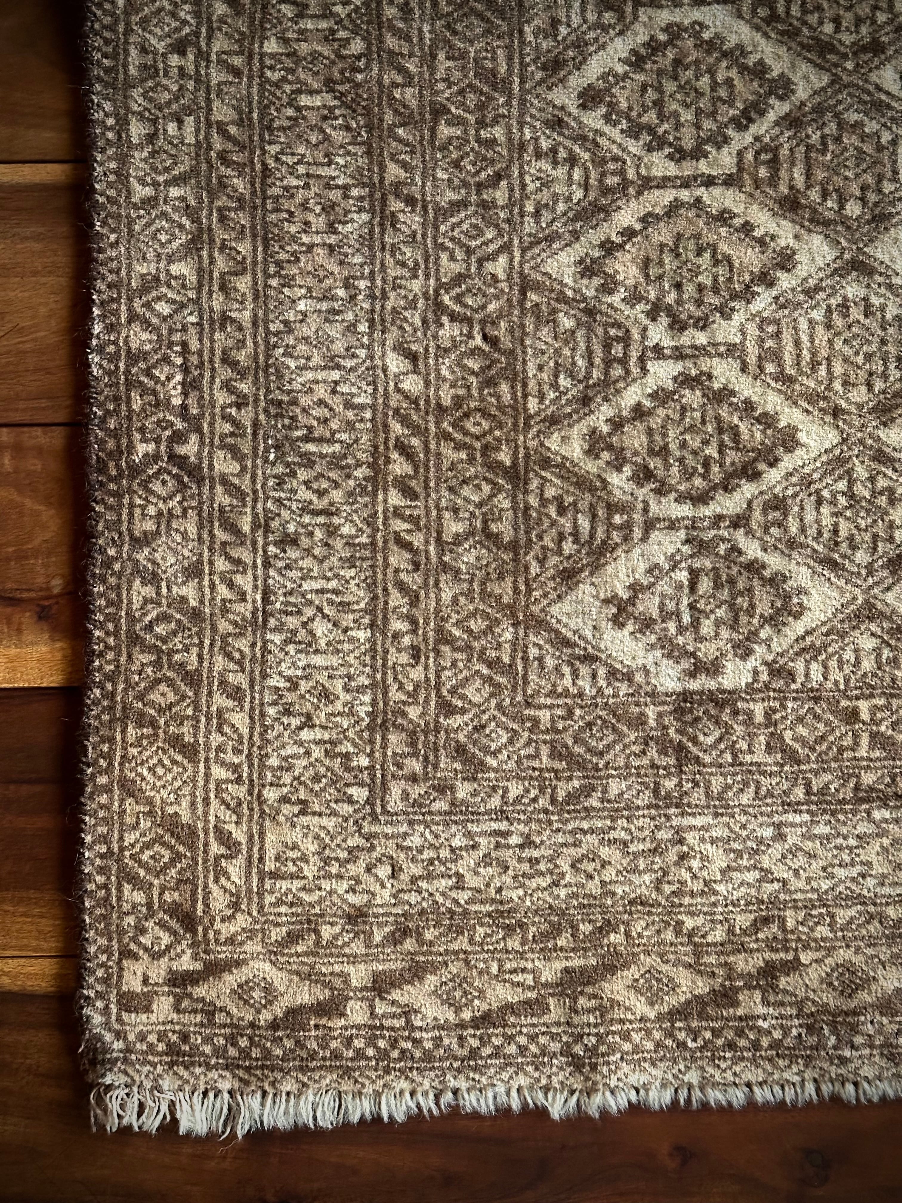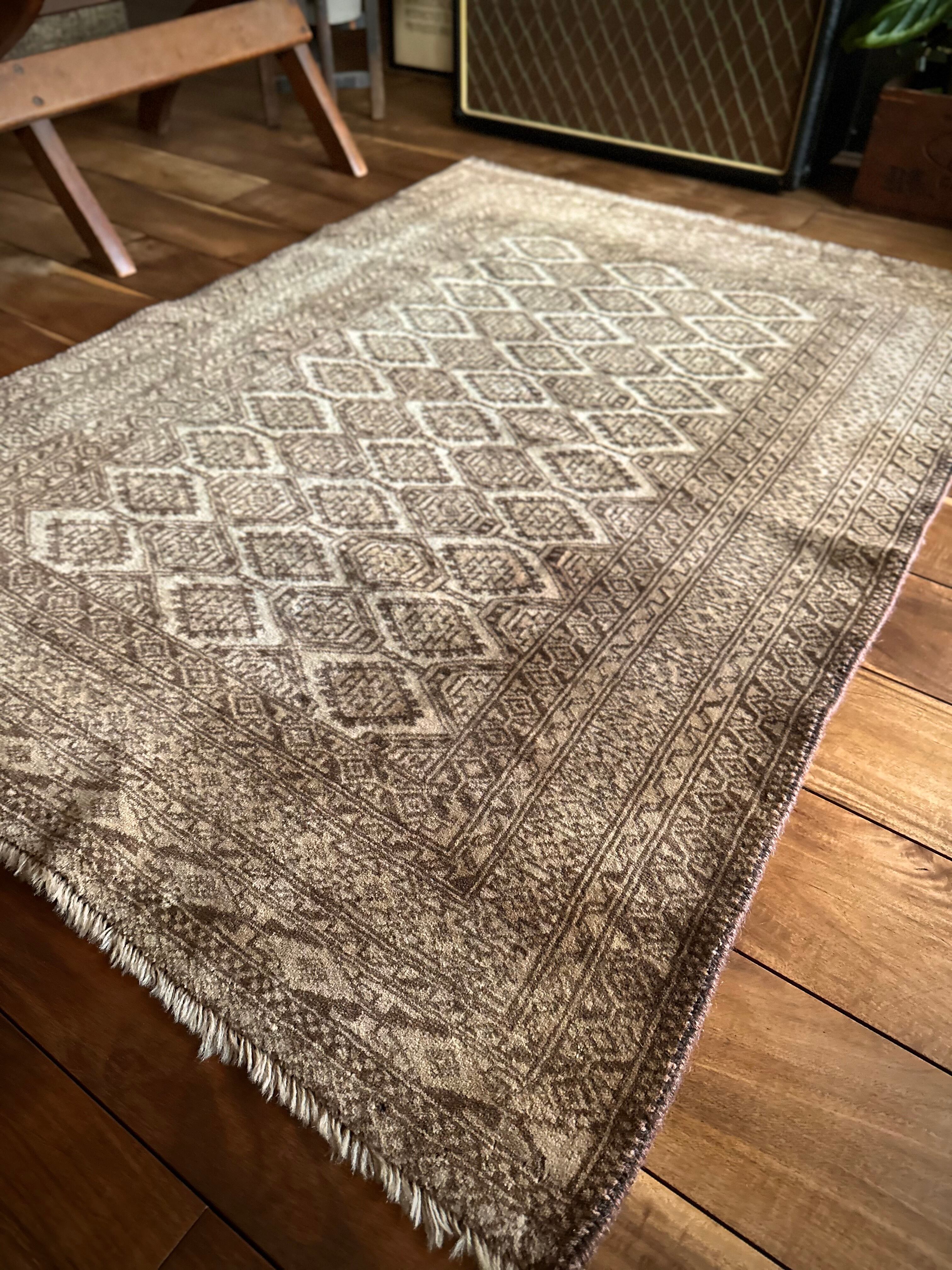 無染色の原毛を使用したアイボリーとカフェブラウンのやさしい色合いに、細かな紋様が織り込まれたこちらは、アフガニスタン北部に居住するトルクメン族のトライバルラグで、薄手で柔らかくしっとりとした肌触りのシンプルかつお上品な1枚になります。