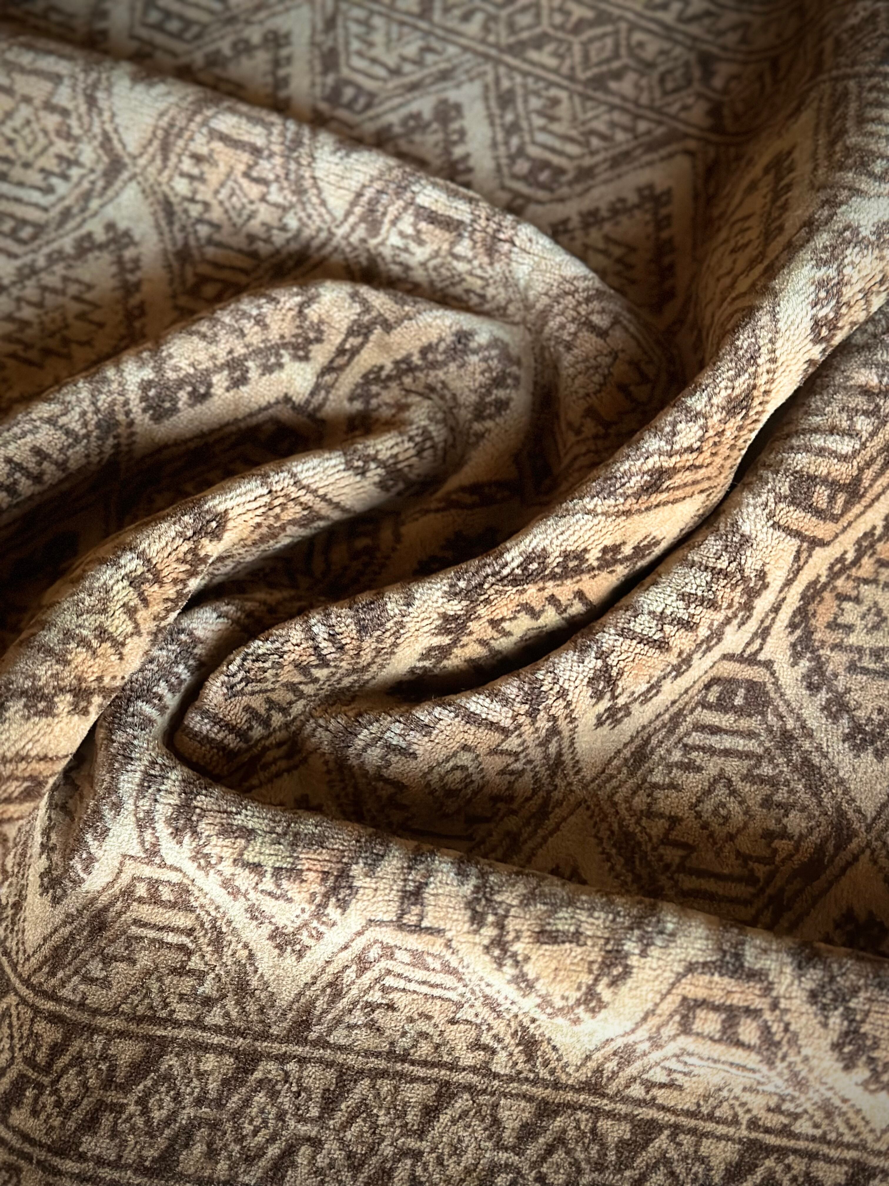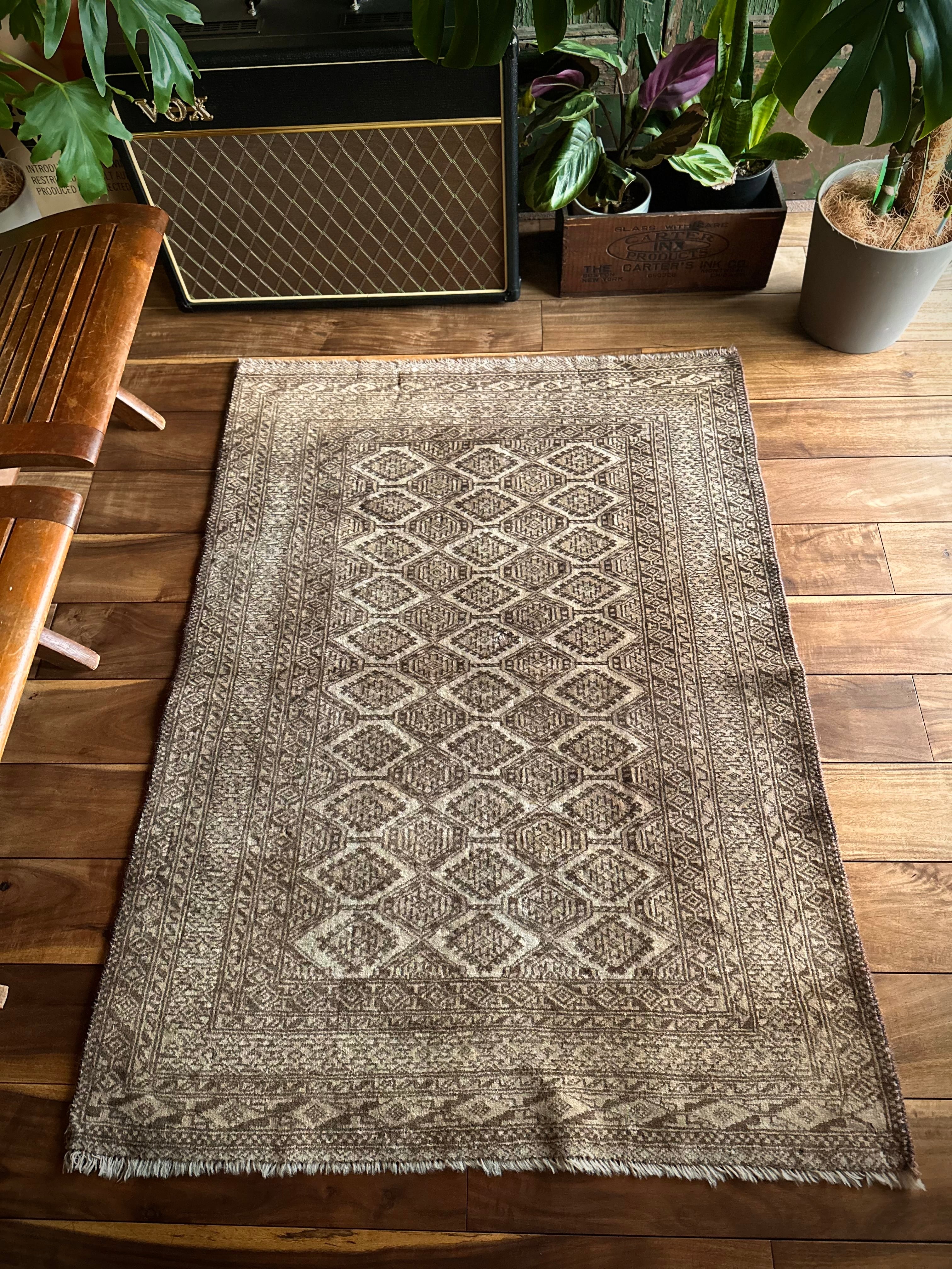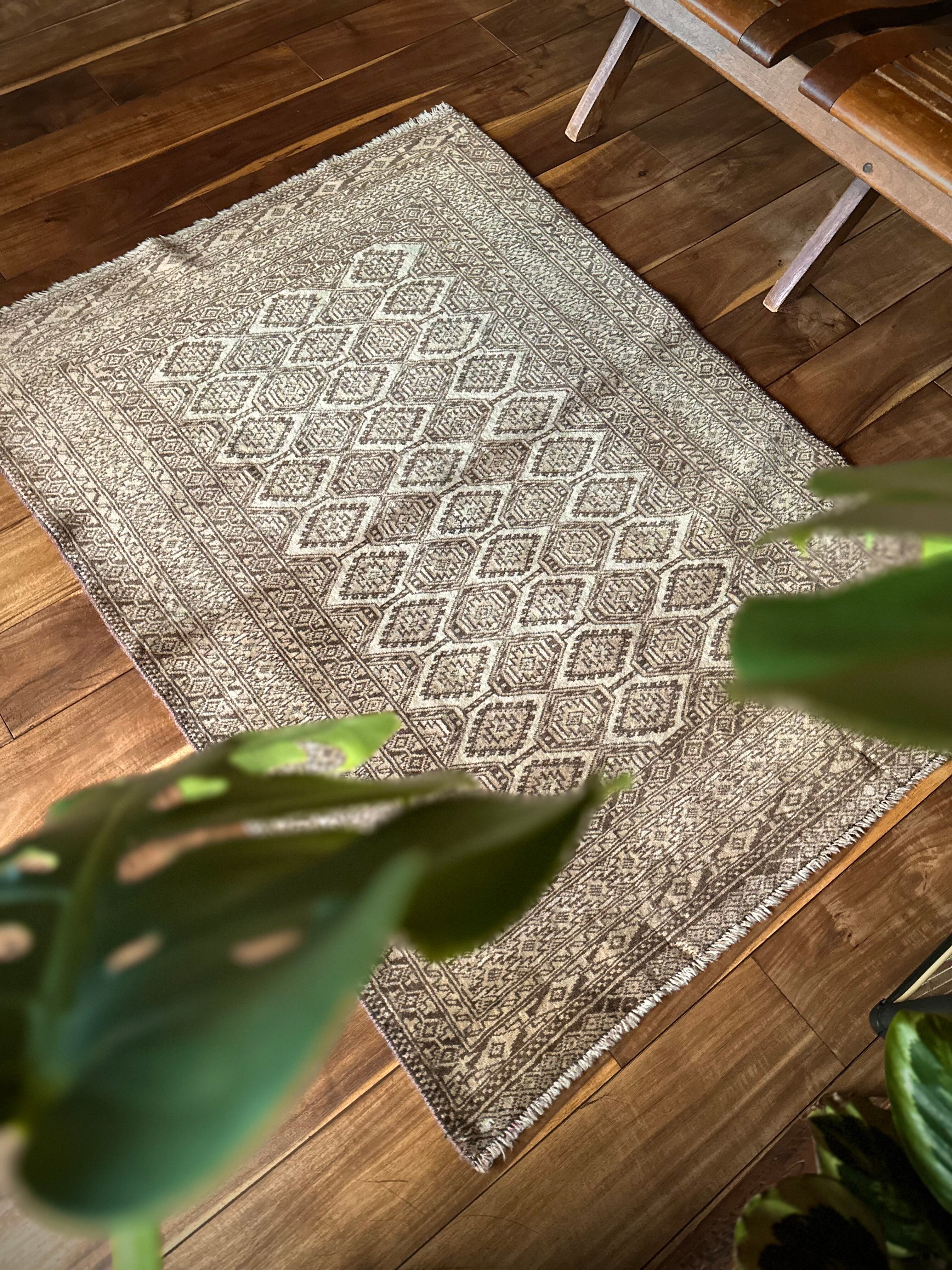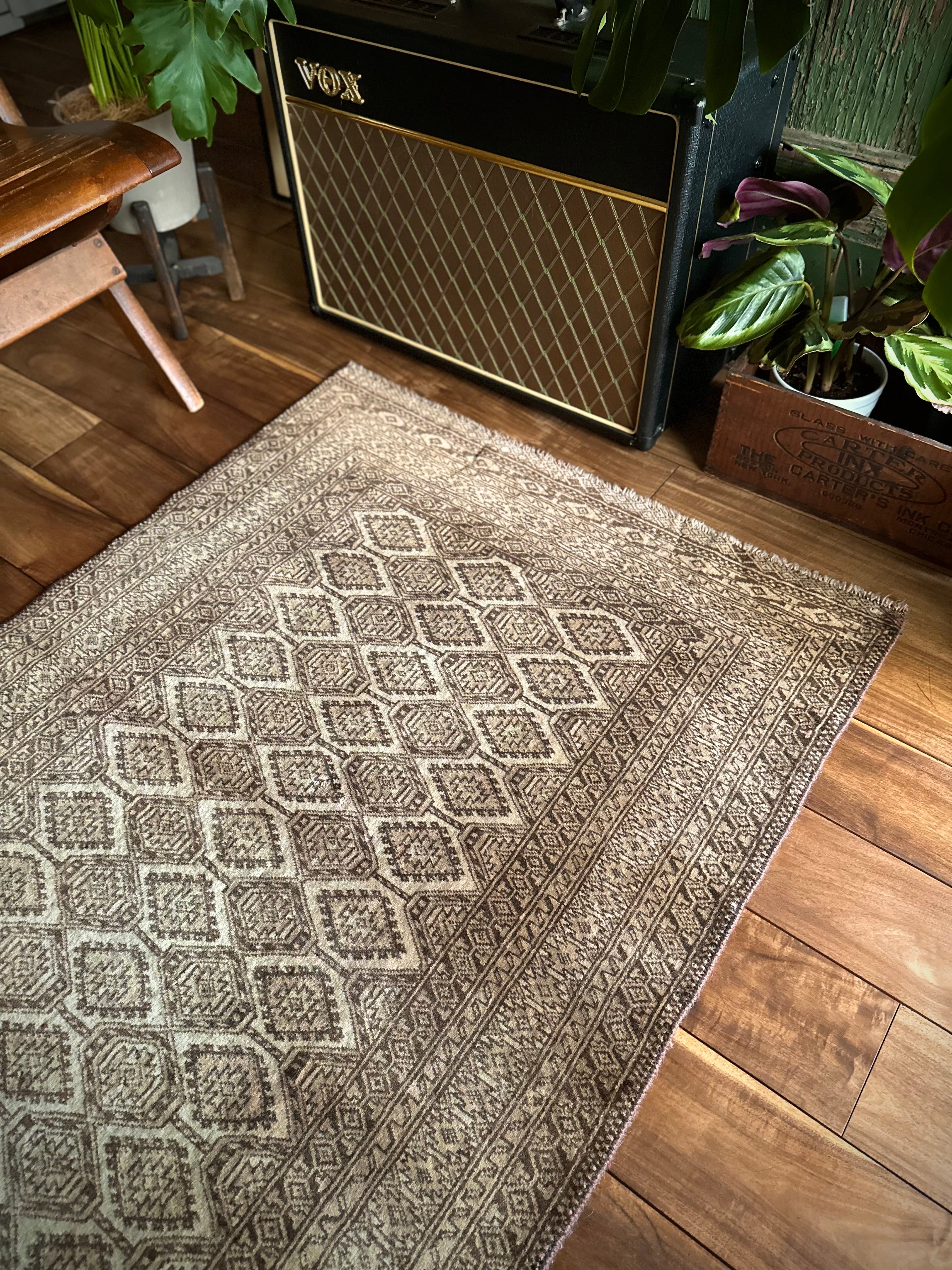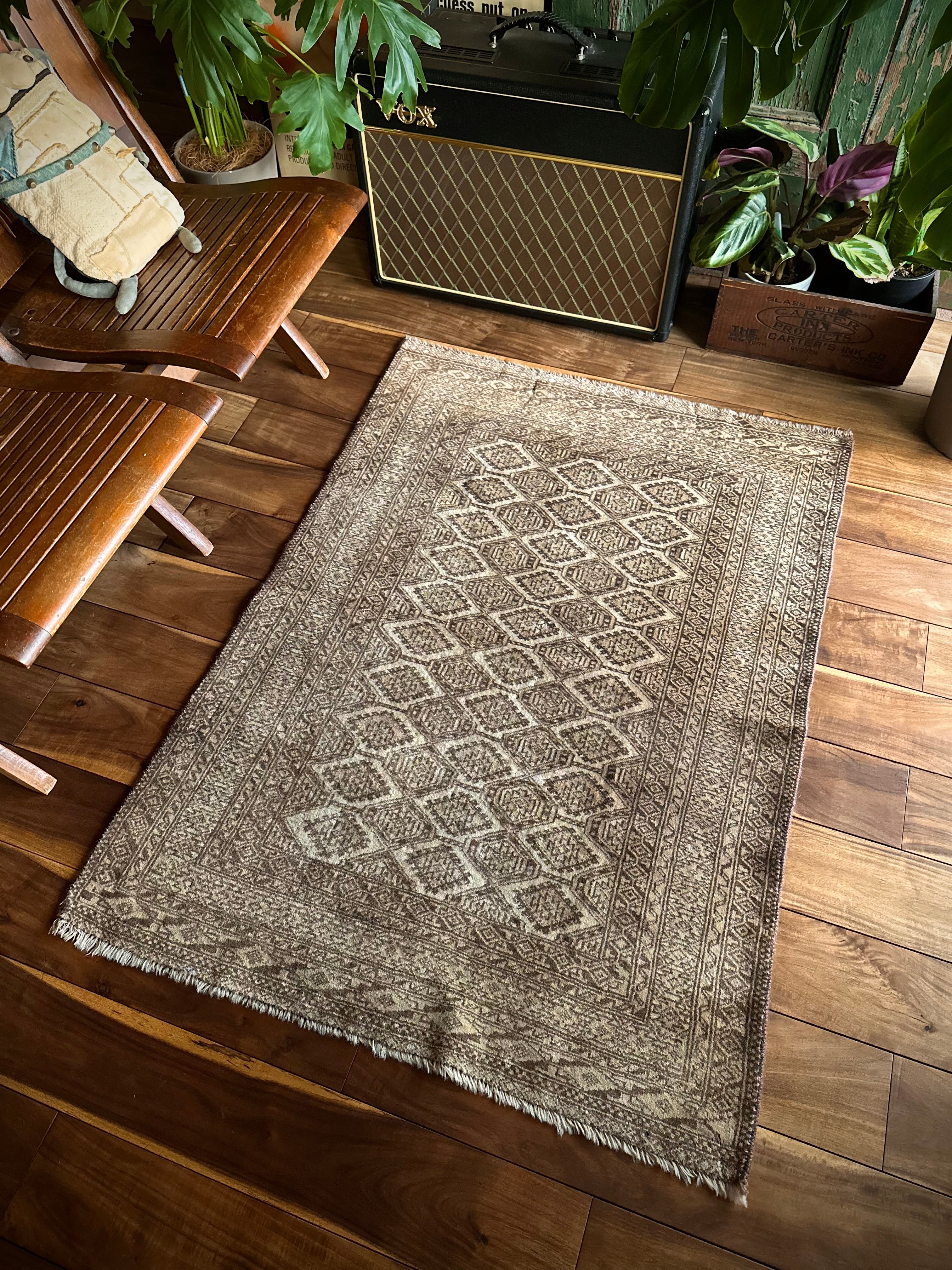 無染色の原毛を使用したアイボリーとカフェブラウンのやさしい色合いに、細かな紋様が織り込まれたこちらは、アフガニスタン北部に居住するトルクメン族のトライバルラグで、薄手で柔らかくしっとりとした肌触りのシンプルかつお上品な1枚になります。