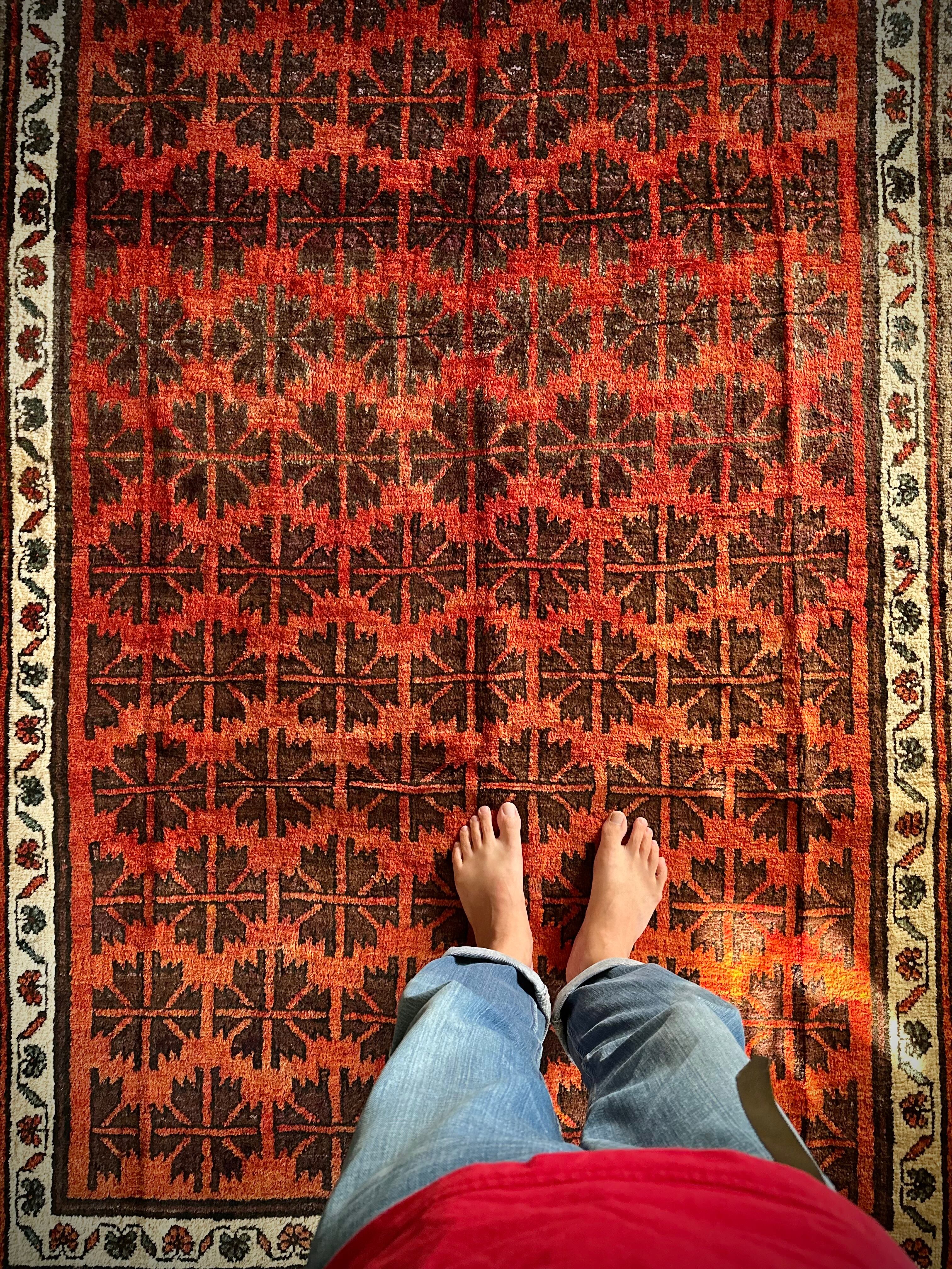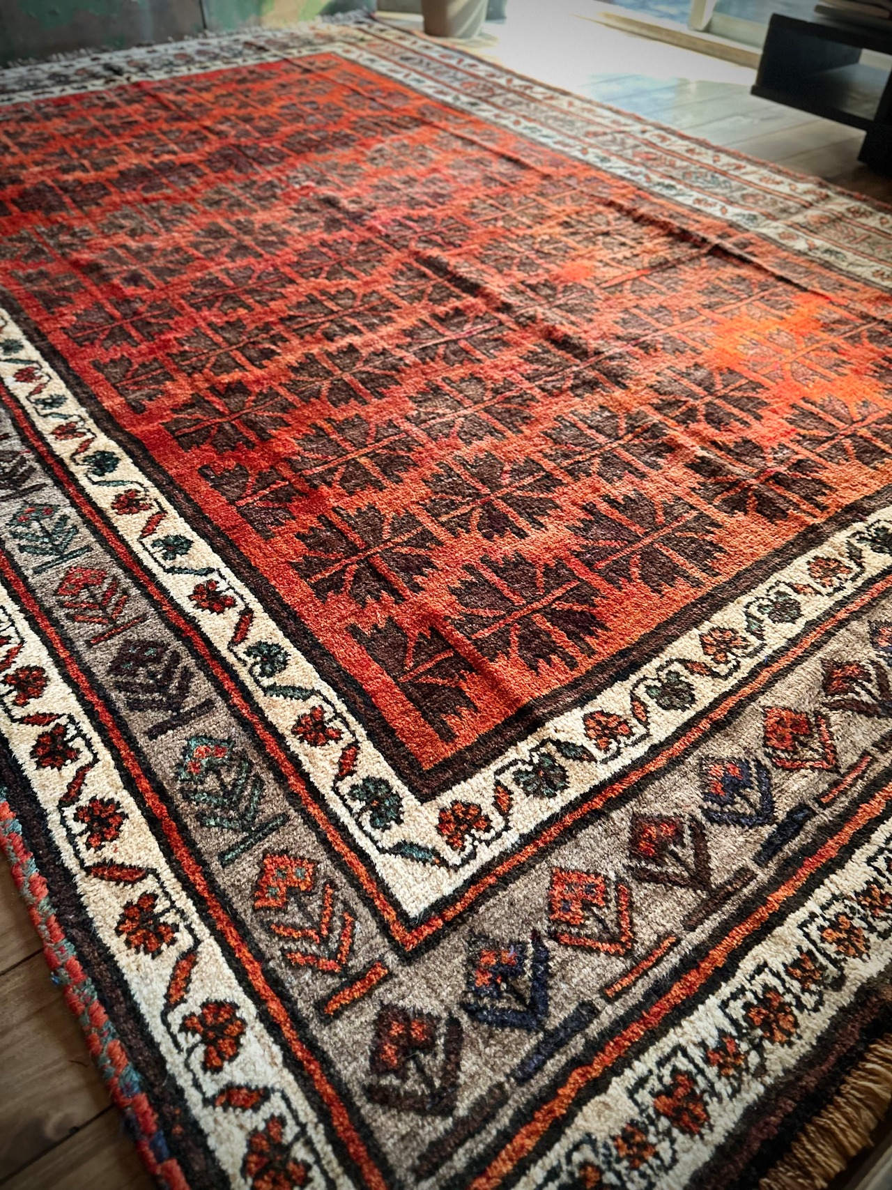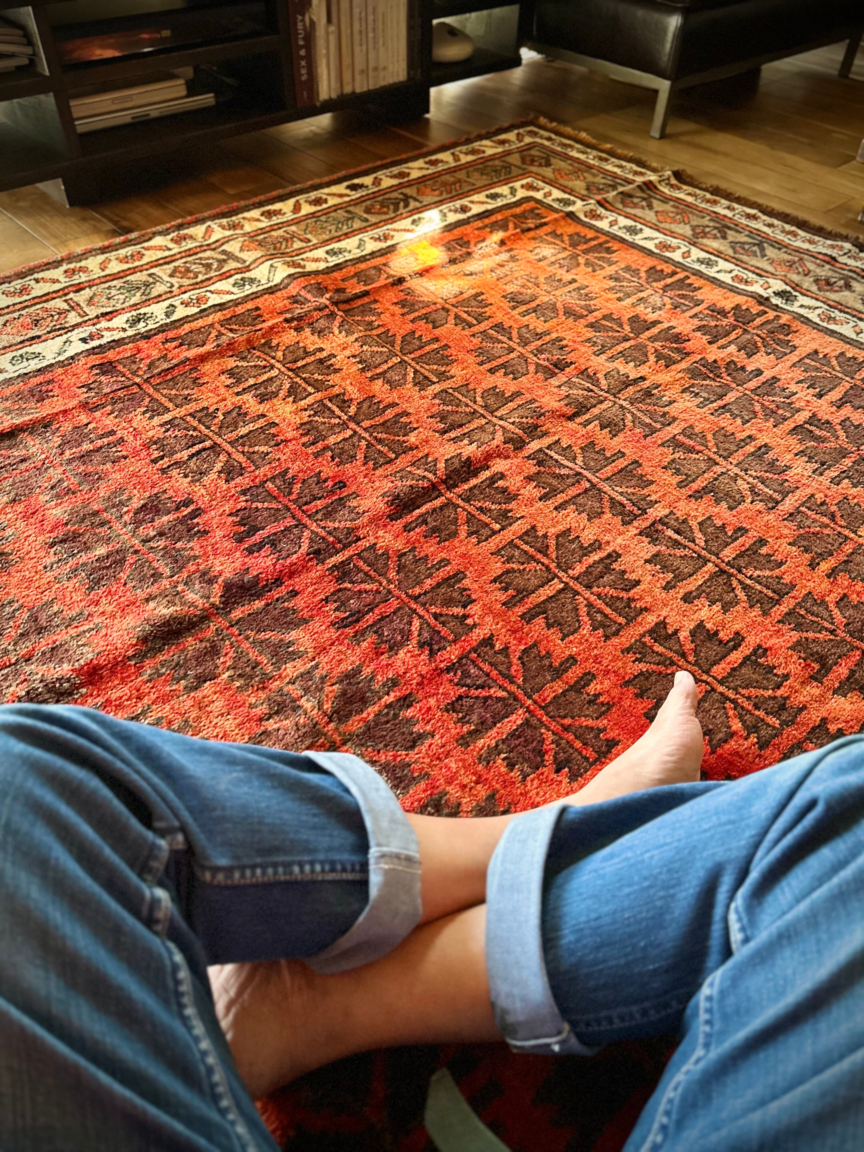 写真の枠内では収まり切れないオレンジ色の憎い奴とばかりに、基本的には自宅リビングでの撮影に不向きな大き過ぎるラグは仕入れいたしませんが、こちら今までで一番大きなタイマニ族のトライバルラグになります。
