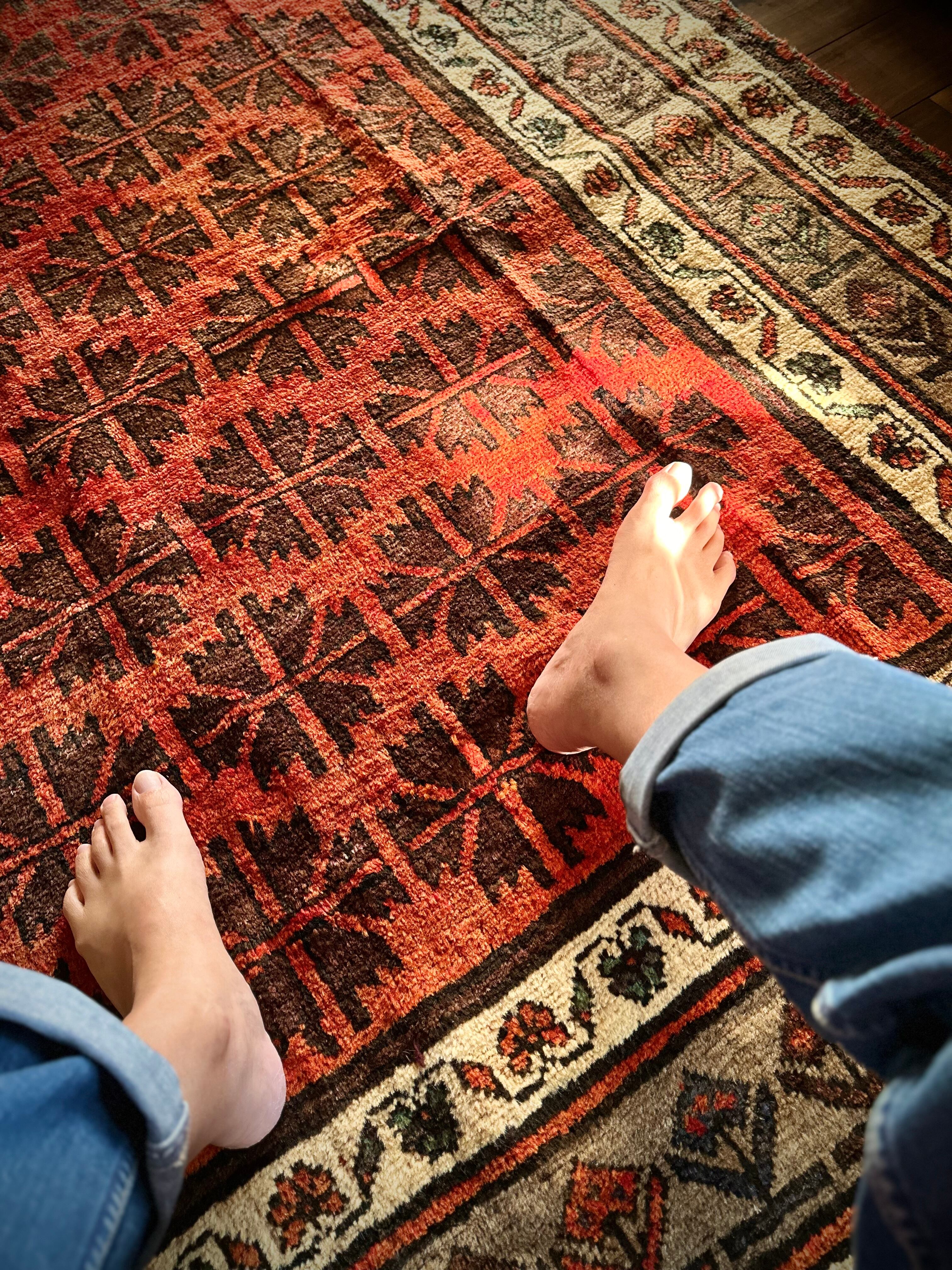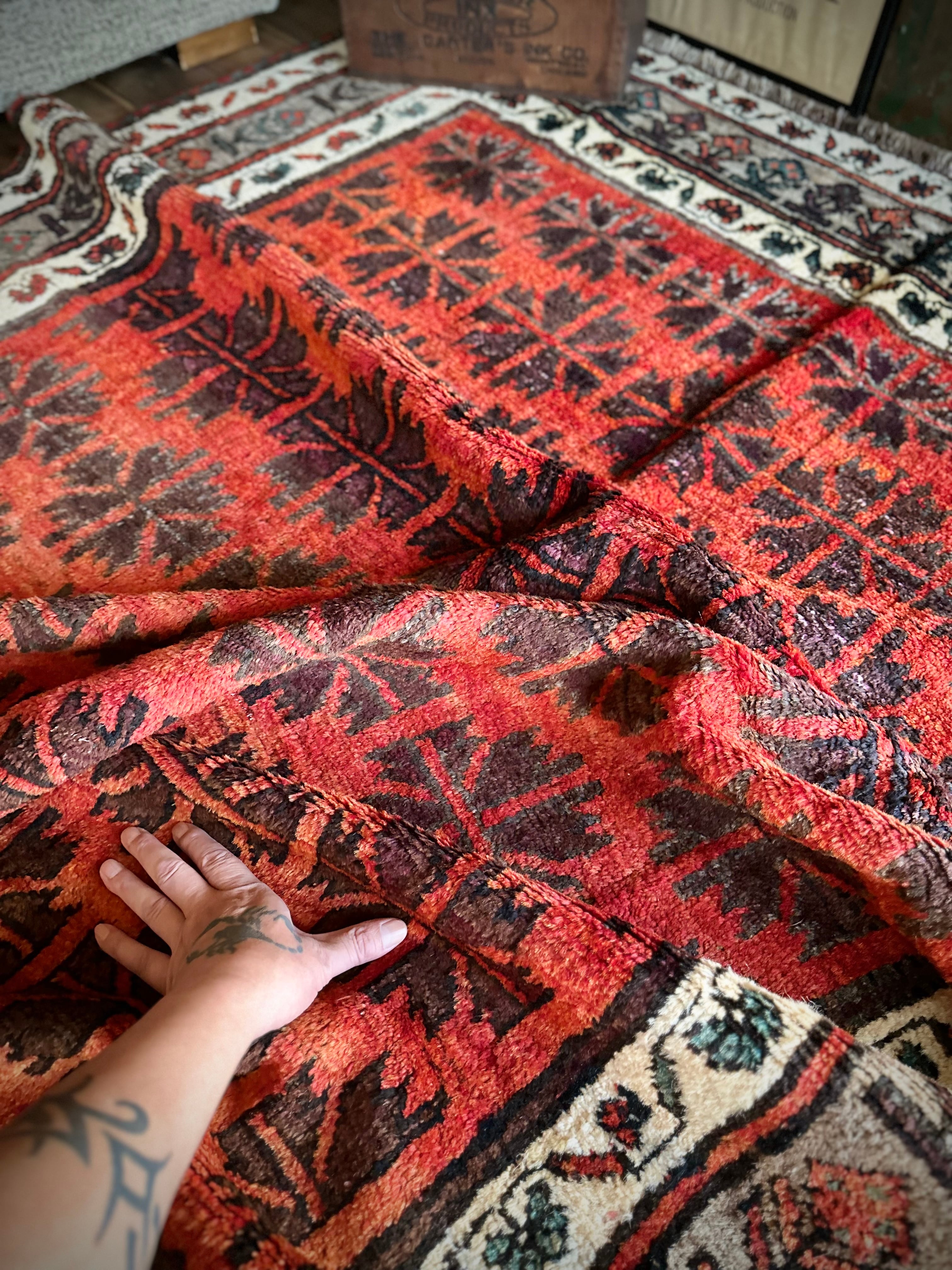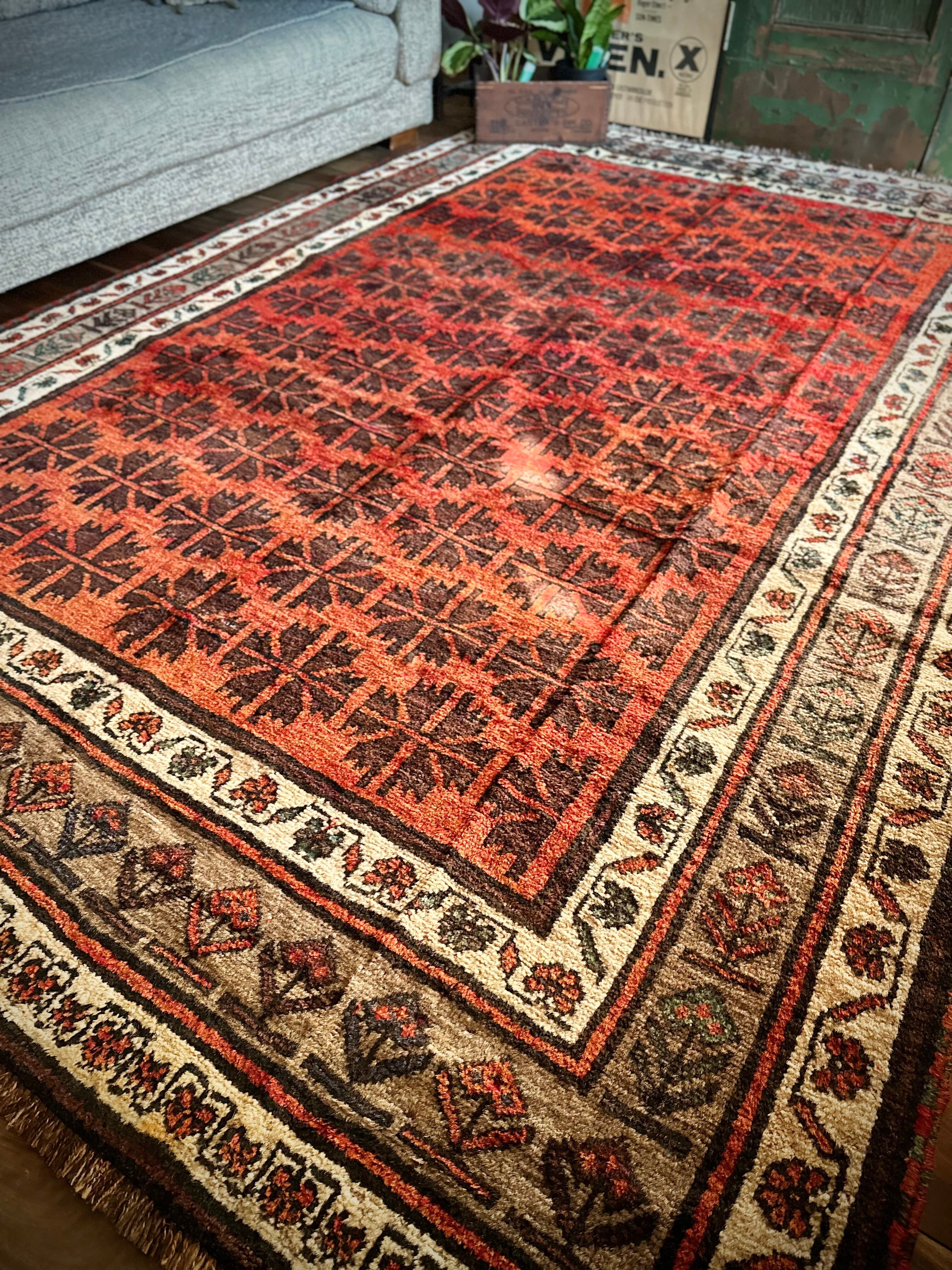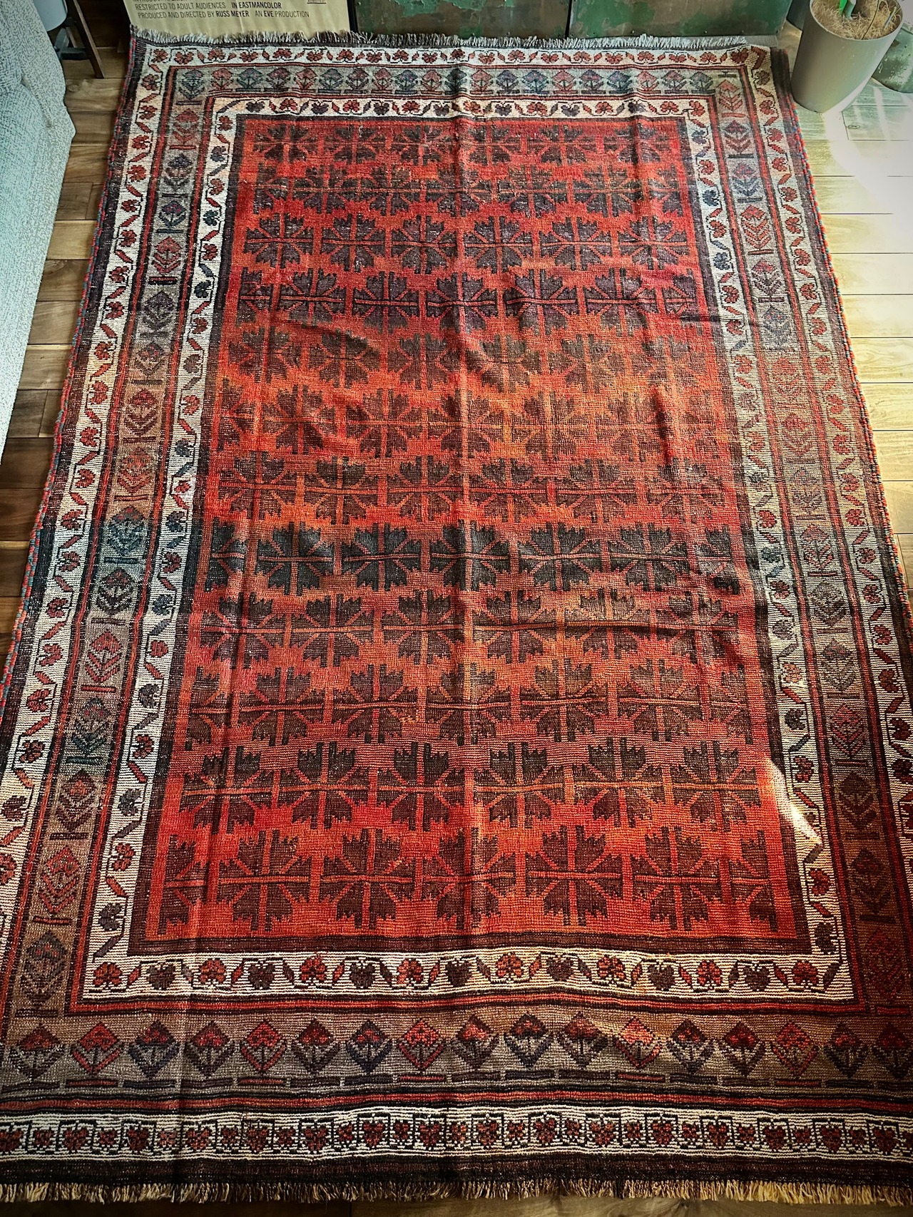 写真の枠内では収まり切れないオレンジ色の憎い奴とばかりに、基本的には自宅リビングでの撮影に不向きな大き過ぎるラグは仕入れいたしませんが、こちら今までで一番大きなタイマニ族のトライバルラグになります。