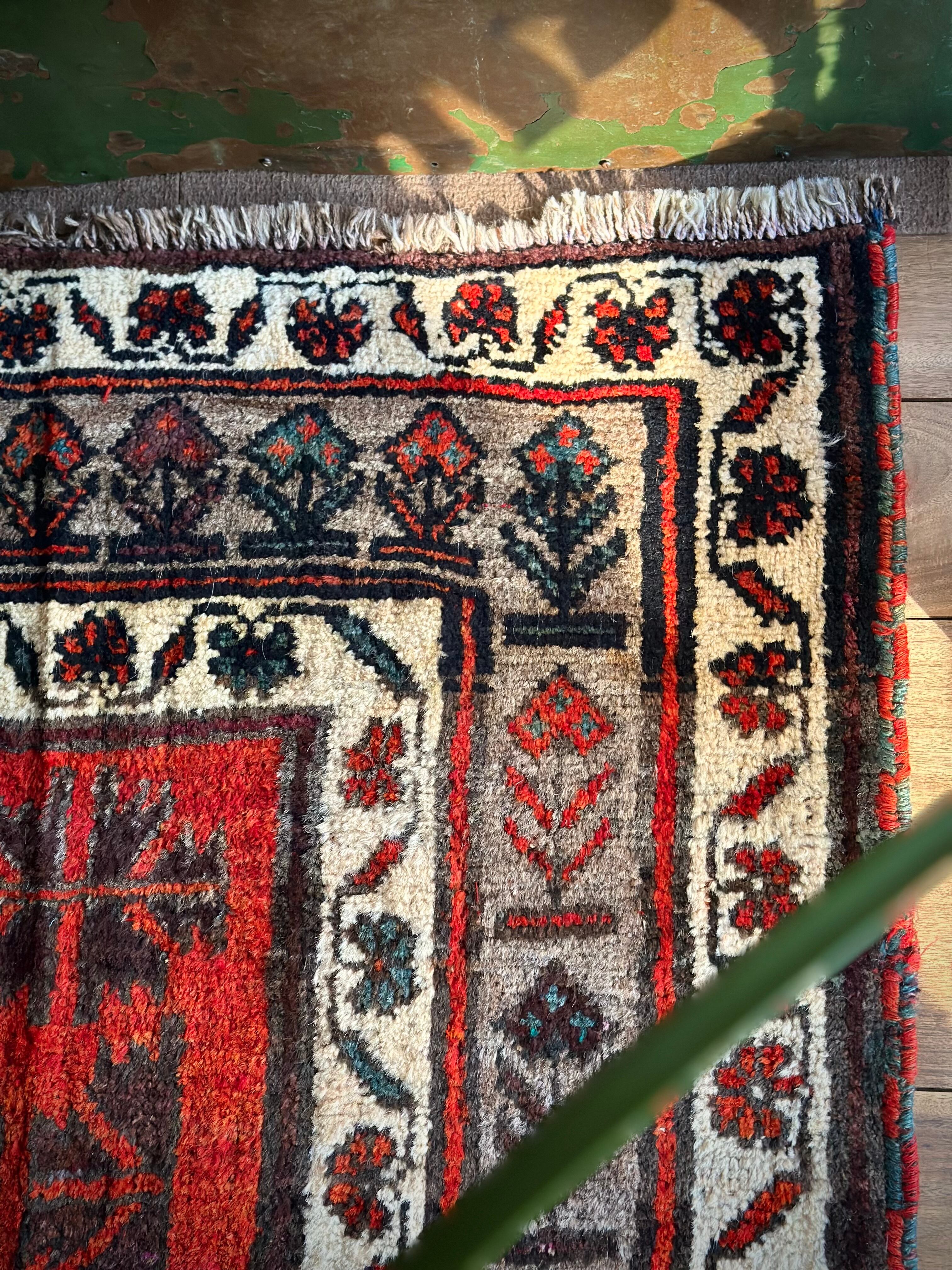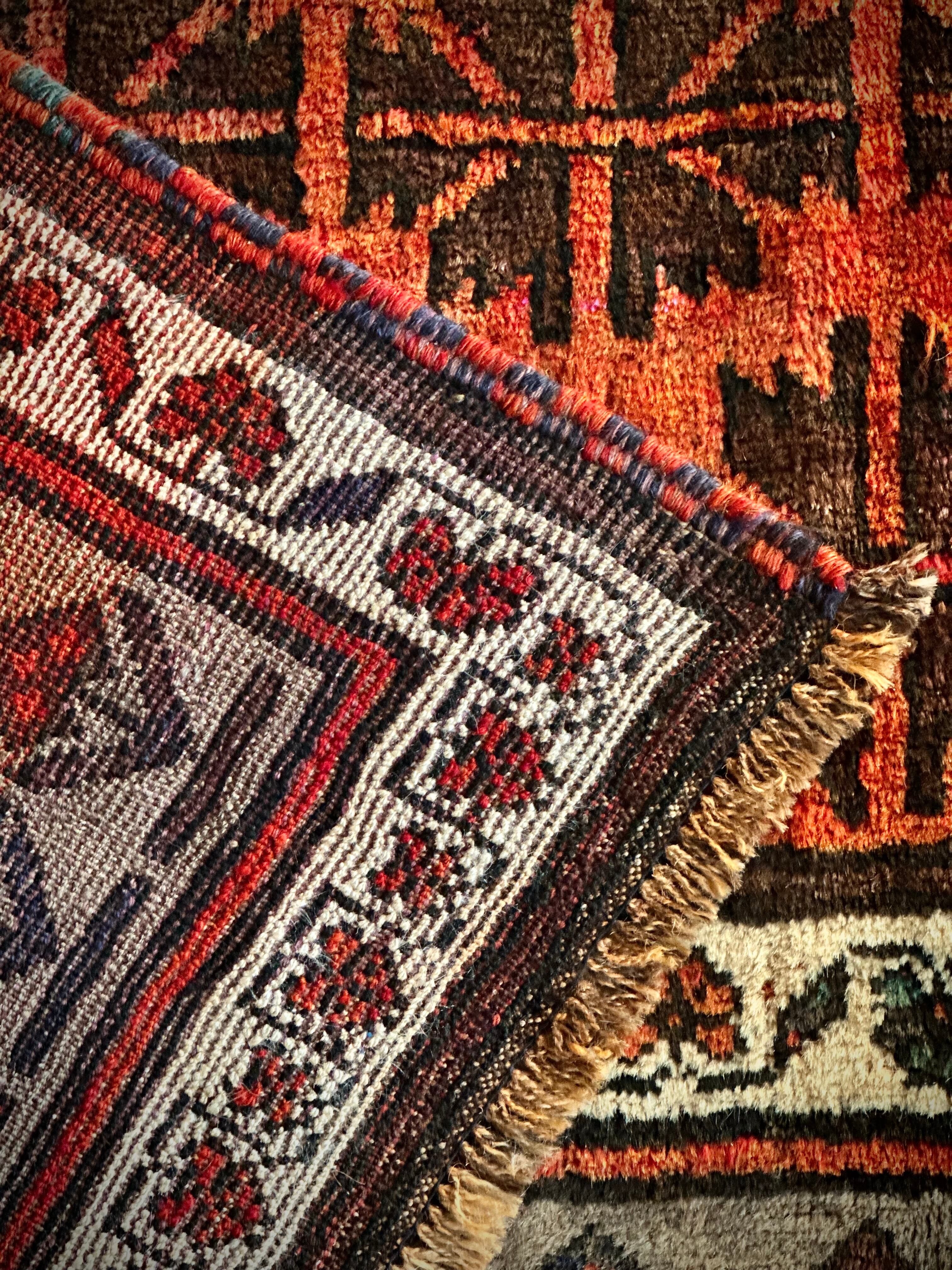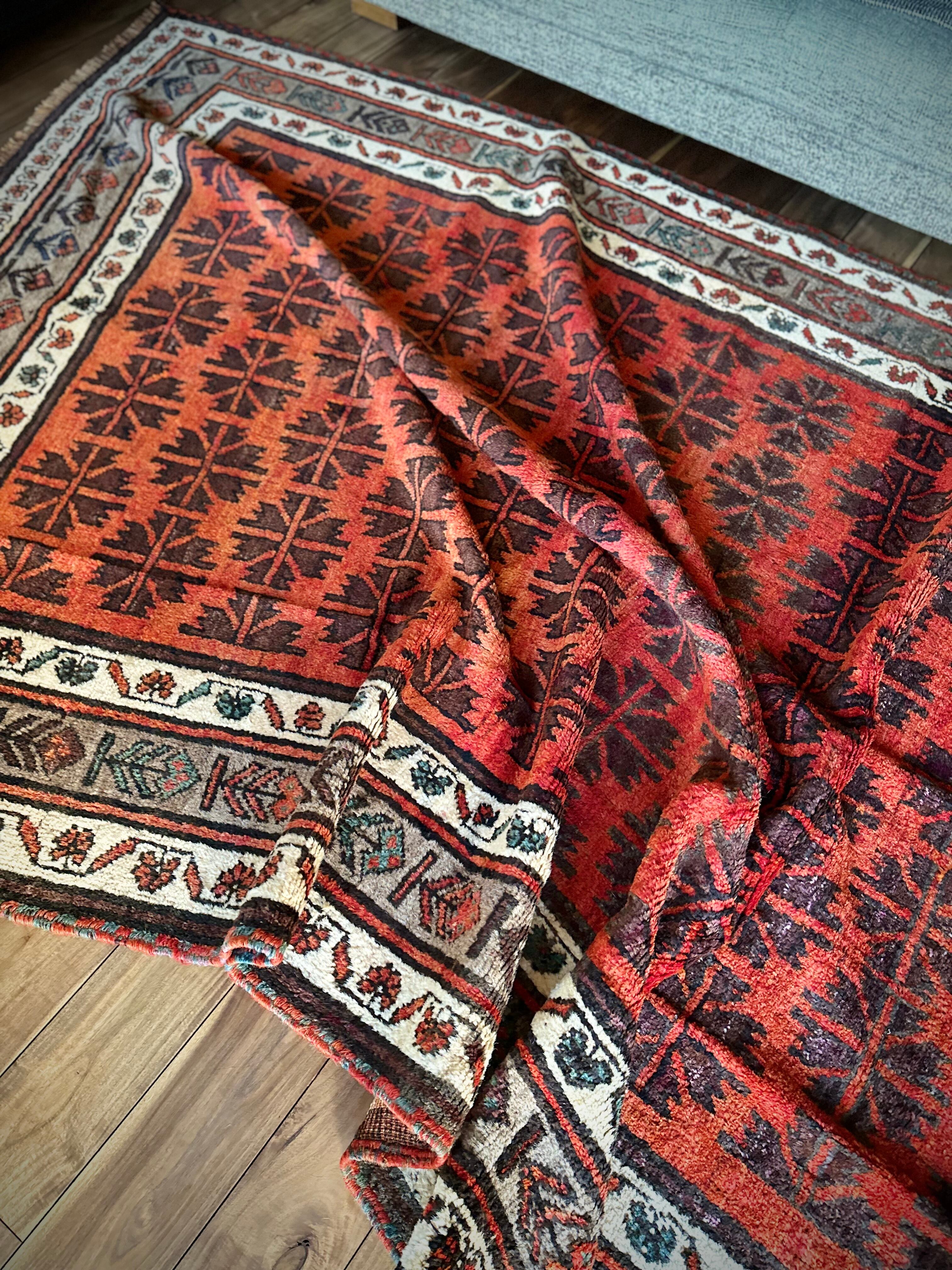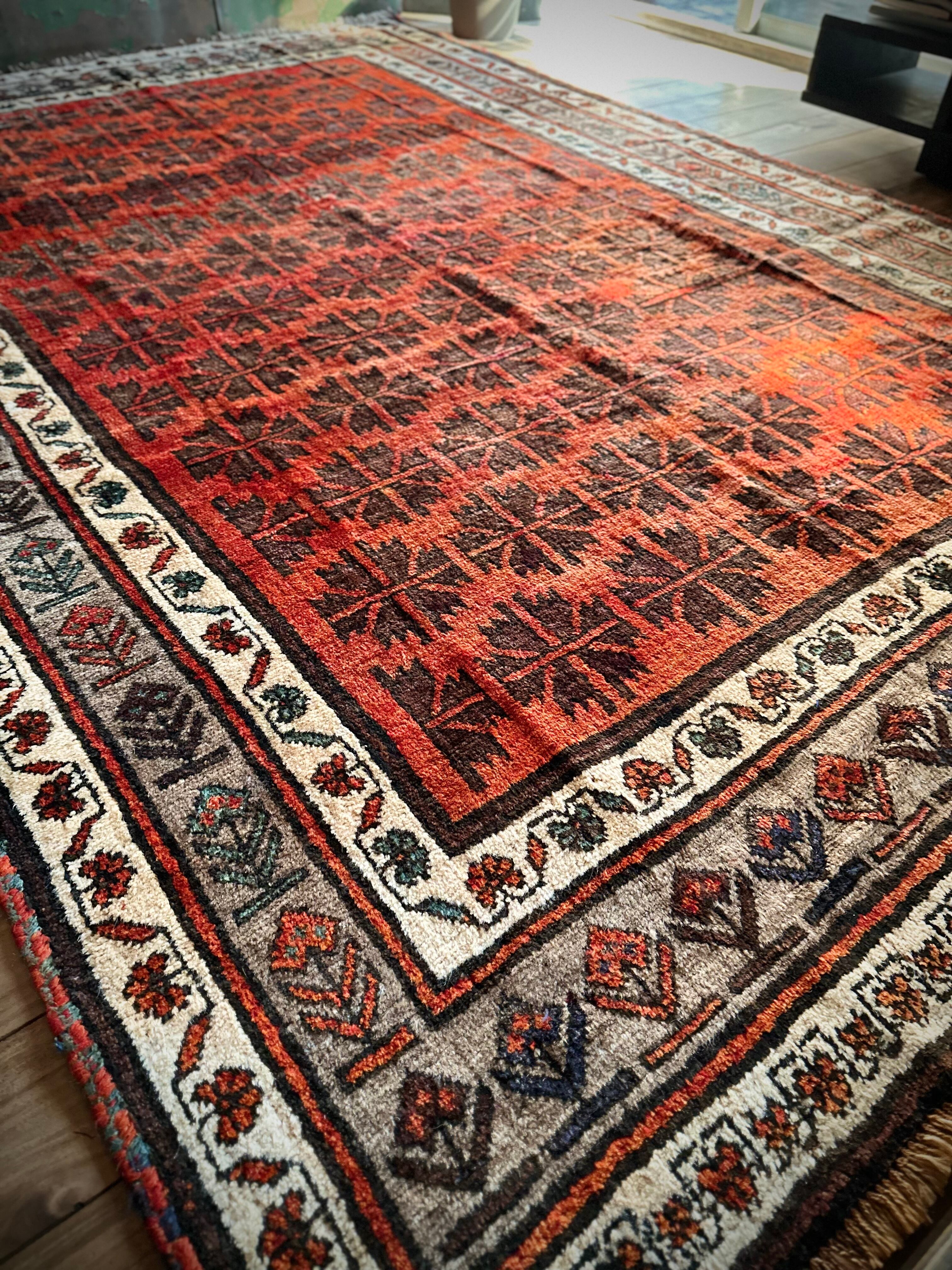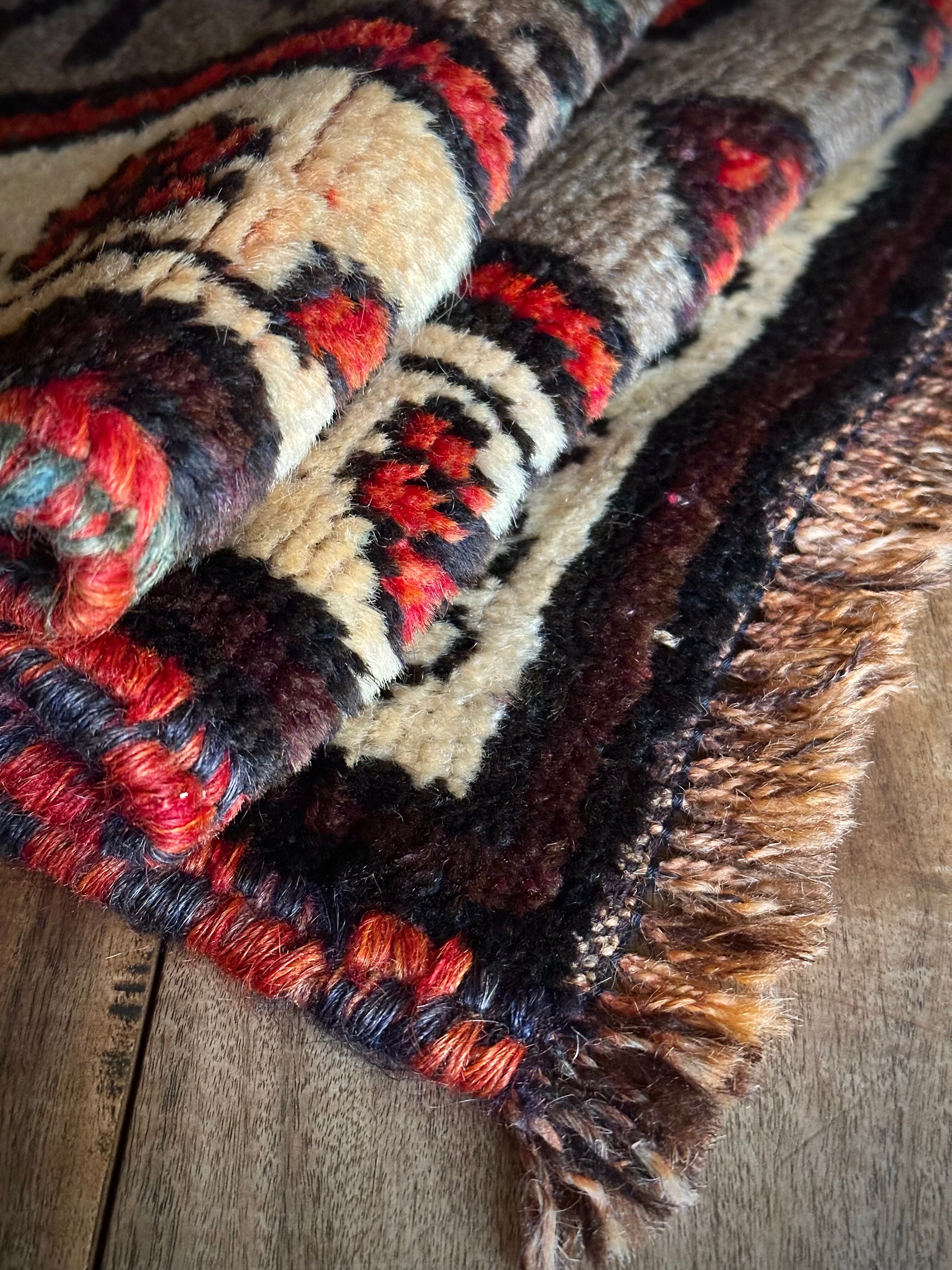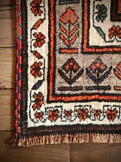 アフガニスタンのヘラート近隣に居住するタイマニ族のパイルラグは面白く、ざっくりとしたソフトな織りに長めの毛足が特徴的で、カシュガイ族のオールドギャッベのような、どこかプリミティブな印象でいて牧歌的な見た目と言えるでしょうか。こちらも葉っぱをモチーフにしたチナール柄にボーダーの花柄など、当店にしては可愛らしいチョイスで遊んでみました。