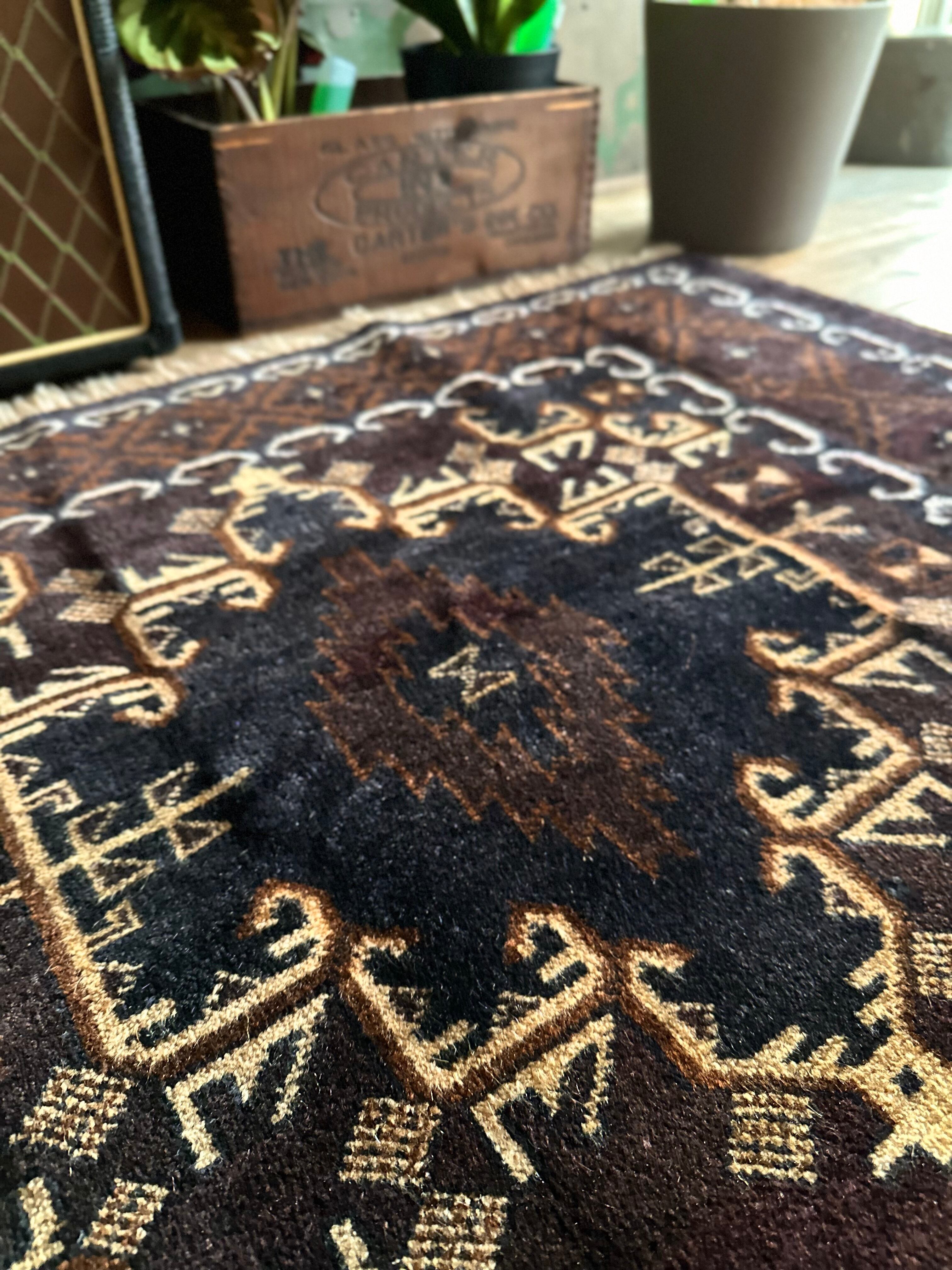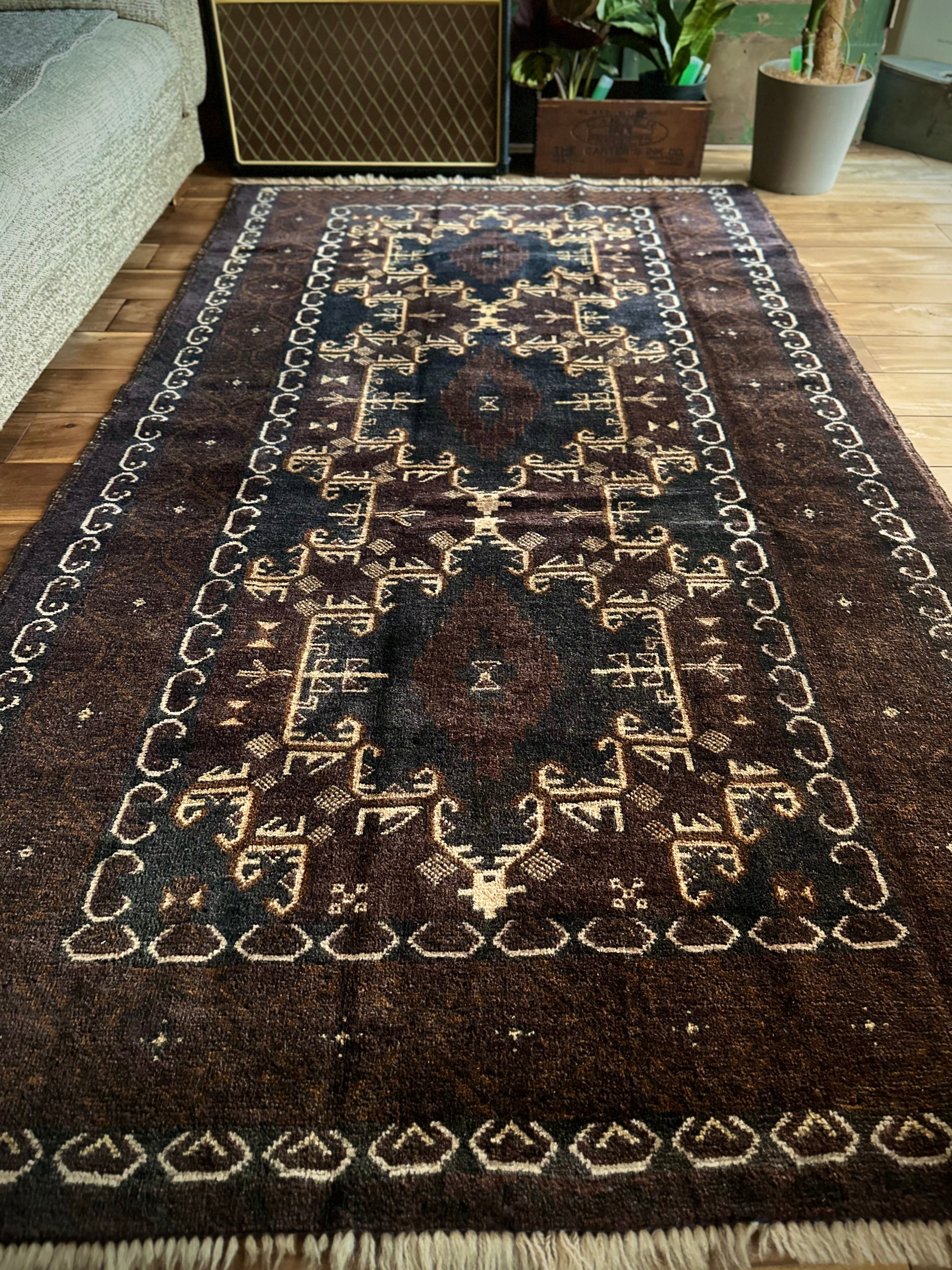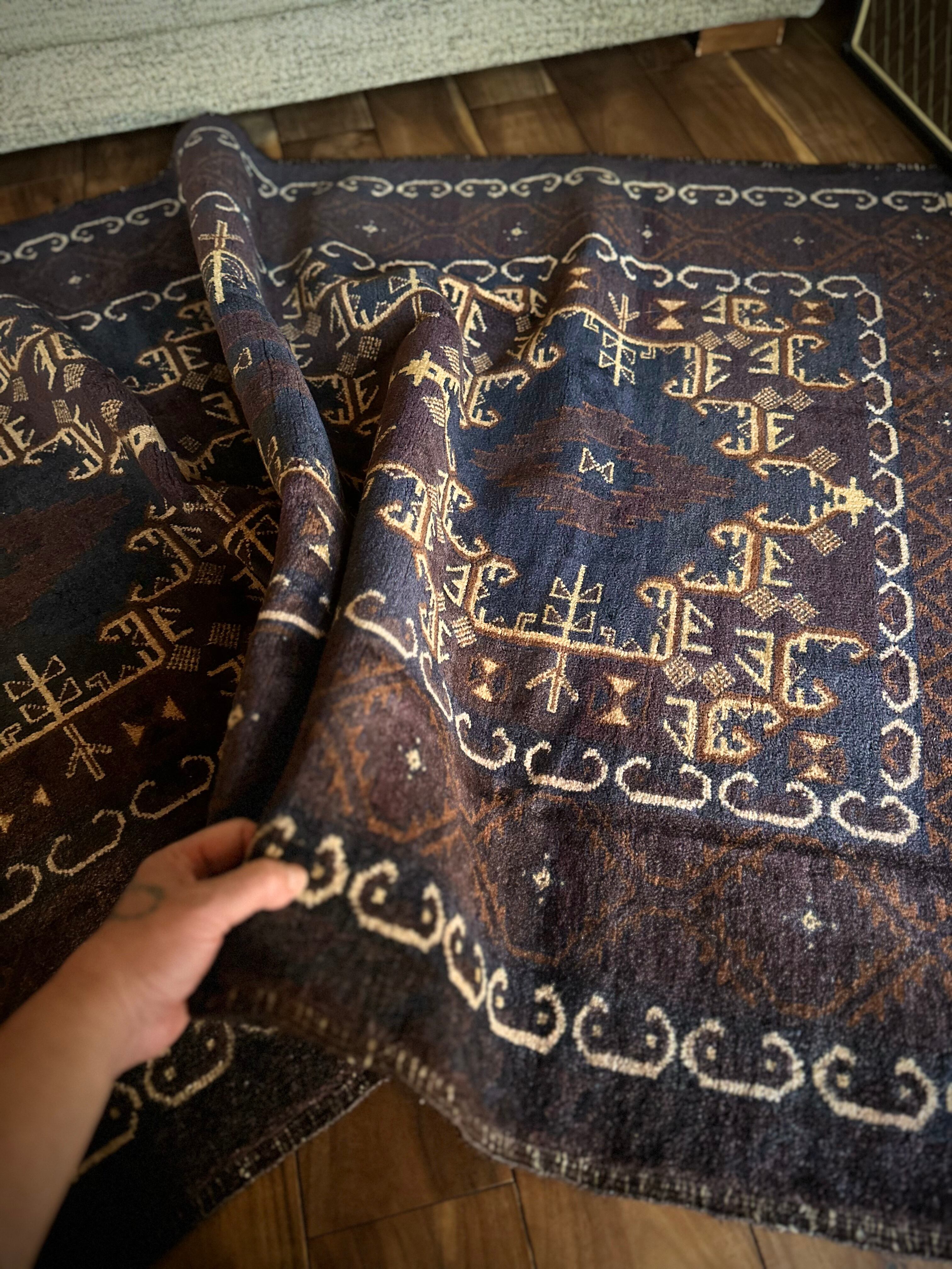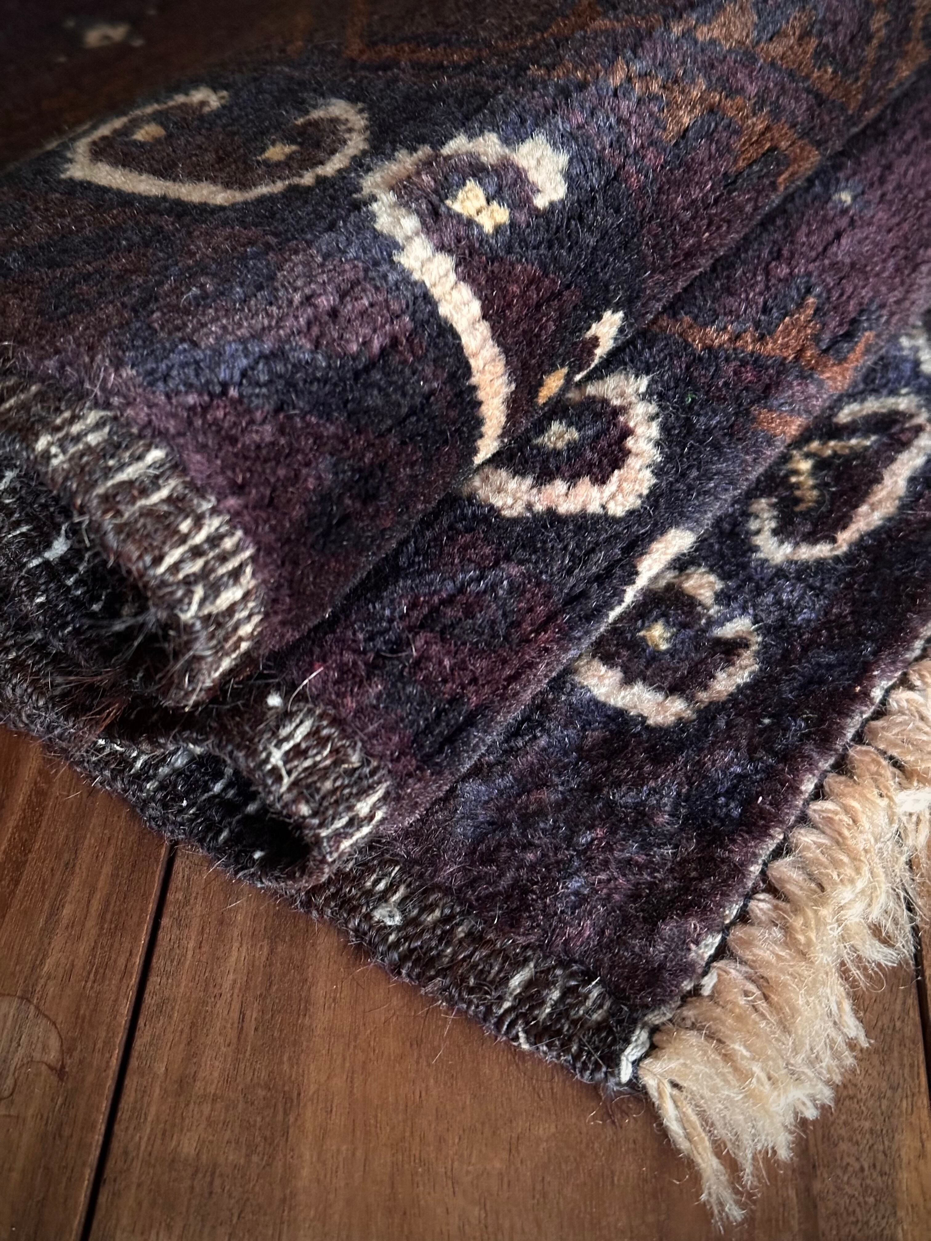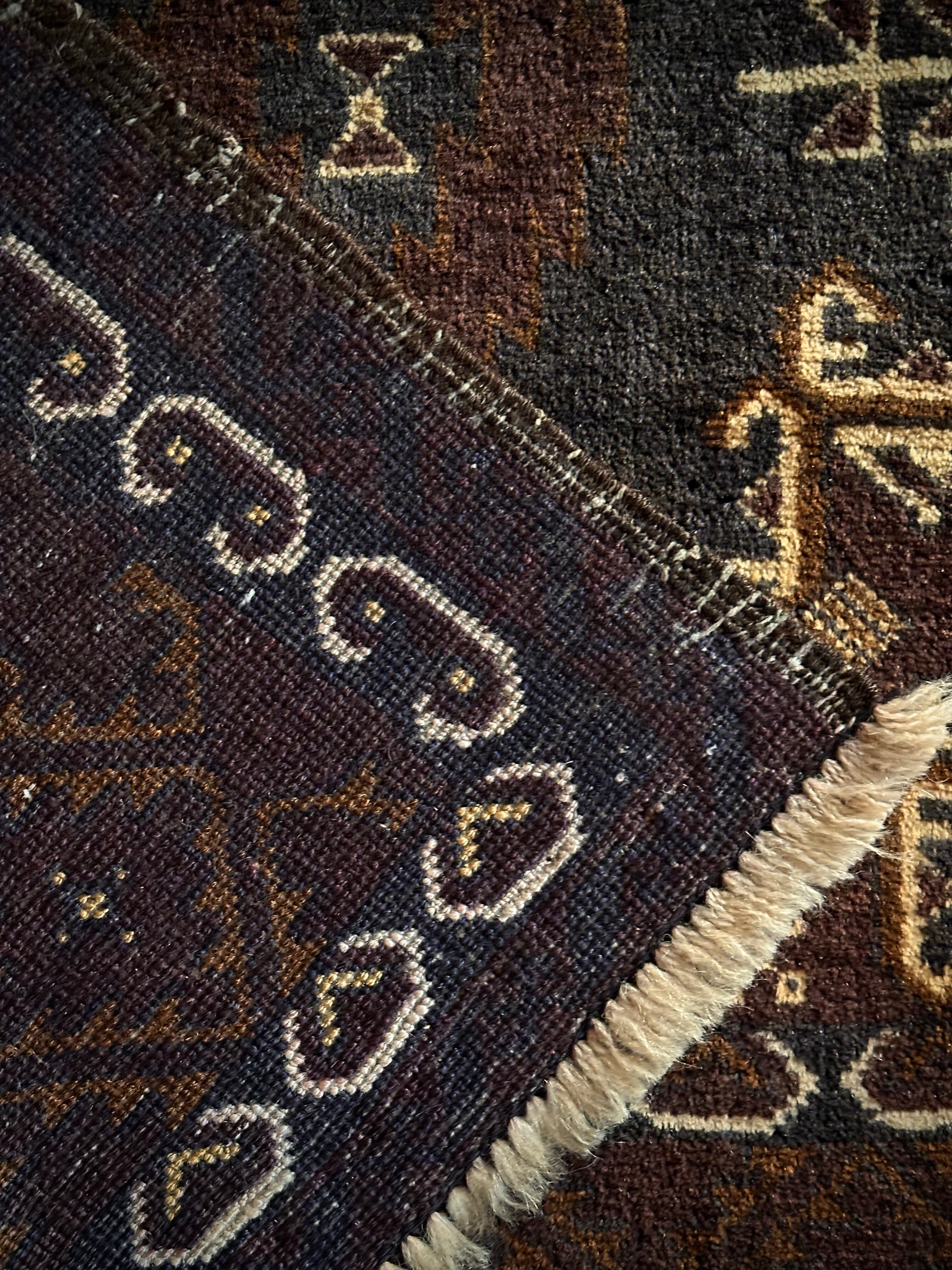 ネイビーをベースに暖色のブラウンとバーガンディが重なり、ベージュとアイボリーでアクセントを付けた構図が素晴らしい、アフガニスタンはヘラートに居住するバルーチ族のトライバルラグになります。