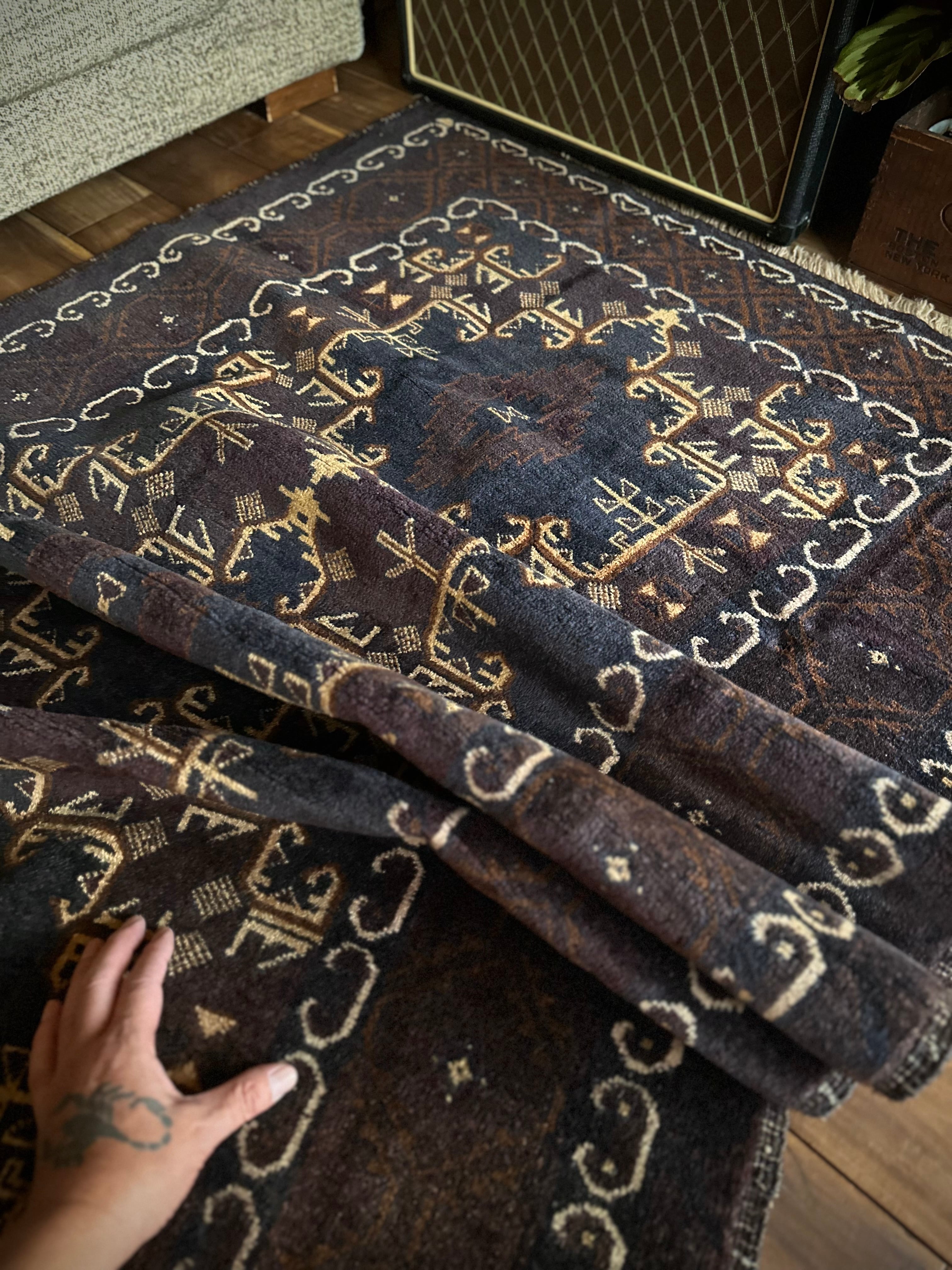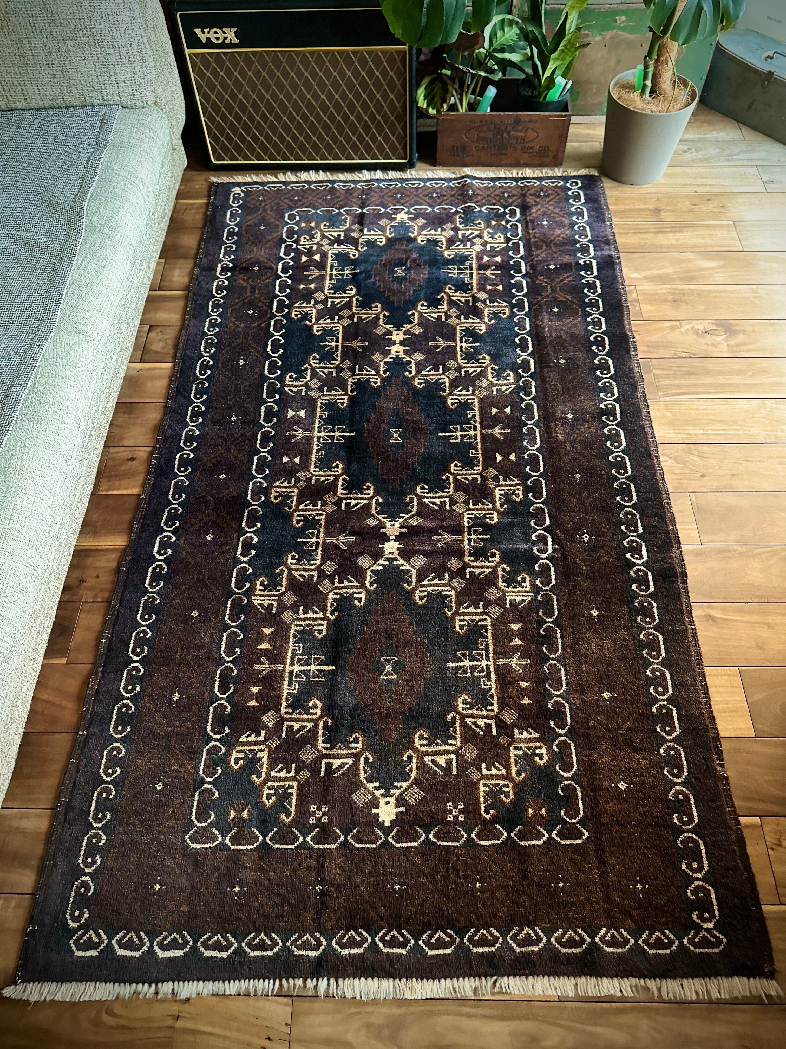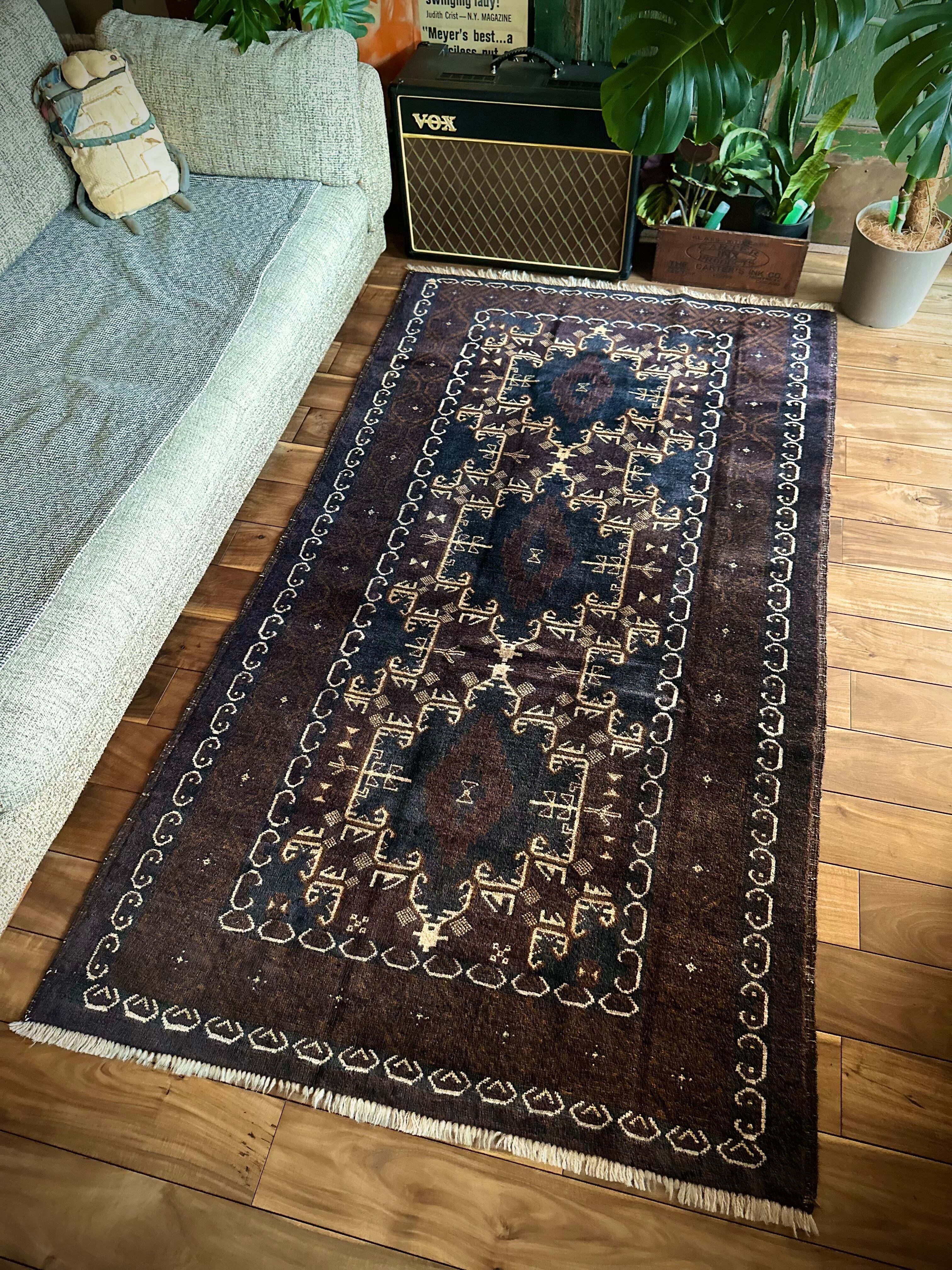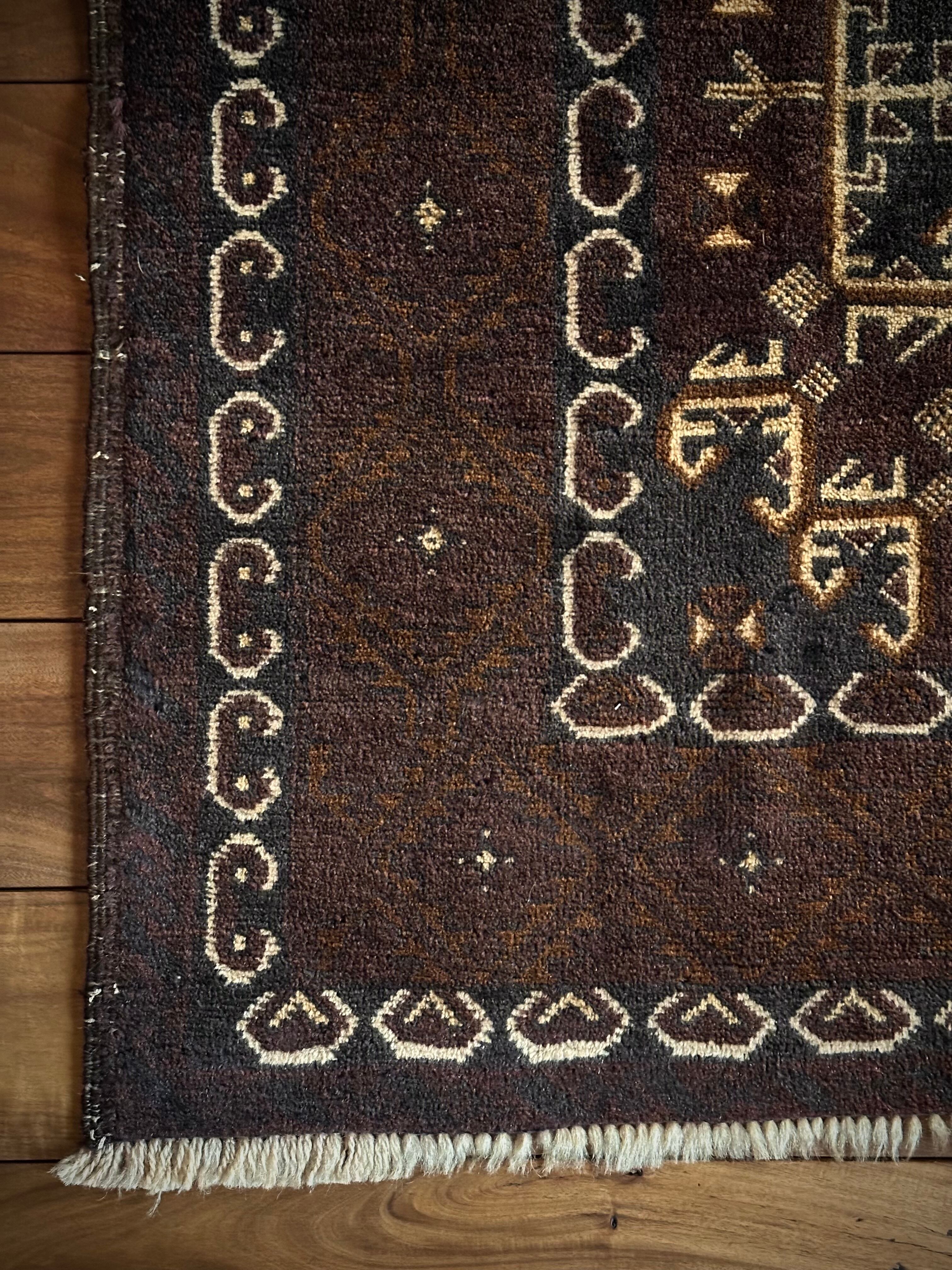 ネイビーをベースに暖色のブラウンとバーガンディが重なり、ベージュとアイボリーでアクセントを付けた構図が素晴らしい、アフガニスタンはヘラートに居住するバルーチ族のトライバルラグになります。