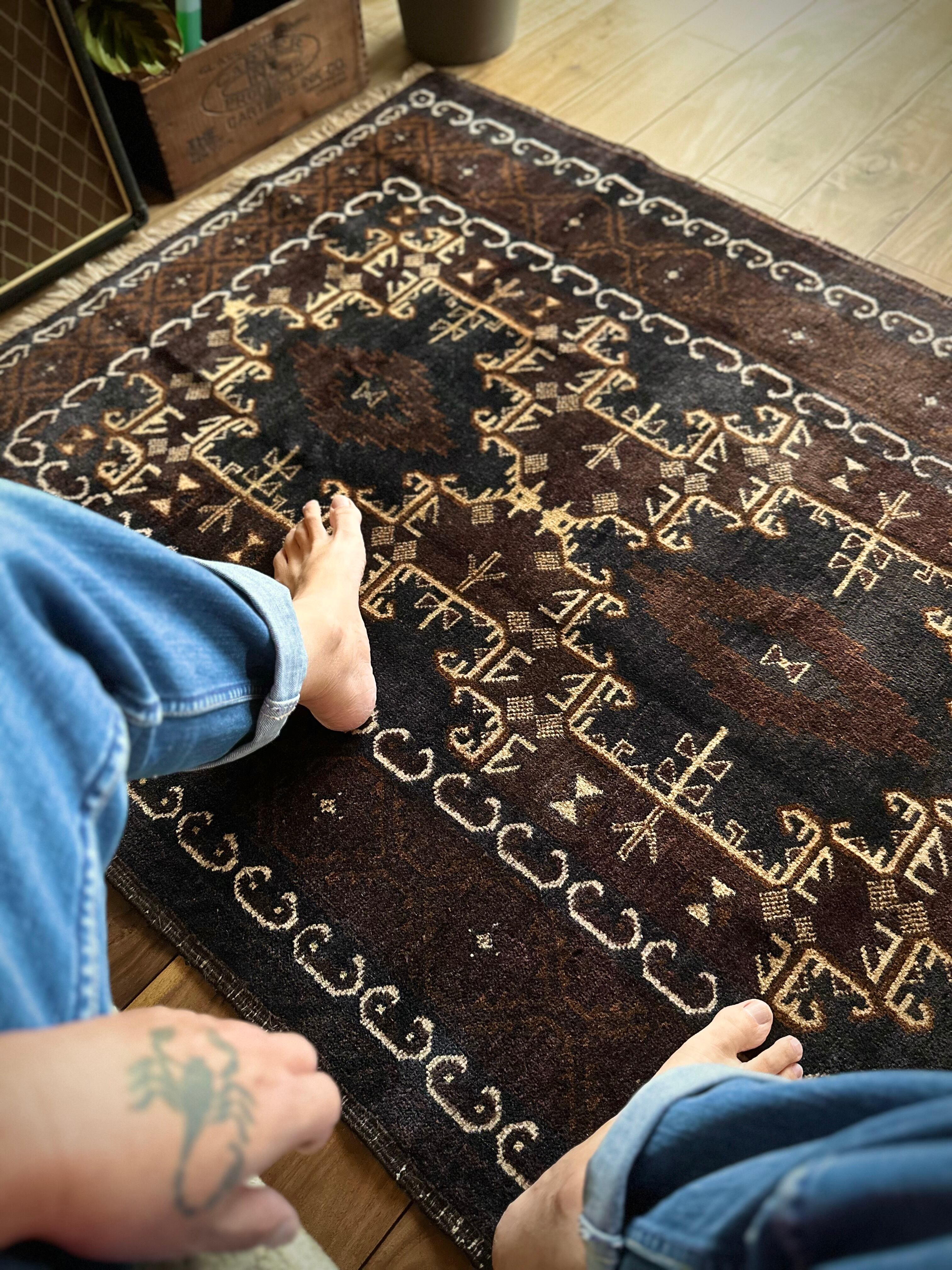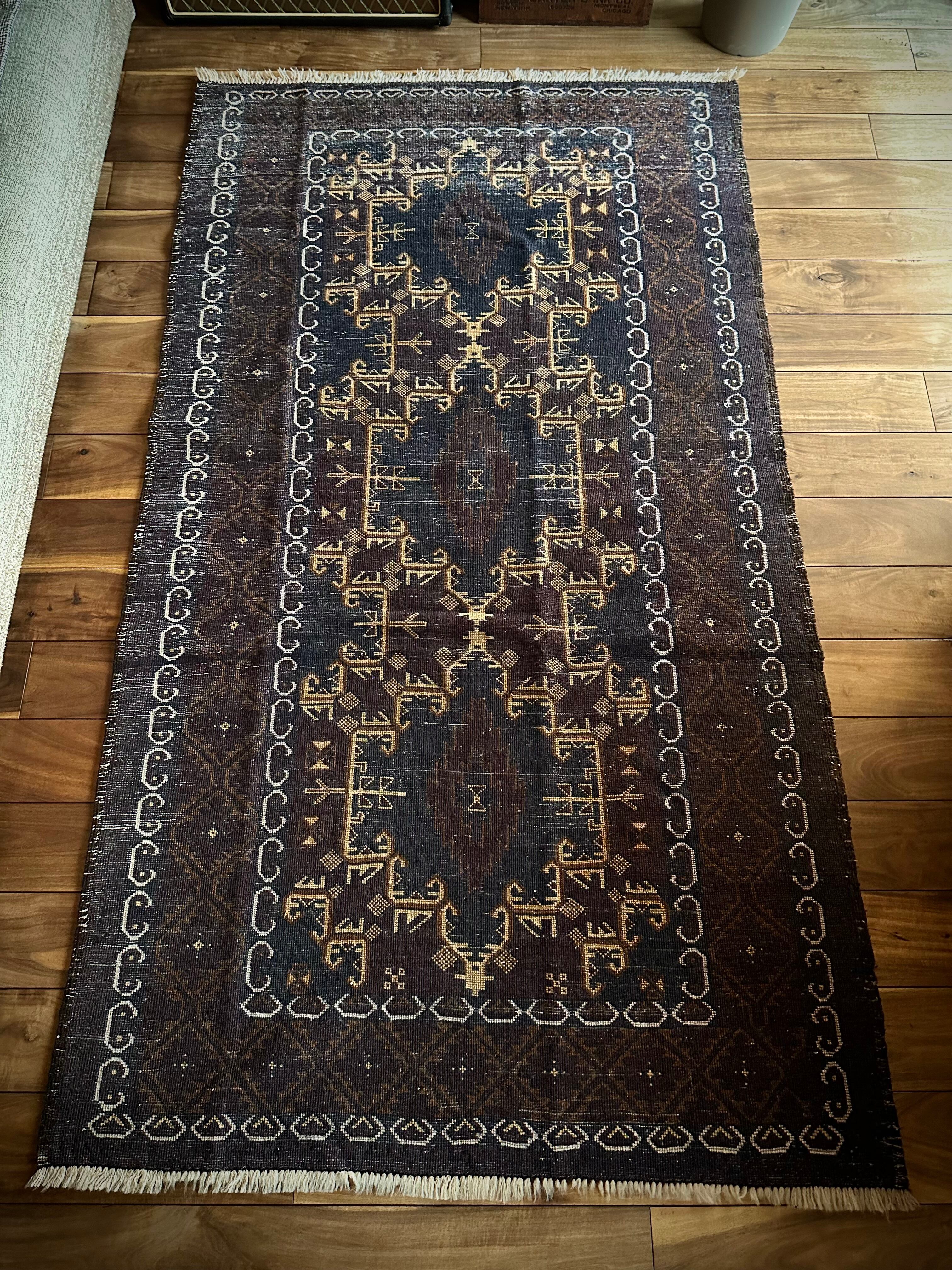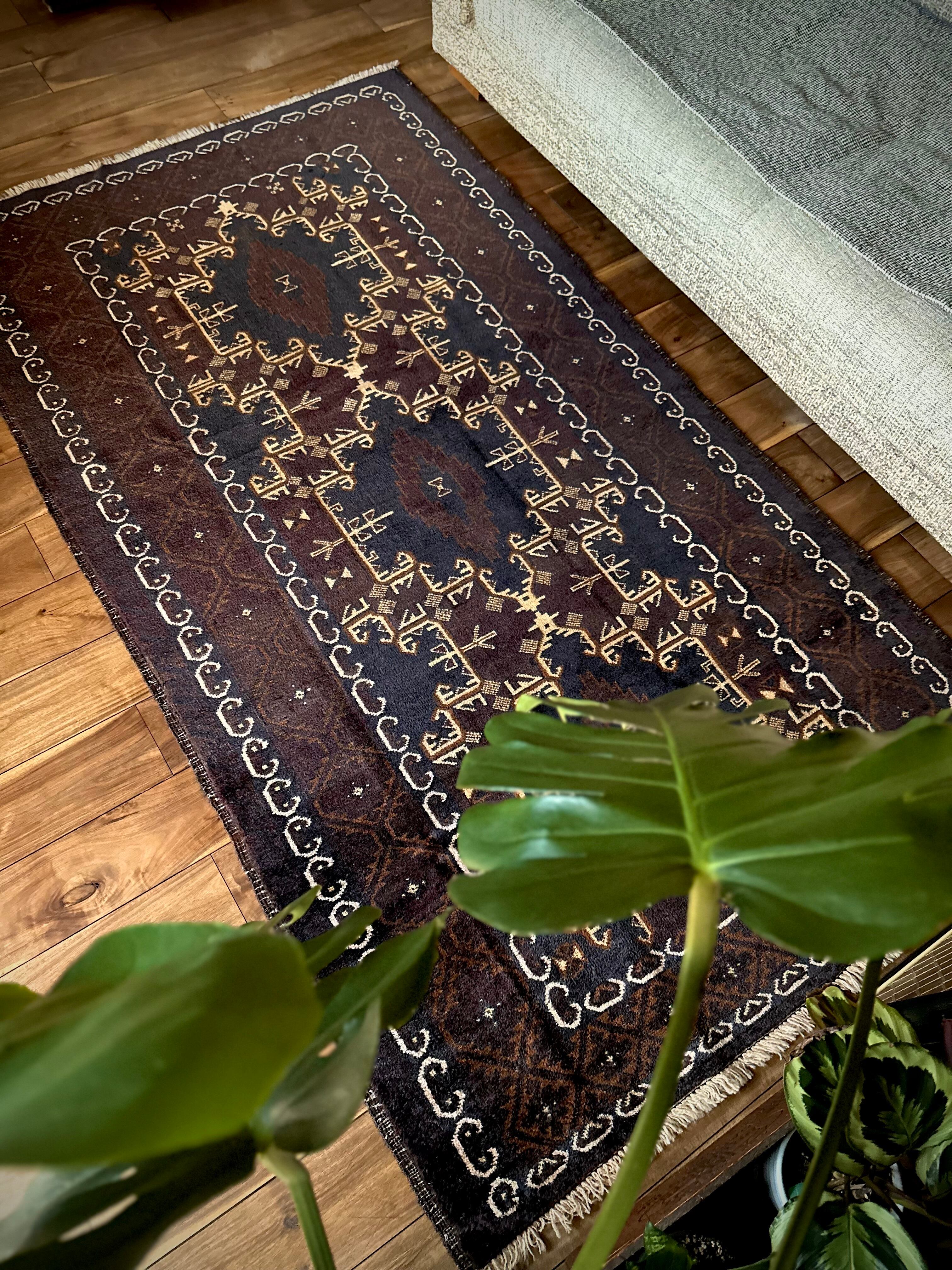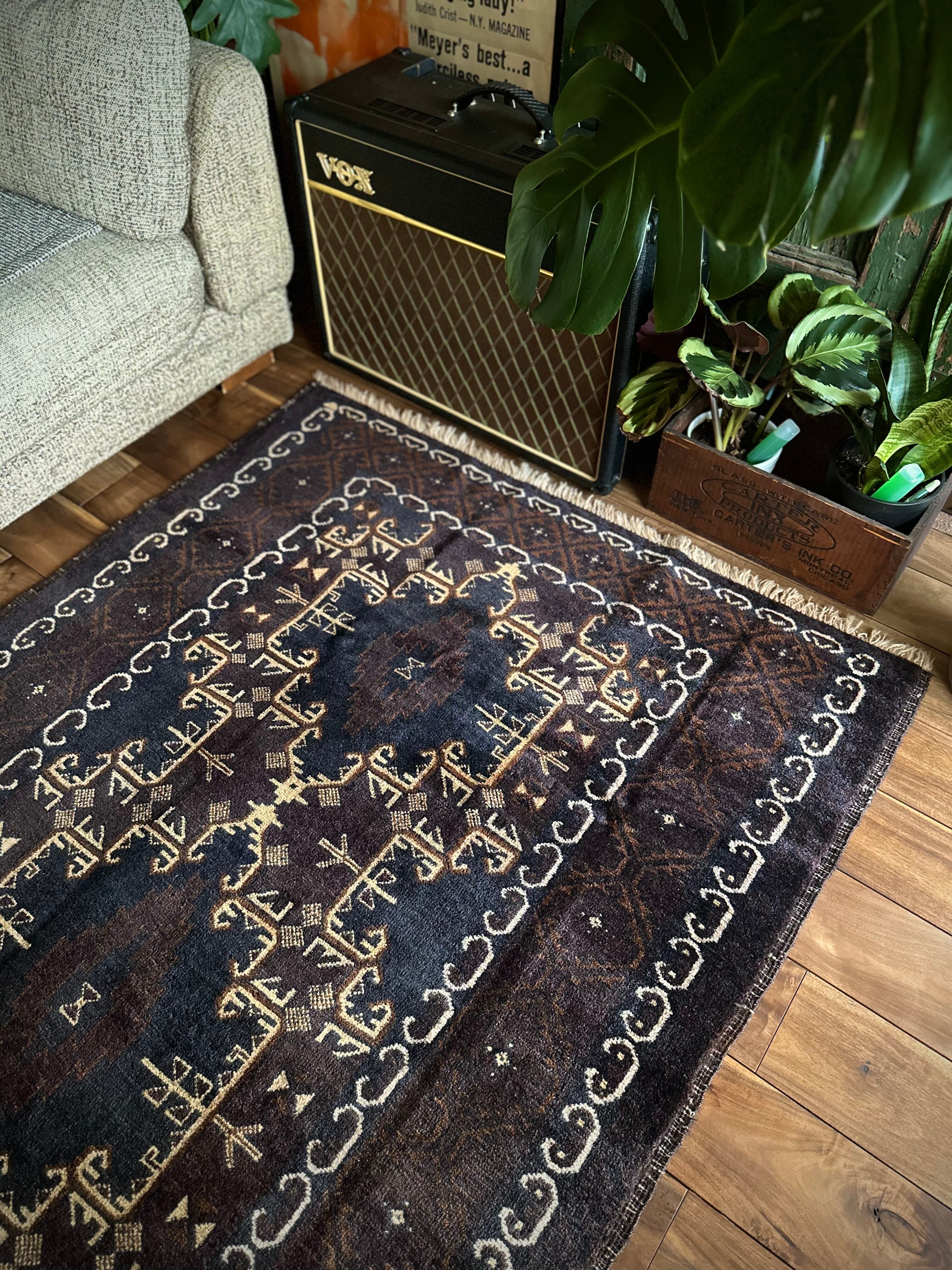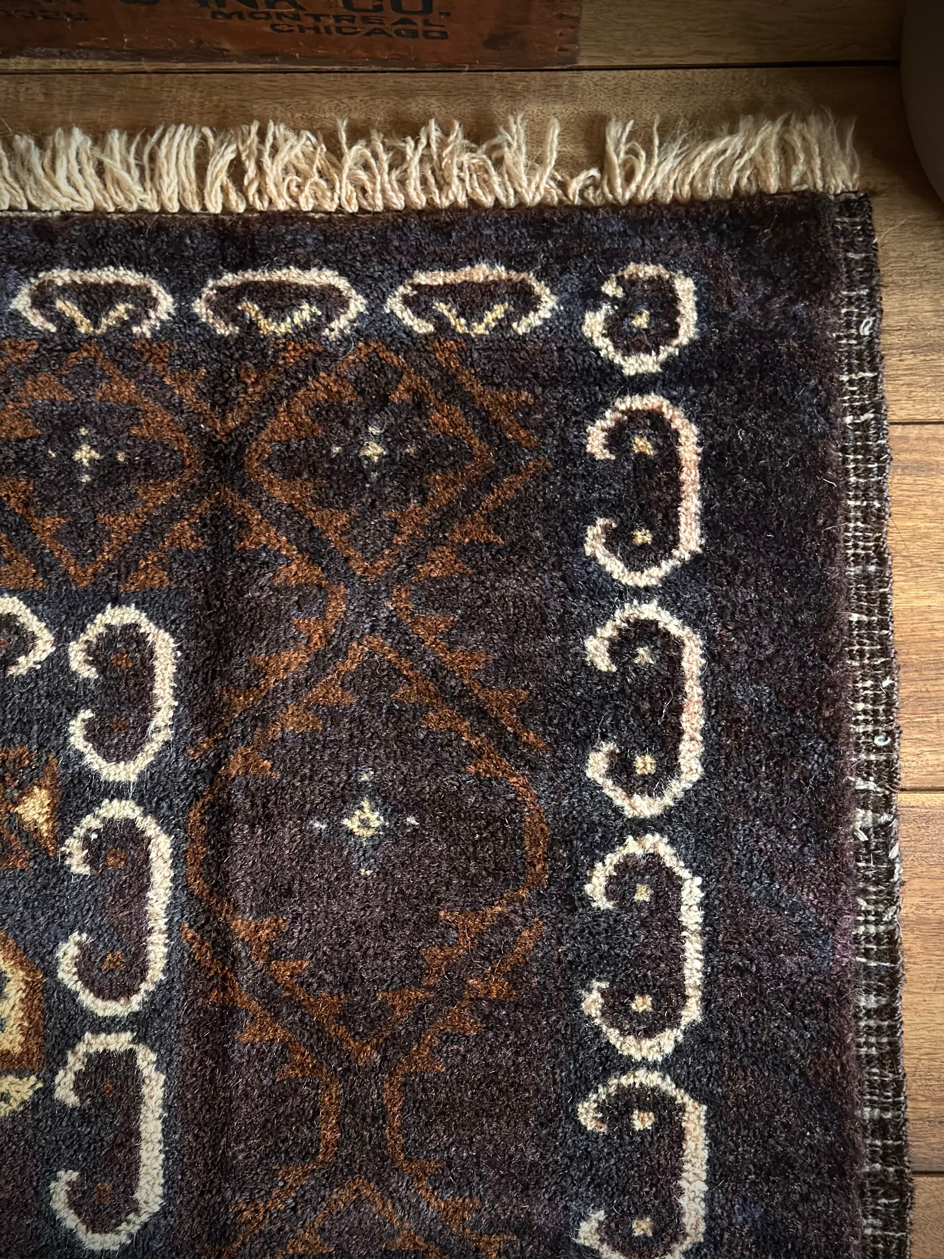 ネイビーをベースに暖色のブラウンとバーガンディが重なり、ベージュとアイボリーでアクセントを付けた構図が素晴らしい、アフガニスタンはヘラートに居住するバルーチ族のトライバルラグになります。