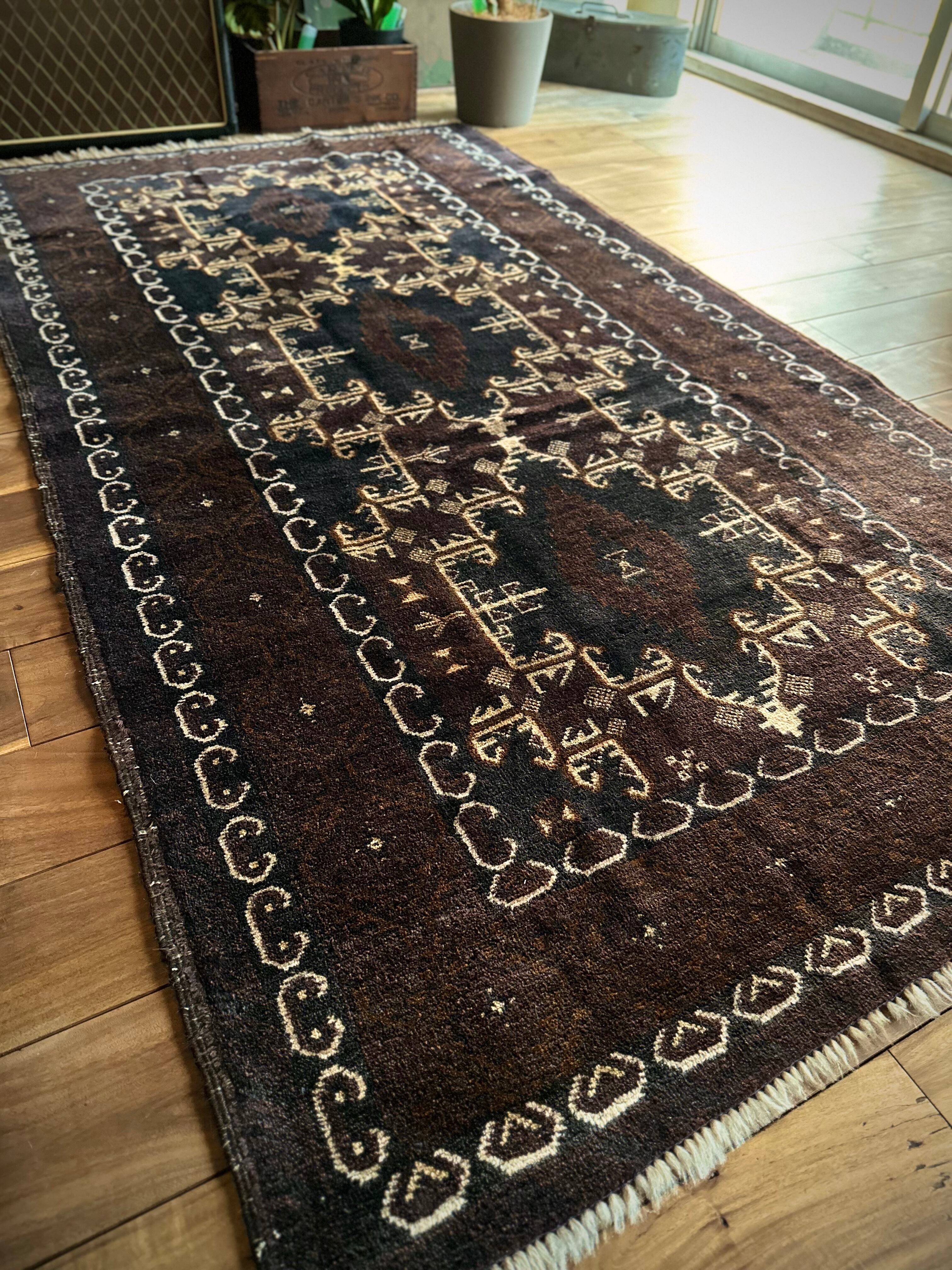 3連の独創的なメダリオンが配置されたオリジナリティ溢れる1枚で、ダンディな色使いが男前でかっこいいでしょうか。大きさはバルーチによく見られるシングル・サイズで、ぎり3人掛けソファ前やベッドサイドに適した大きさになります。