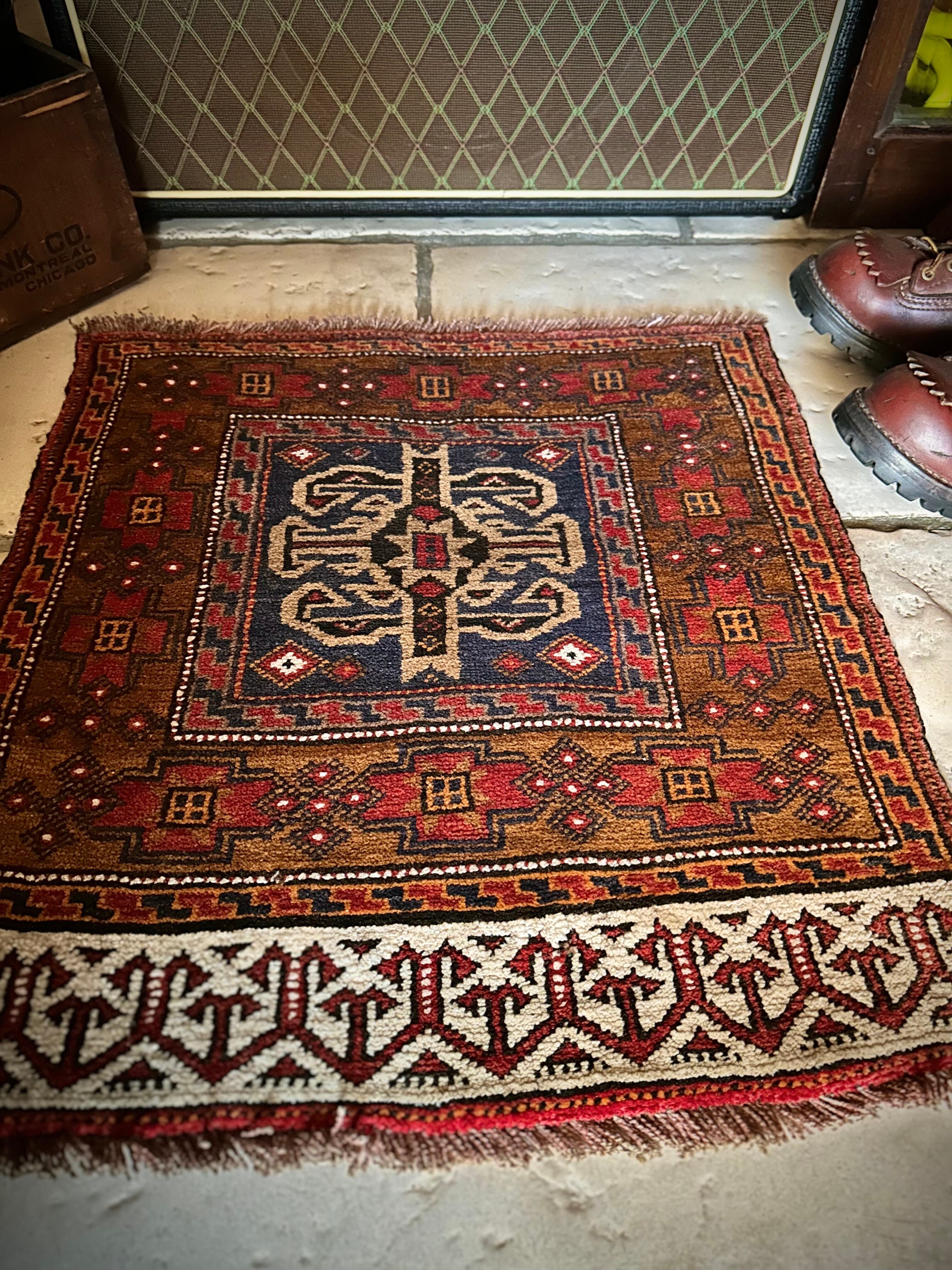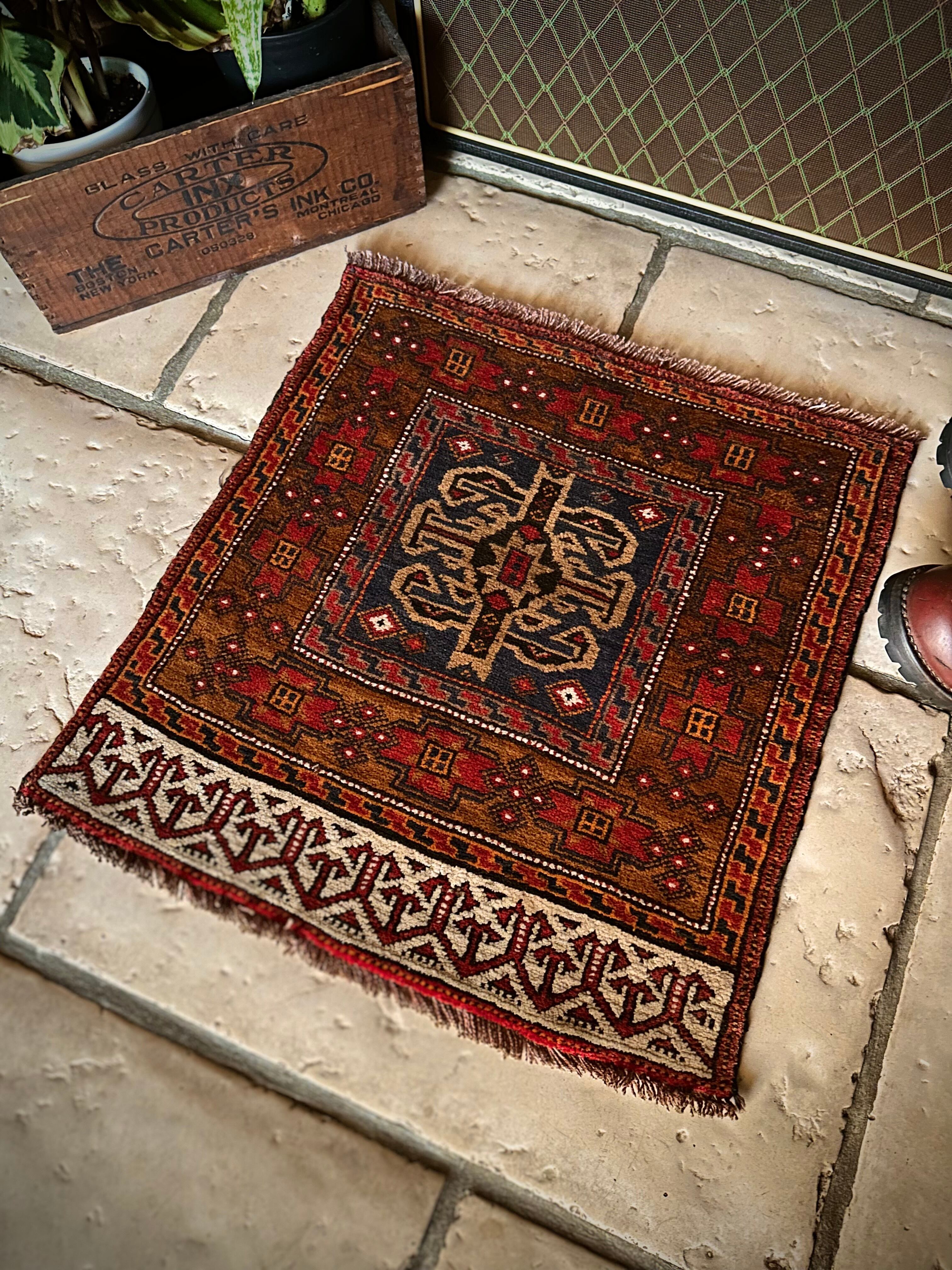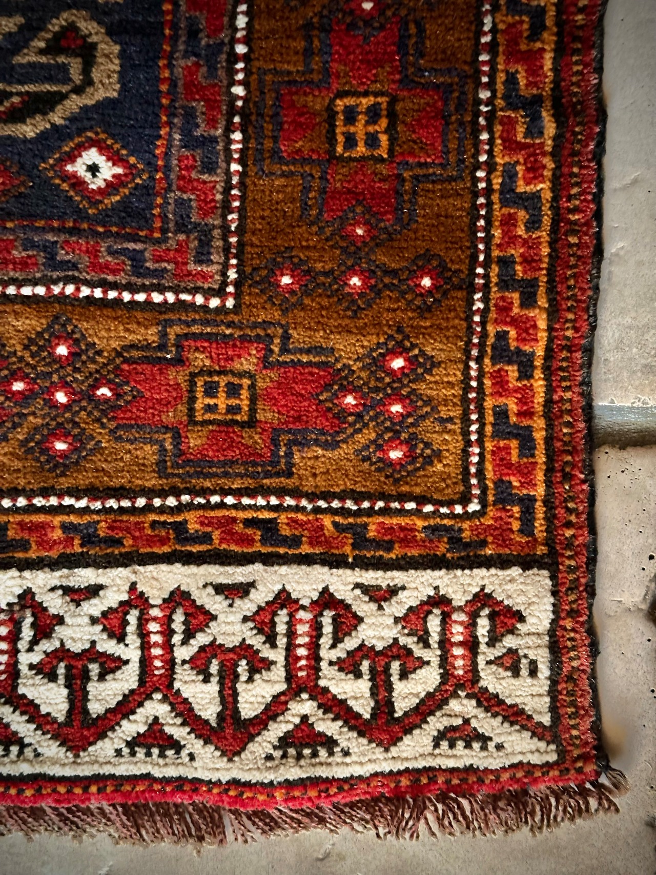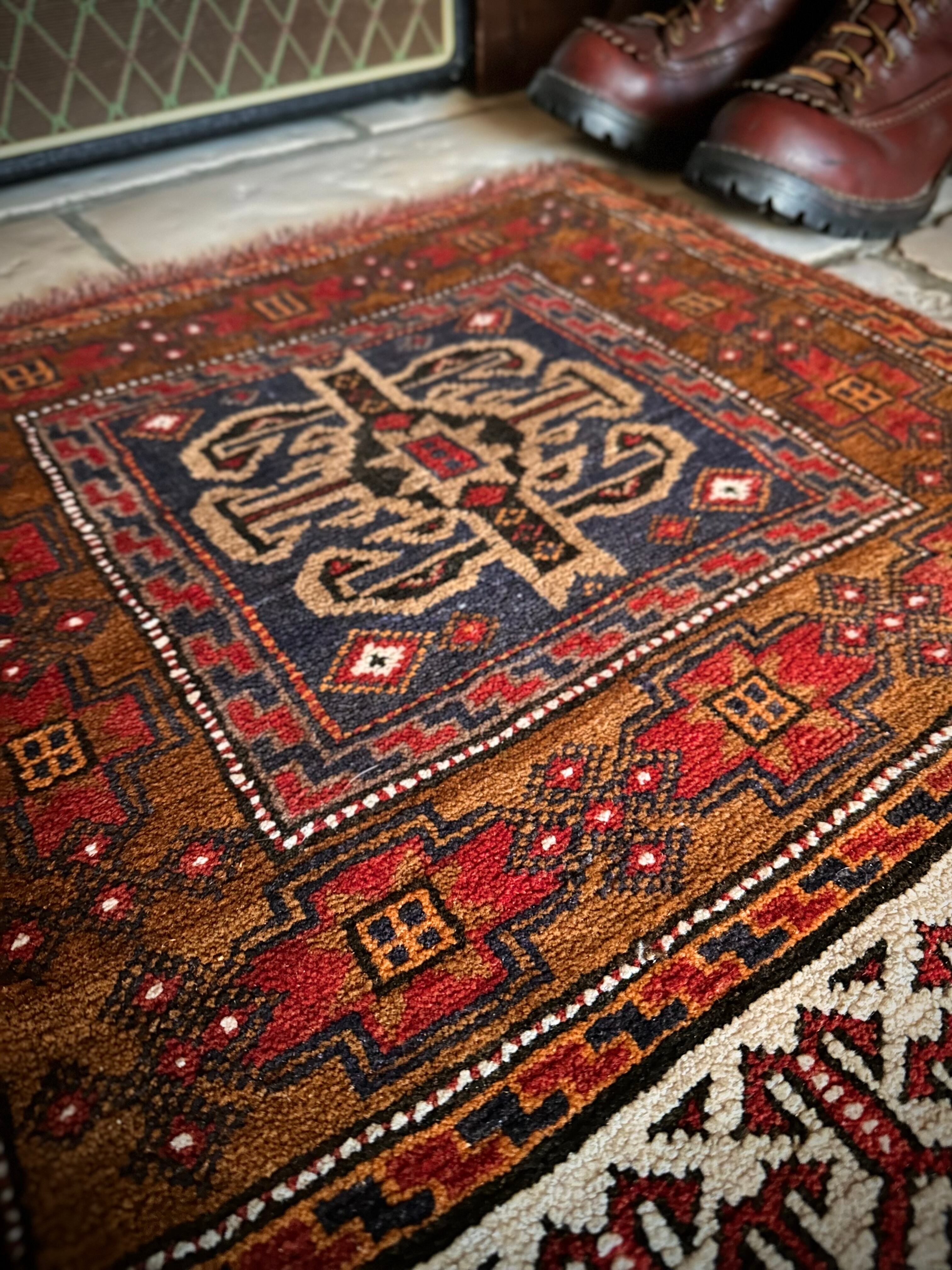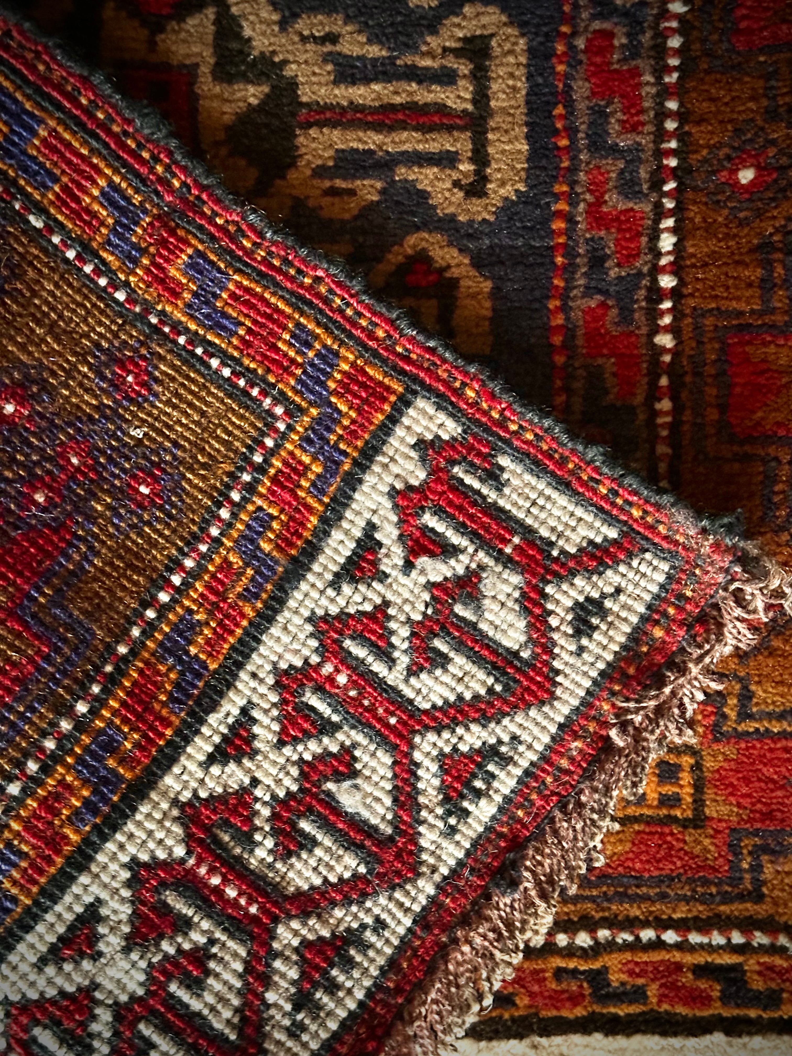 小振りなサイズでキャメルからテラコッタにグラデーションがかった色合いに、アイボリーの装飾がかっこいいヘラート産バルーチのトライバルラグで、元々はホルジンと呼ばれるラクダやロバの背に跨がせるサドルバッグの表皮をラグに仕立て直したモノになり、本来なら2対セットの内の片側だけになります。