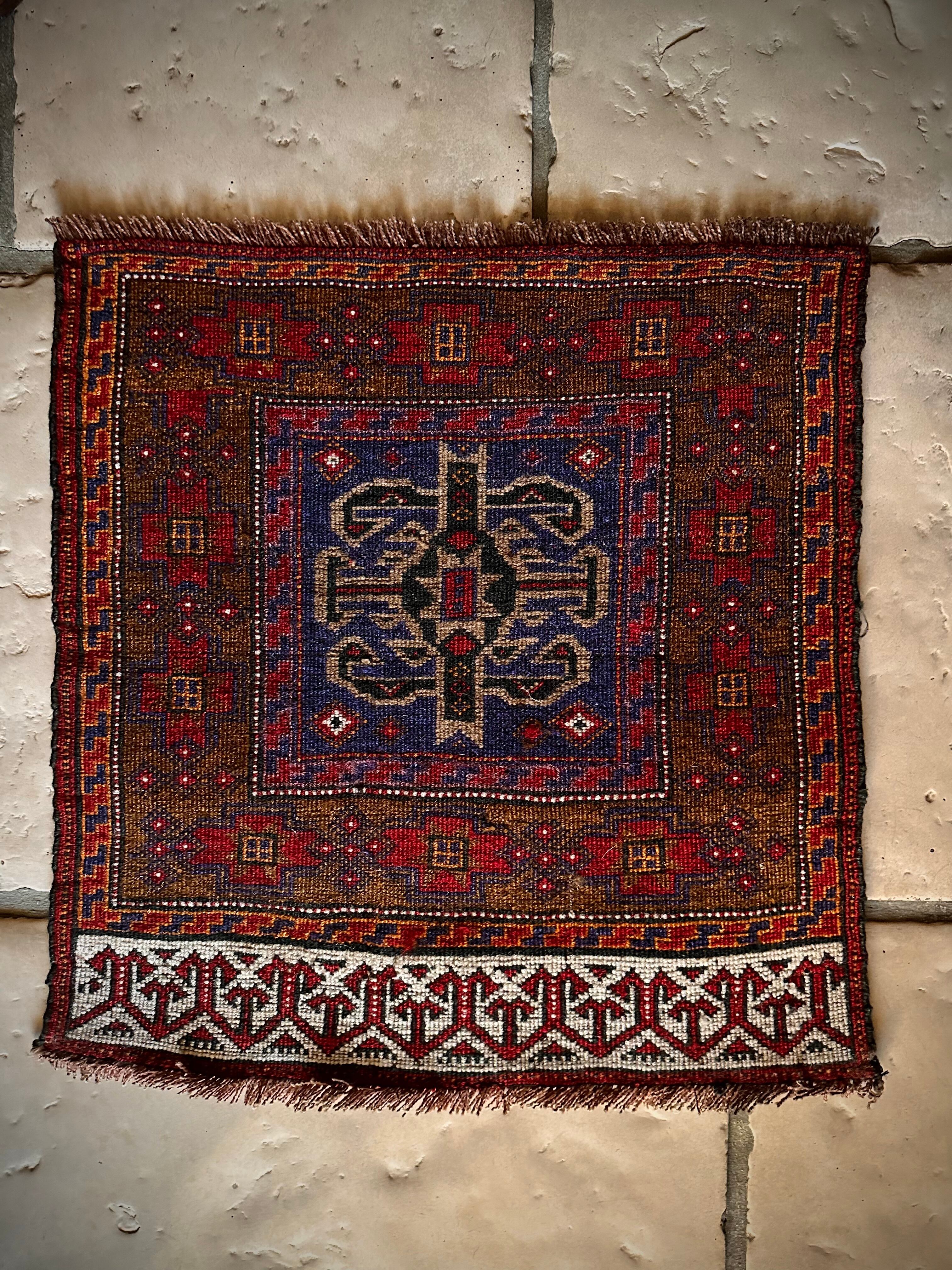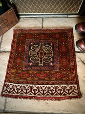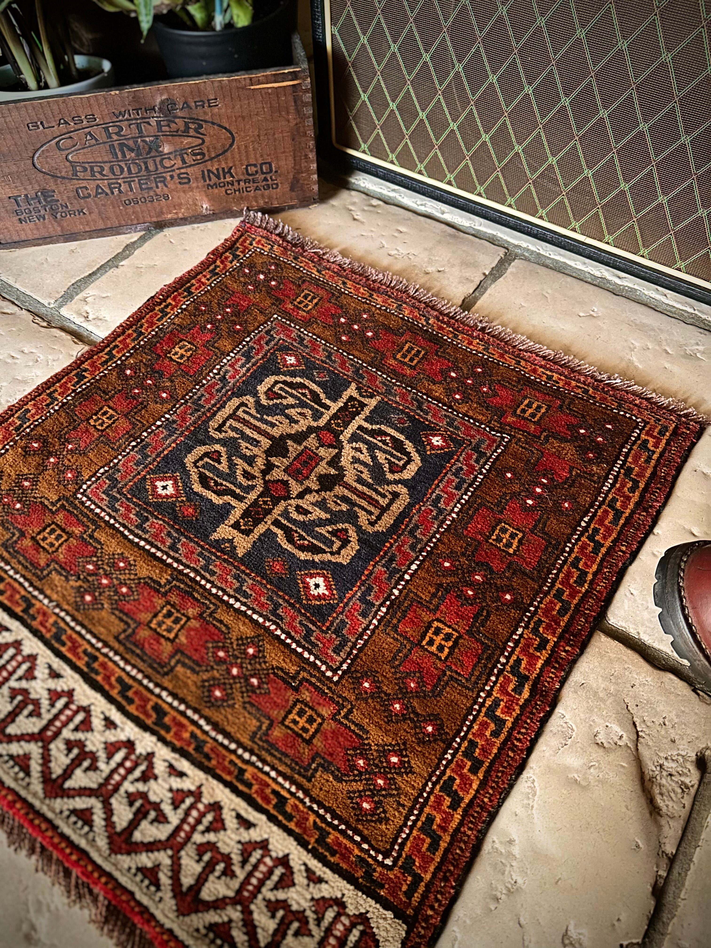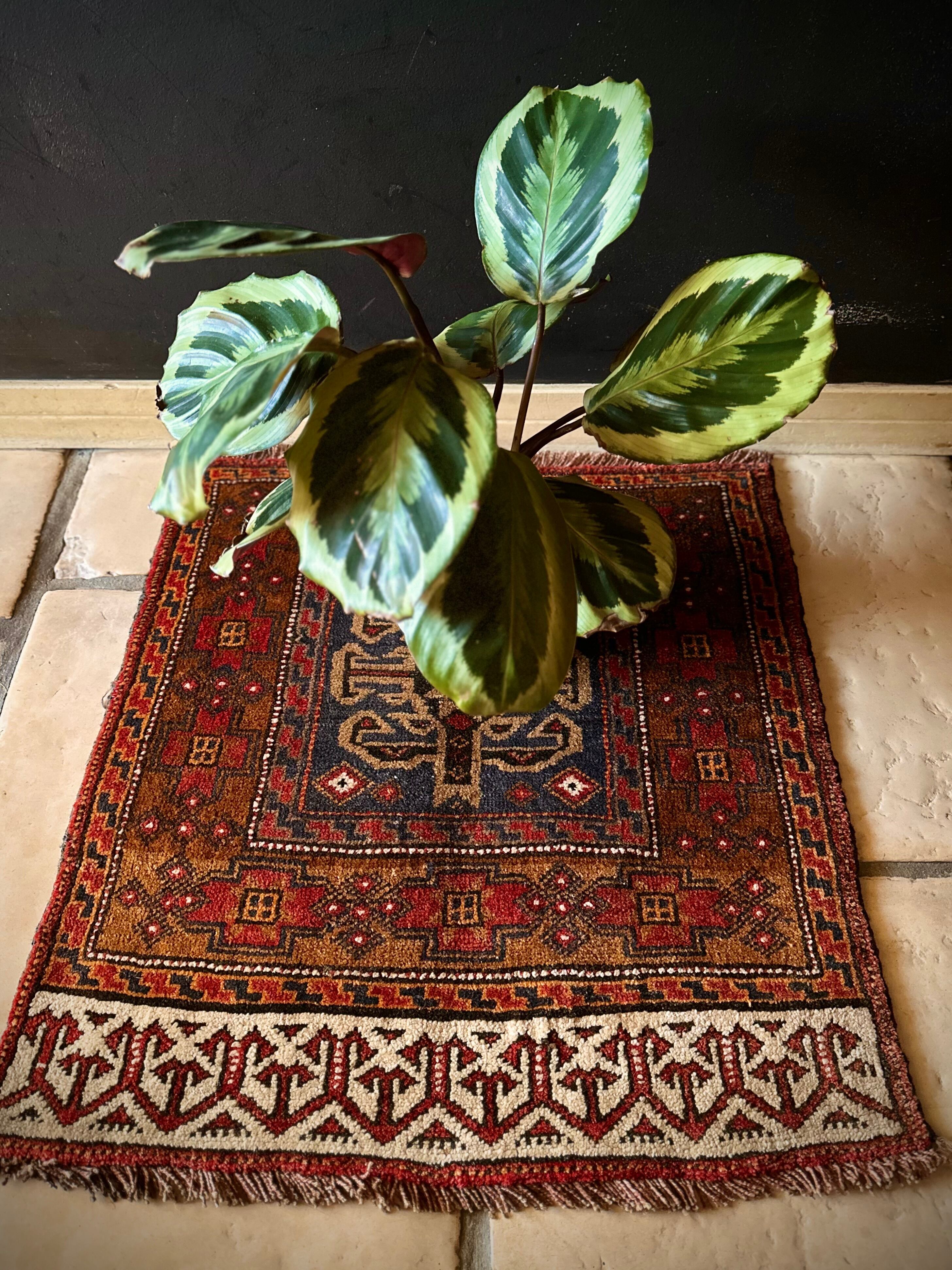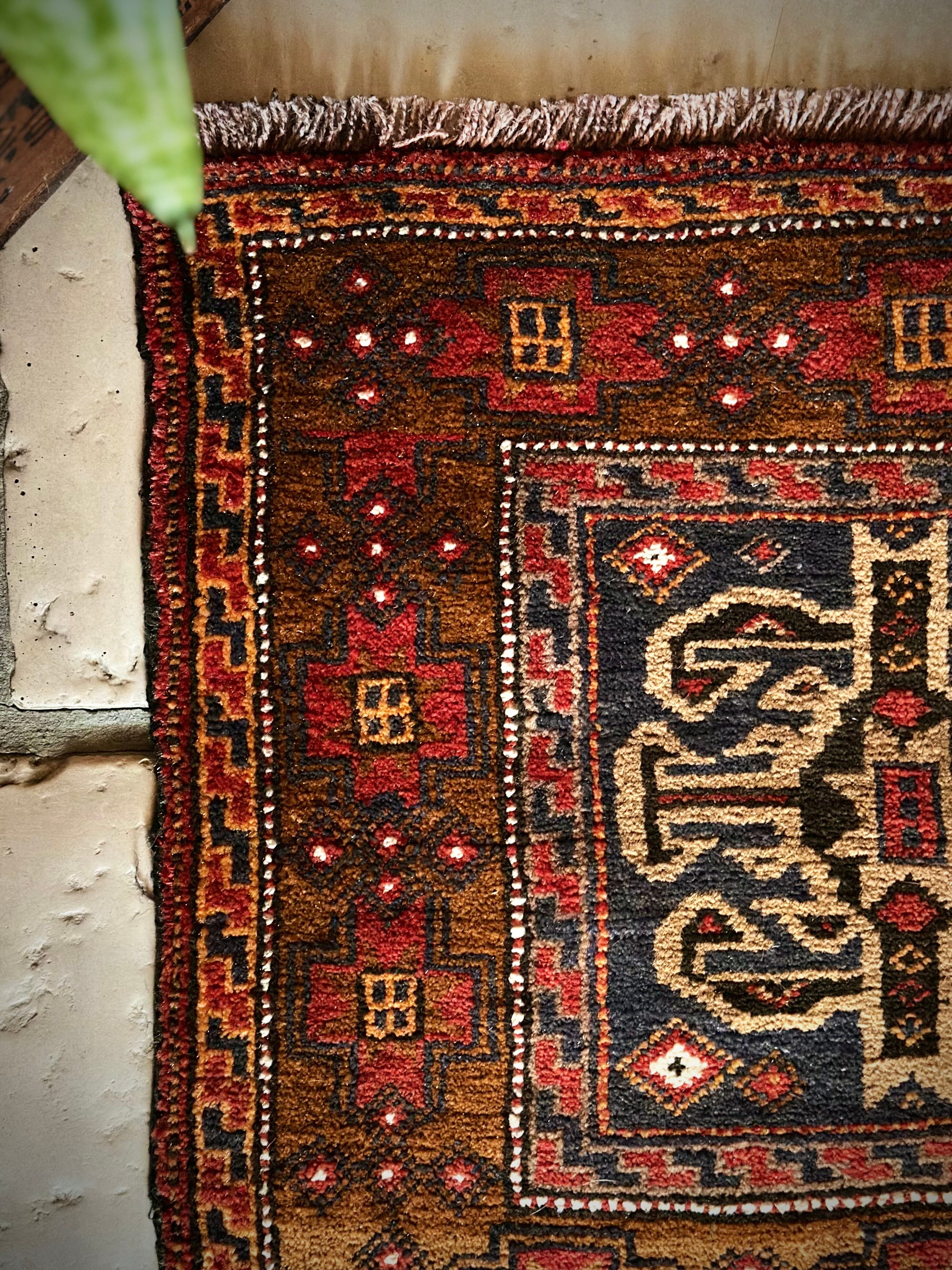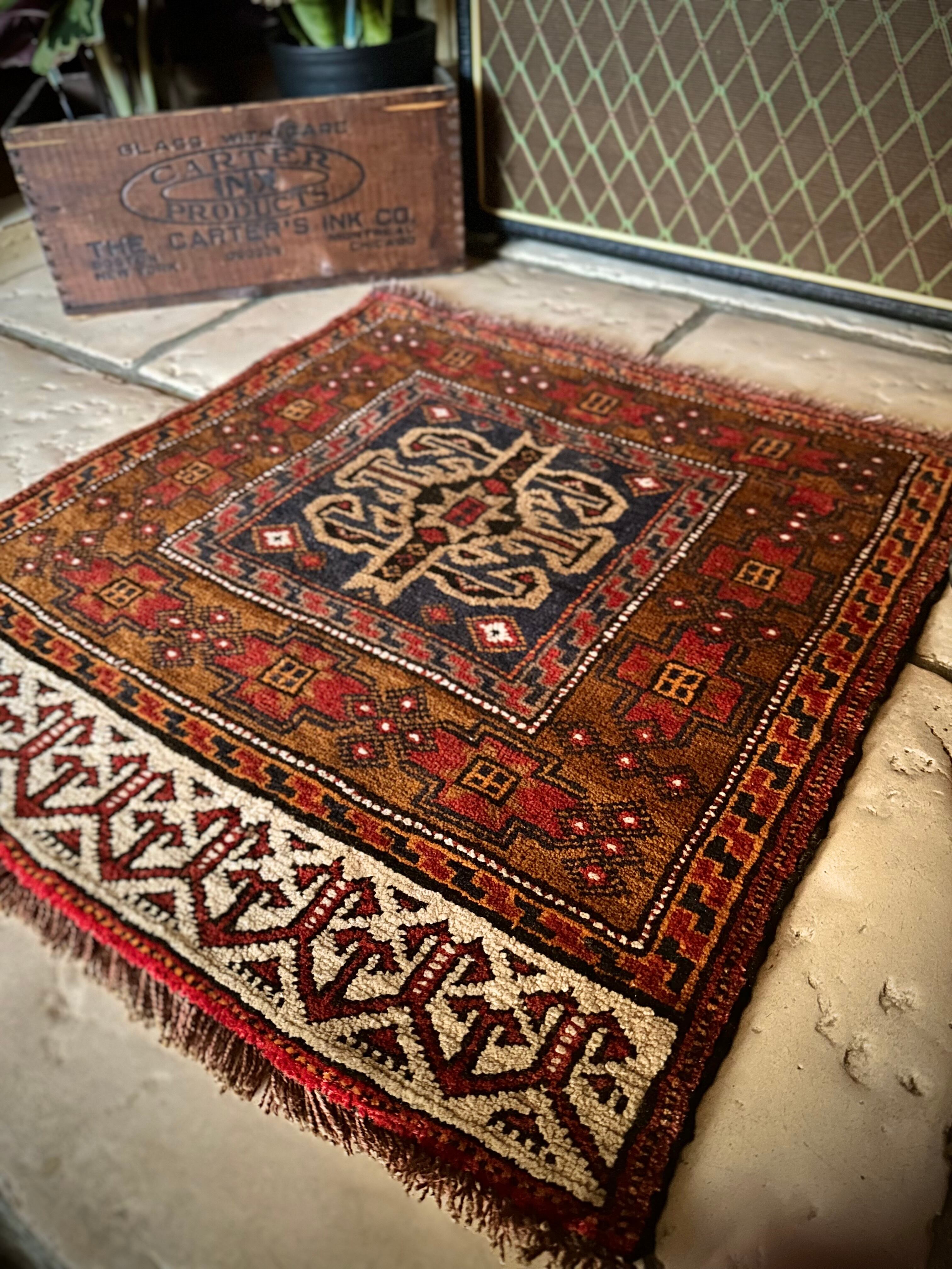 小振りなサイズでキャメルからテラコッタにグラデーションがかった色合いに、アイボリーの装飾がかっこいいヘラート産バルーチのトライバルラグで、元々はホルジンと呼ばれるラクダやロバの背に跨がせるサドルバッグの表皮をラグに仕立て直したモノになり、本来なら2対セットの内の片側だけになります。