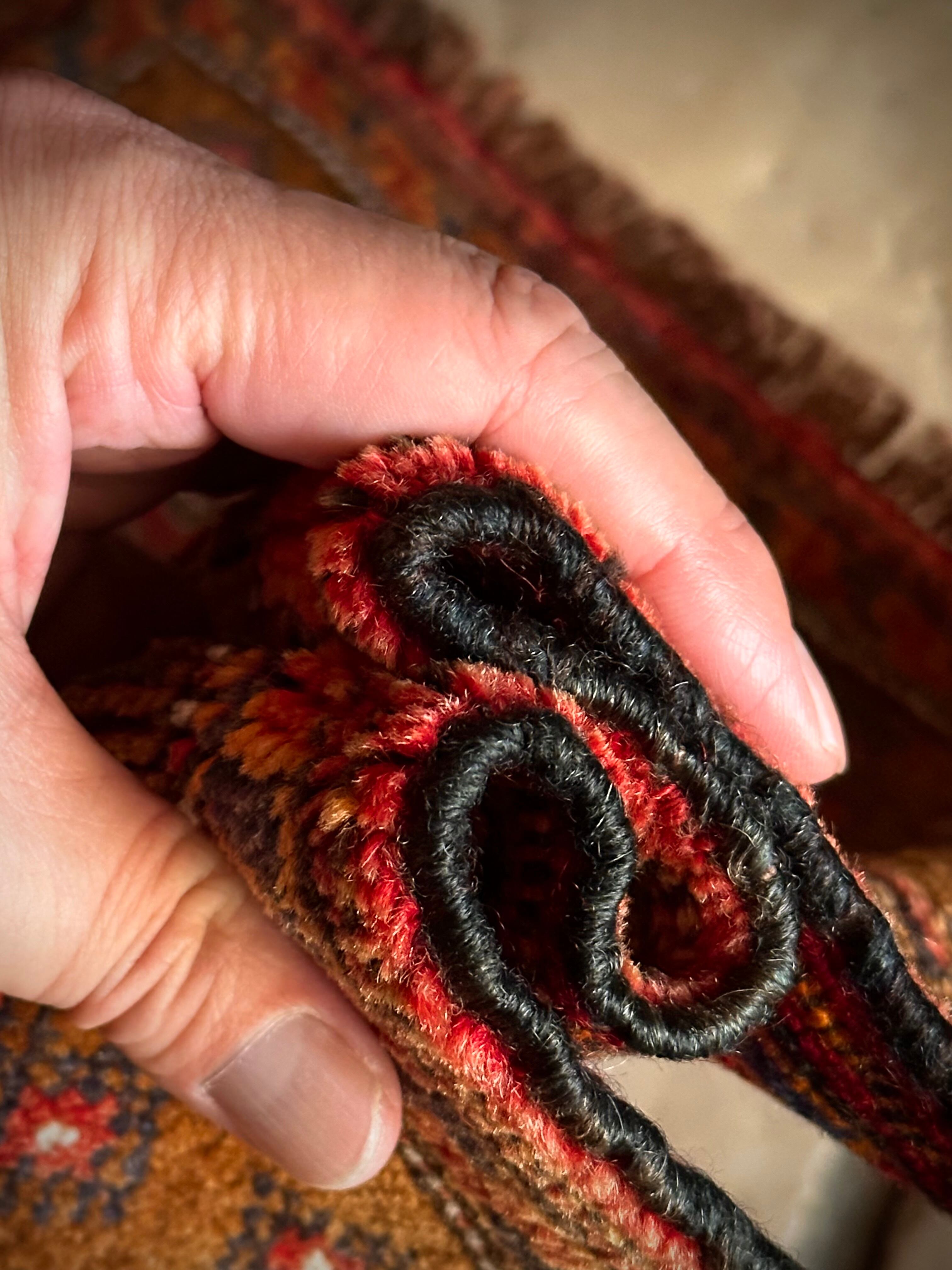 経年としては40年とそれなりのヴィンテージ品になりますが、バッグとして使用していた為に目立つ経年劣化もなく、パイル自体は長くはありませんが、しっかりとした織りで滑らかな手触りが心地よいです。また特に目立つダメージやリペア箇所は見当たらないグッドなコンディションで、トライバルラグ初心者の方でも気軽に取り入れてもらえる1枚になります。